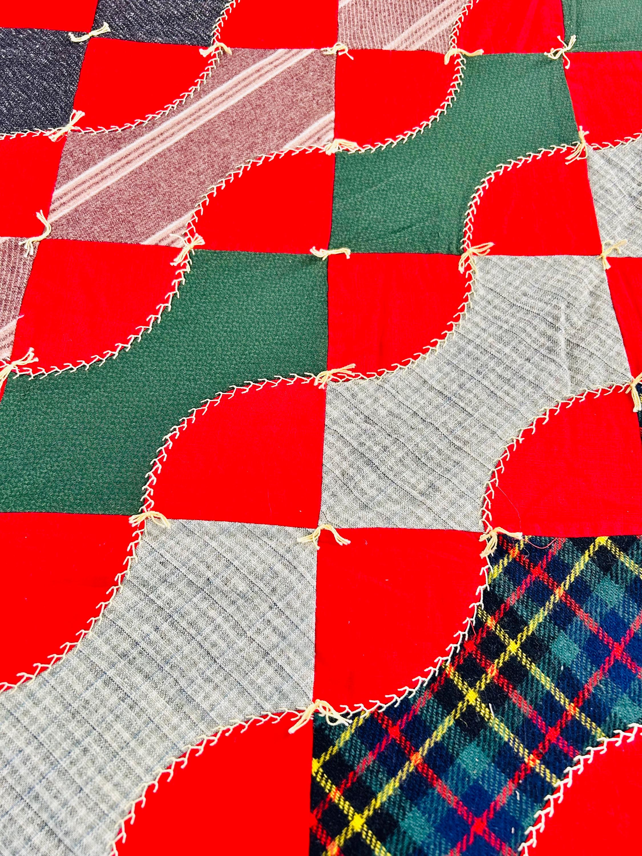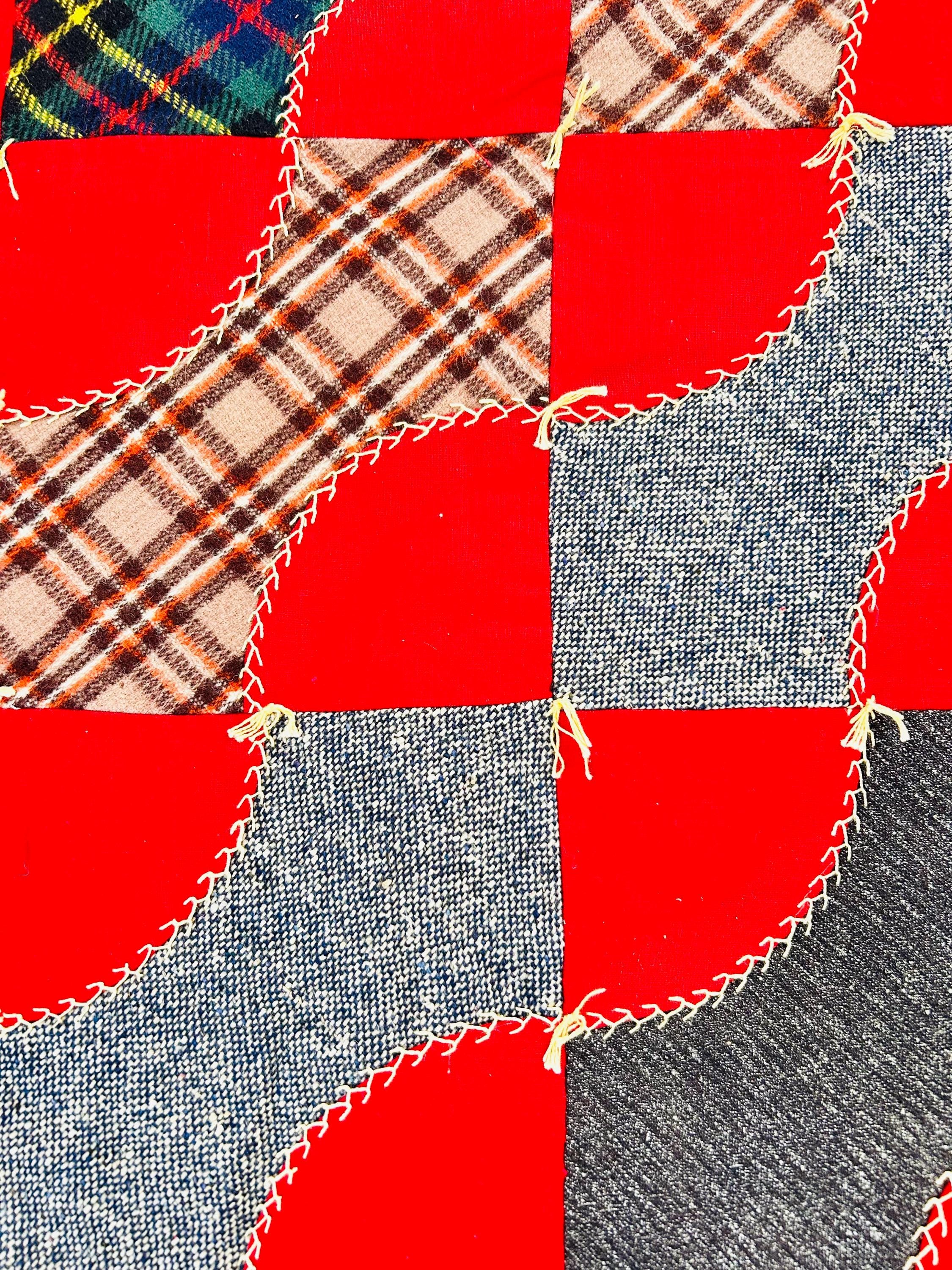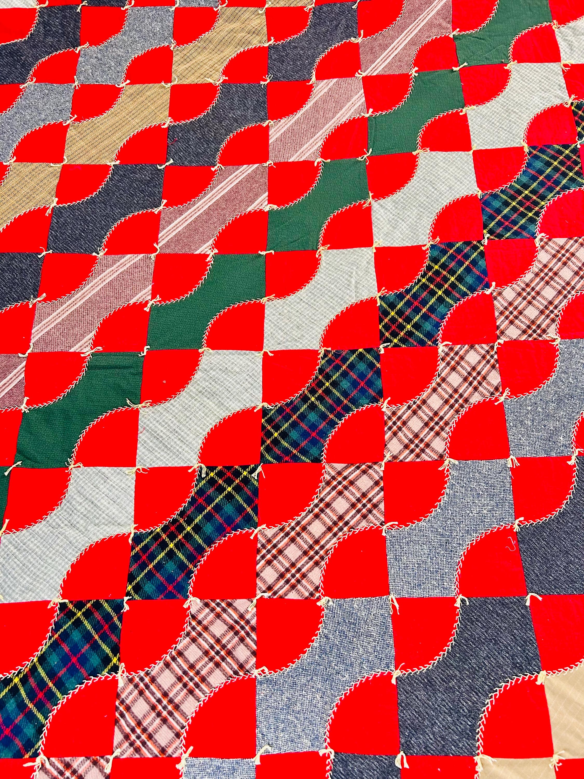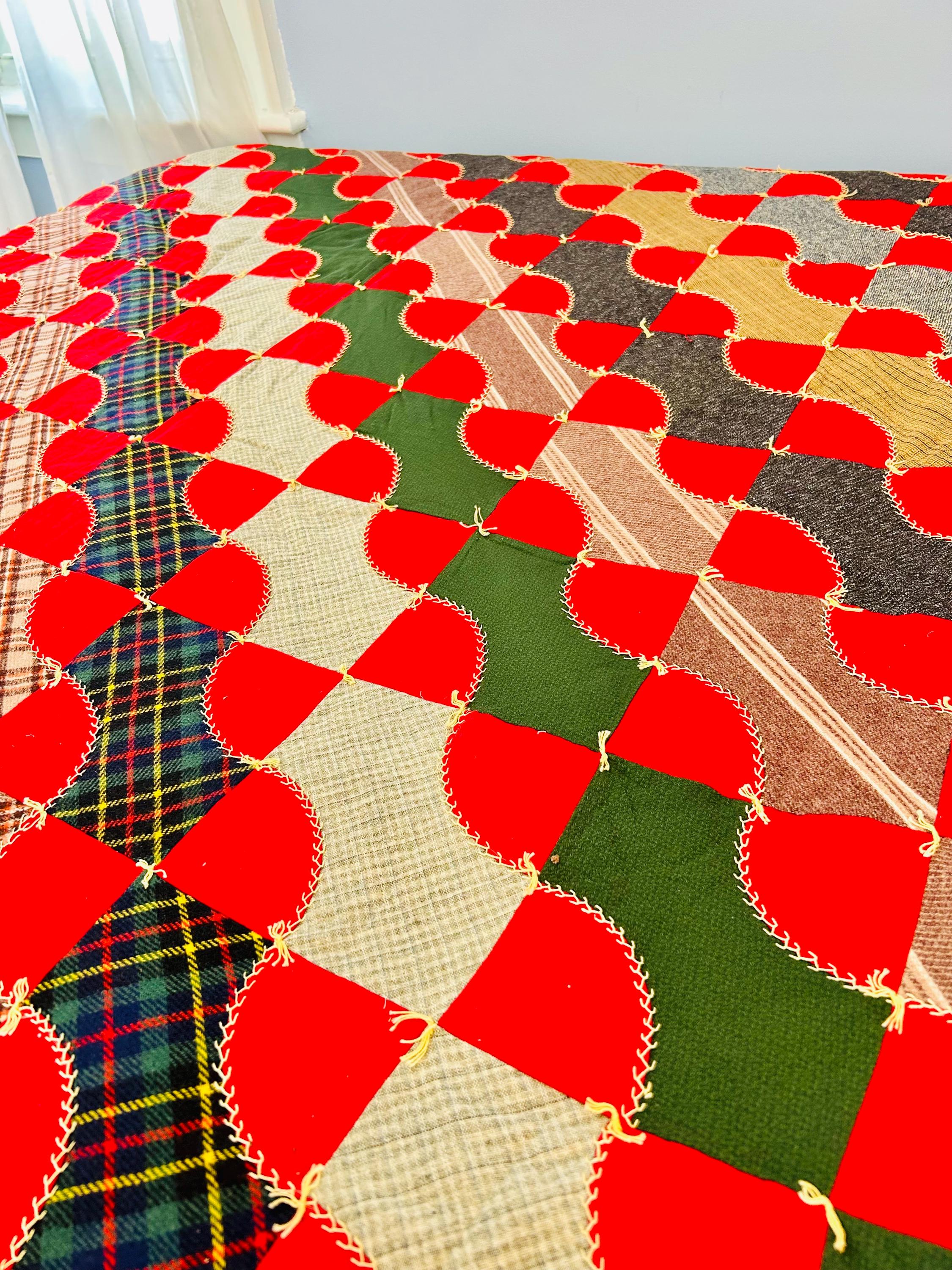 This striking mid-century Endless Chain Quilt is a beautiful, flowing, curved design that was made during the 1940s–1950s. It is made from a rich mix of wool, rayon, and cotton fabrics, including plaids, tweeds, and solid red panels. The
