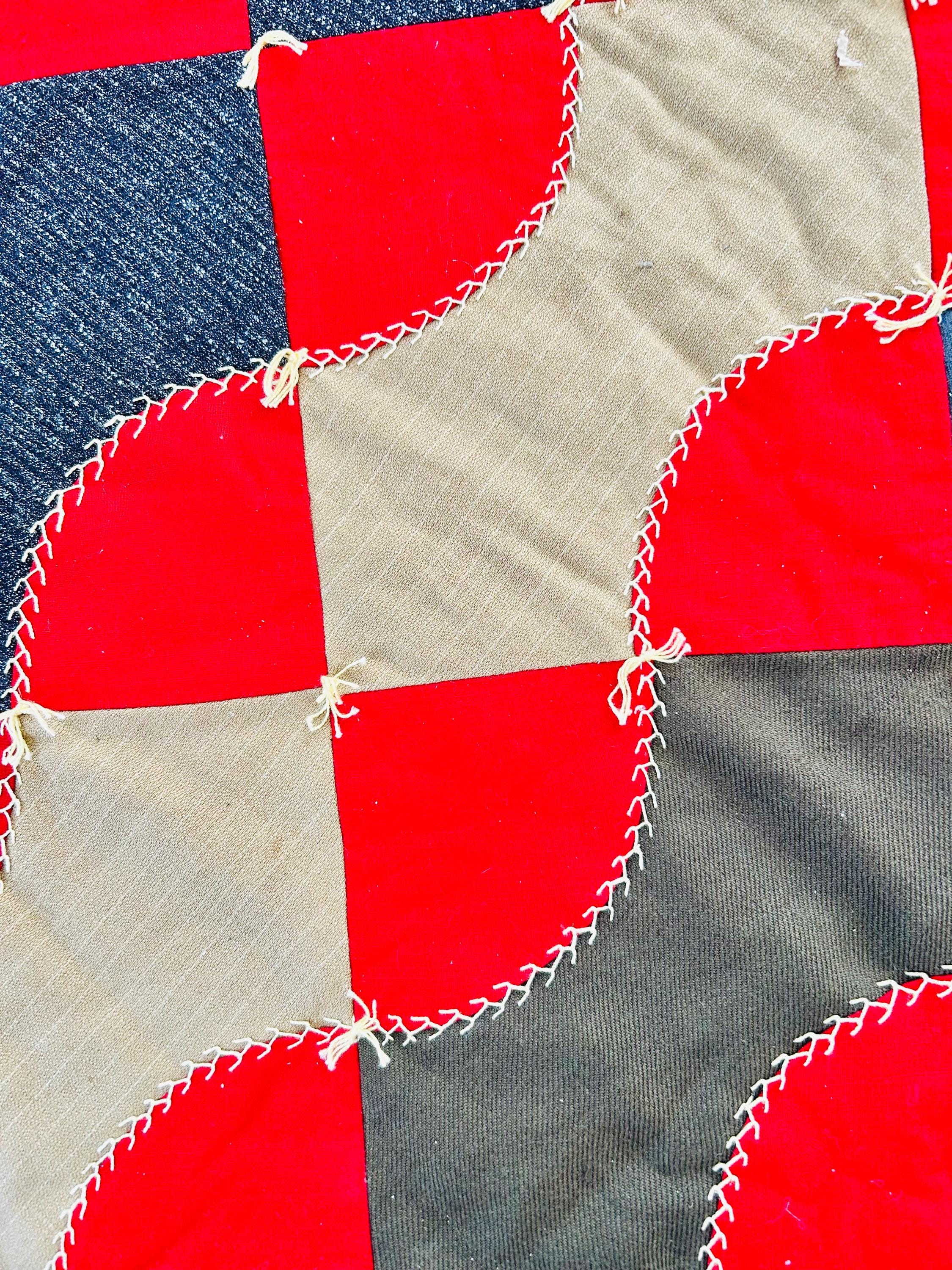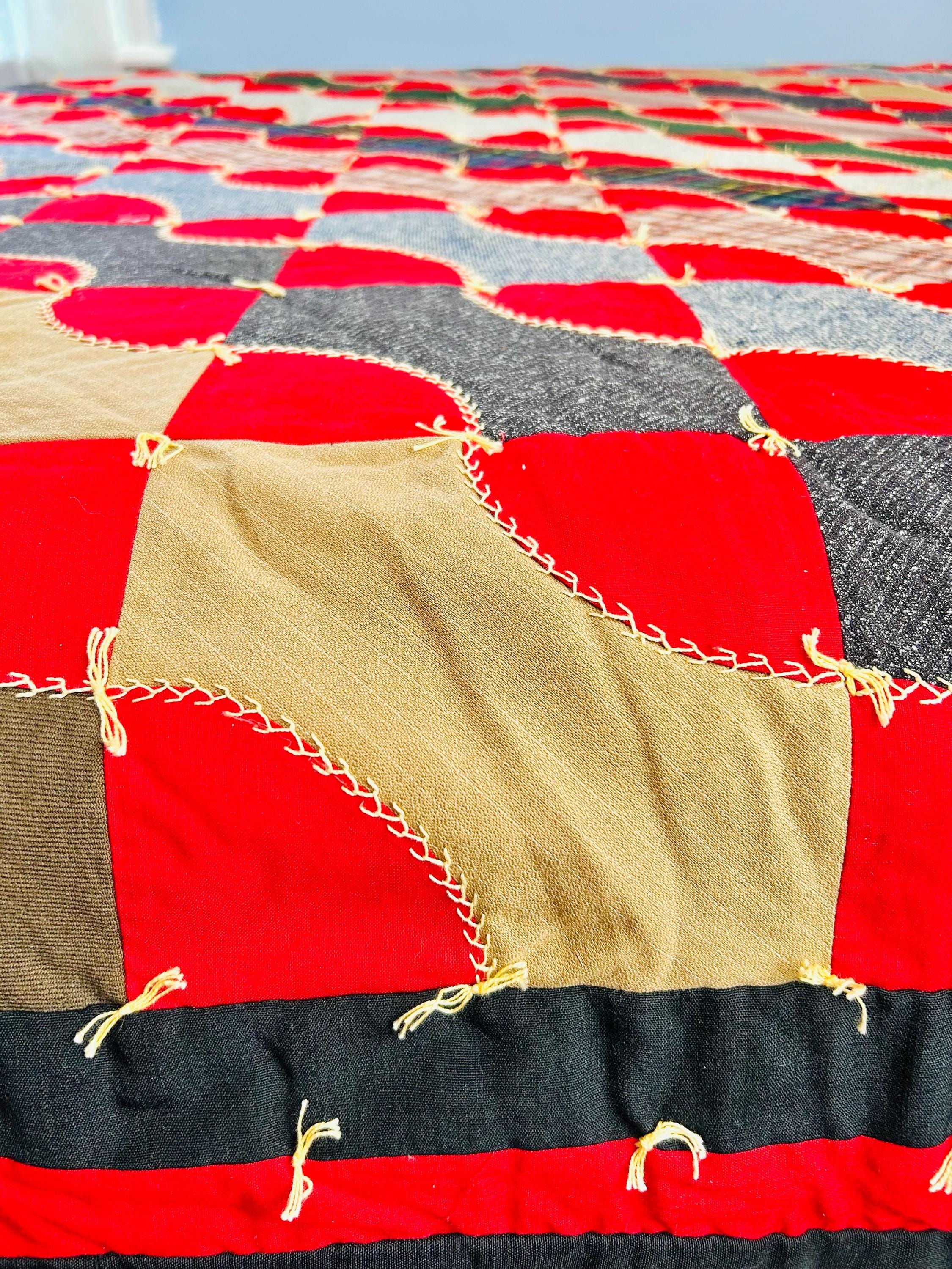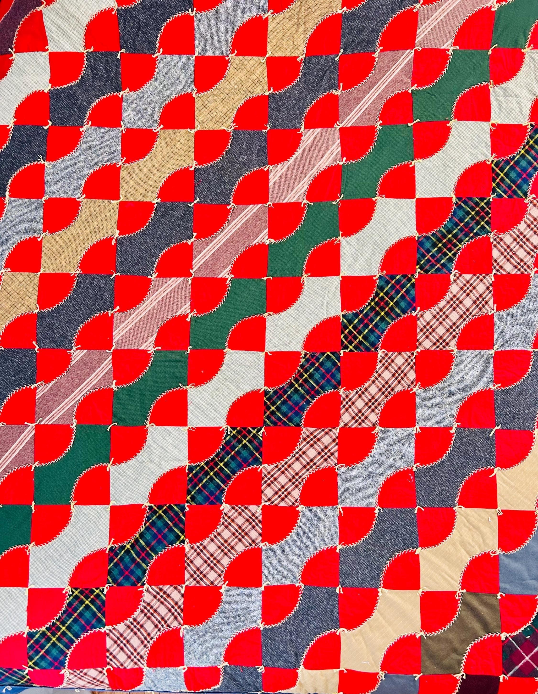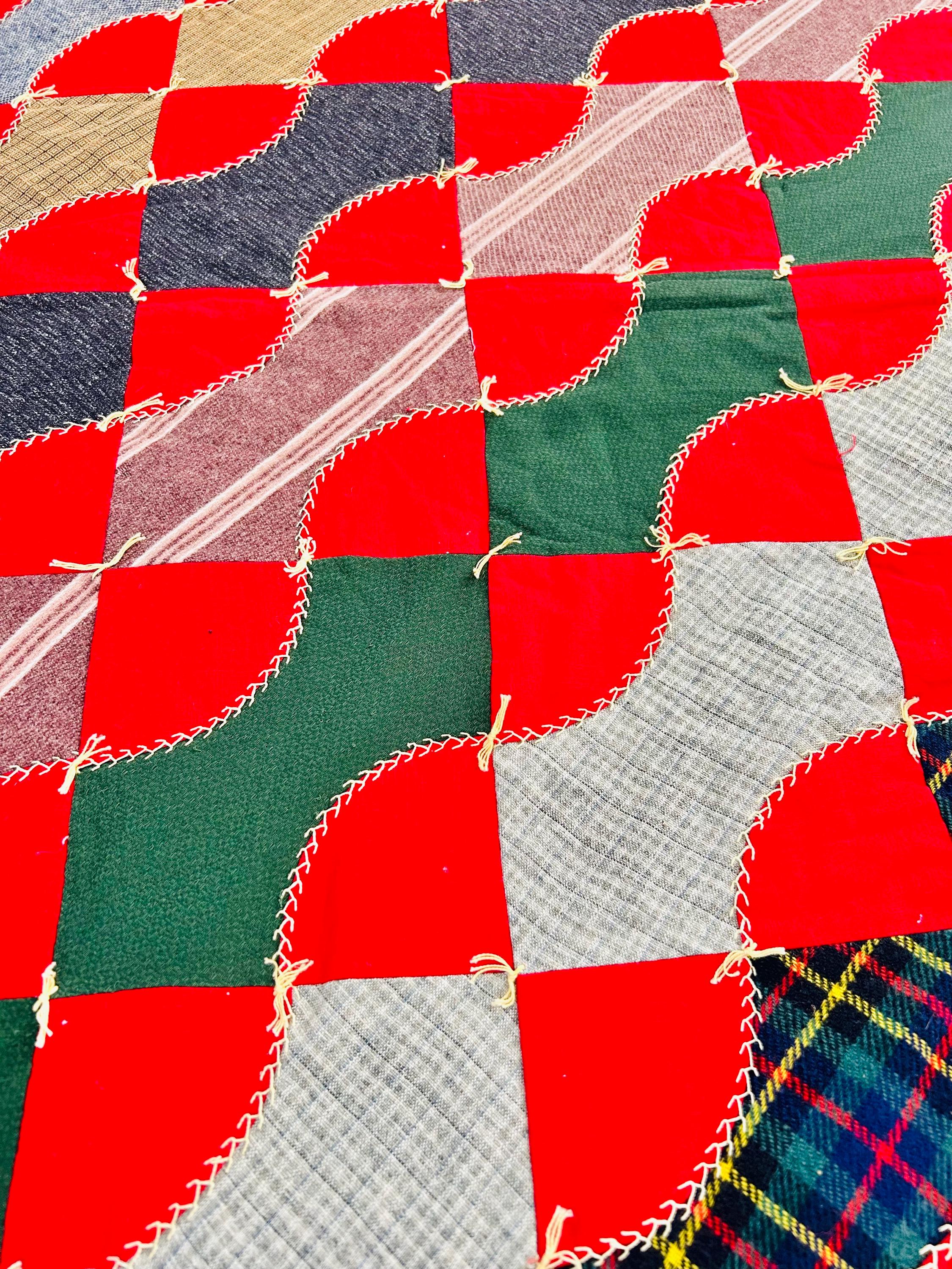 This striking mid-century Endless Chain Quilt is a beautiful, flowing, curved design that was made during the 1940s–1950s. It is made from a rich mix of wool, rayon, and cotton fabrics, including plaids, tweeds, and solid red panels. The