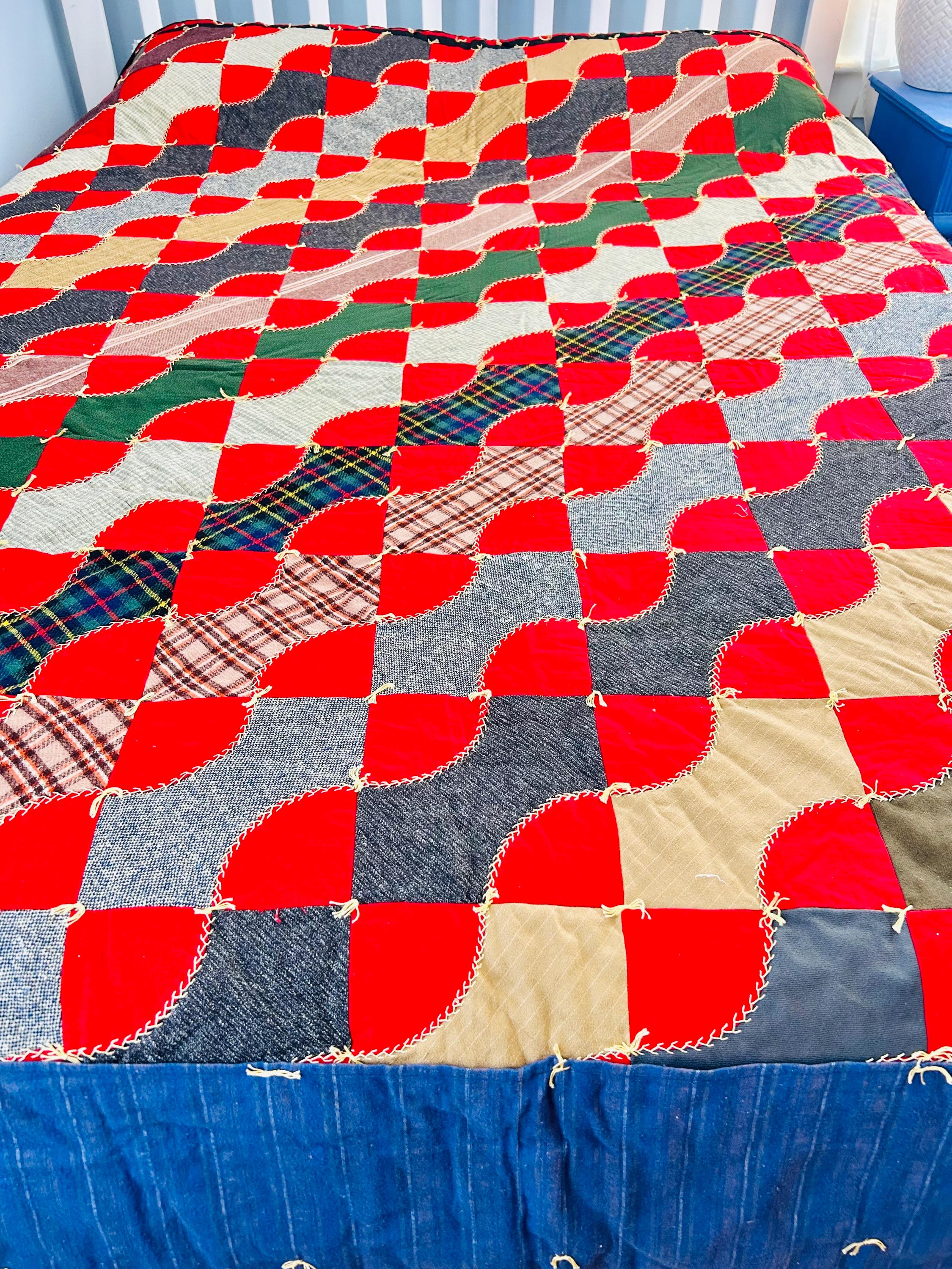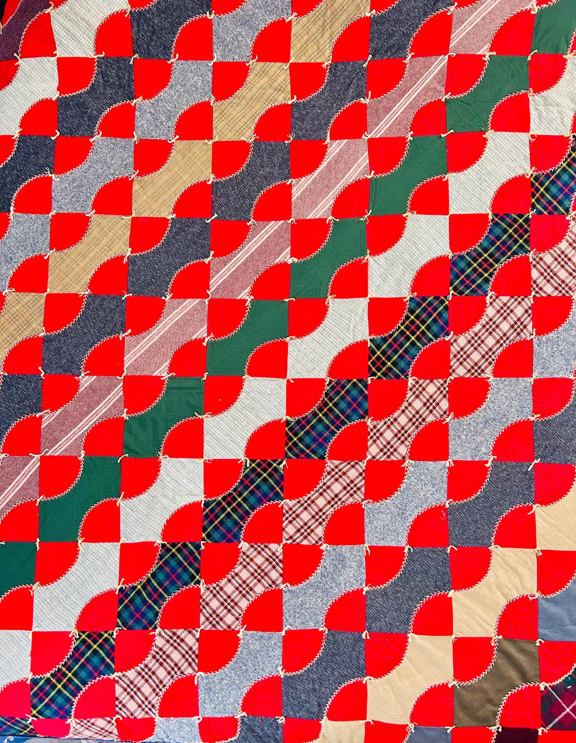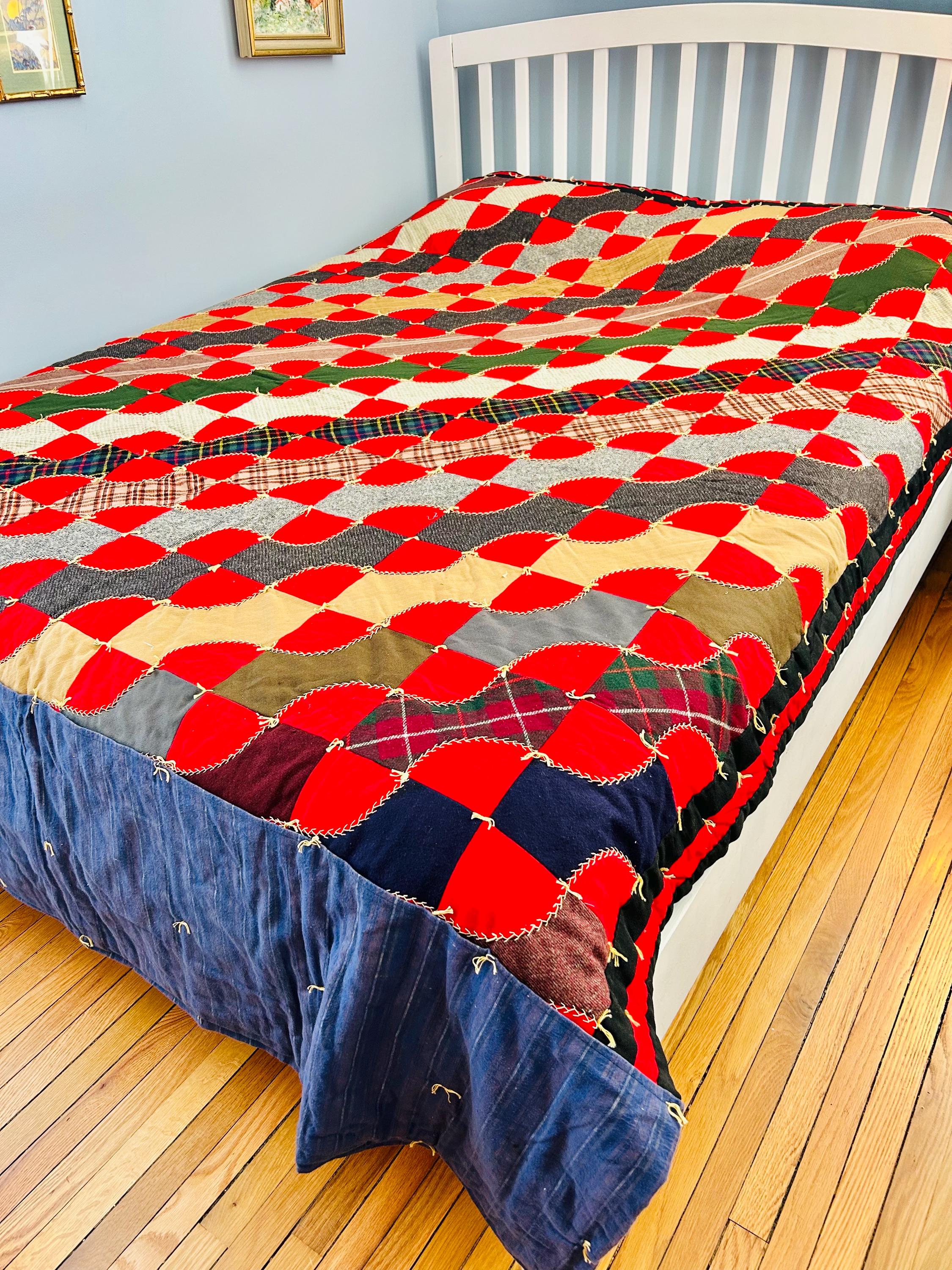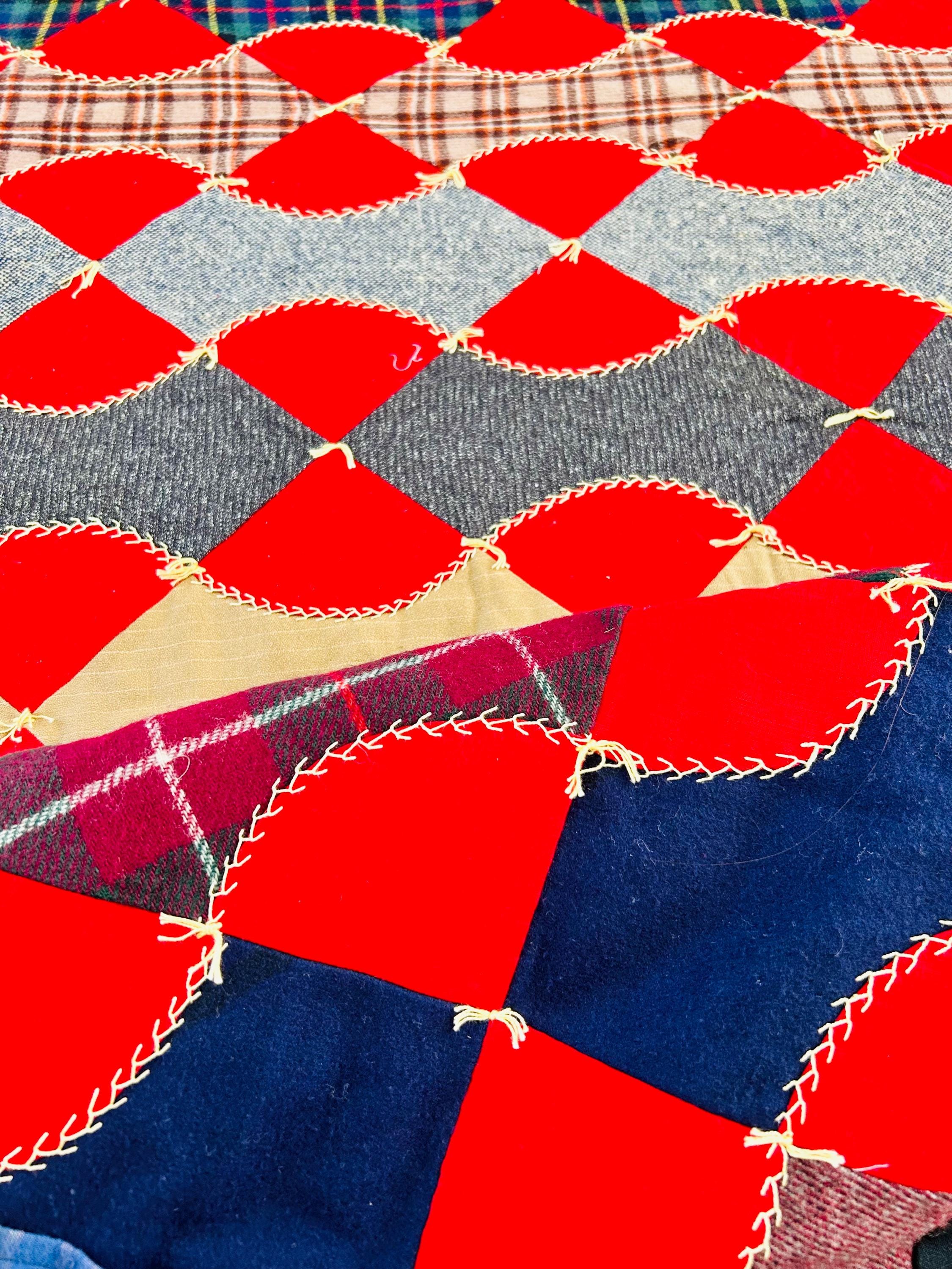Details • Date: 1940s–1950s • Pattern: Endless Chain • Construction: Hand pieced, hand-embroidered, hand tied • Materials: Wool, rayon, cotton, cotton-flannel • Backing: Blue cotton flannel • Size: 71” wide x 95” long • Colors: Red, navy, gray, tan, brown, green, and multicolor plaids