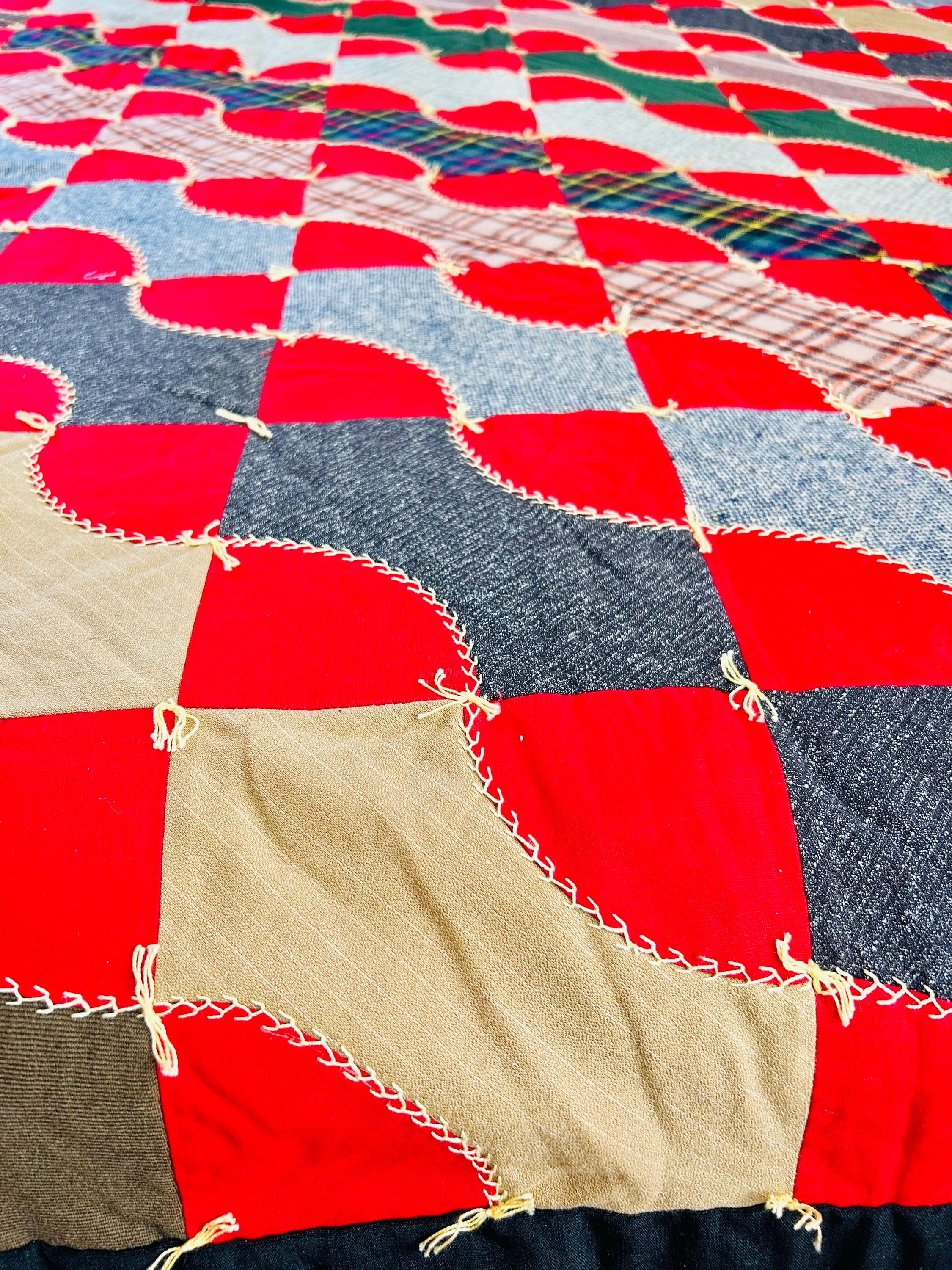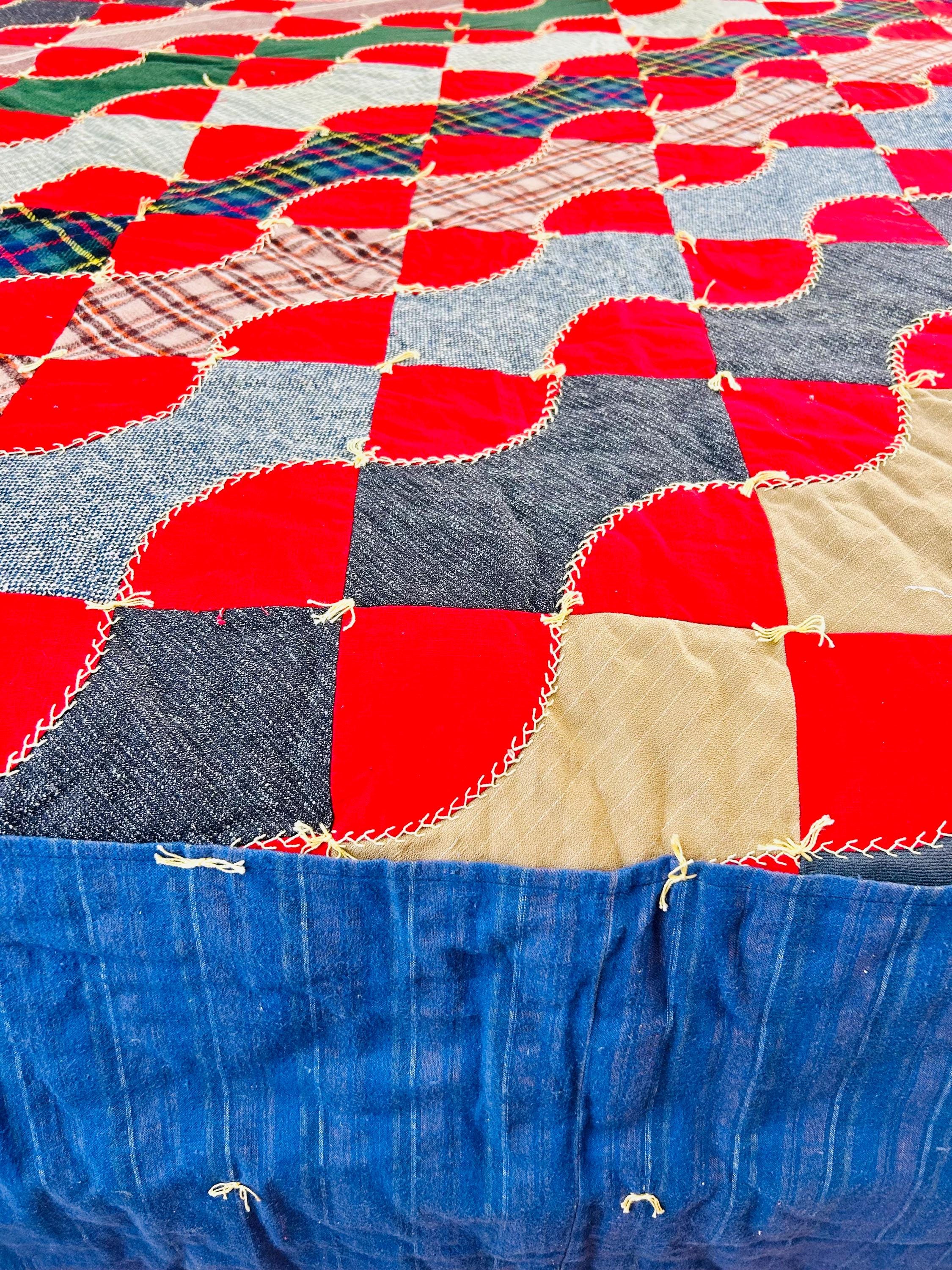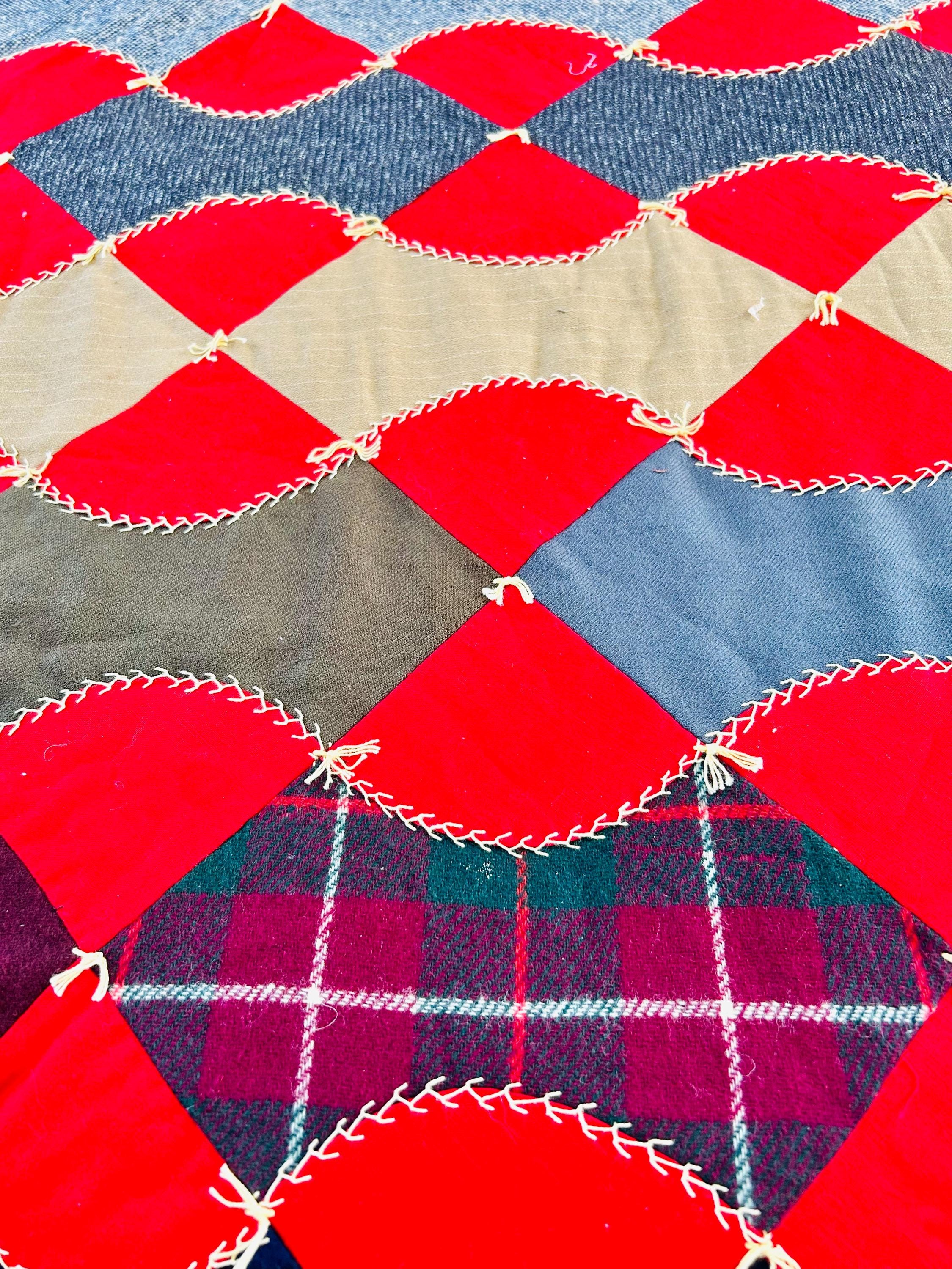 Details • Date: 1940s–1950s • Pattern: Endless Chain • Construction: Hand pieced, hand-embroidered, hand tied • Materials: Wool, rayon, cotton, cotton-flannel • Backing: Blue cotton flannel • Size: 71” wide x 95” long • Colors: Red, navy, gray, tan, brown, green, and multicolor plaids