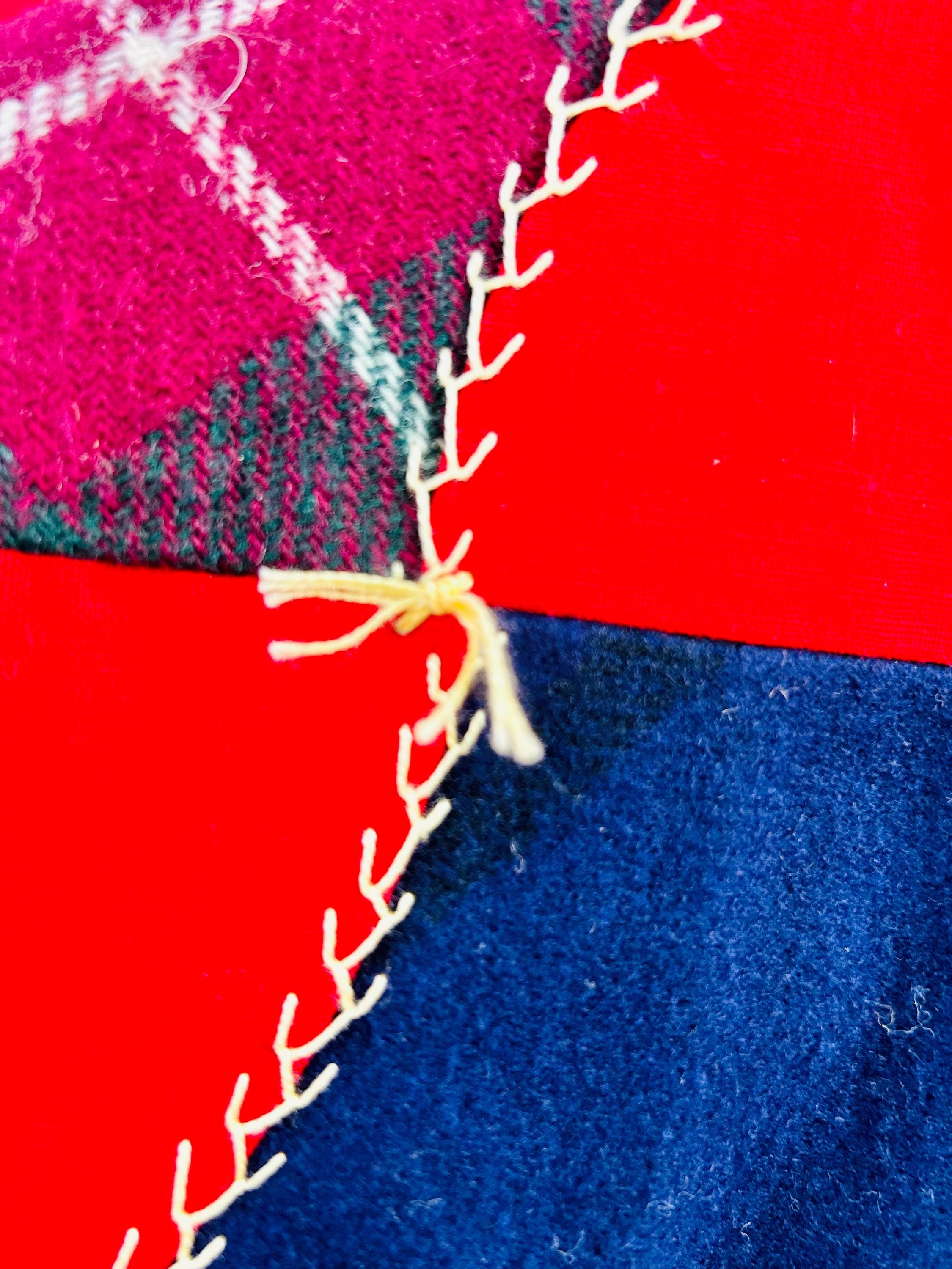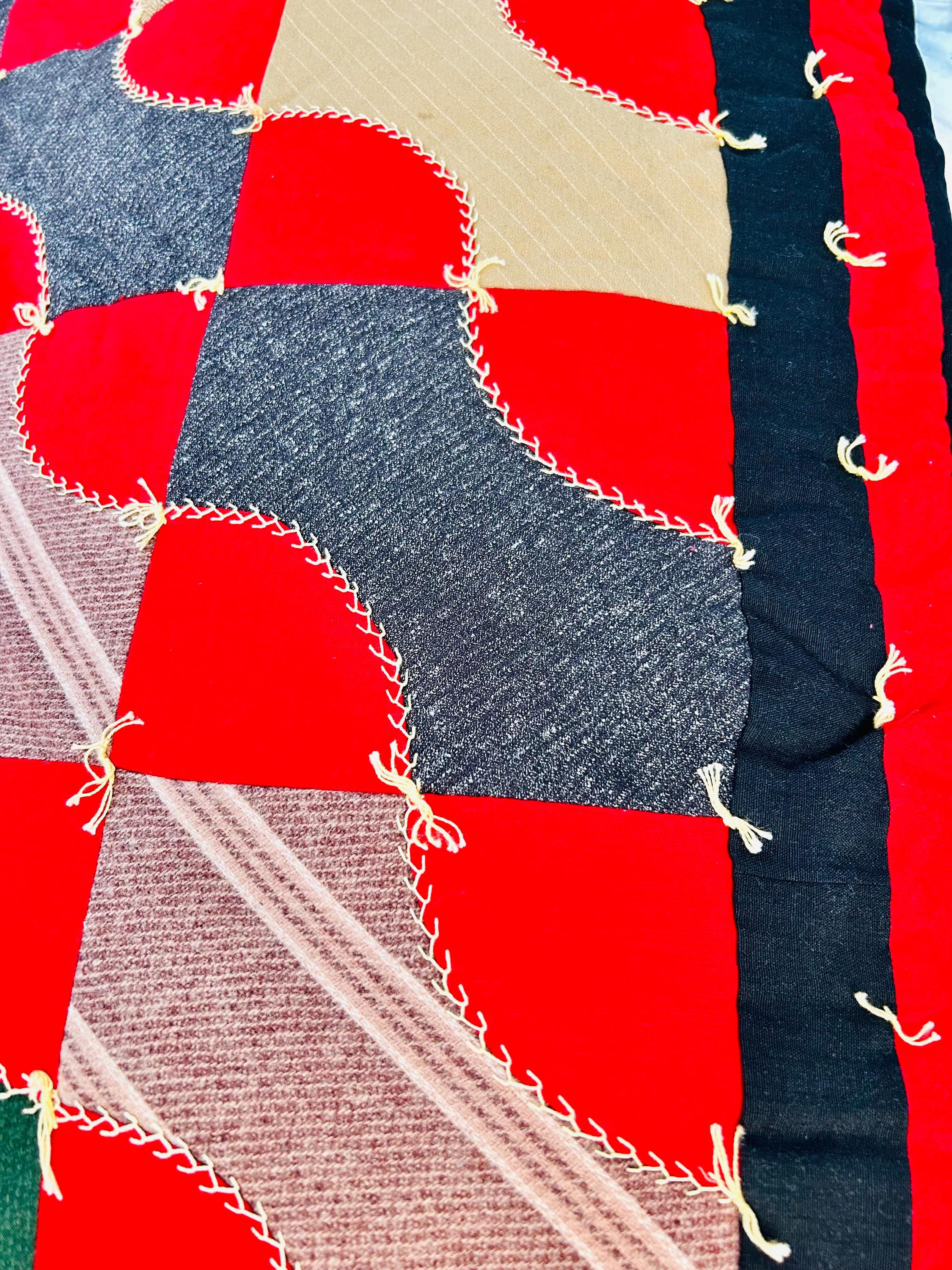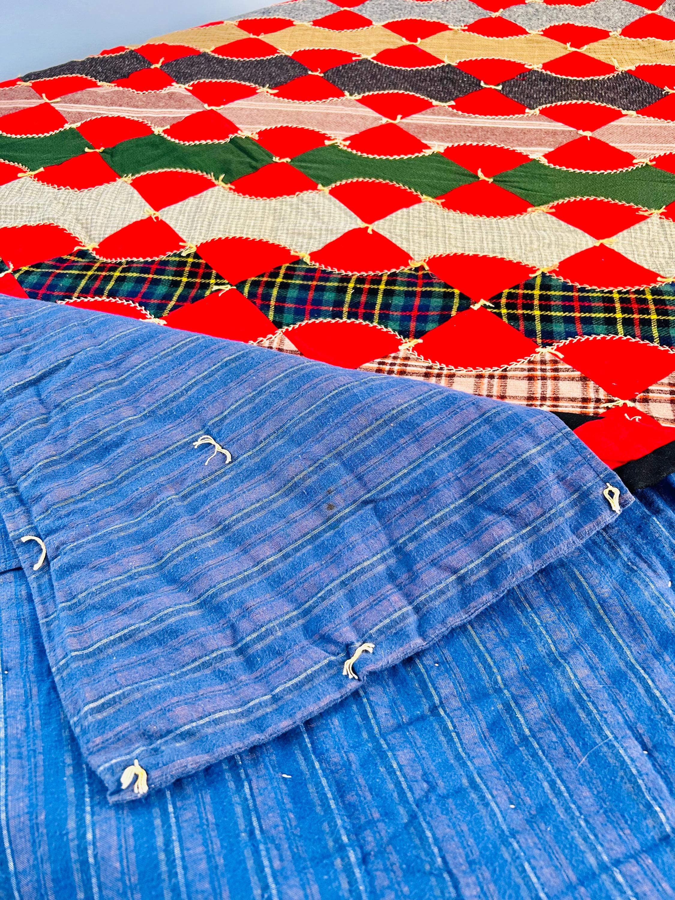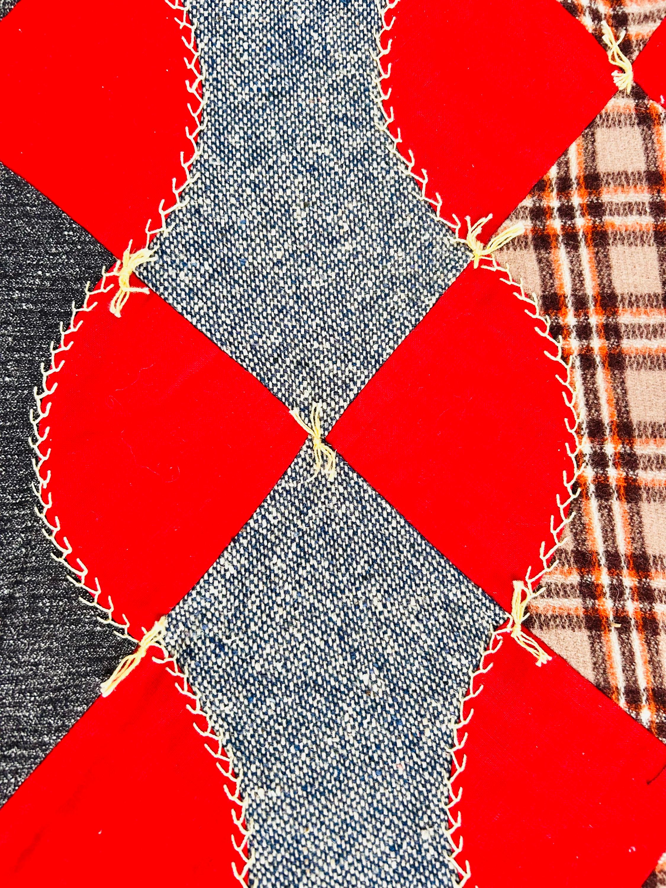 Details • Date: 1940s–1950s • Pattern: Endless Chain • Construction: Hand pieced, hand-embroidered, hand tied • Materials: Wool, rayon, cotton, cotton-flannel • Backing: Blue cotton flannel • Size: 71” wide x 95” long • Colors: Red, navy, gray, tan, brown, green, and multicolor plaids