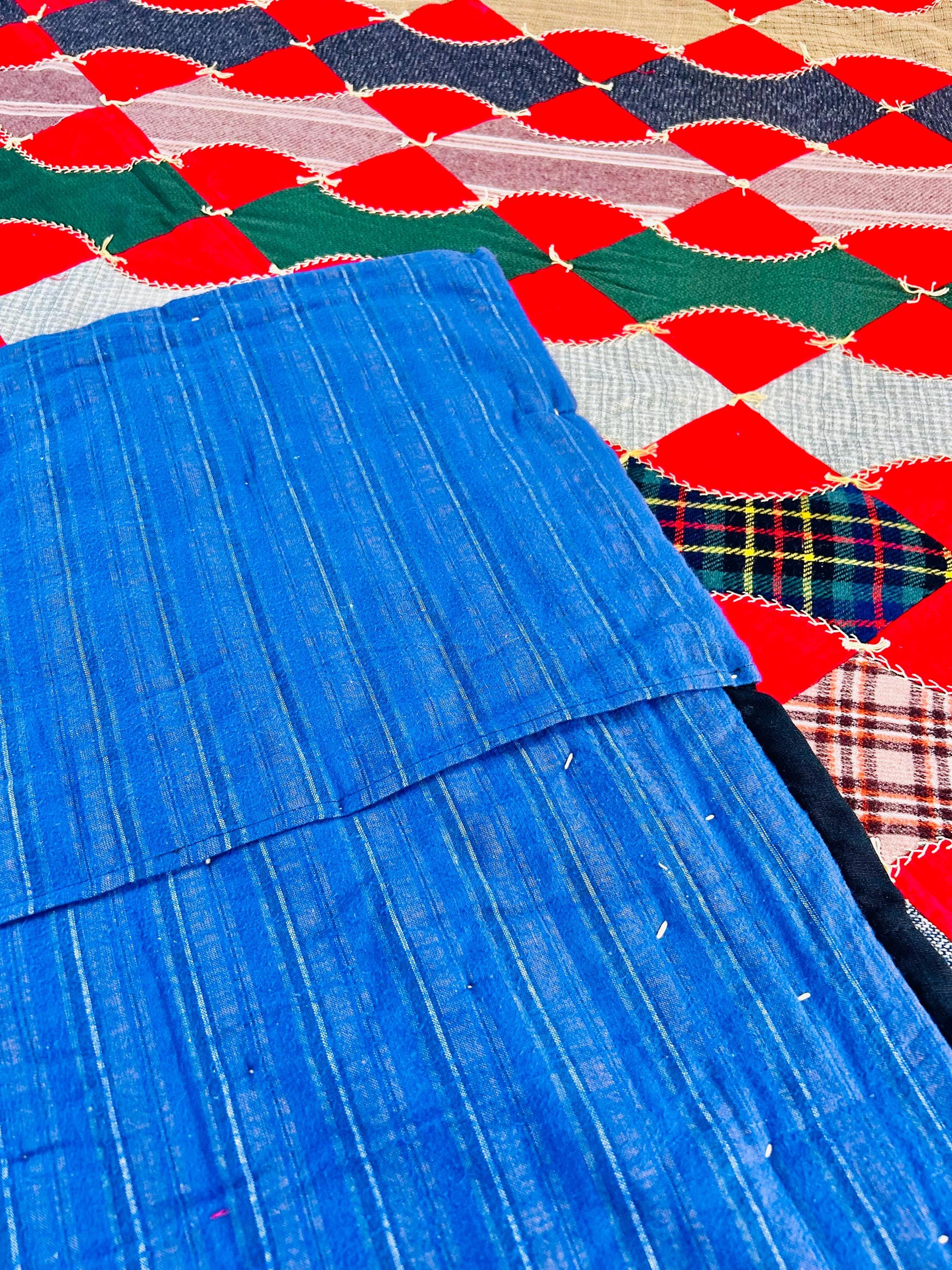 Each curved piece has been hand-embroidered and the quilt has been hand-tied (rather than hand-quilted). The back is blue cotton flannel that has been hand-stitched to three sides to form the binding and pulled up more than 12 inches over the foot of the quilt to form a wide pocket at the bottom. See photos. The batting is medium weight - this is a warm quilt.