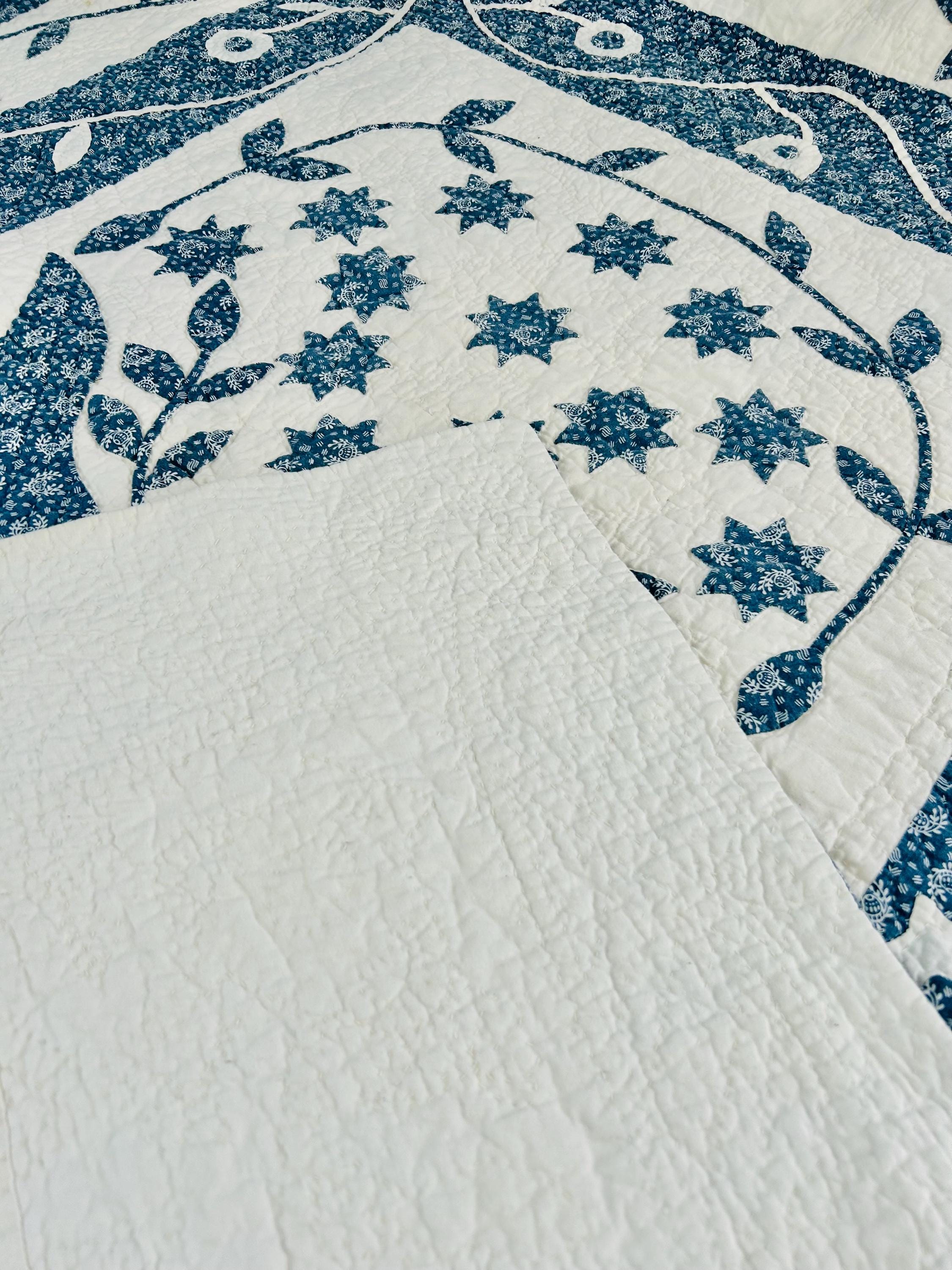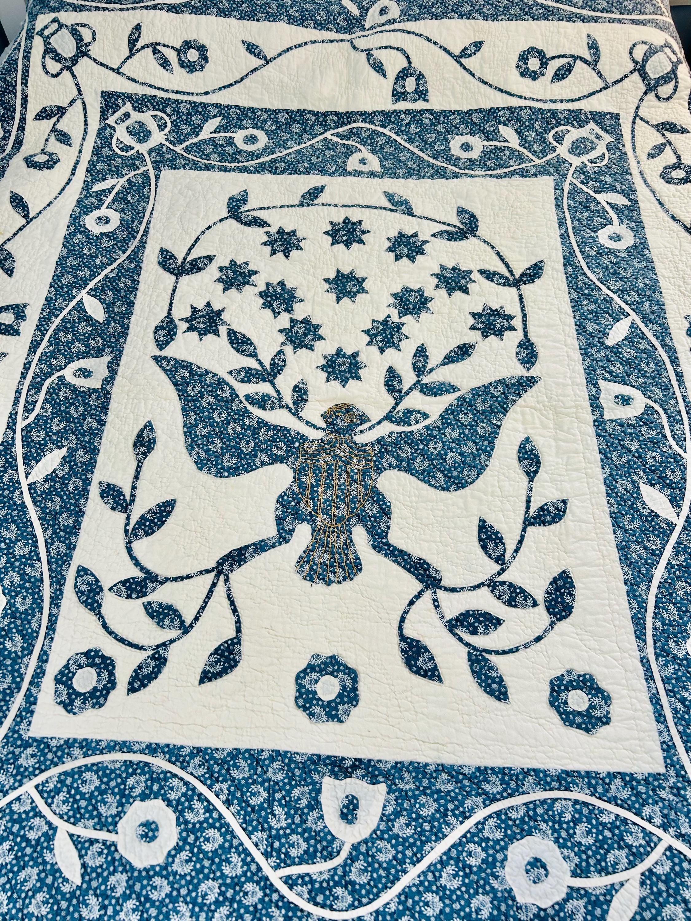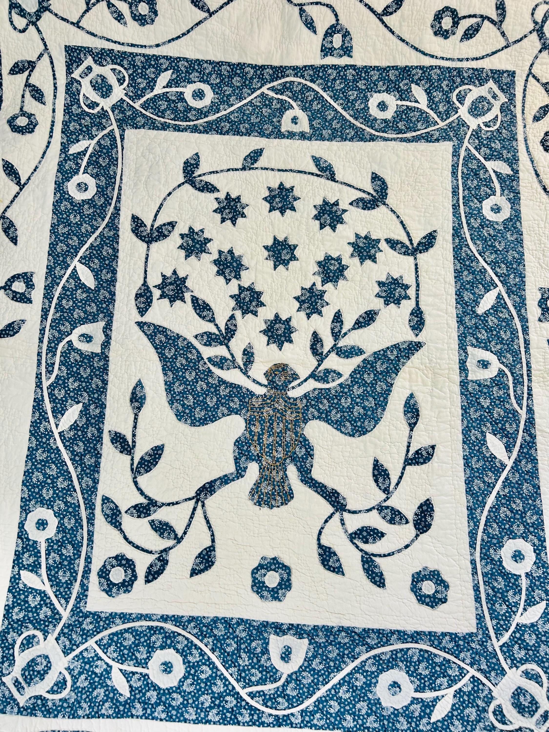 Details: • Design: Traditional Federal Eagle with 13 stars and ornamental corner wreaths. • Size: 63” x 83” • Construction: This quilt features a "pillowcase" or knife-edge finish, where the front and back are tucked inward and stitched for a sleek, borderless look. • Colors: Classic Blue and True White.