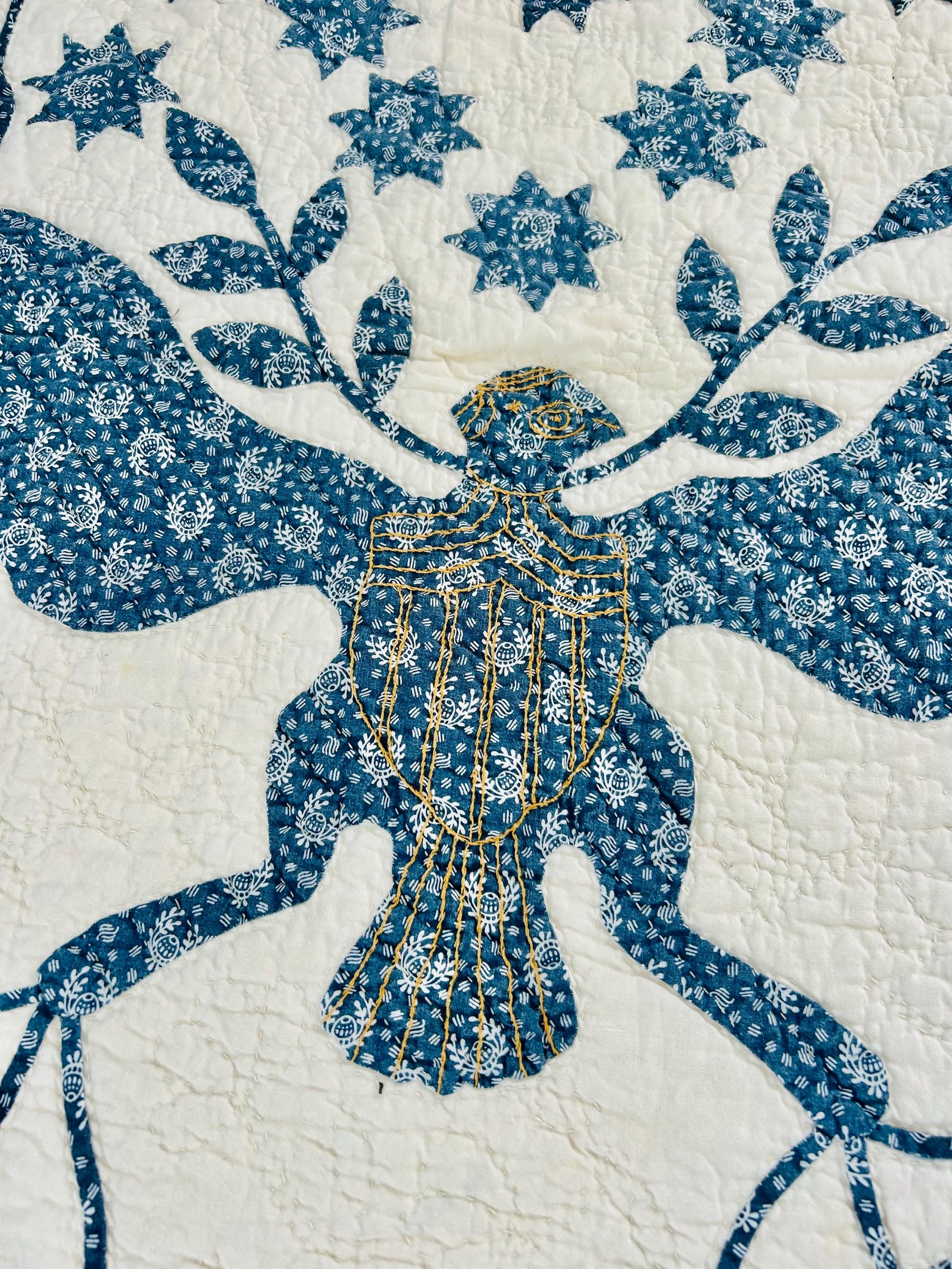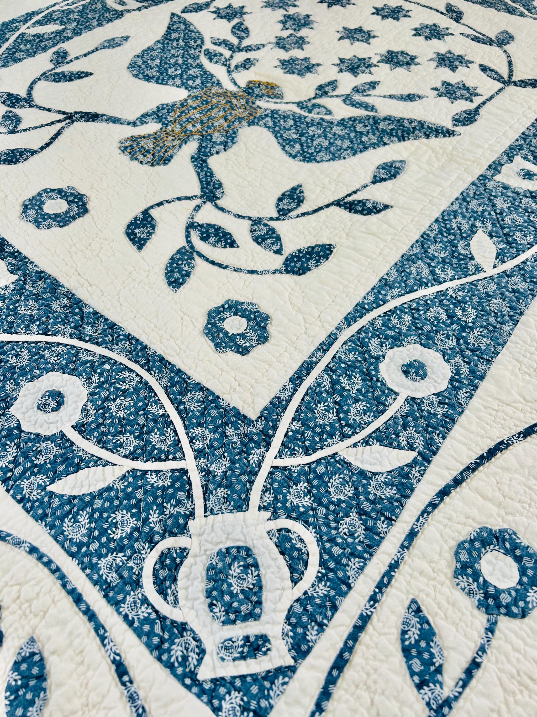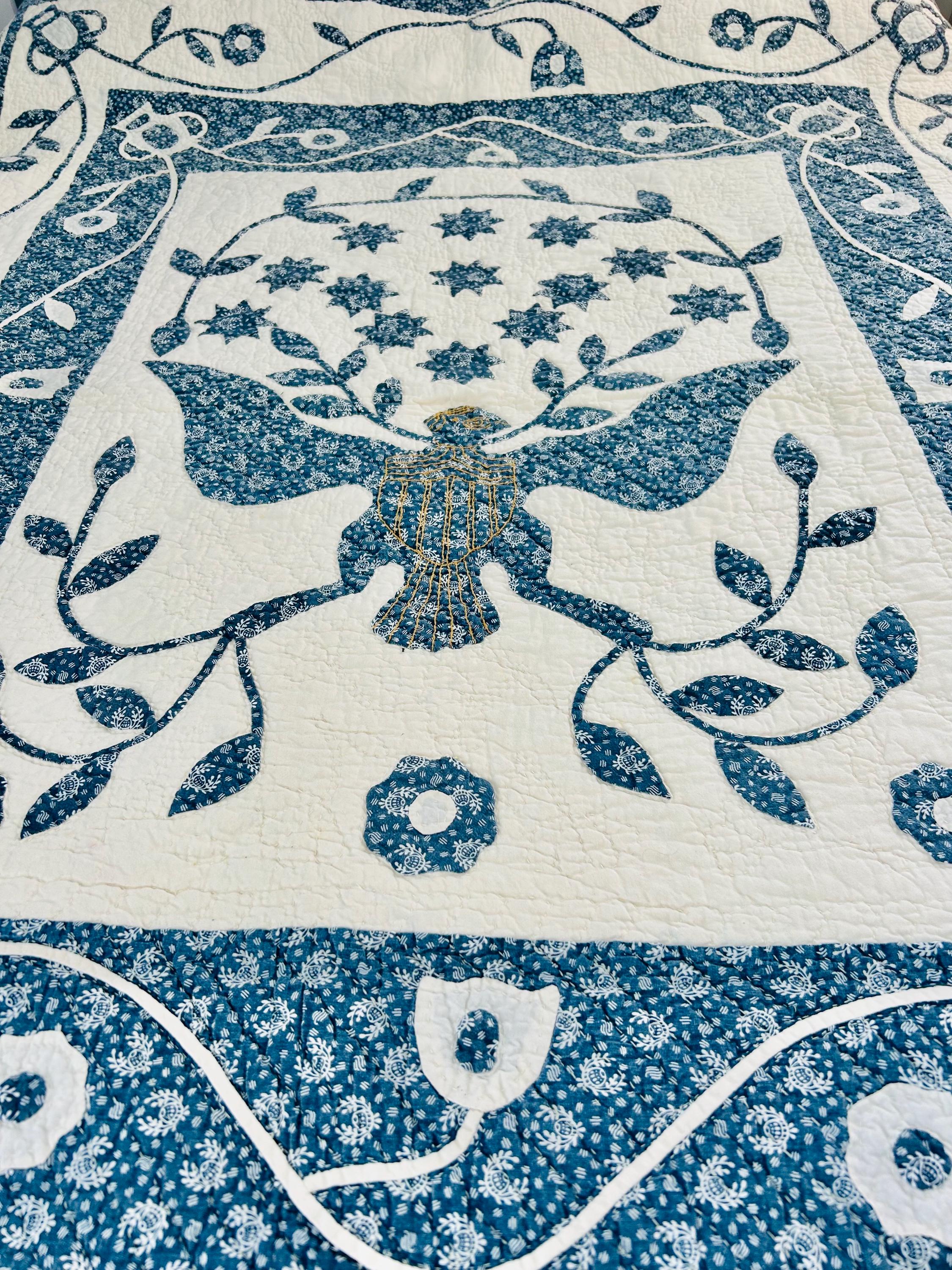 Dating to the mid-1970s Bicentennial era, this Eagle Quilt features a bold, centered Federal Eagle motif that has been embroidered with gold thread, surrounded by a halo of stars and classic floral/urn corner accents. It has a triple serpentine border and has been hand-appliqued and hand-quilted, with the quilting in outlines of the applique.