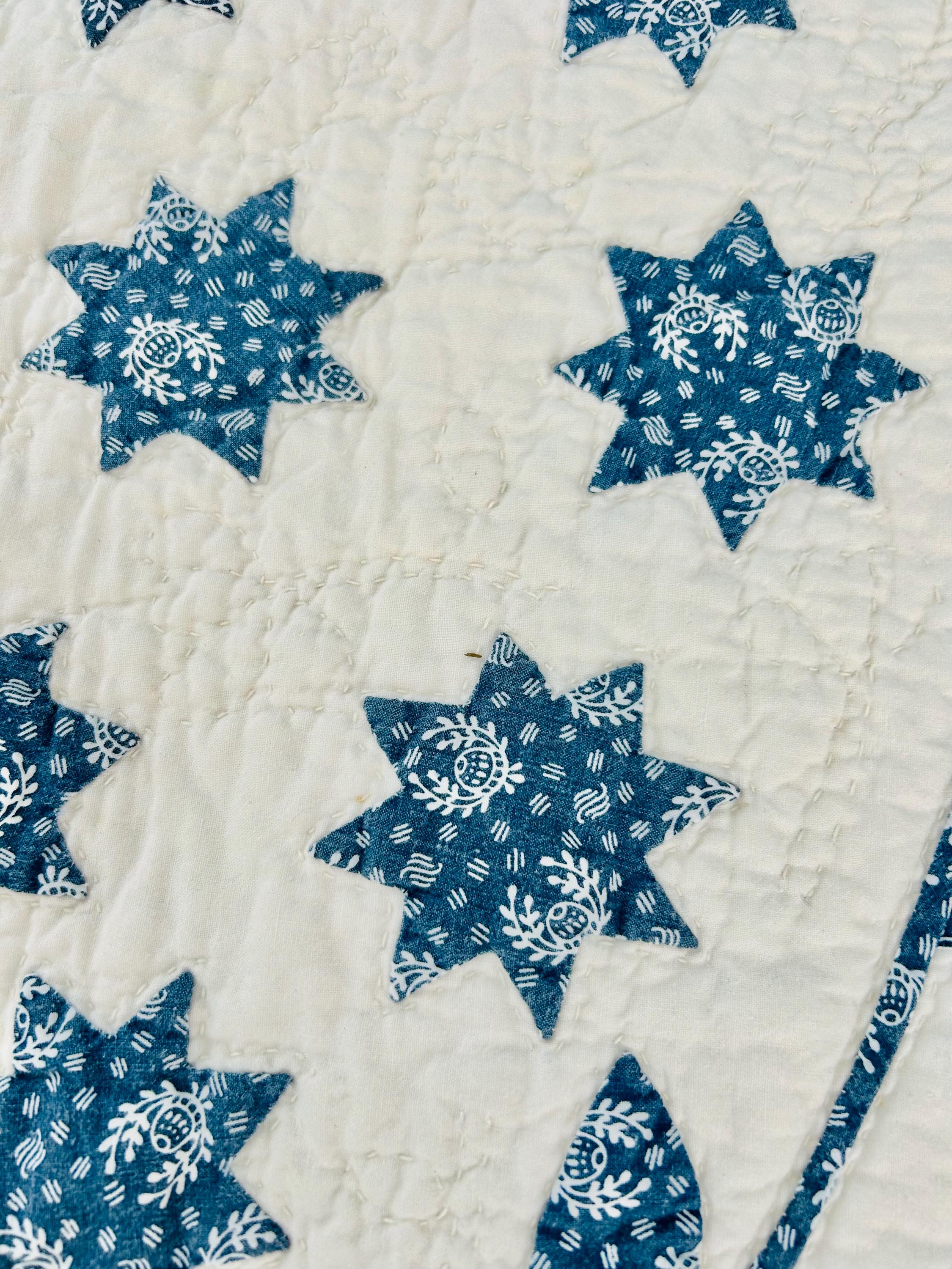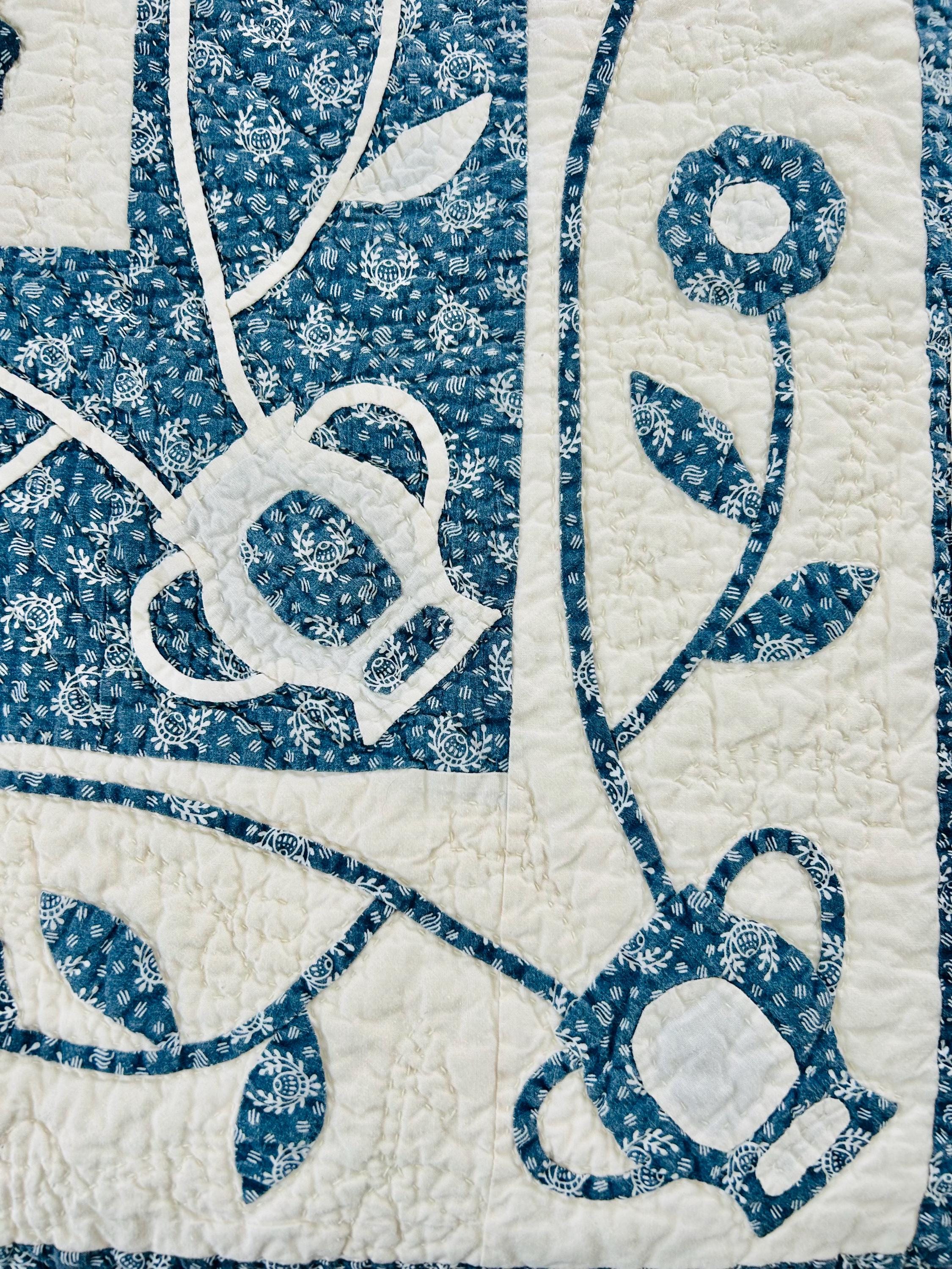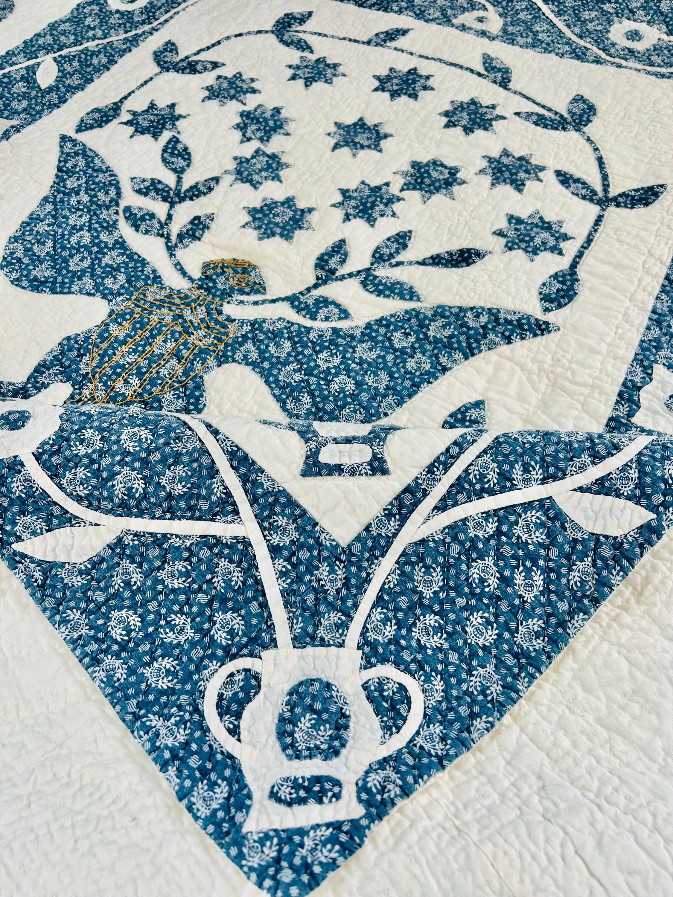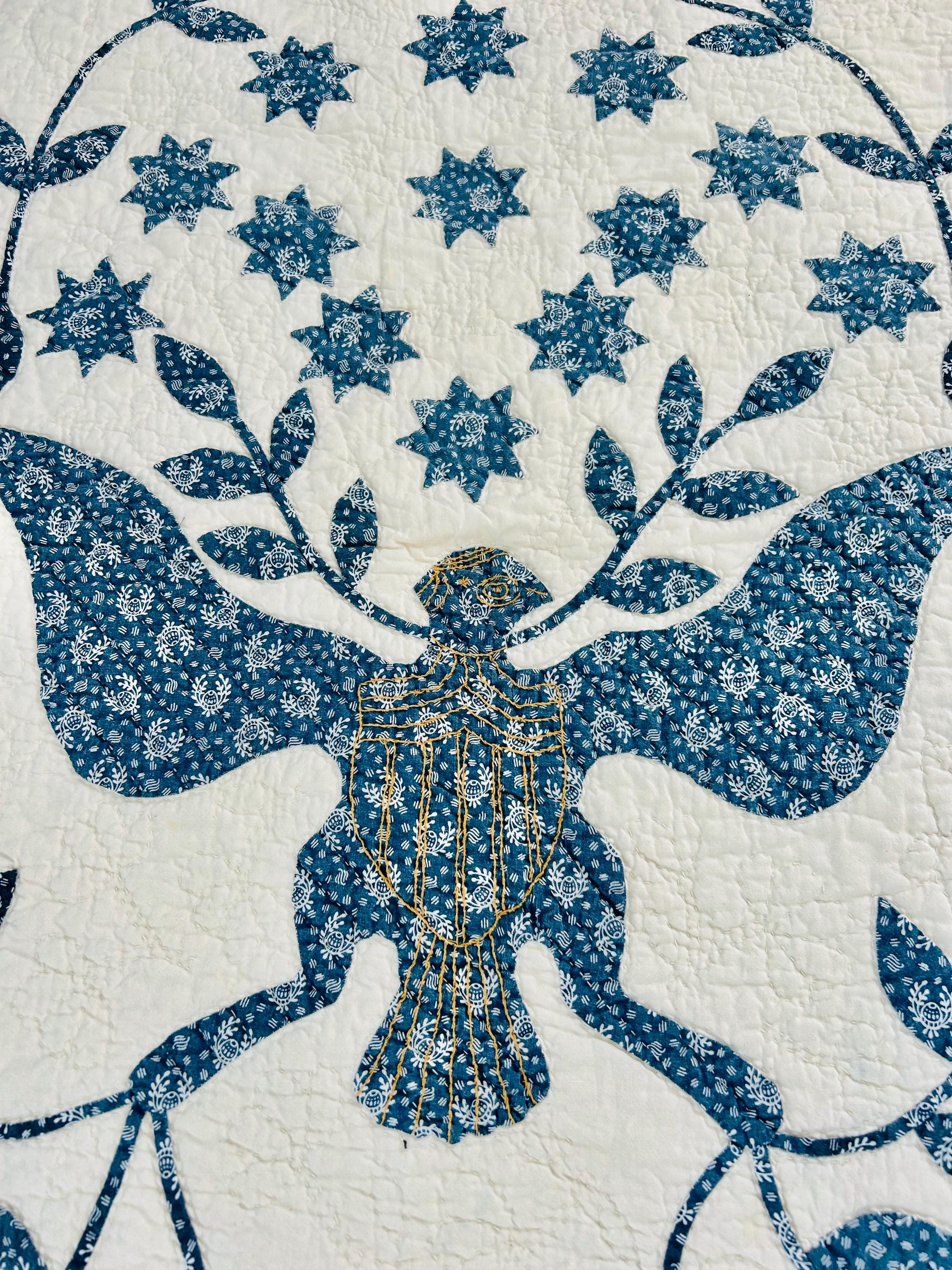 Dating to the mid-1970s Bicentennial era, this Eagle Quilt features a bold, centered Federal Eagle motif that has been embroidered with gold thread, surrounded by a halo of stars and classic floral/urn corner accents. It has a triple serpentine border and has been hand-appliqued and hand-quilted, with the quilting in outlines of the applique.