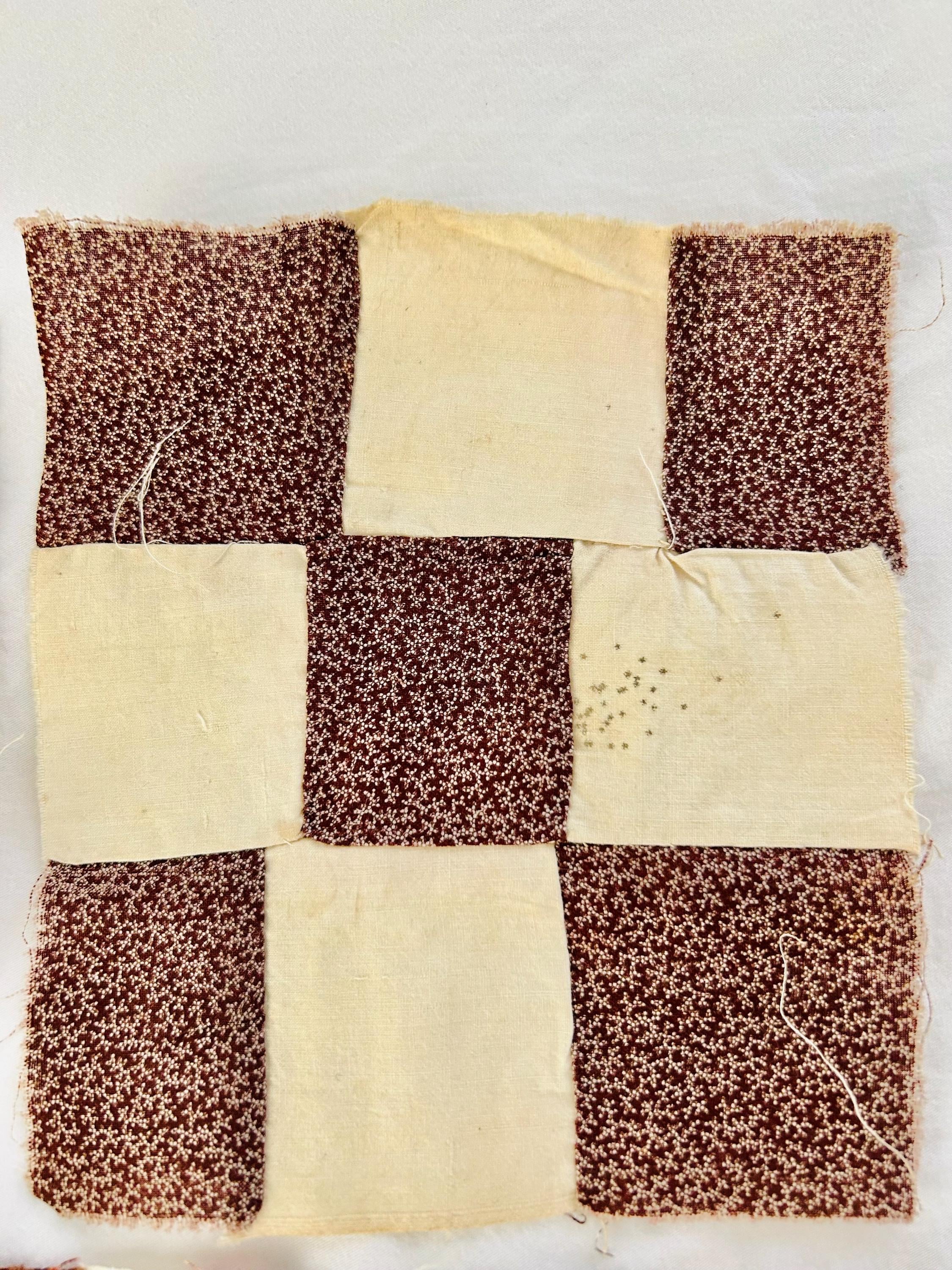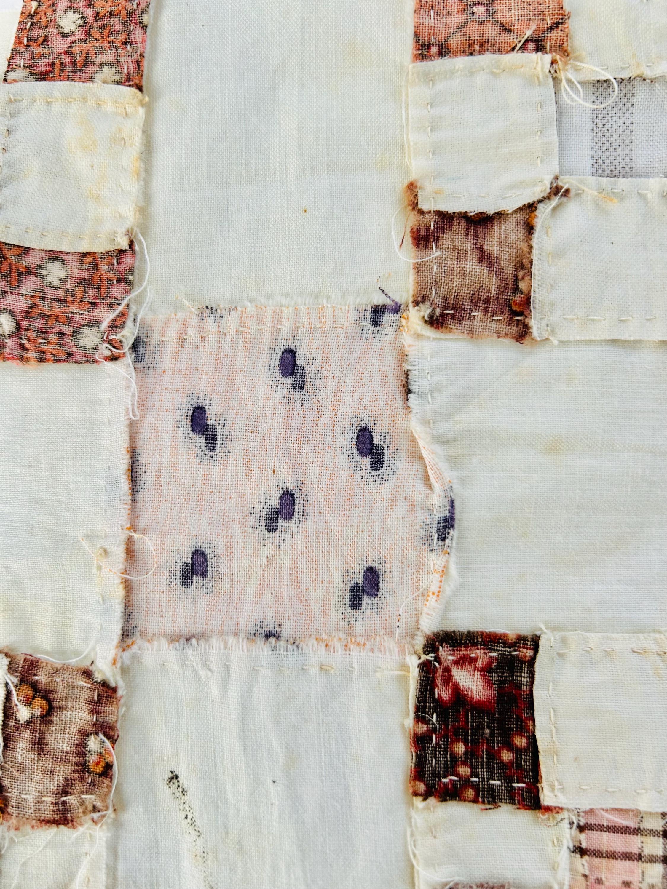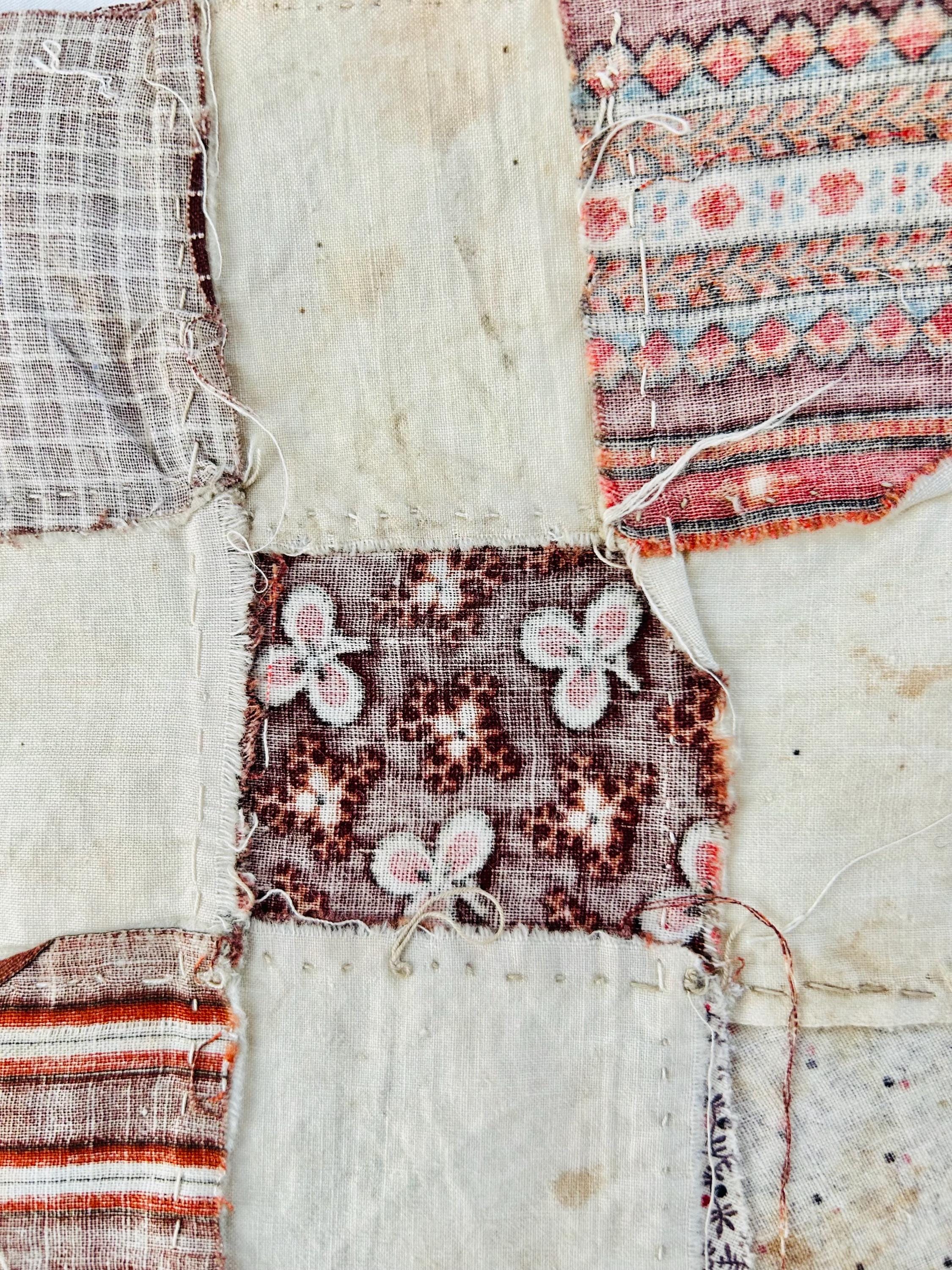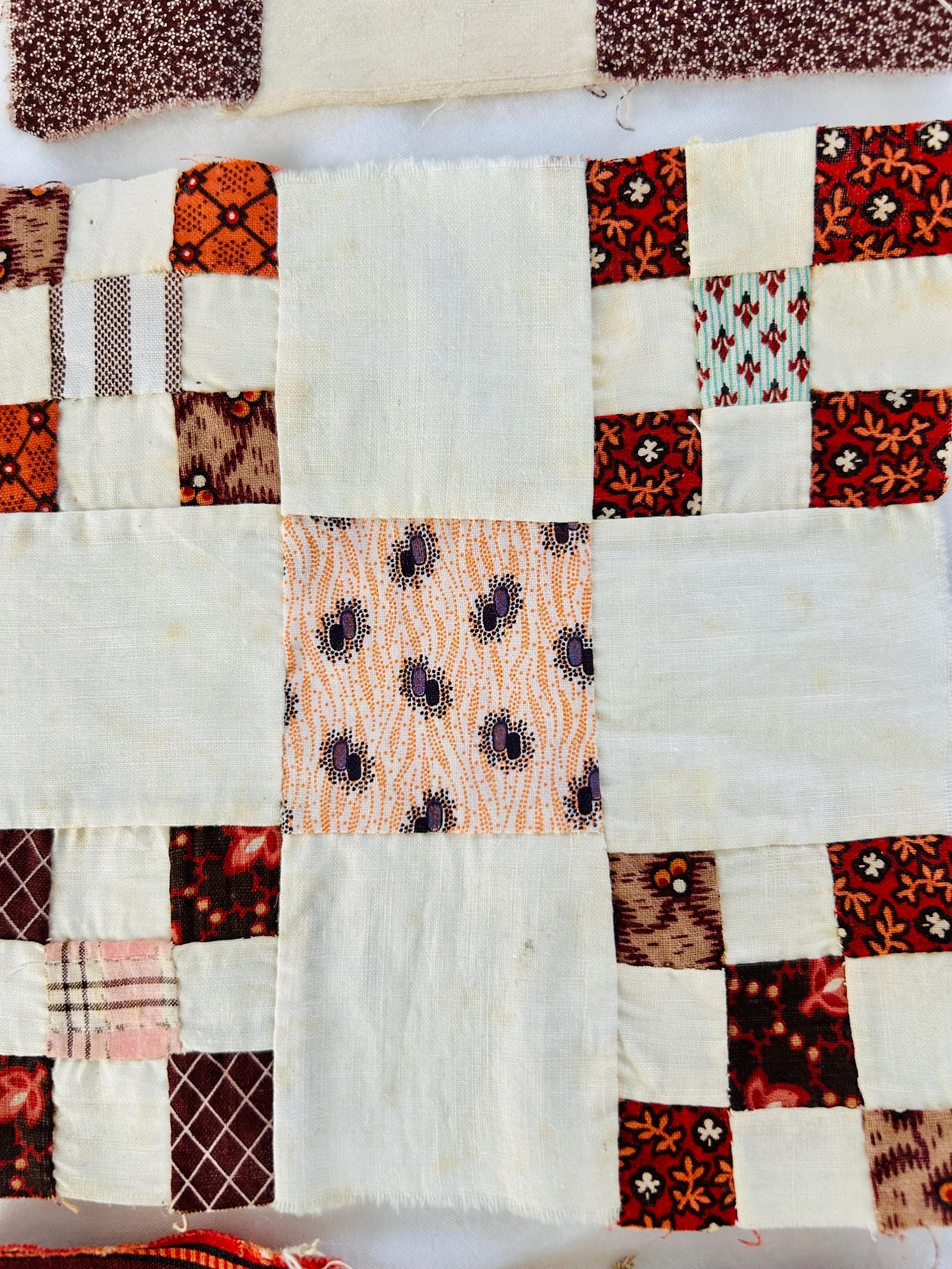 Construction is entirely consistent with the era: • hand pieced using a simple running stitch • uneven stitch length typical of early domestic sewing • soft, loosely woven cottons with natural oxidation • blocks were never quilted or assembled, likely intended for a larger project that was never completed