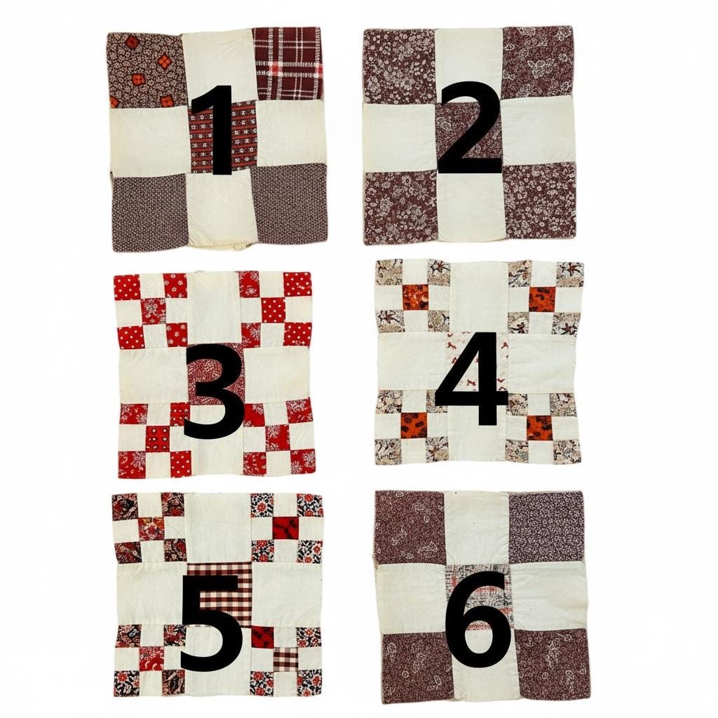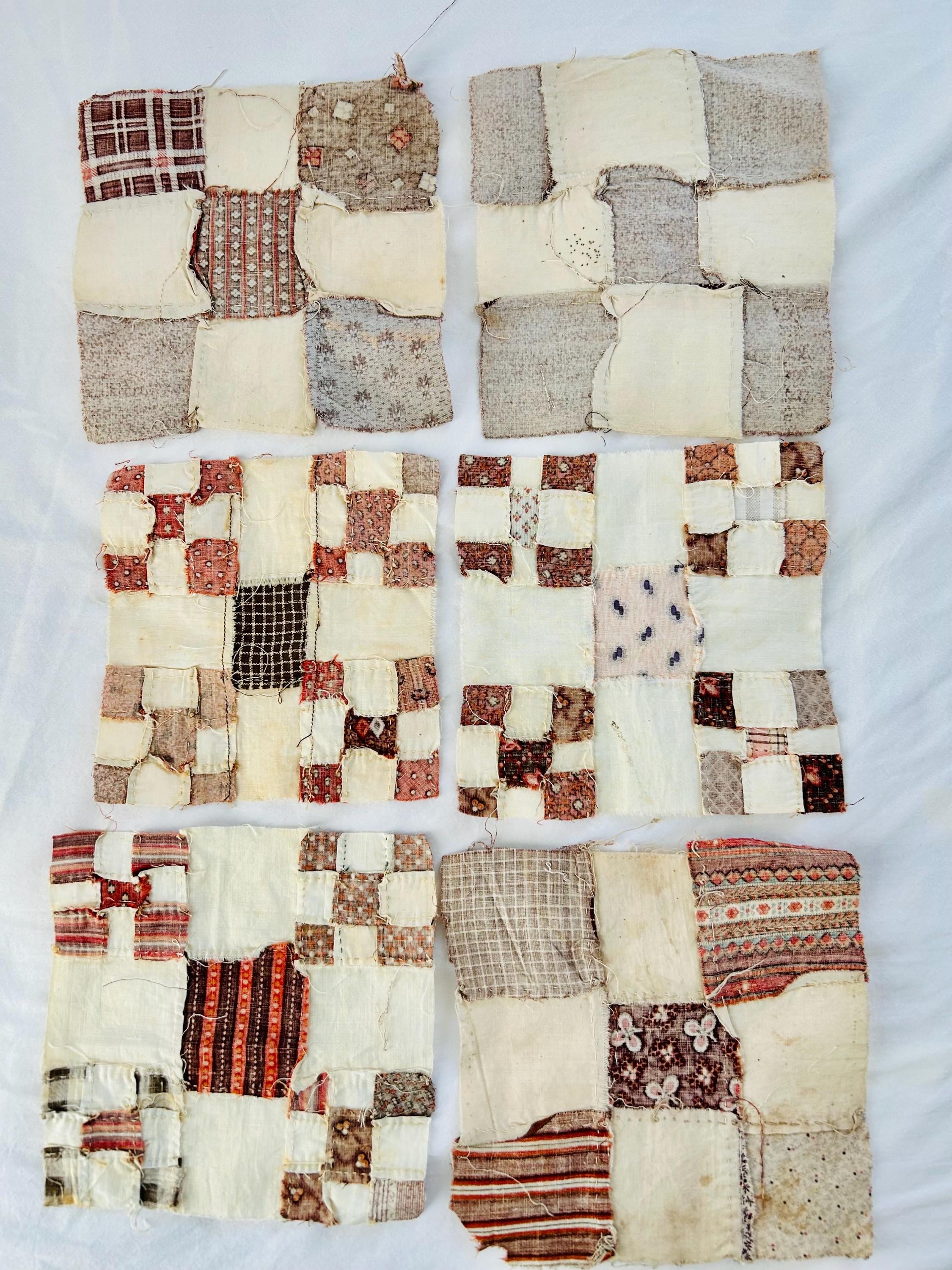 Offered here is an exceptional group of six original American quilt blocks, each measuring 7” x 7”, hand stitched entirely by hand in the early 19th century, most likely circa 1820–1835. These blocks are not later reinterpretations or fragments cut down from a finished quilt, but true period blocks, preserved just as they were pieced more than two centuries ago.