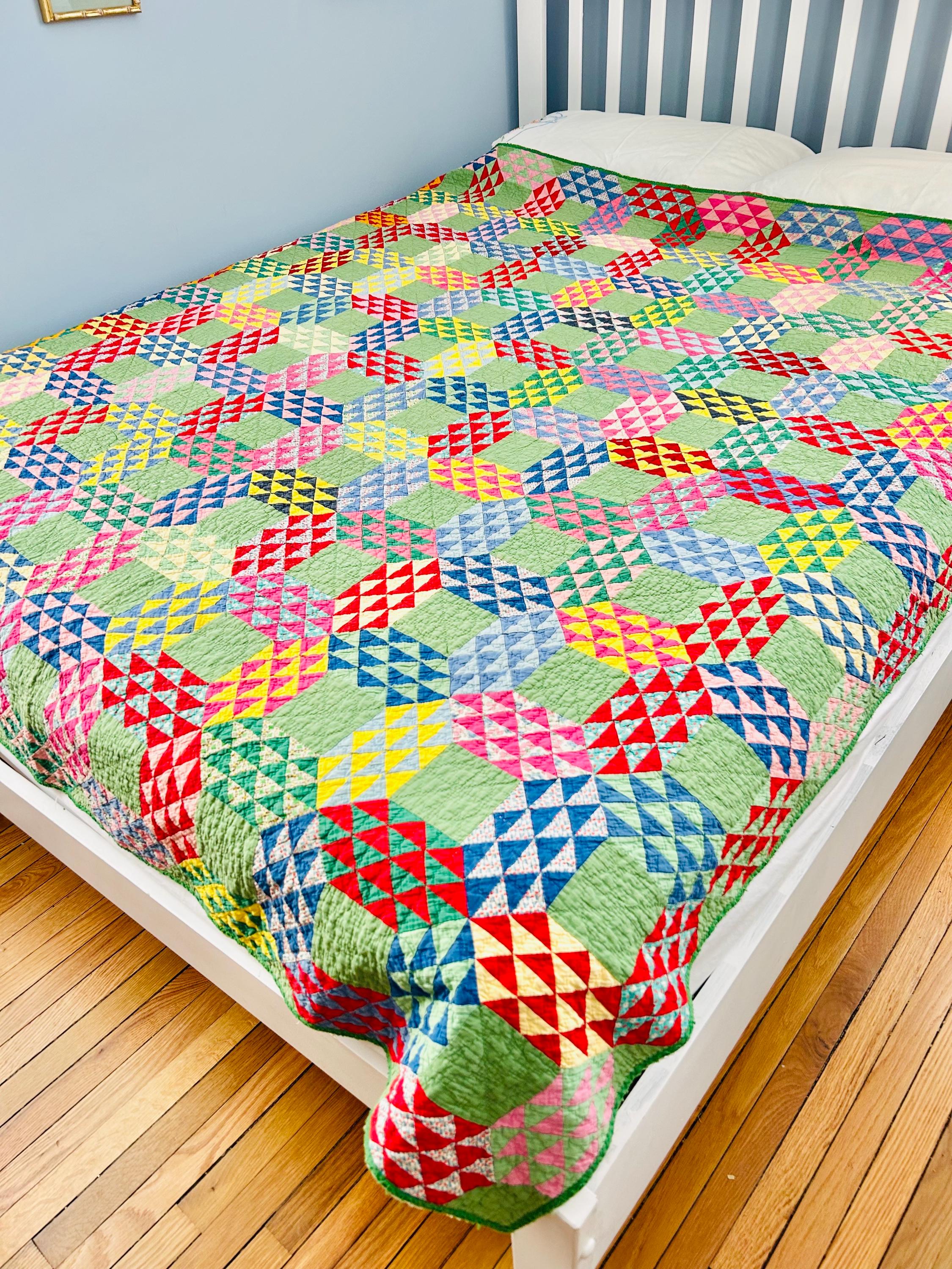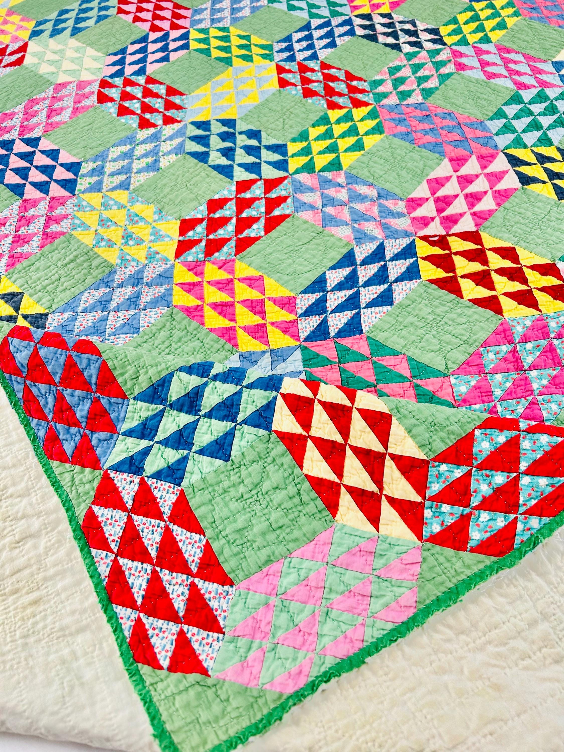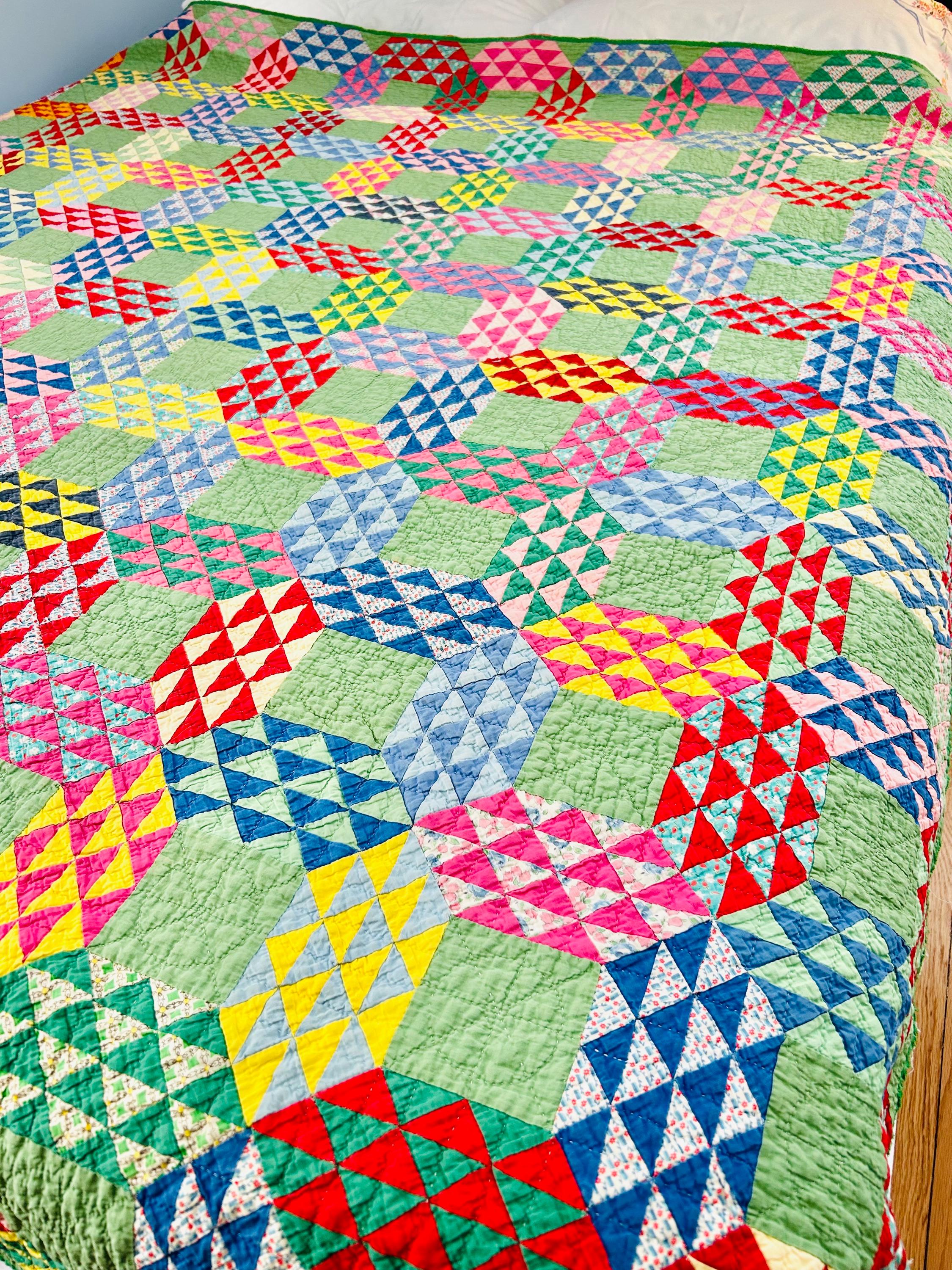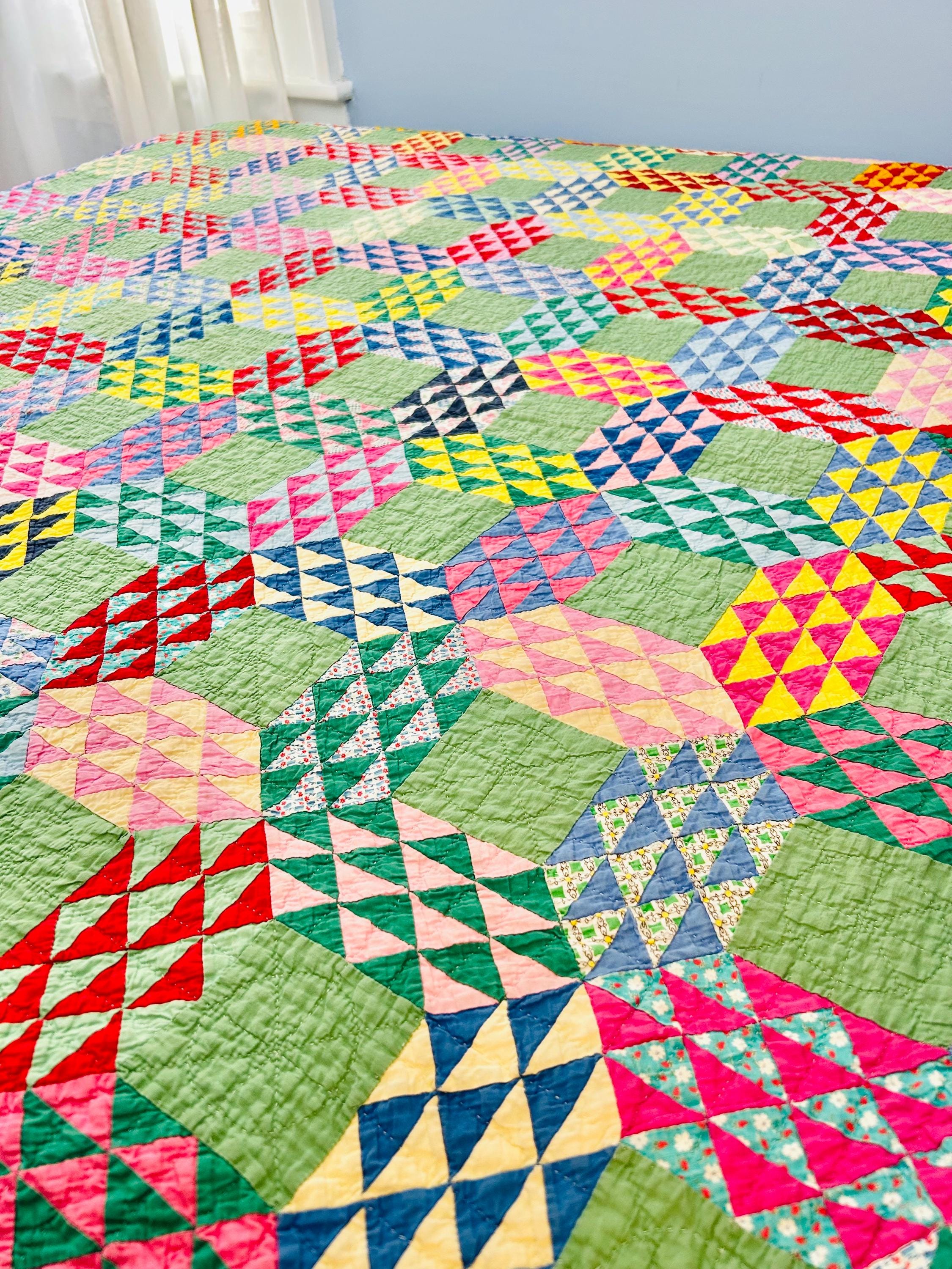 This 1930s Ocean Waves Quilt is pieced from hundreds of precision-pieced scrappy feedsack triangles set against a vibrant "Nile Green" solid ground. The hand-quilting is in cross-hatches through the triangles and in spiderwebs/bullseyes in the green areas.