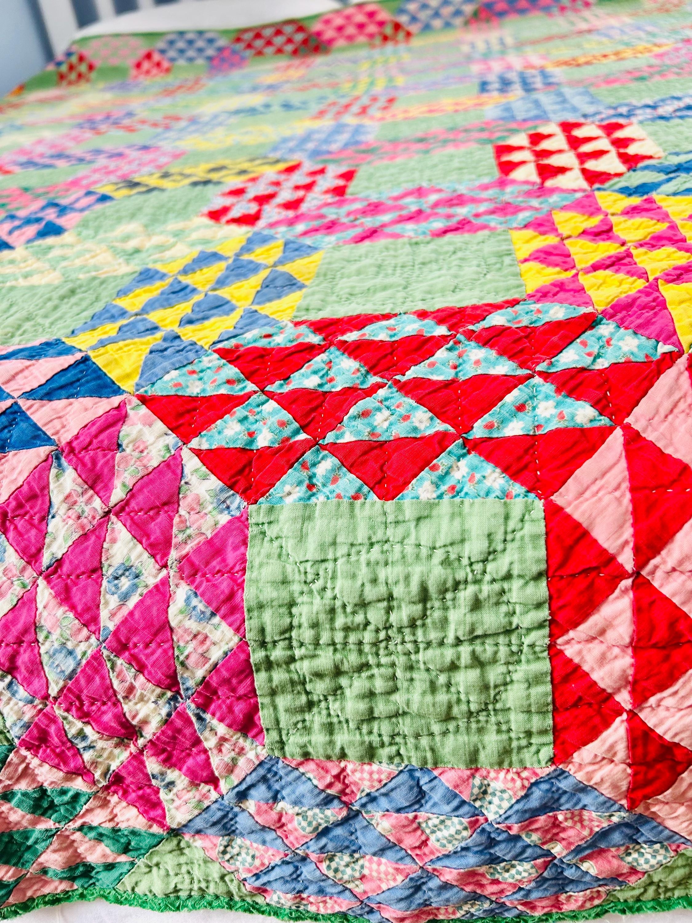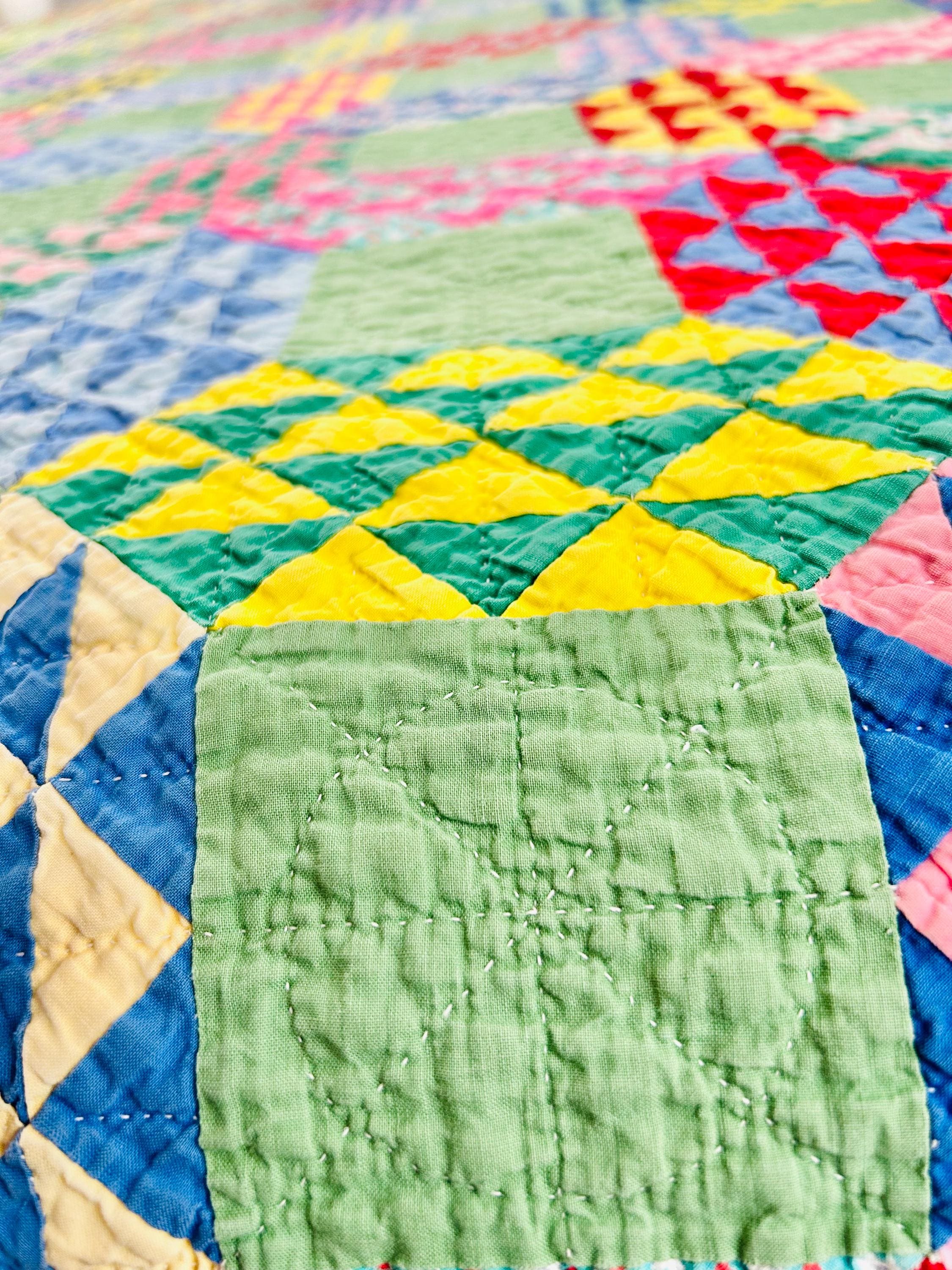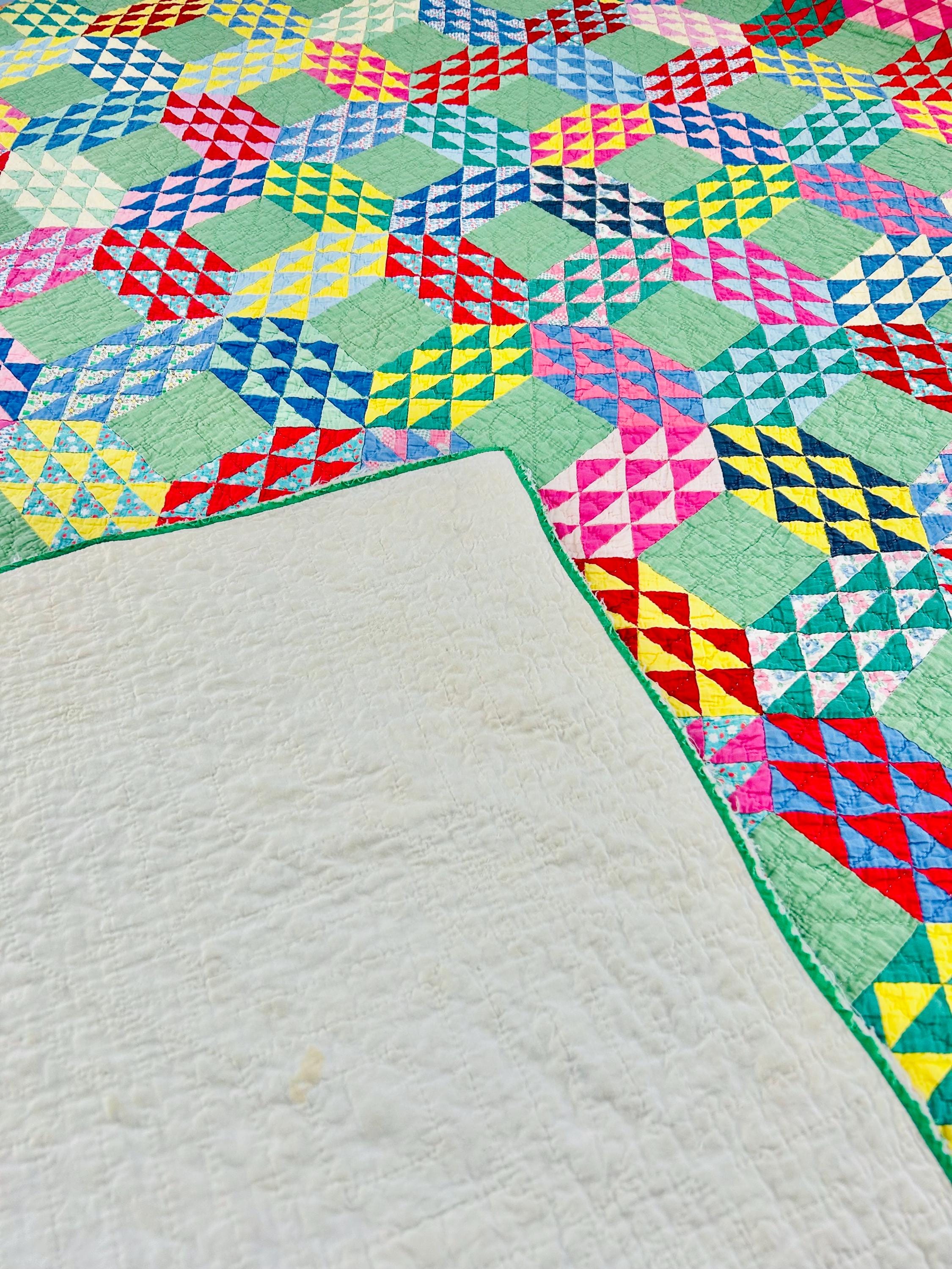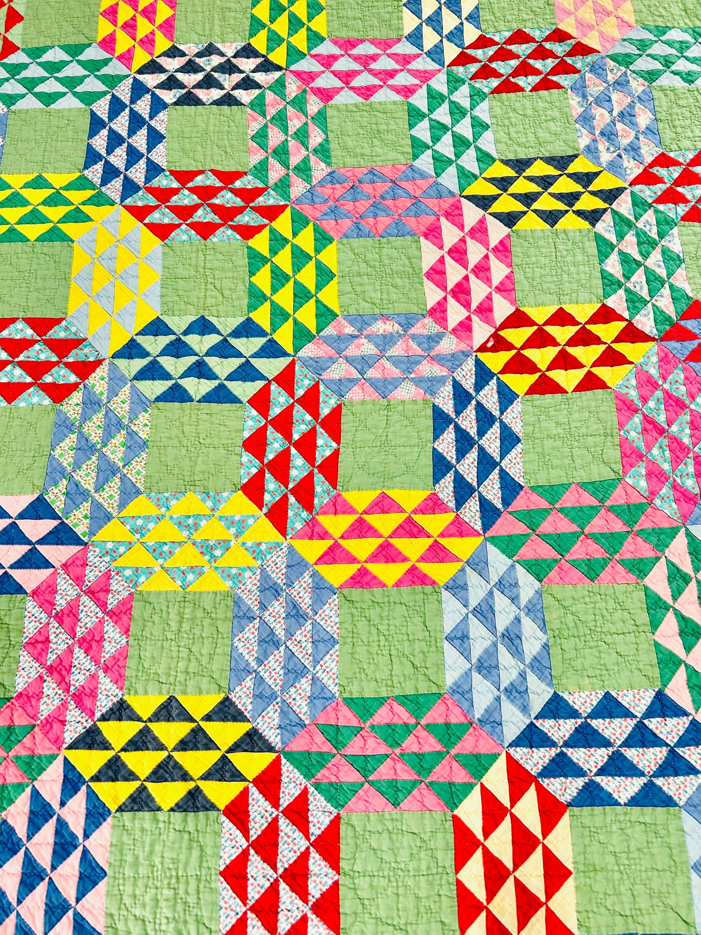 This 1930s Ocean Waves Quilt is pieced from hundreds of precision-pieced scrappy feedsack triangles set against a vibrant "Nile Green" solid ground. The hand-quilting is in cross-hatches through the triangles and in spiderwebs/bullseyes in the green areas.