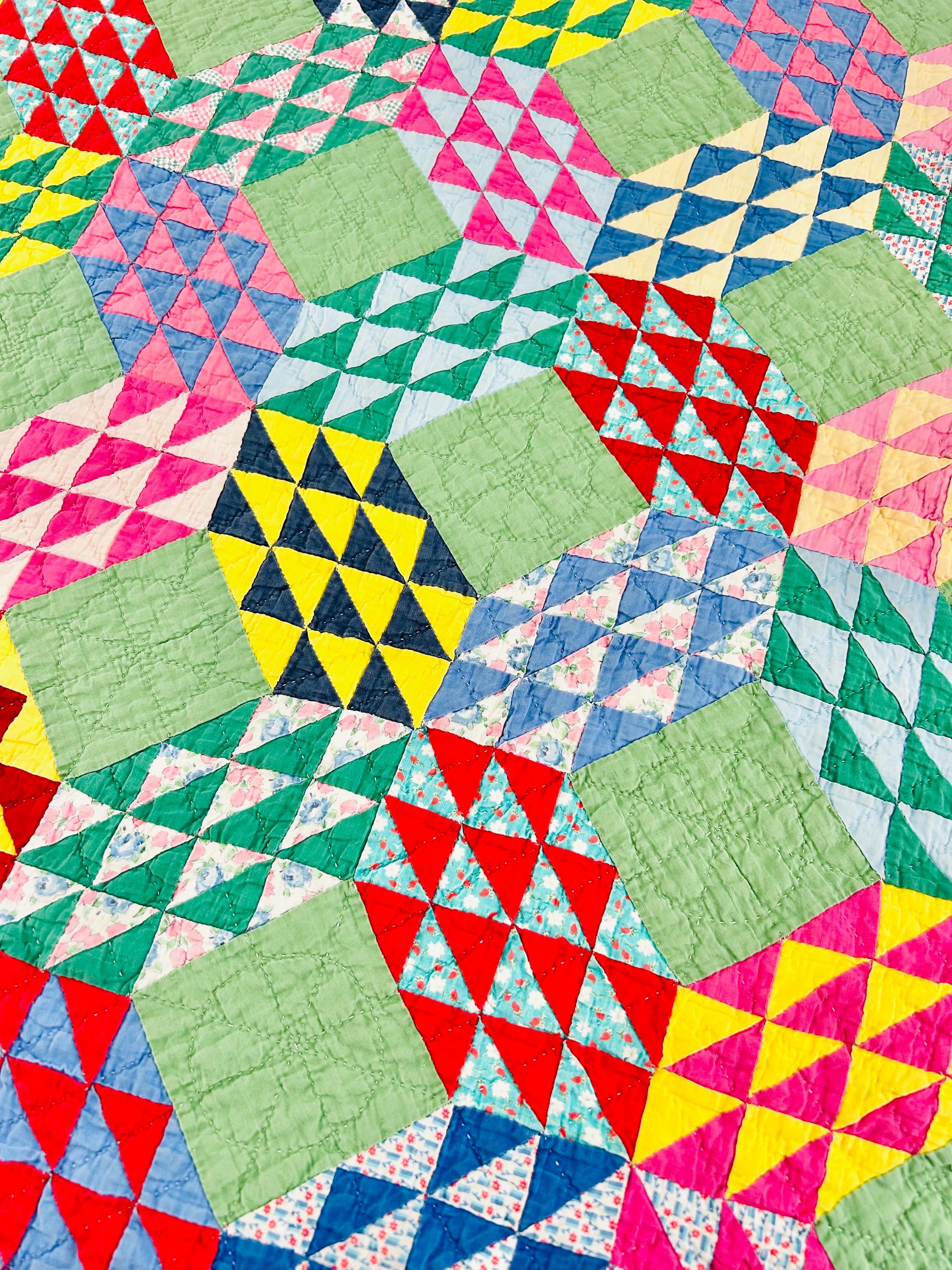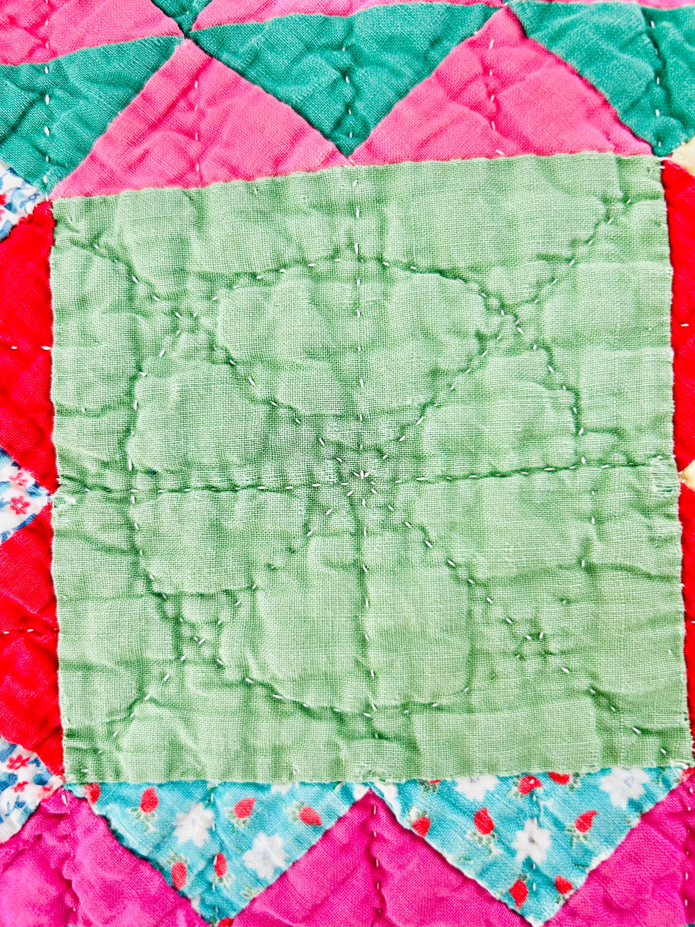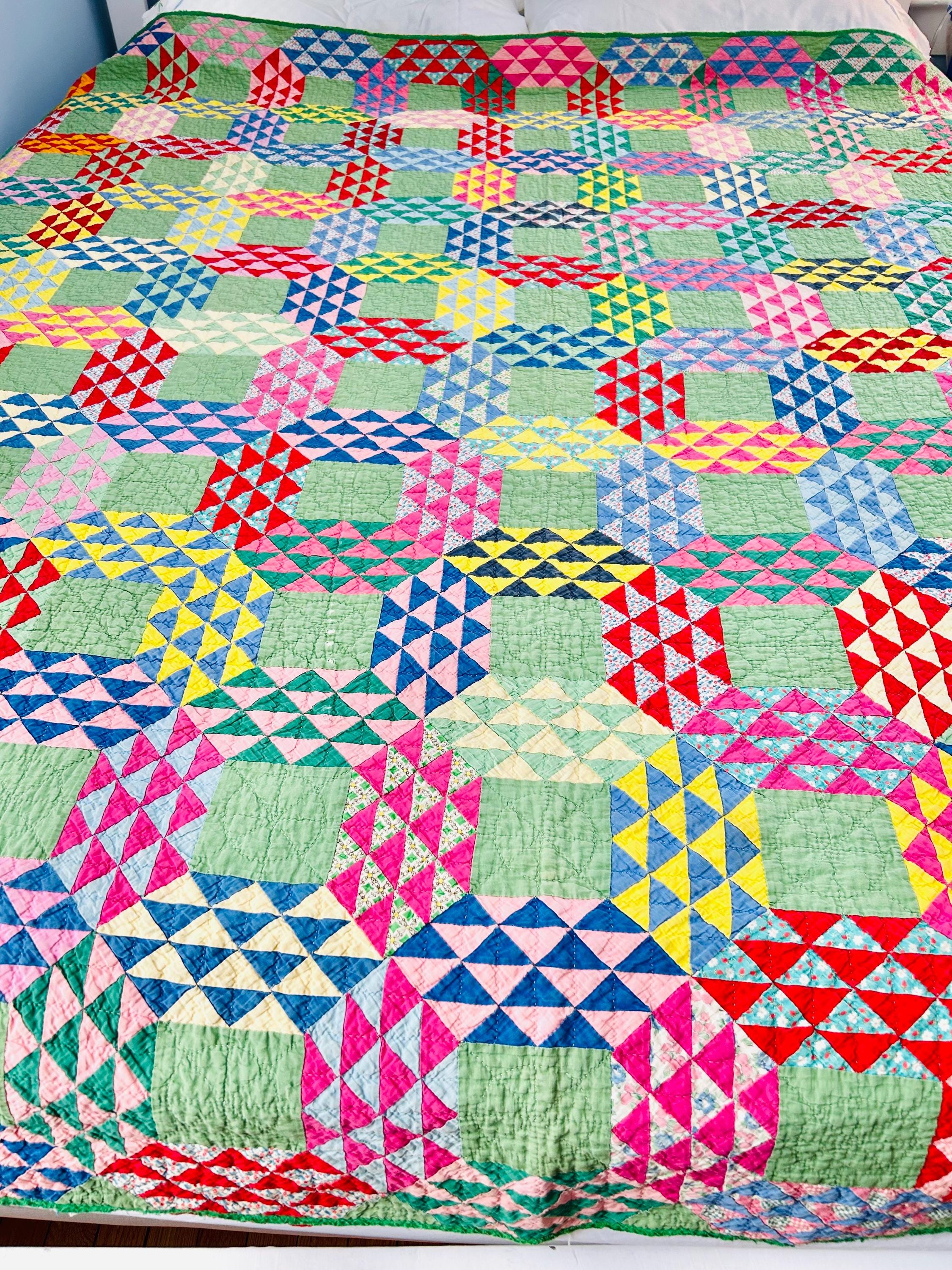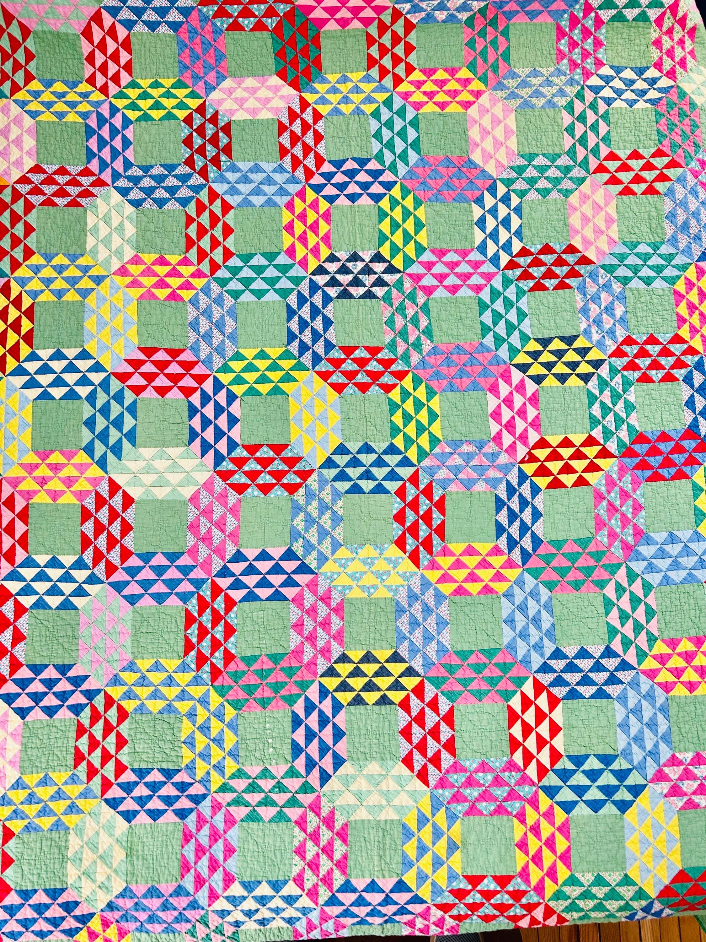 This 1930s Ocean Waves Quilt is pieced from hundreds of precision-pieced scrappy feedsack triangles set against a vibrant "Nile Green" solid ground. The hand-quilting is in cross-hatches through the triangles and in spiderwebs/bullseyes in the green areas.