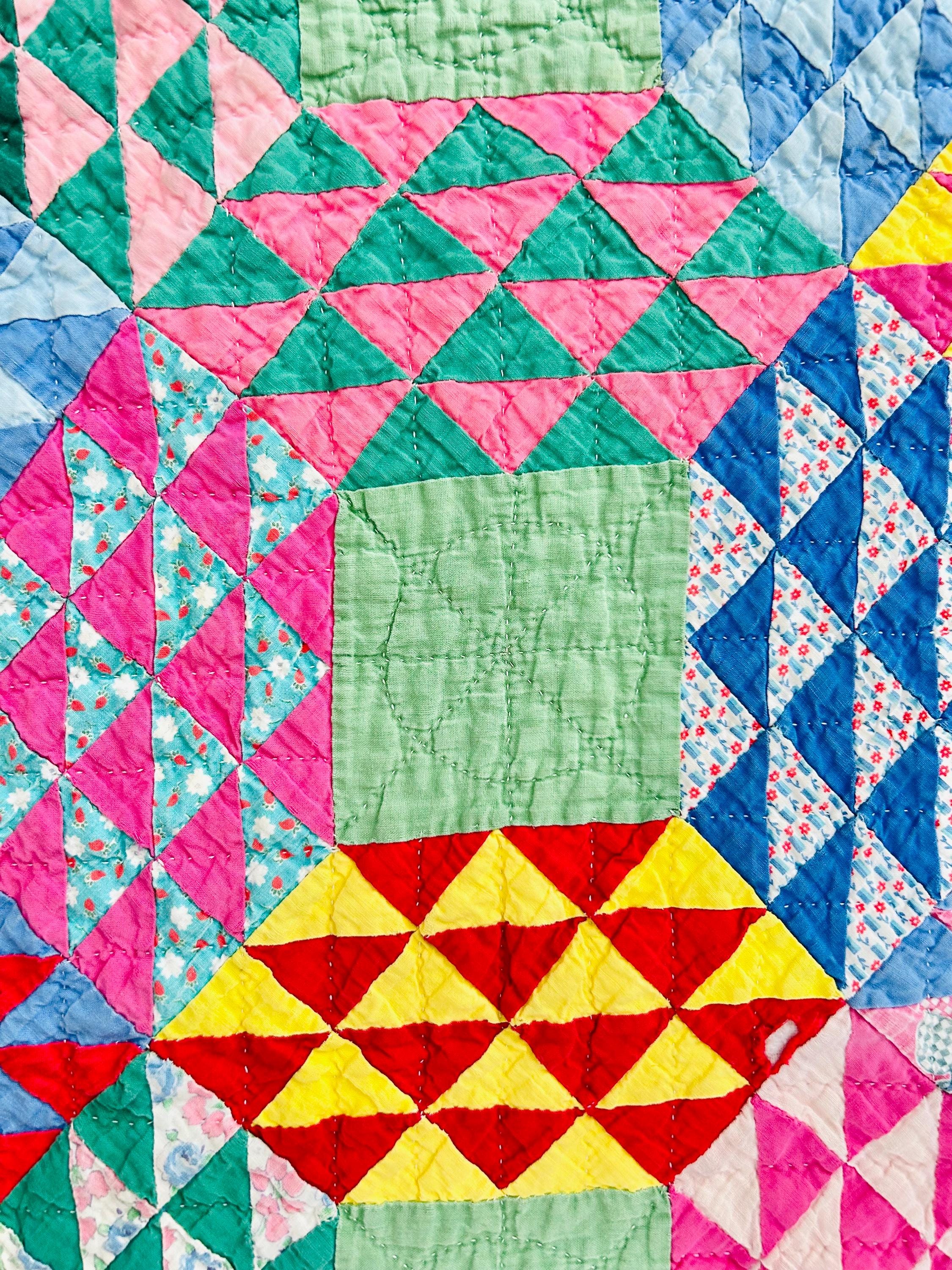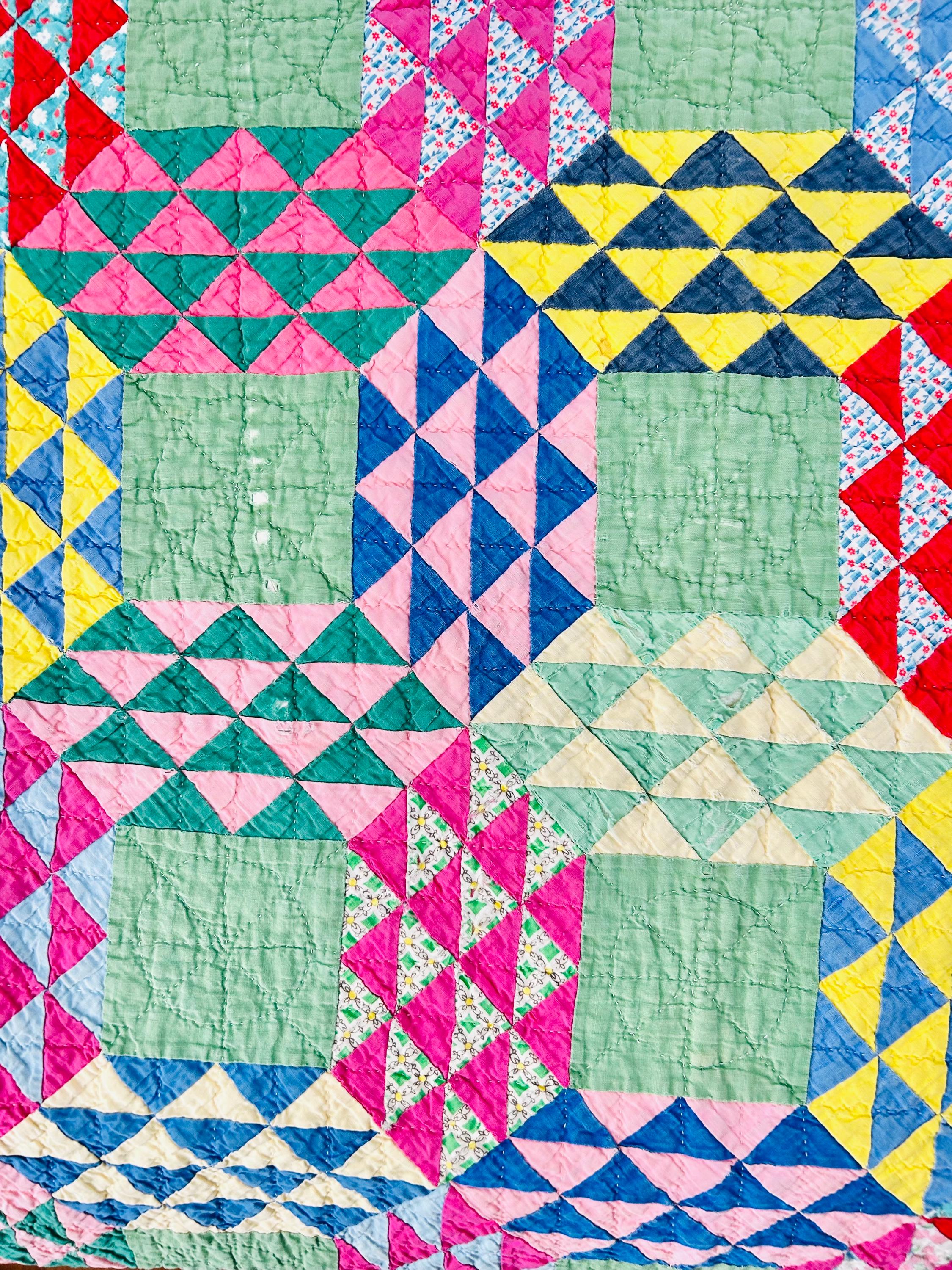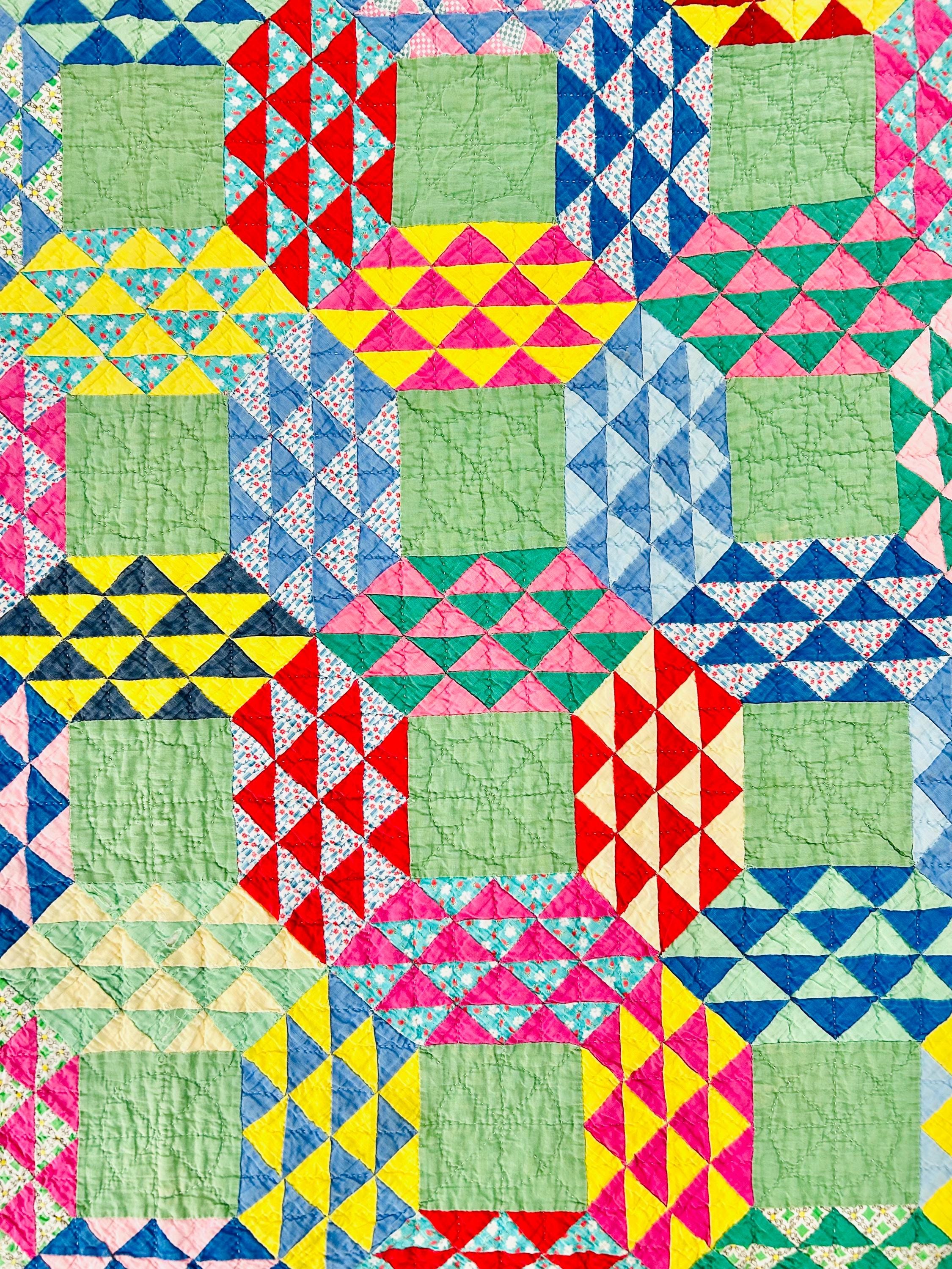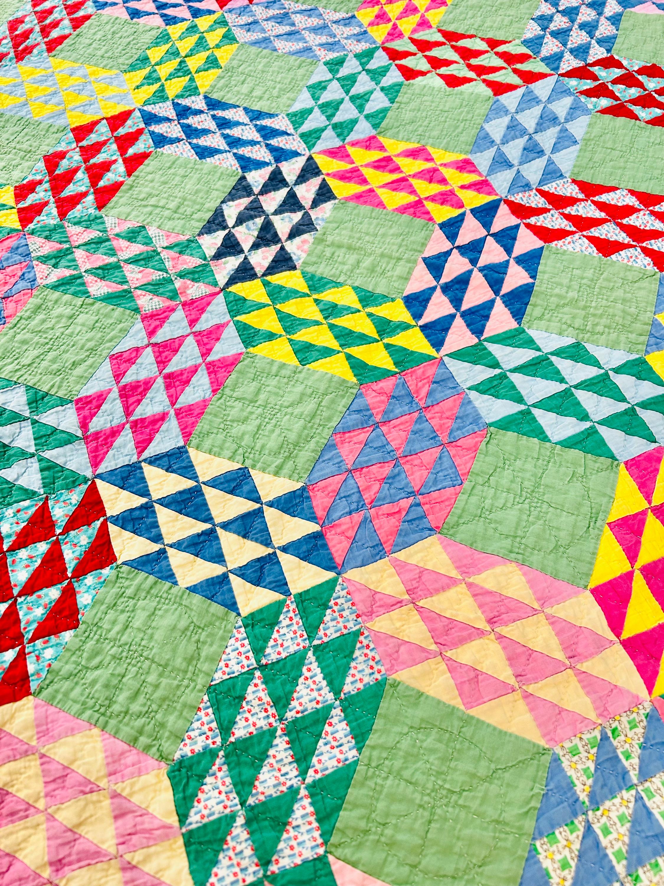 This 1930s Ocean Waves Quilt is pieced from hundreds of precision-pieced scrappy feedsack triangles set against a vibrant "Nile Green" solid ground. The hand-quilting is in cross-hatches through the triangles and in spiderwebs/bullseyes in the green areas.