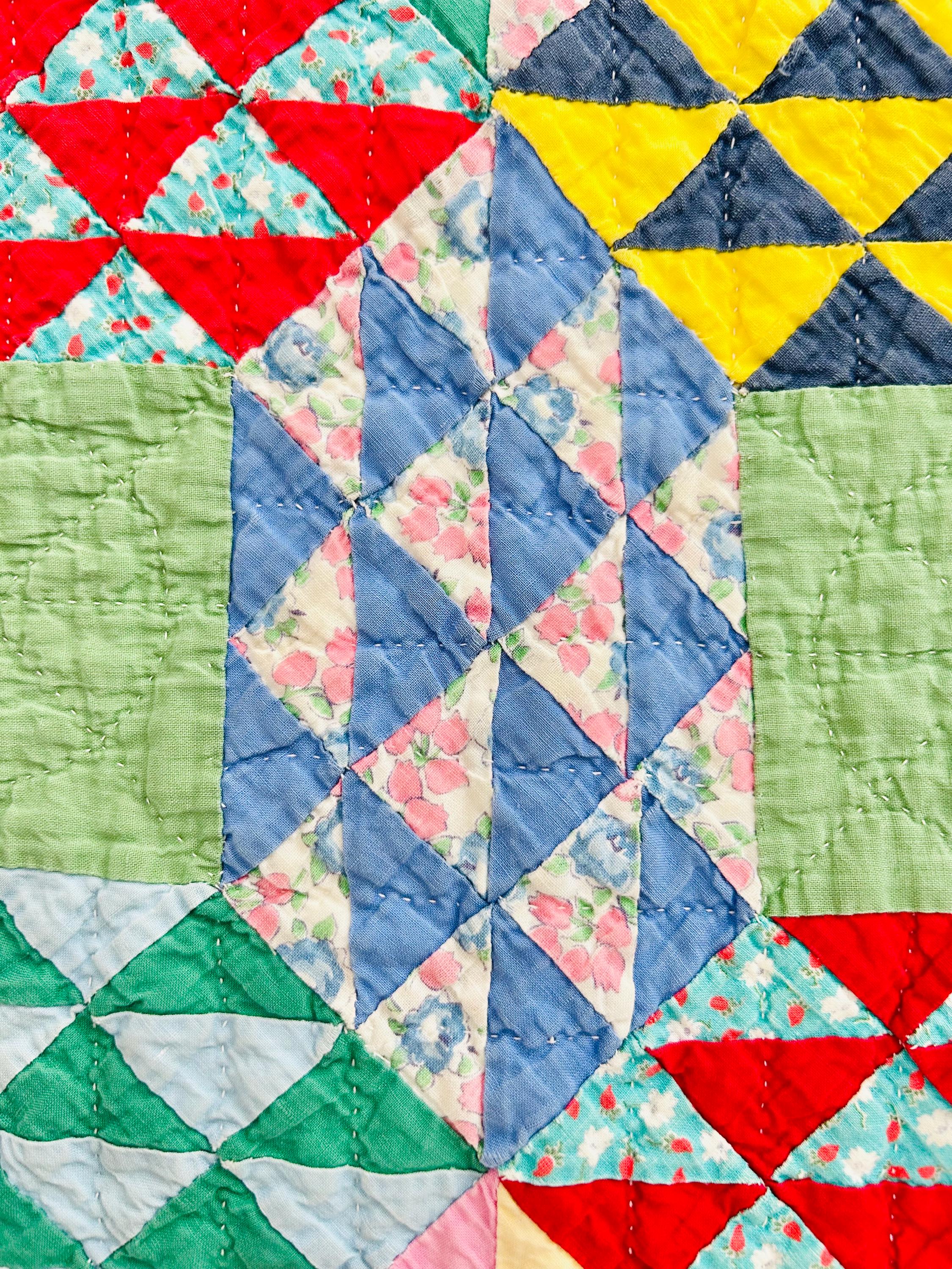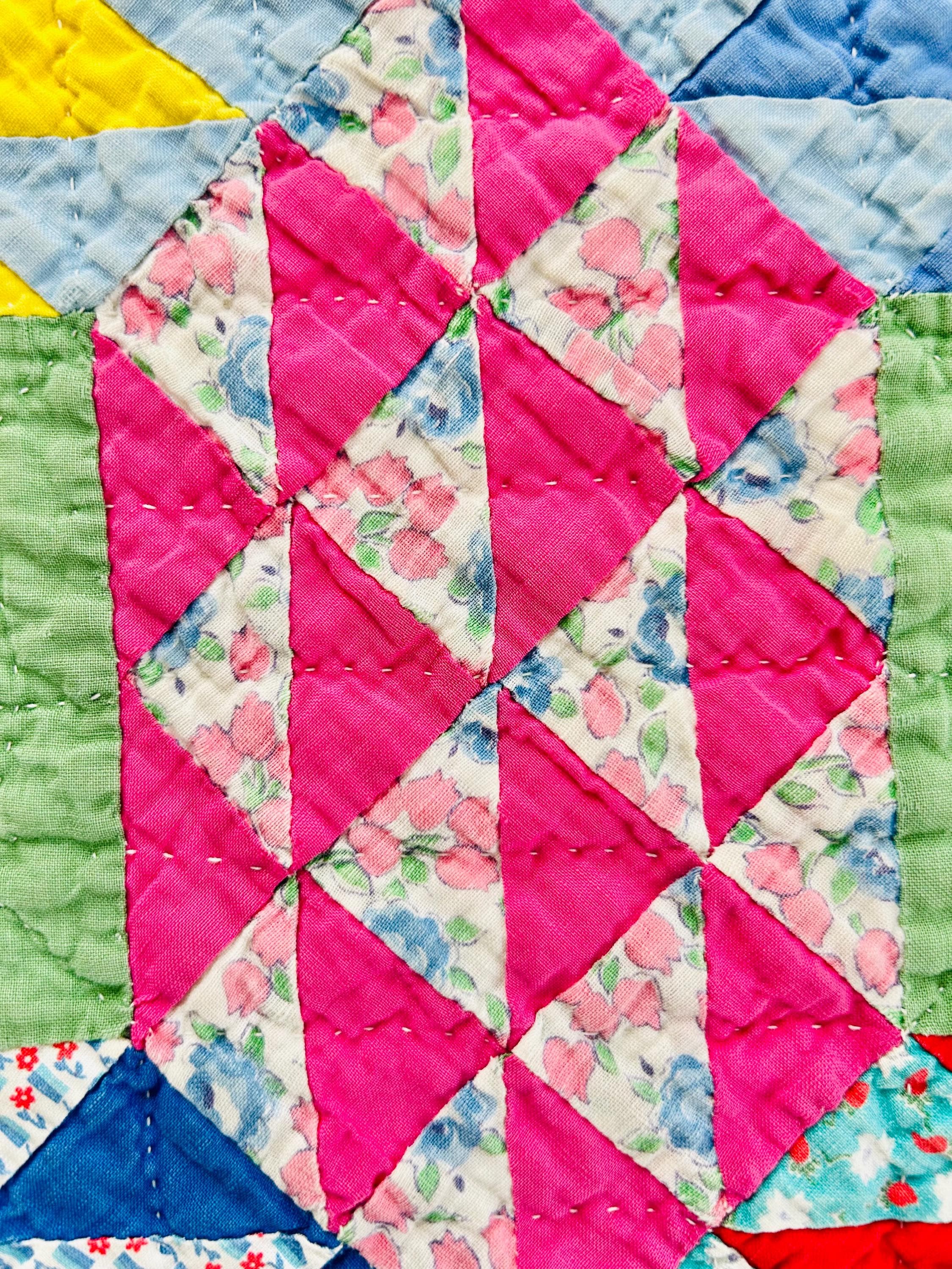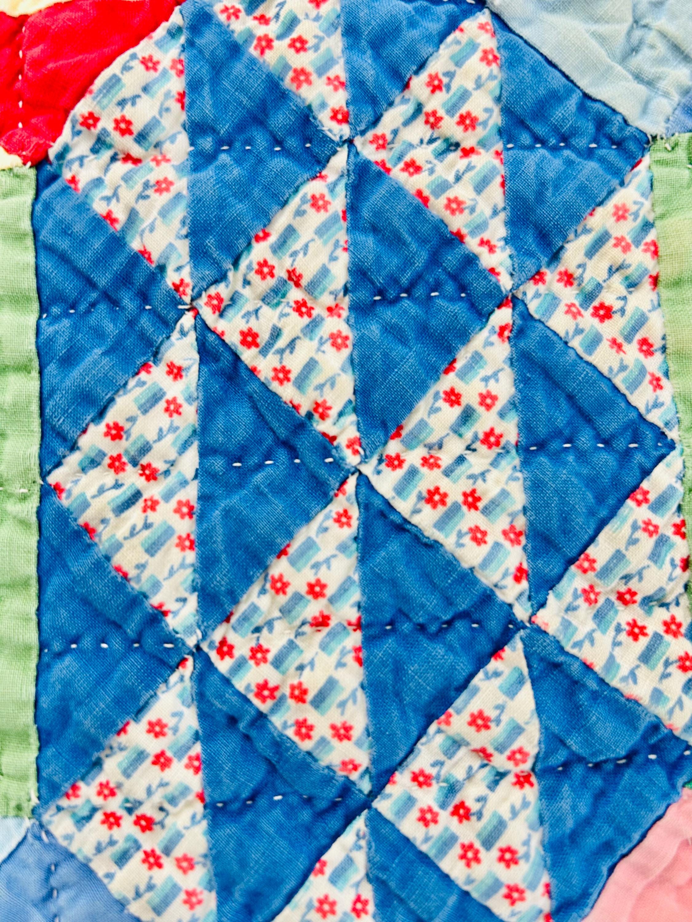 Details • Date (top): circa 1930s • Construction: Hand-pieced and hand-quilted • Pattern: Ocean Waves • Fabrics: 1930s cottons including feedsack prints • Backing: Solid white cotton • Size: 63” x 70”