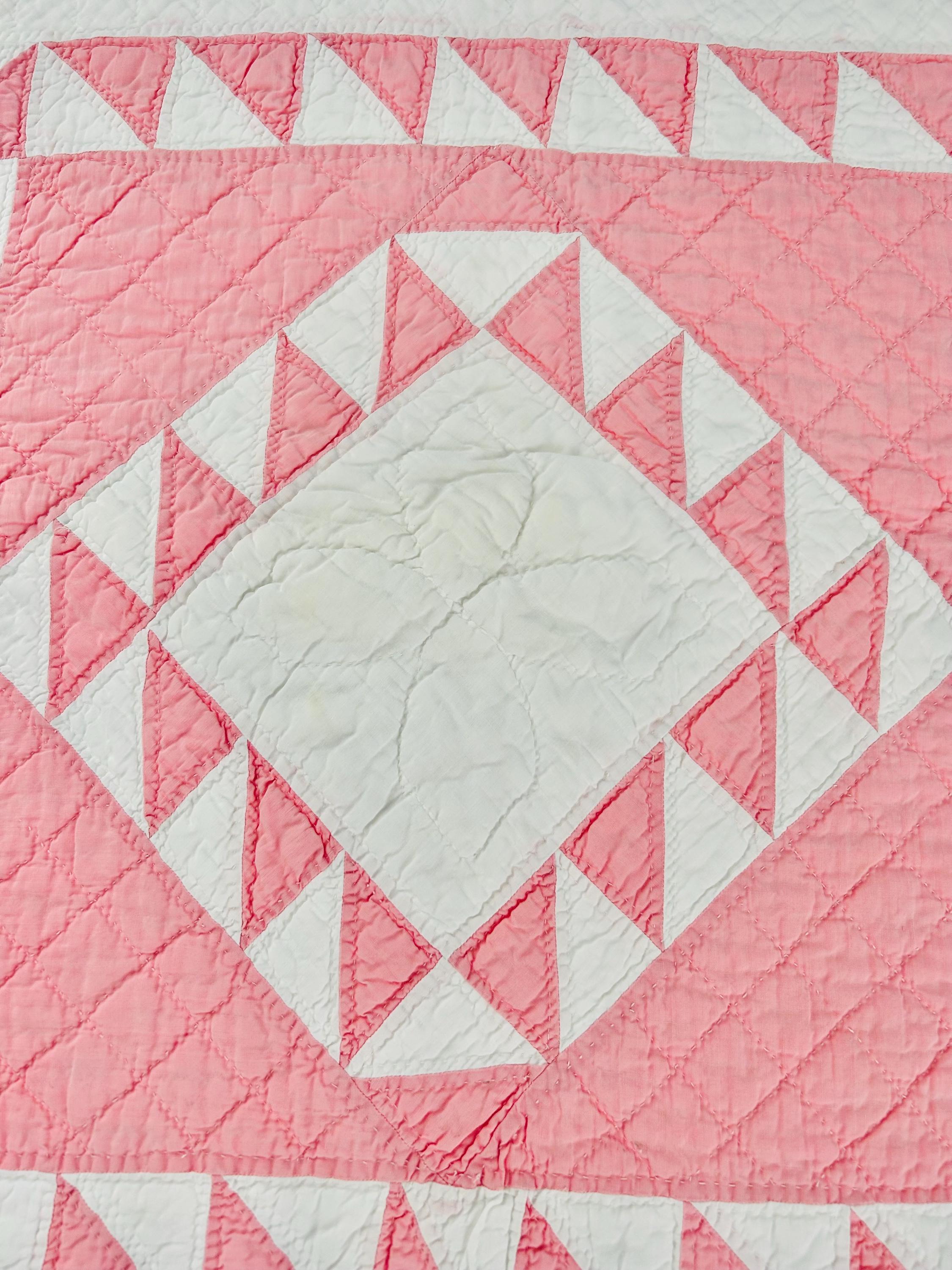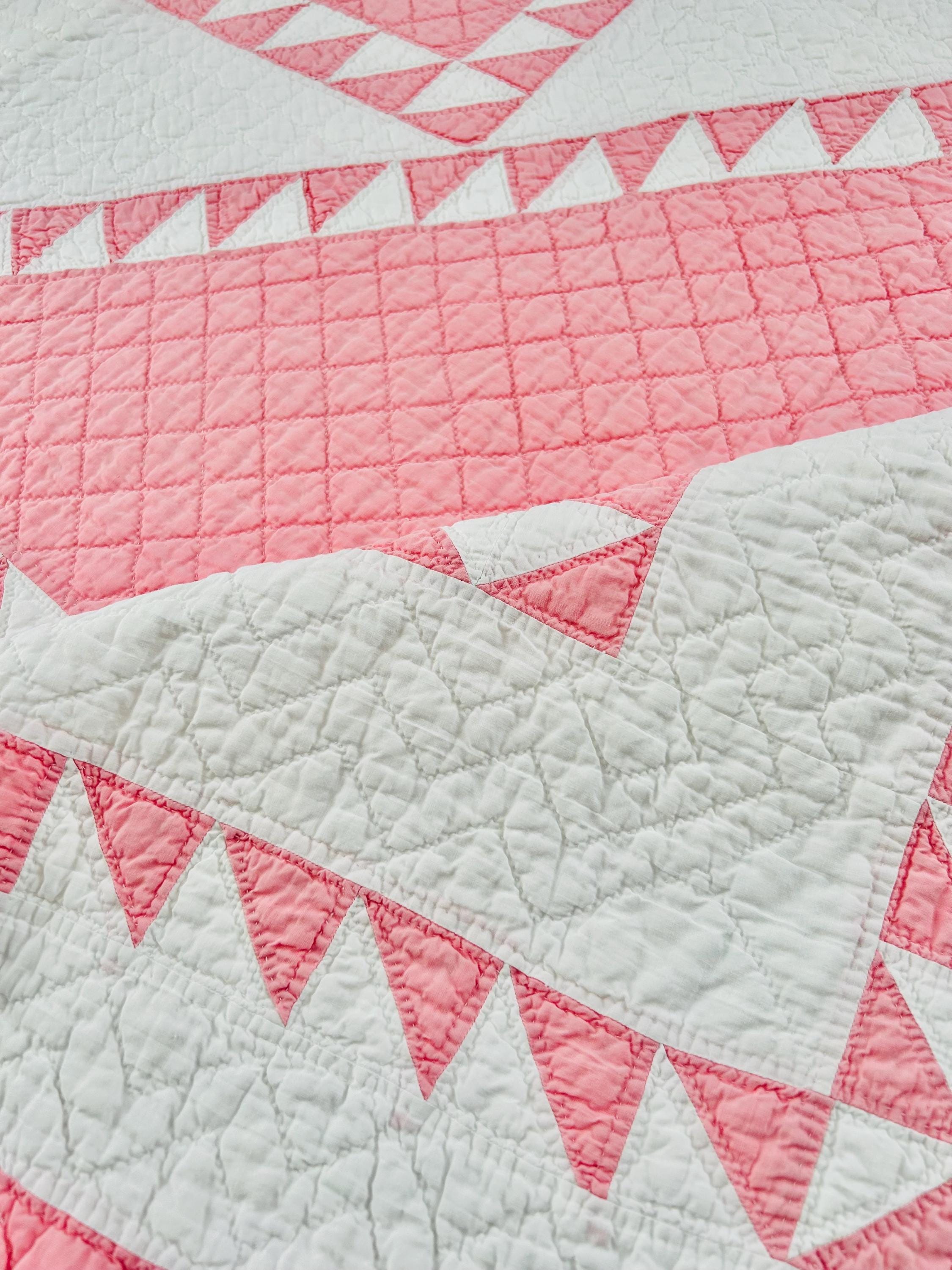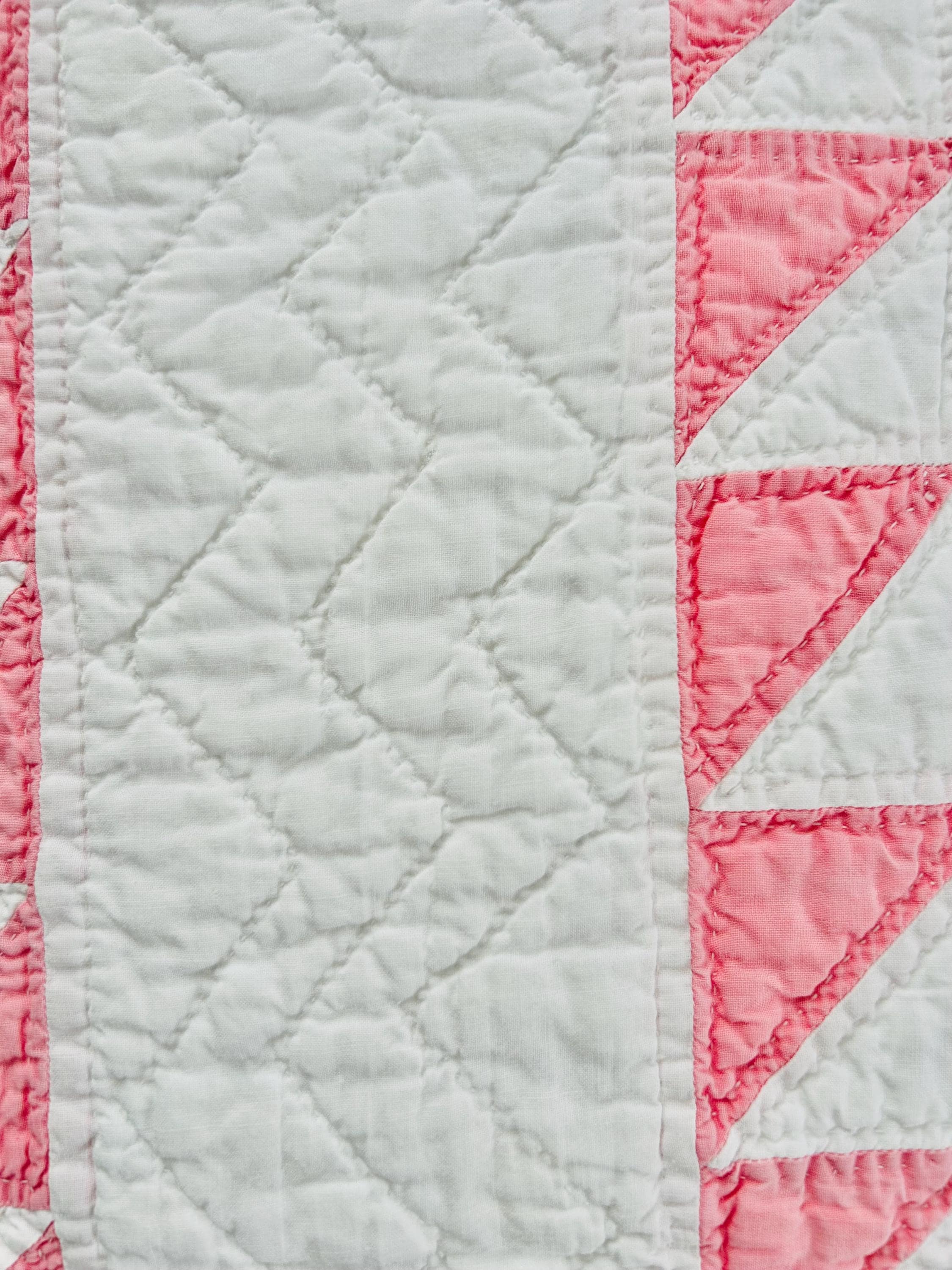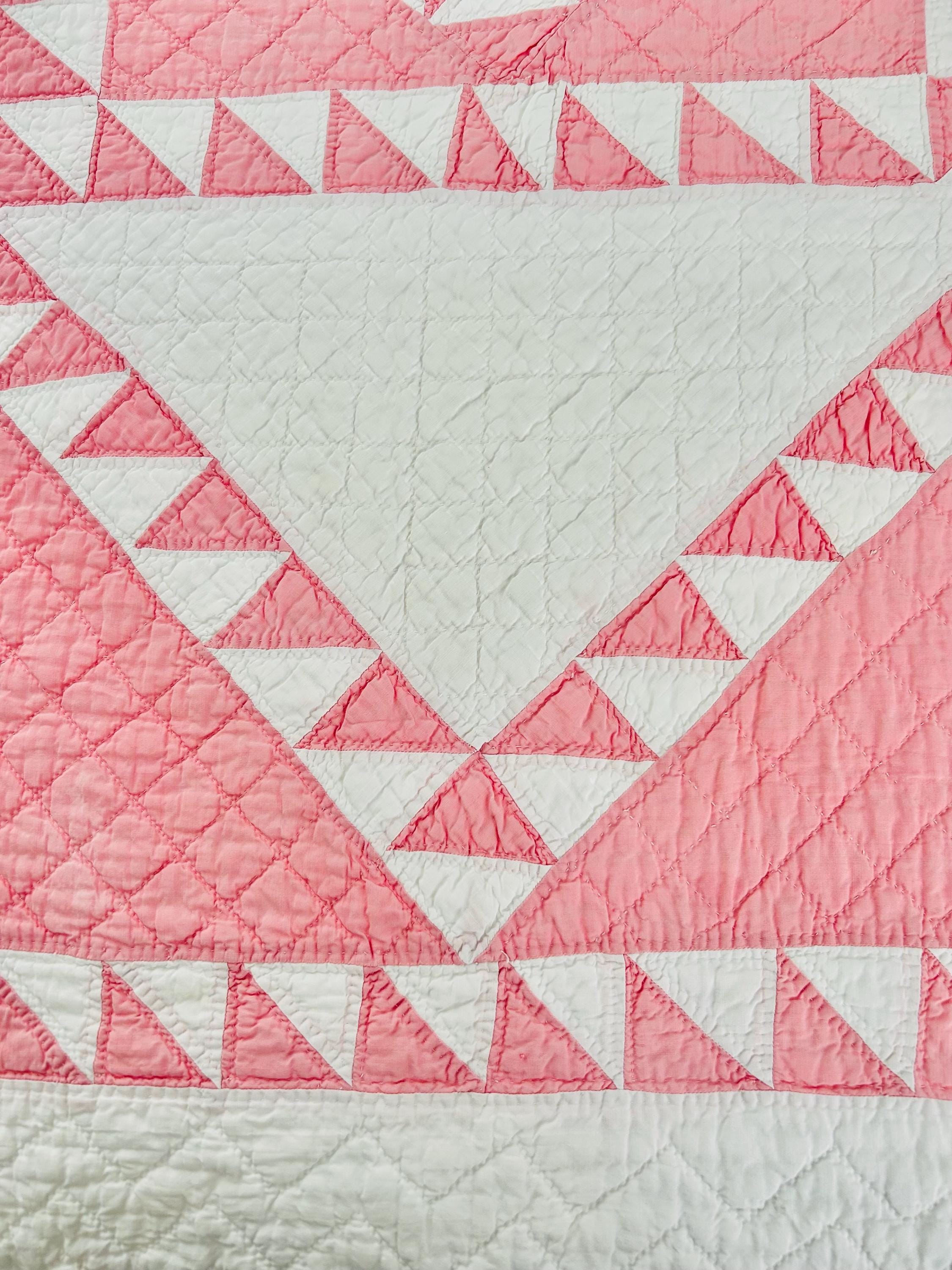 Details • Pattern: Delectable Mountains • Date: c. 1920s–1930s • Size: 79” W x 80” L • Fabrics: Cottons, including double pinks • Construction: Hand pieced and hand quilted • Colors: Double pink and white • Backing: White cotton • Condition: Excellent antique condition