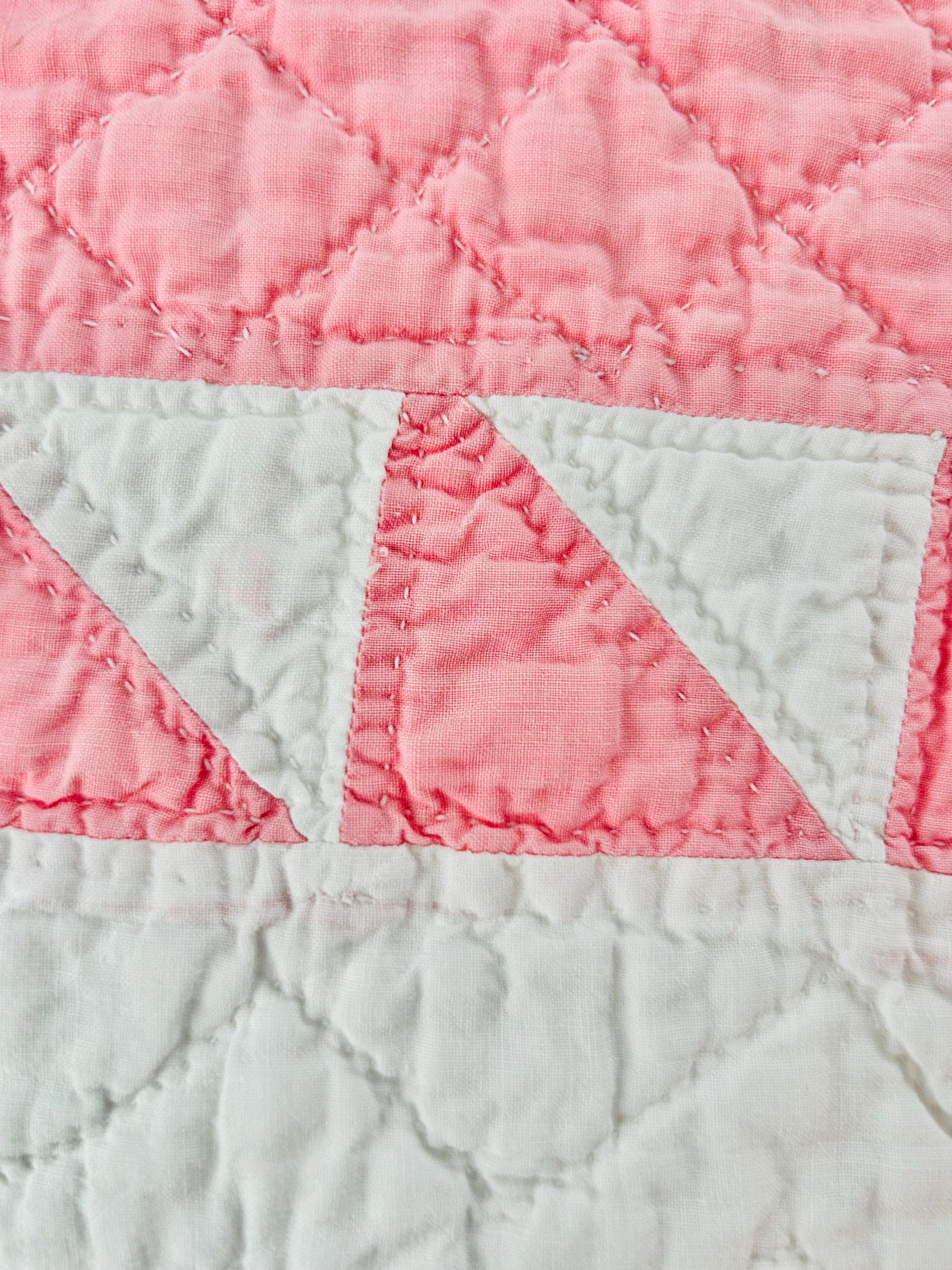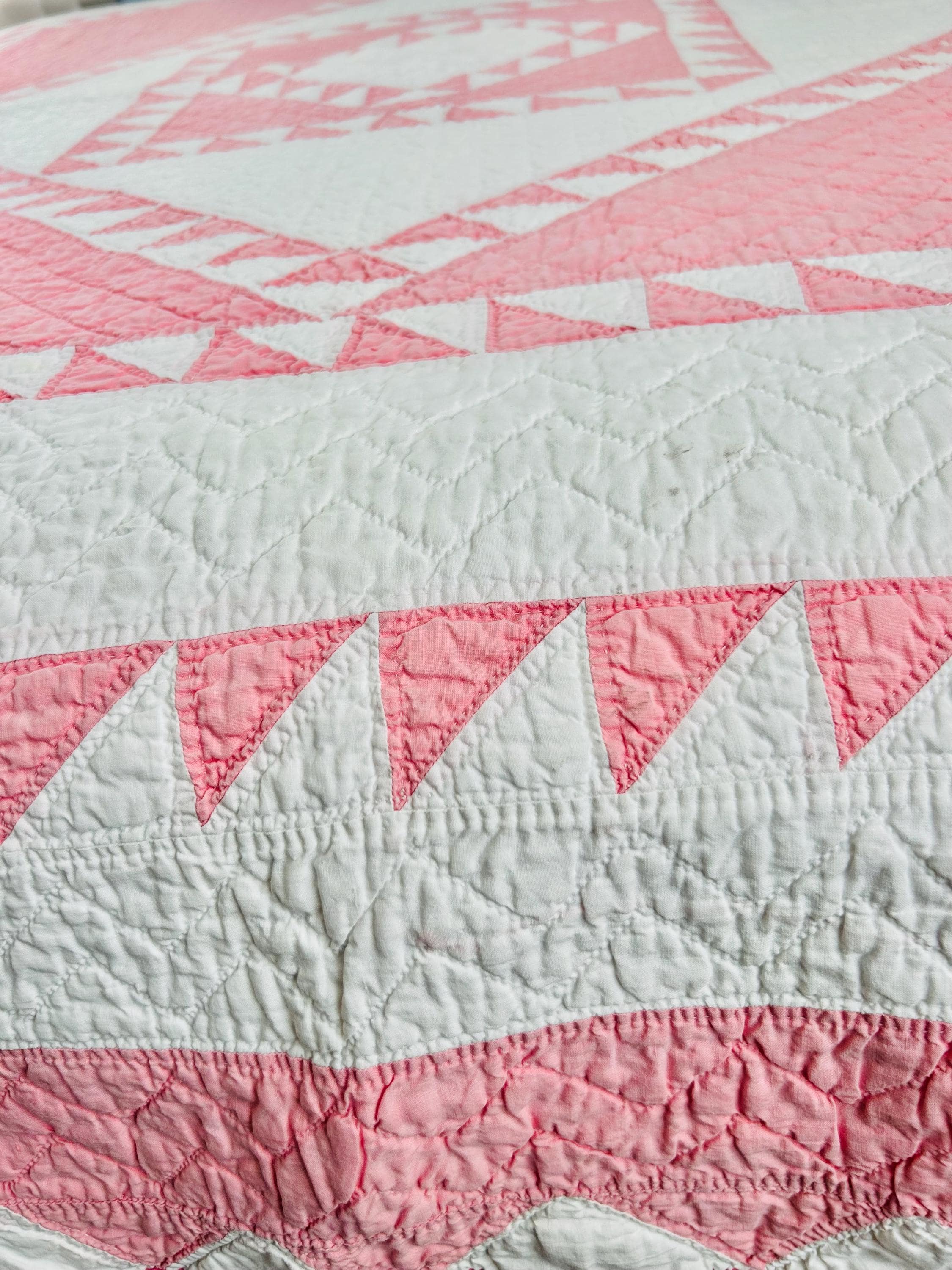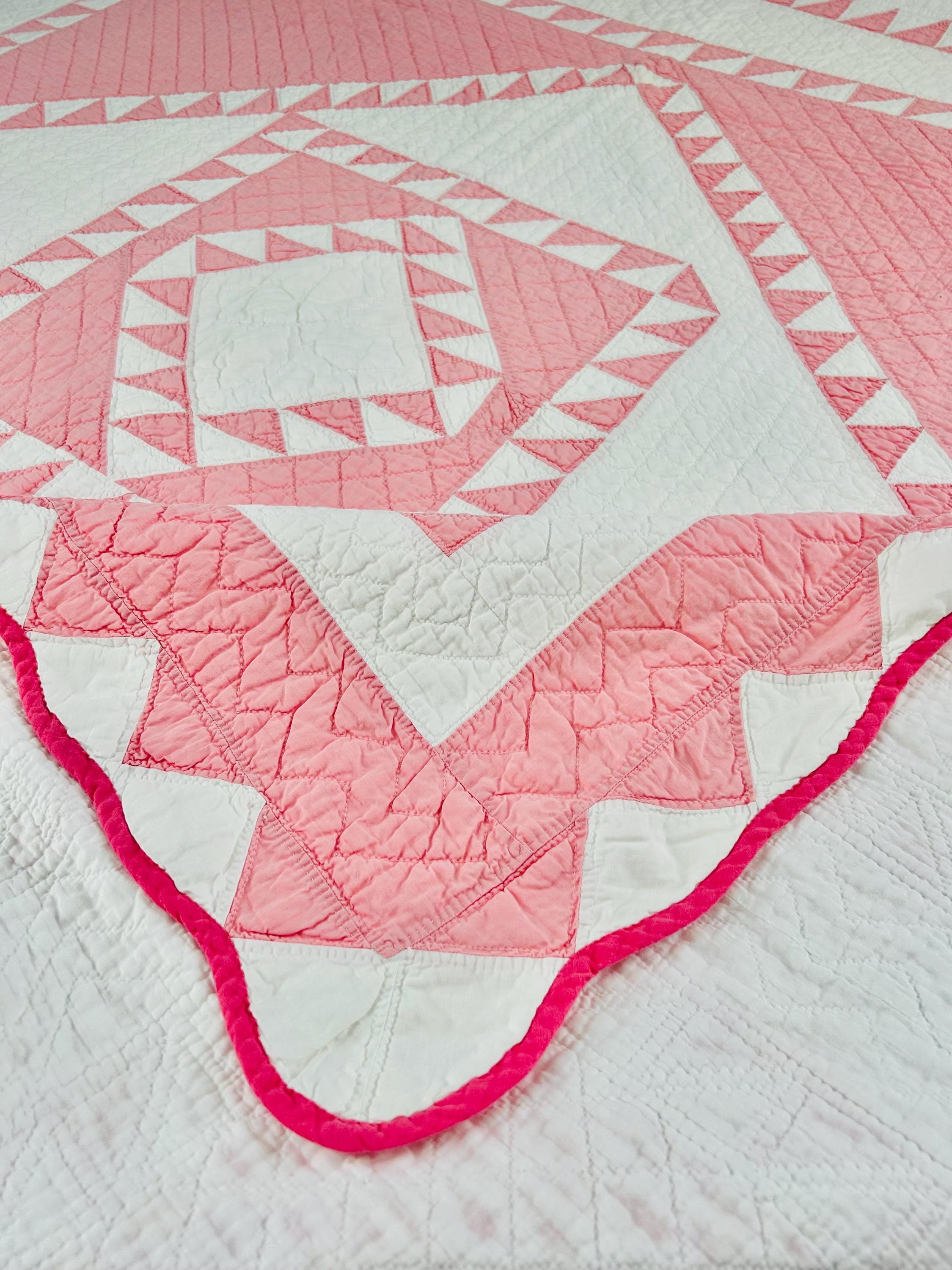 Details • Pattern: Delectable Mountains • Date: c. 1920s–1930s • Size: 79” W x 80” L • Fabrics: Cottons, including double pinks • Construction: Hand pieced and hand quilted • Colors: Double pink and white • Backing: White cotton • Condition: Excellent antique condition
