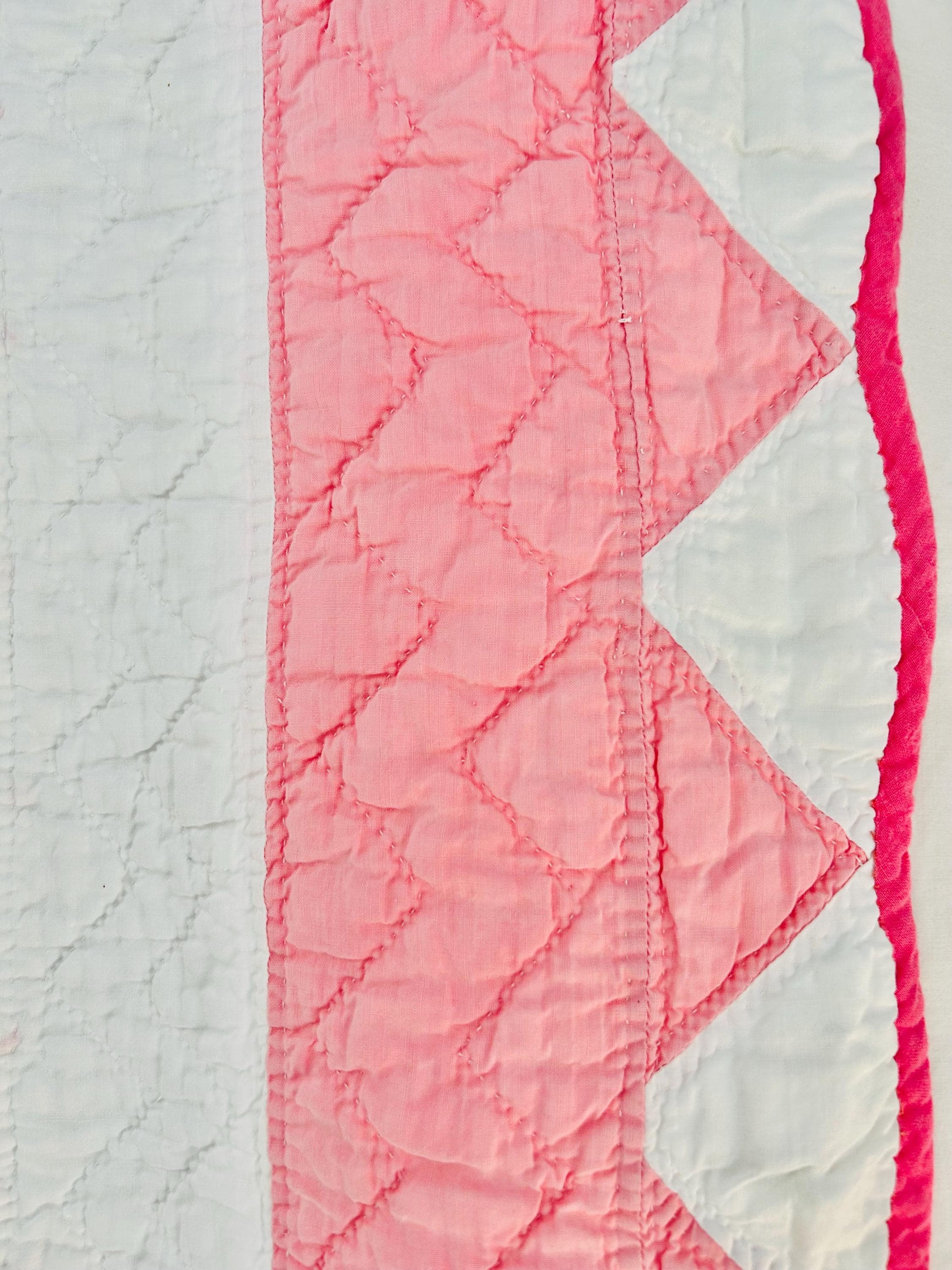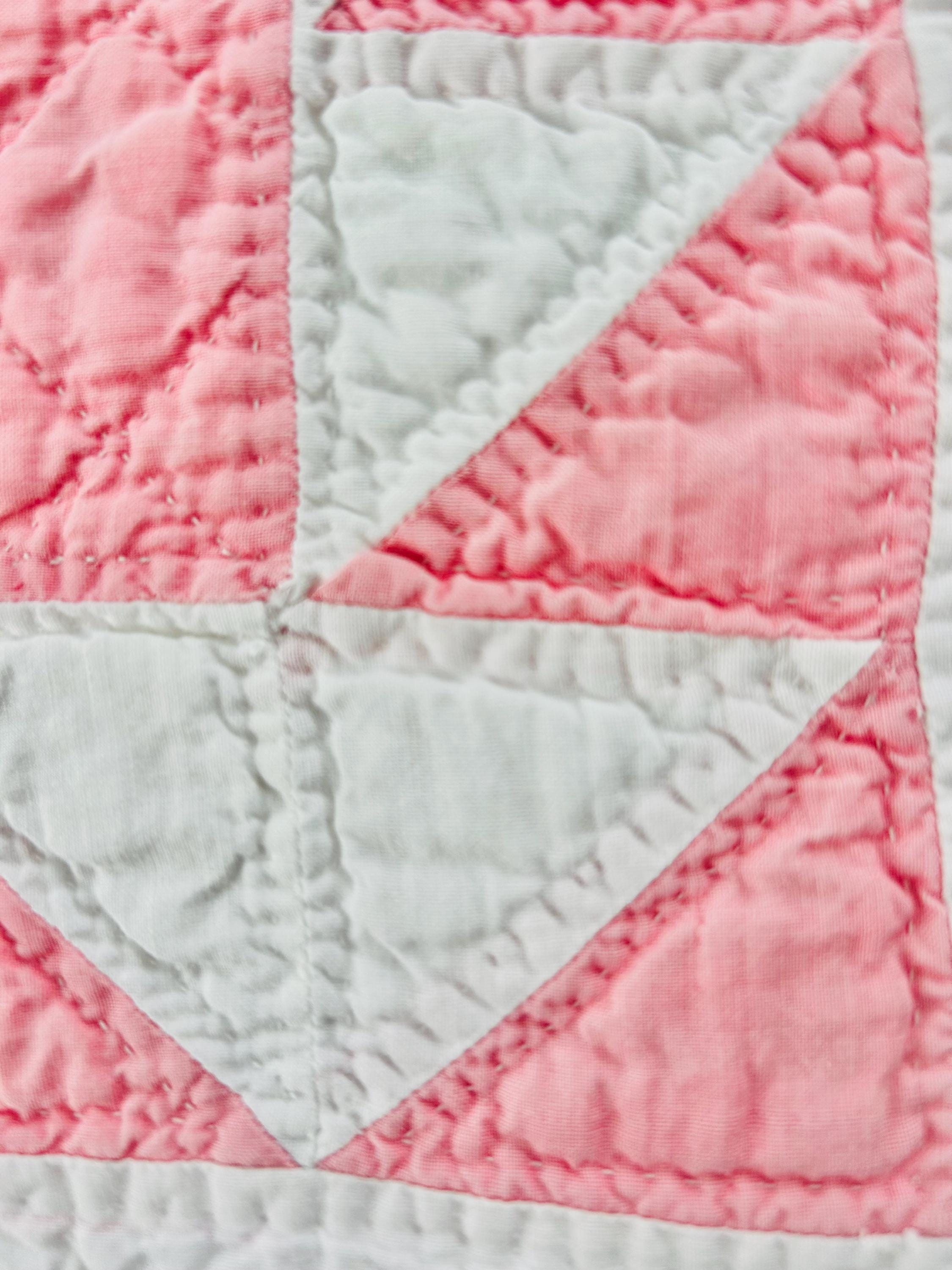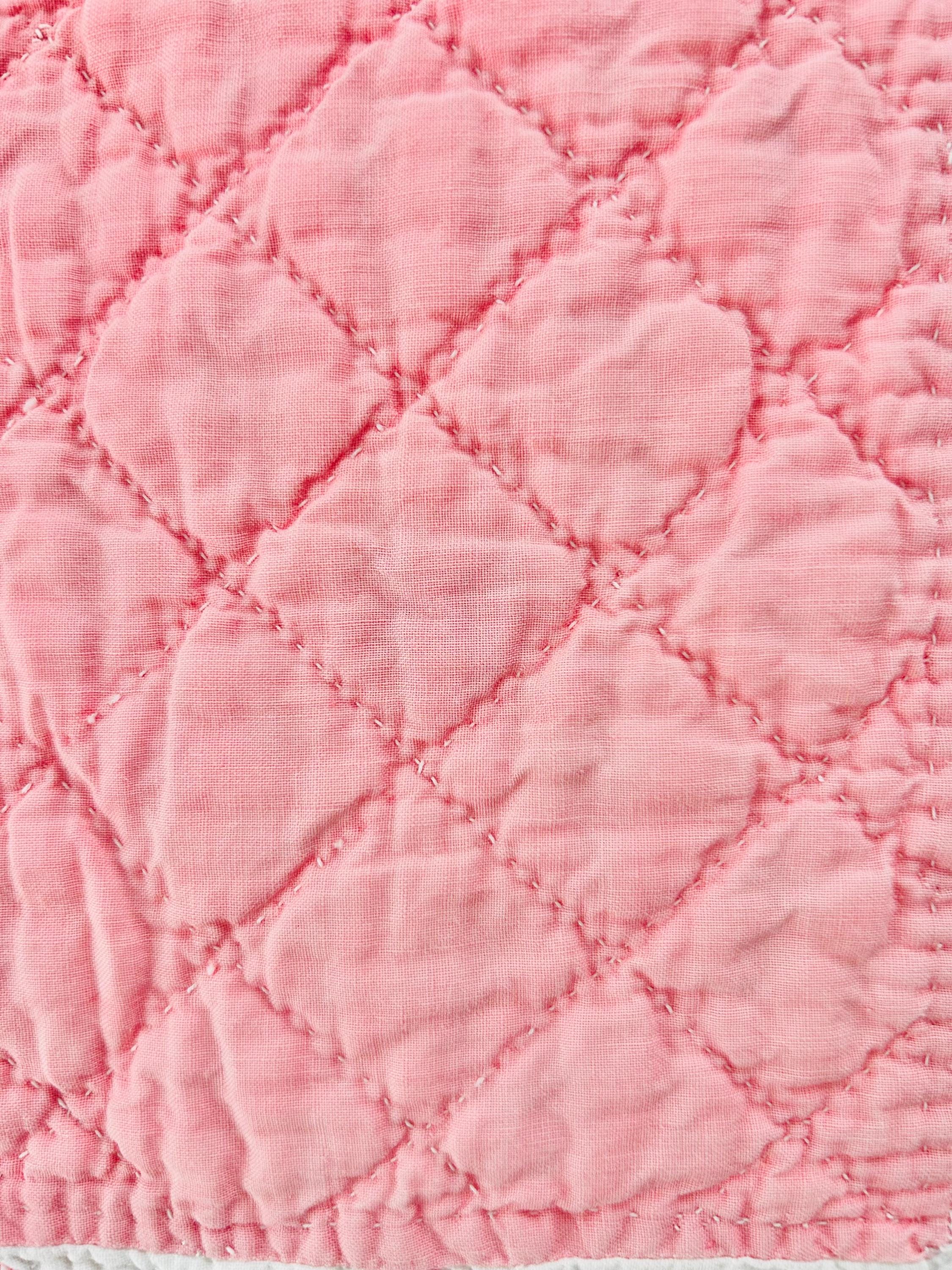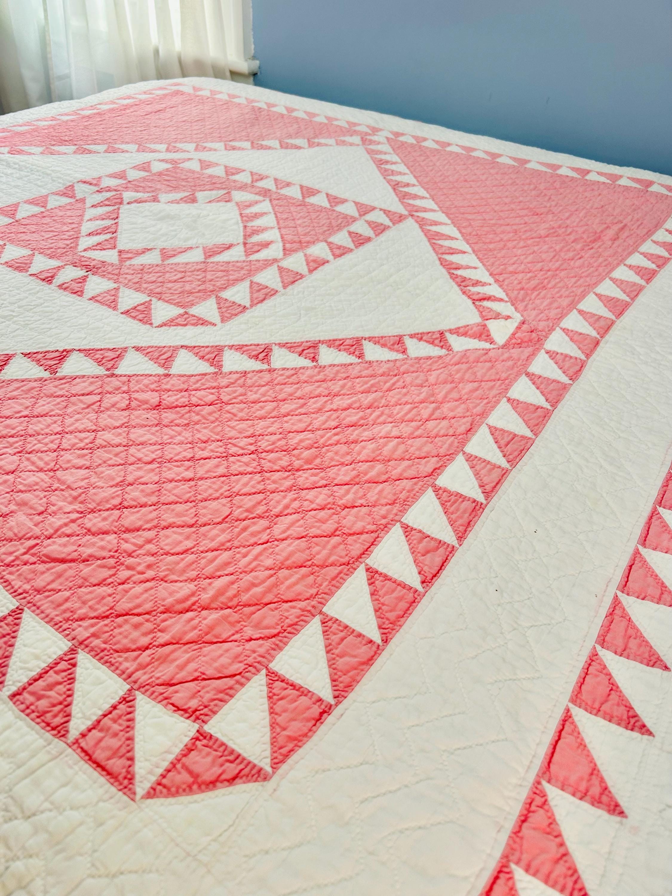 Details • Pattern: Delectable Mountains • Date: c. 1920s–1930s • Size: 79” W x 80” L • Fabrics: Cottons, including double pinks • Construction: Hand pieced and hand quilted • Colors: Double pink and white • Backing: White cotton • Condition: Excellent antique condition