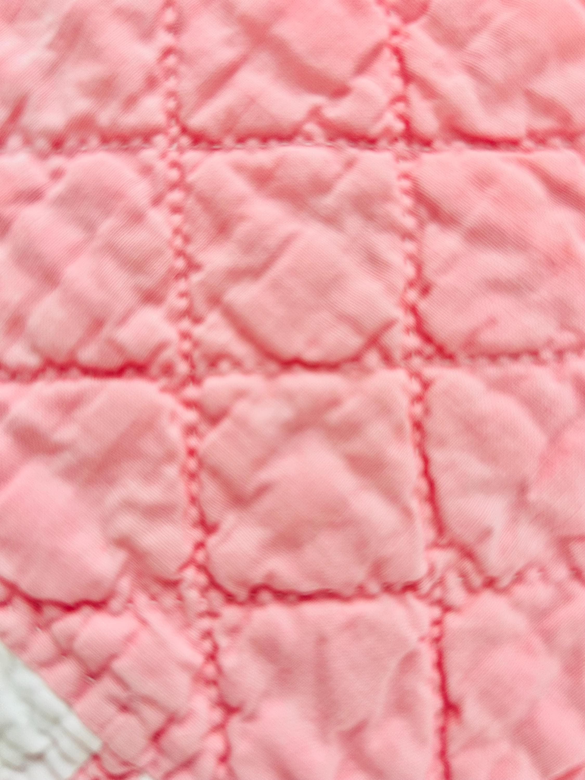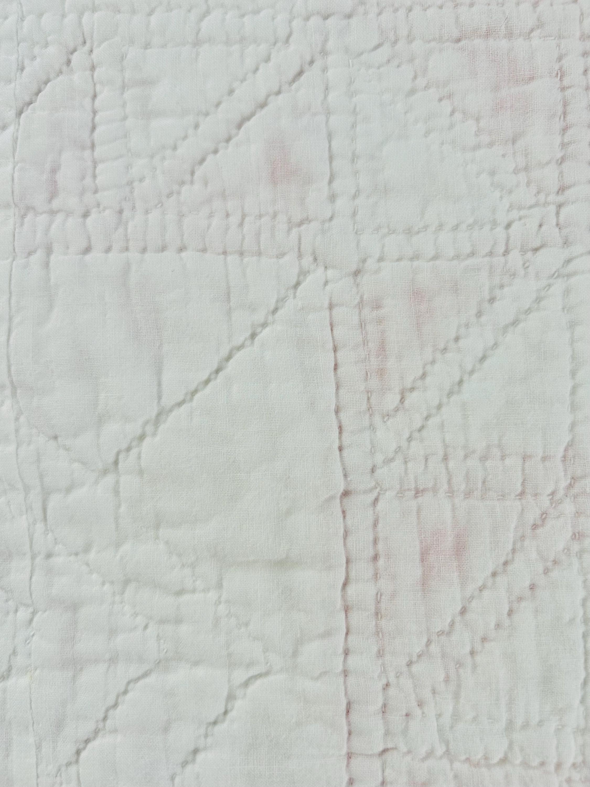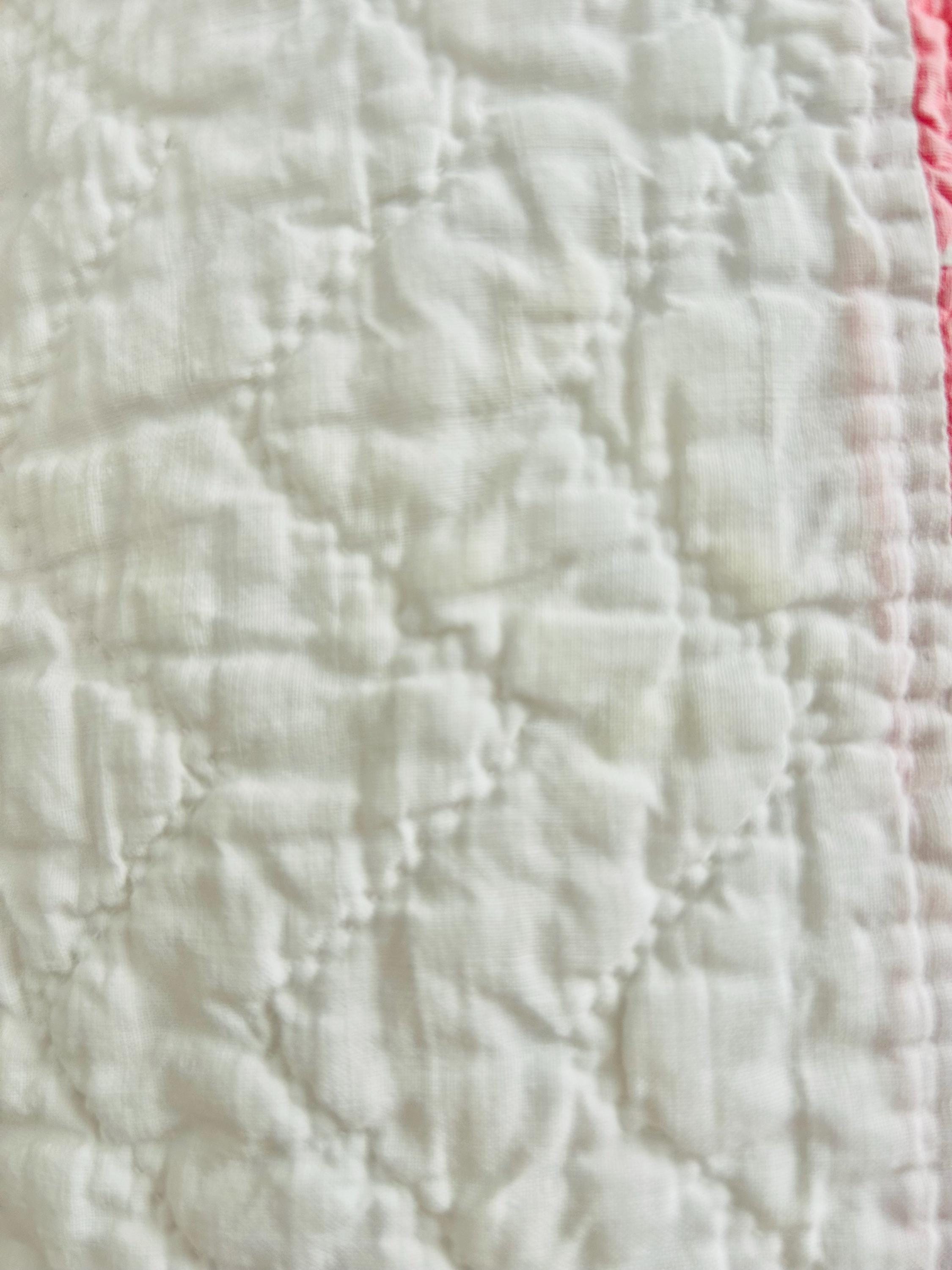 The back is a lightweight white cotton while the binding is dark pink cotton that has been machine stitched to the front and hand-stitched to the back. The cotton batting is lightweight.