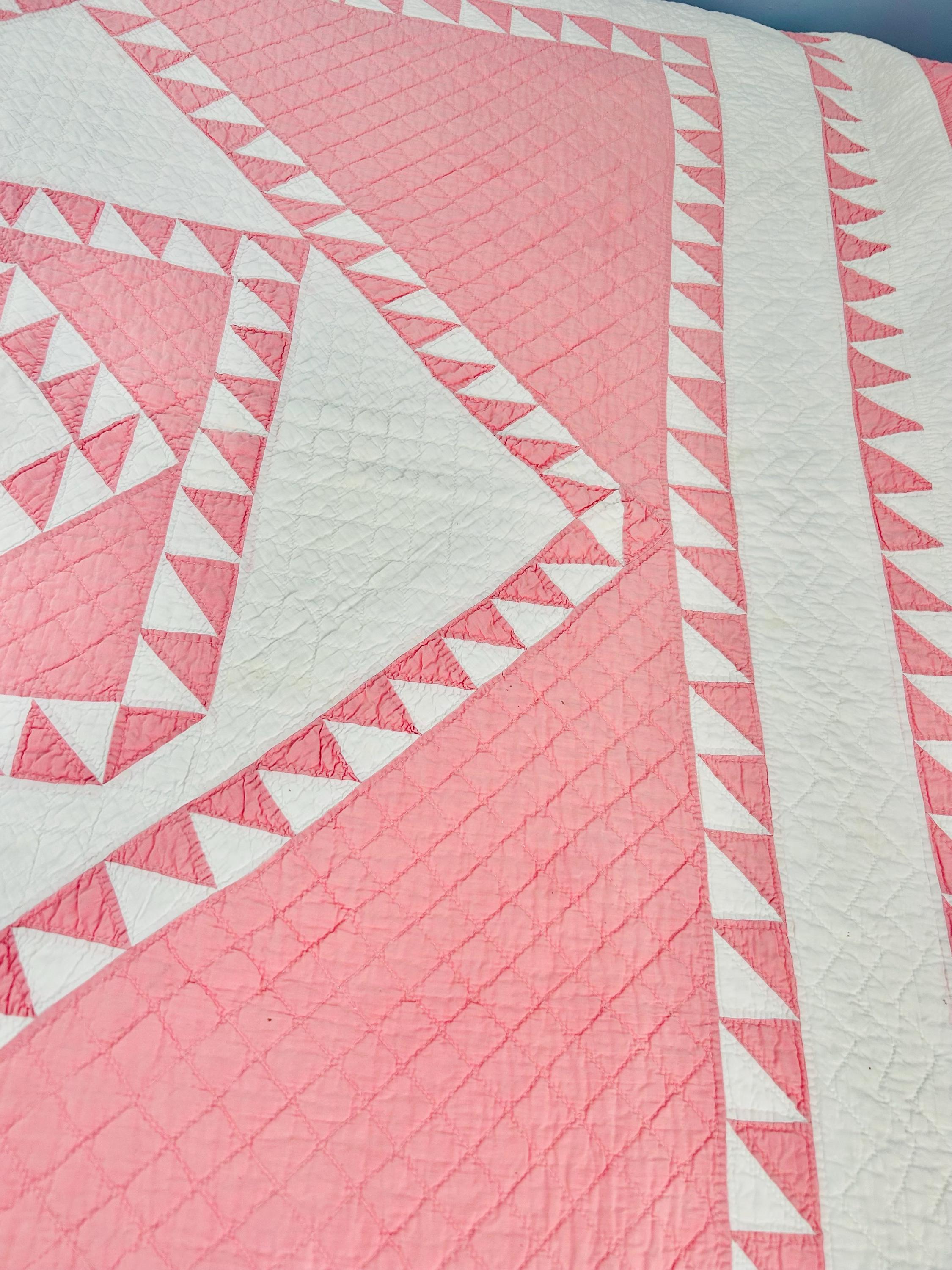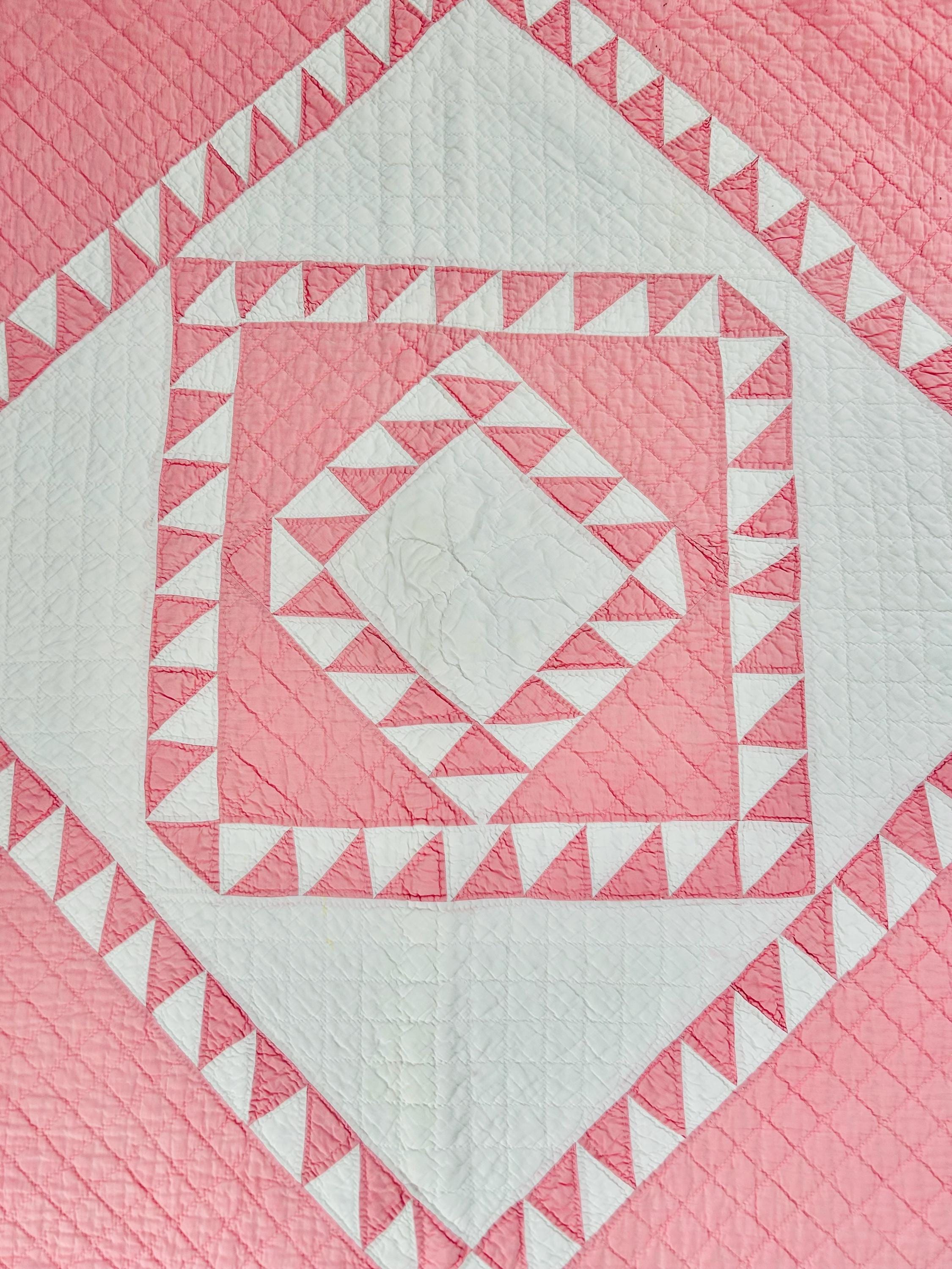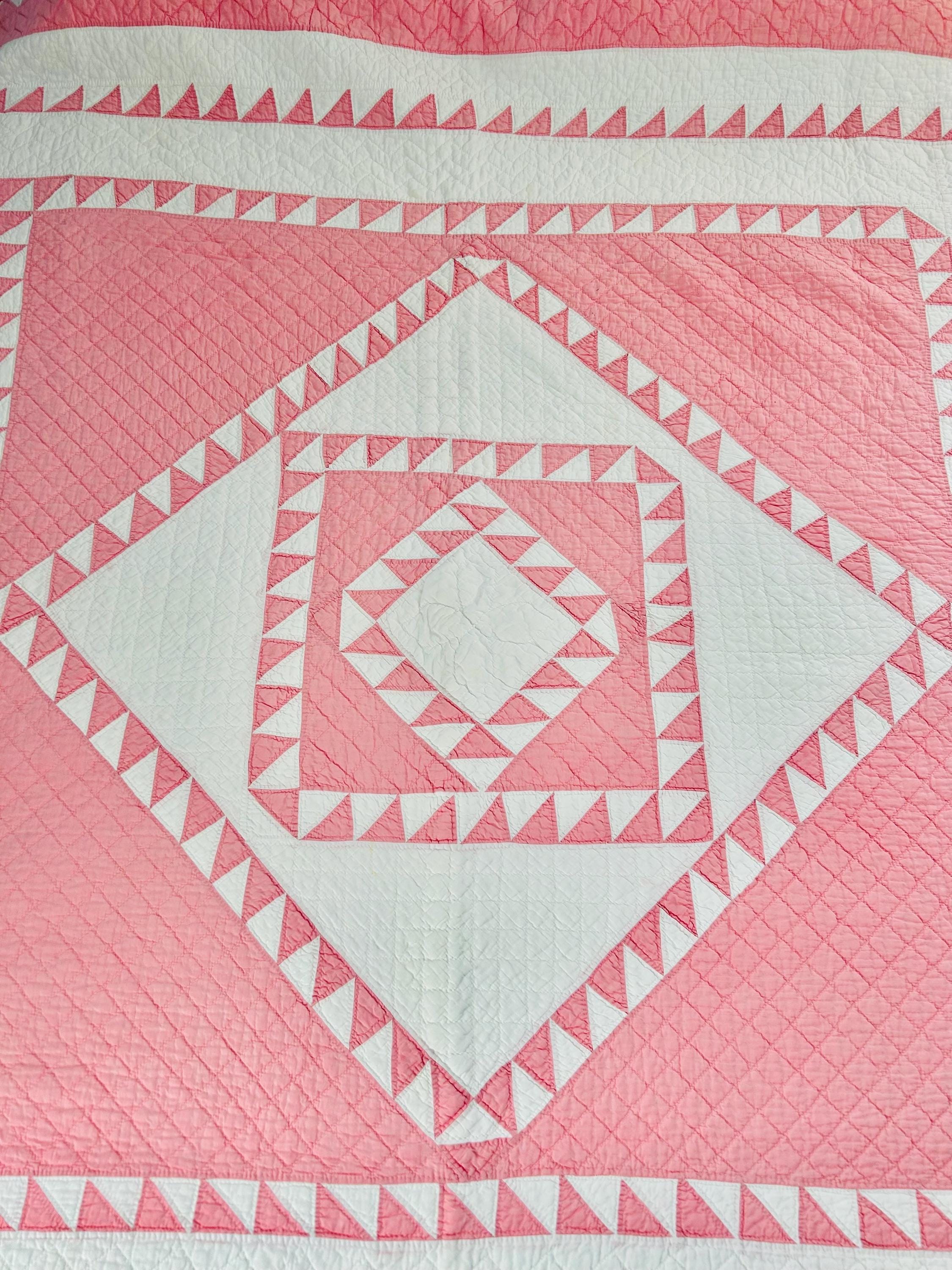 This stunning antique Delectable Mountains Quilt dates to the late 1920s to early 1930s and features classic double pinks, a favorite Depression era color. Expertly pieced, the quilt is also beautifully hand-quilted in zig-zags, cross-hatch grids and outlines of the patchwork.