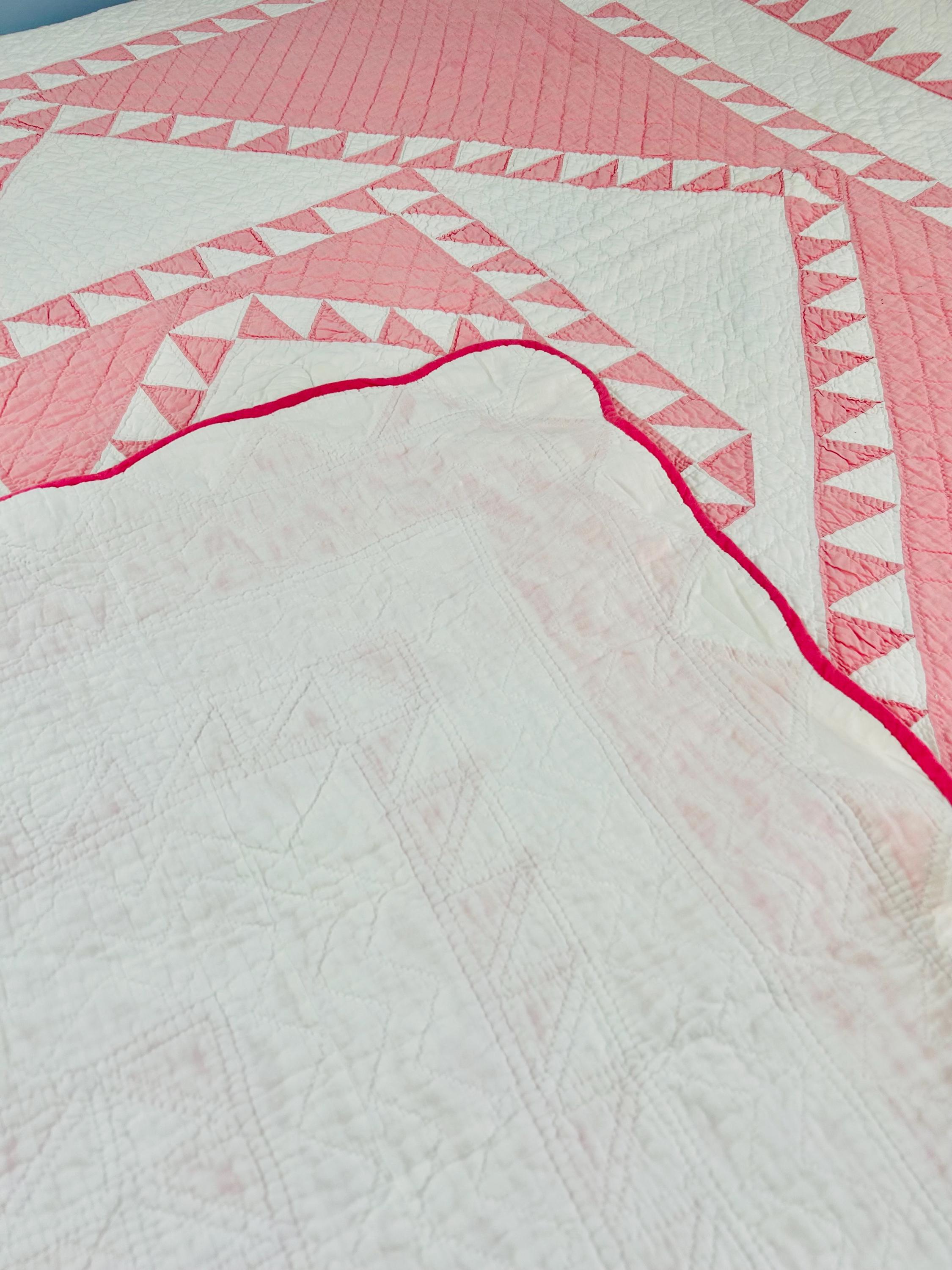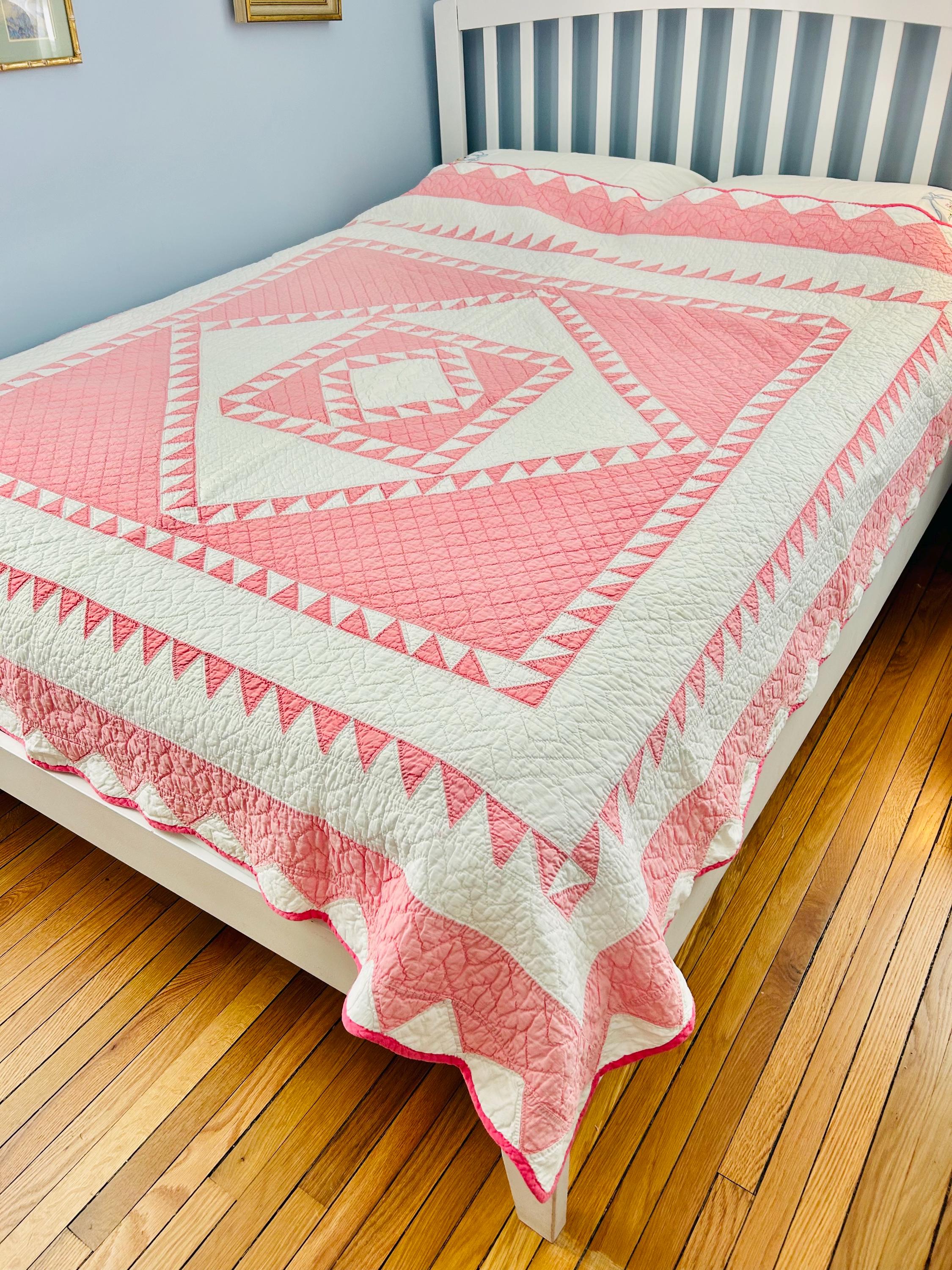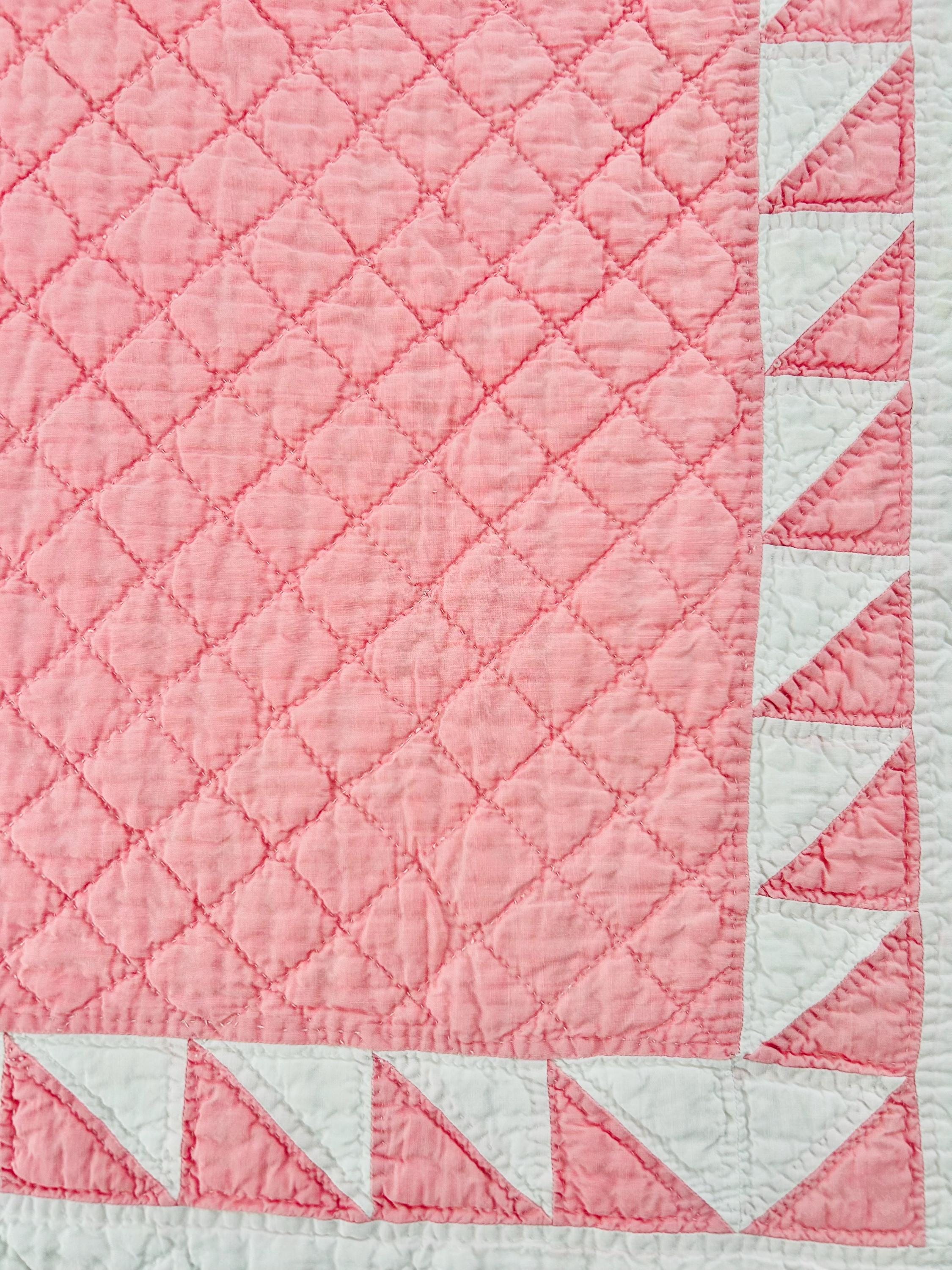 This stunning antique Delectable Mountains Quilt dates to the late 1920s to early 1930s and features classic double pinks, a favorite Depression era color. Expertly pieced, the quilt is also beautifully hand-quilted in zig-zags, cross-hatch grids and outlines of the patchwork.