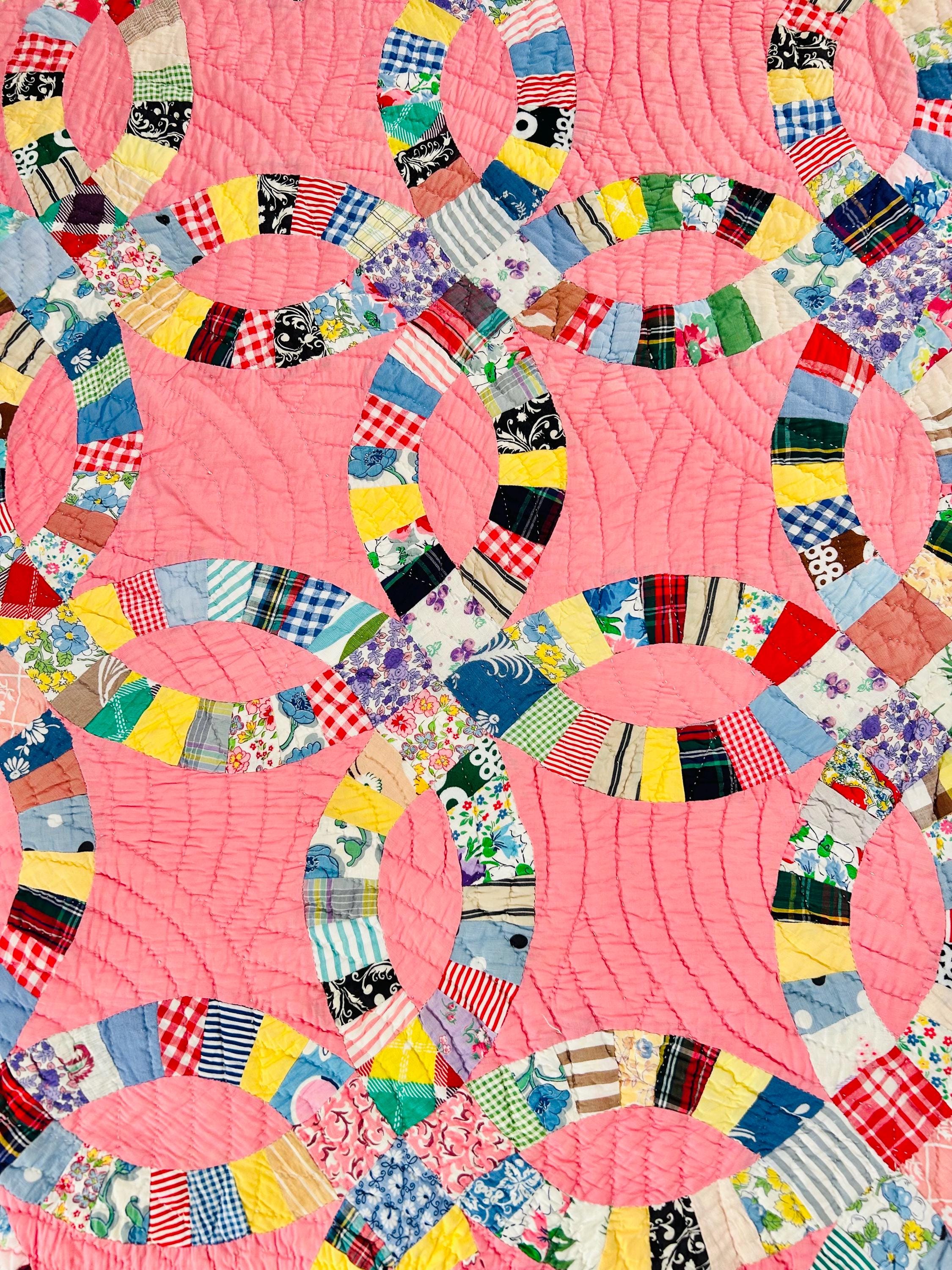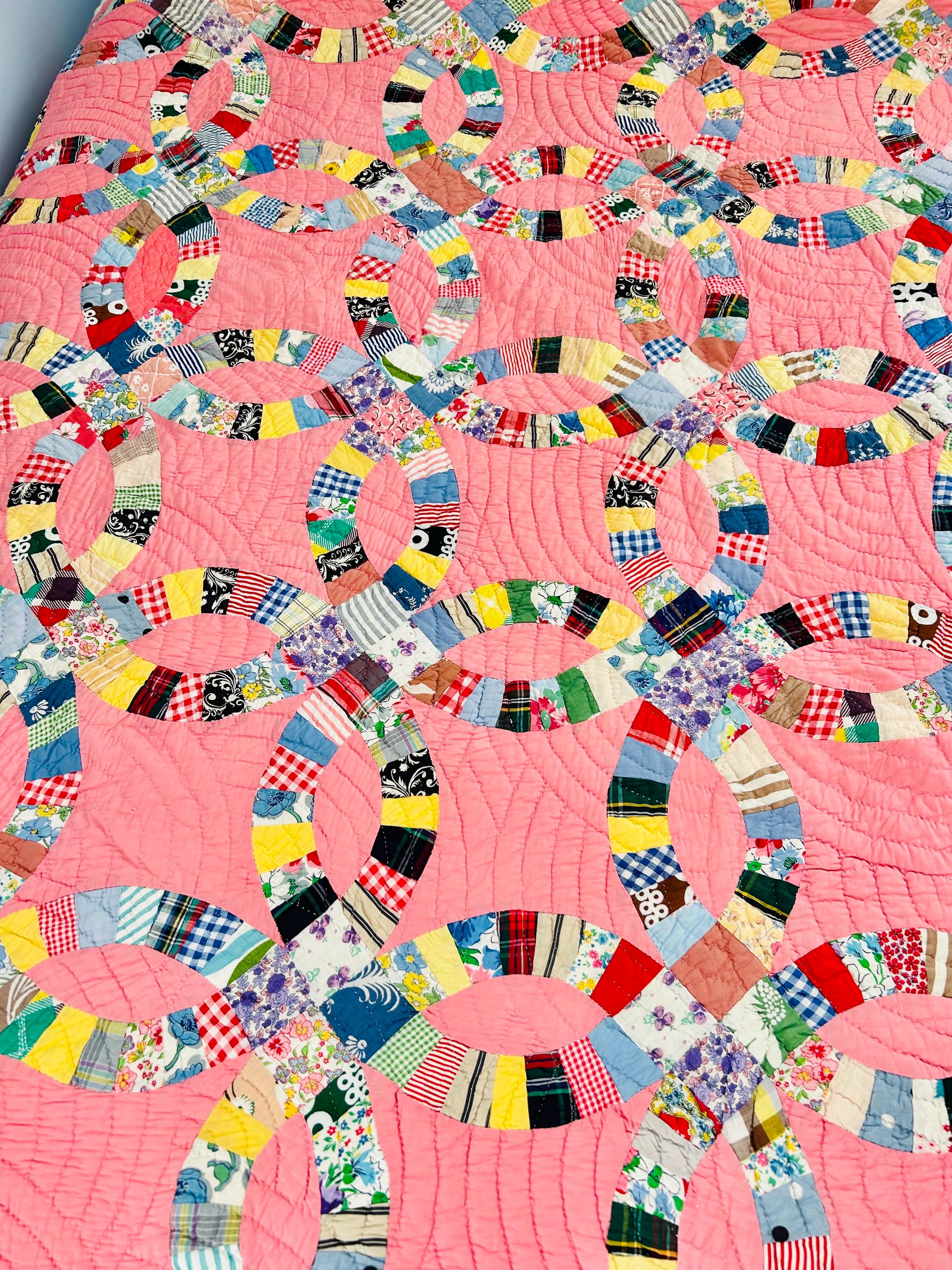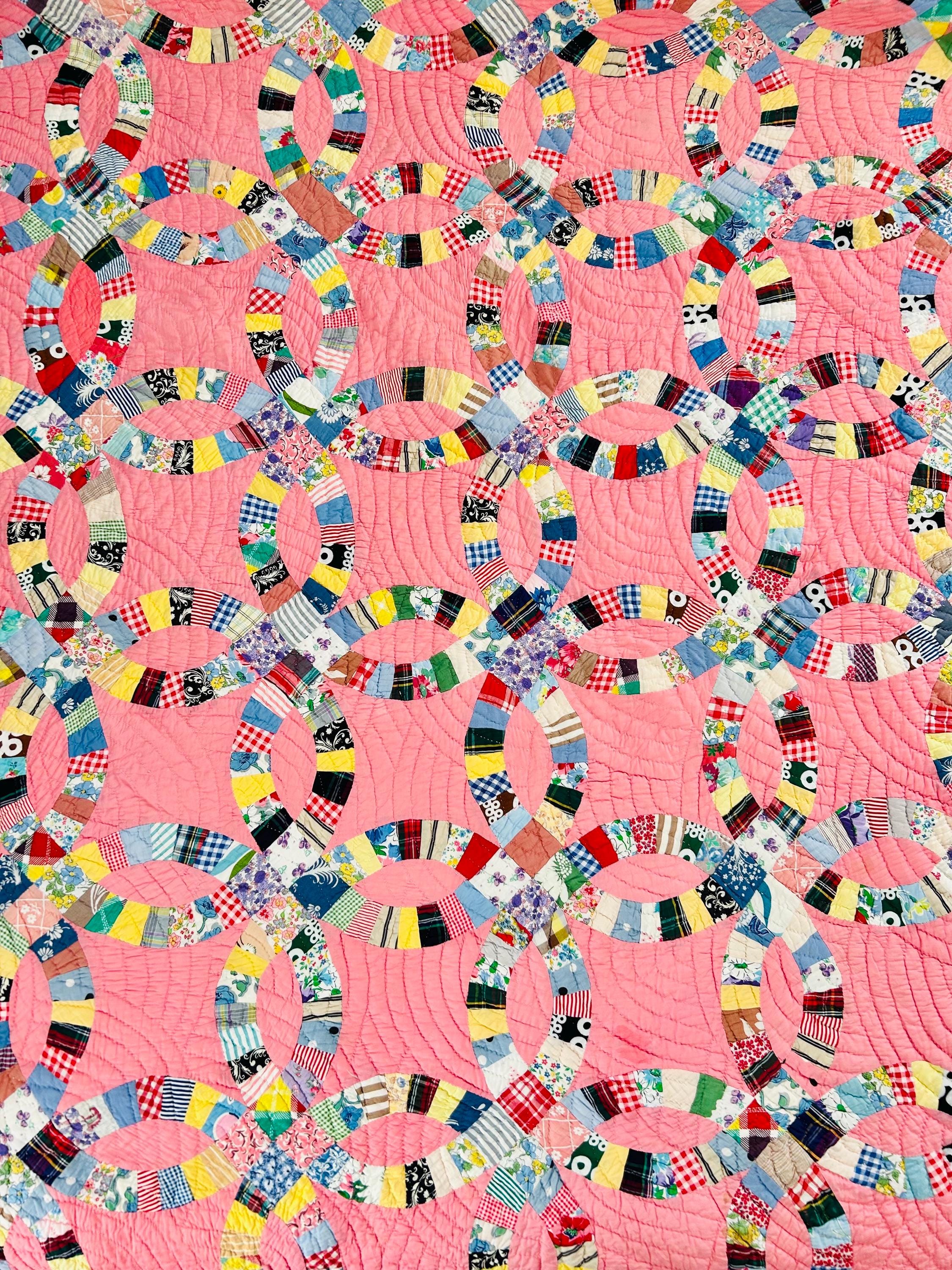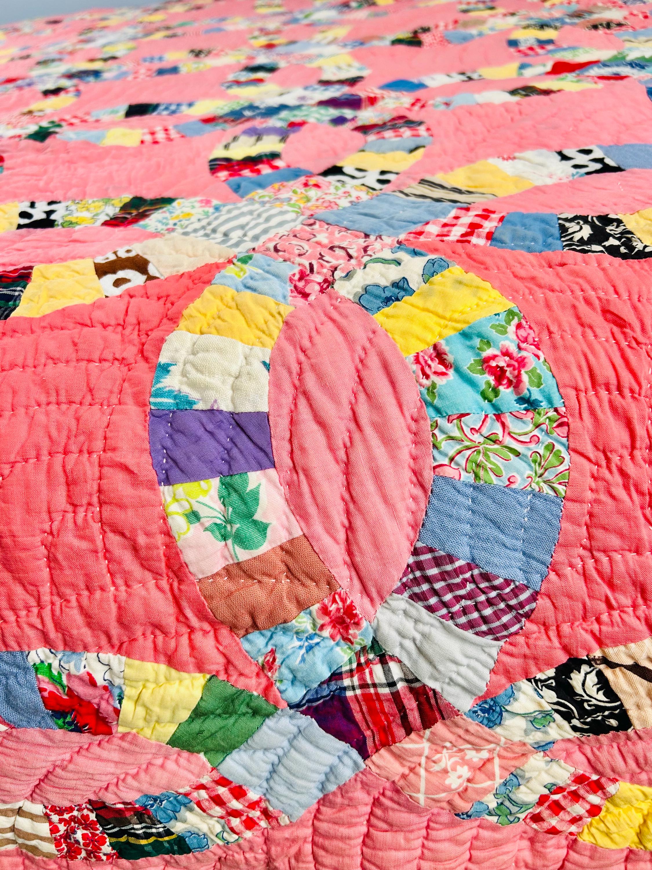 Details • Pattern: Double Wedding Ring • Date: c. 1930s–early 1940s • Size: 78” x 78” (full / double bed size) • Top Fabric: Vintage cotton prints • Batting: Light-to-medium weight cotton • Backing: White cotton • Construction: Hand pieced and hand quilted • Colors: Pink ground with multicolor scrappy rings