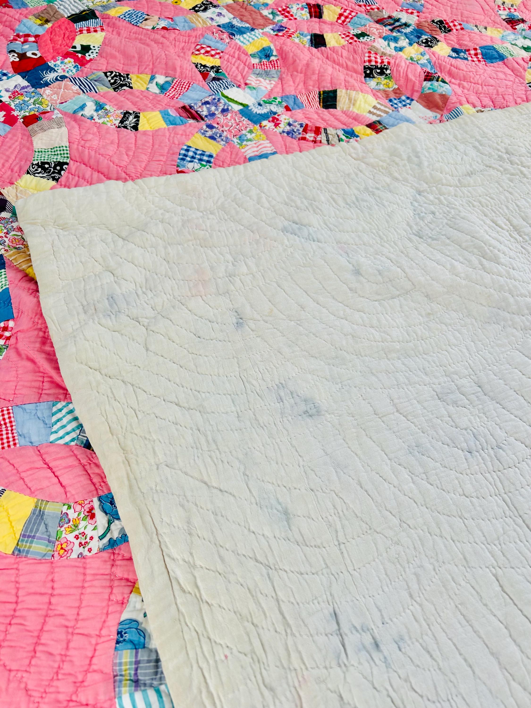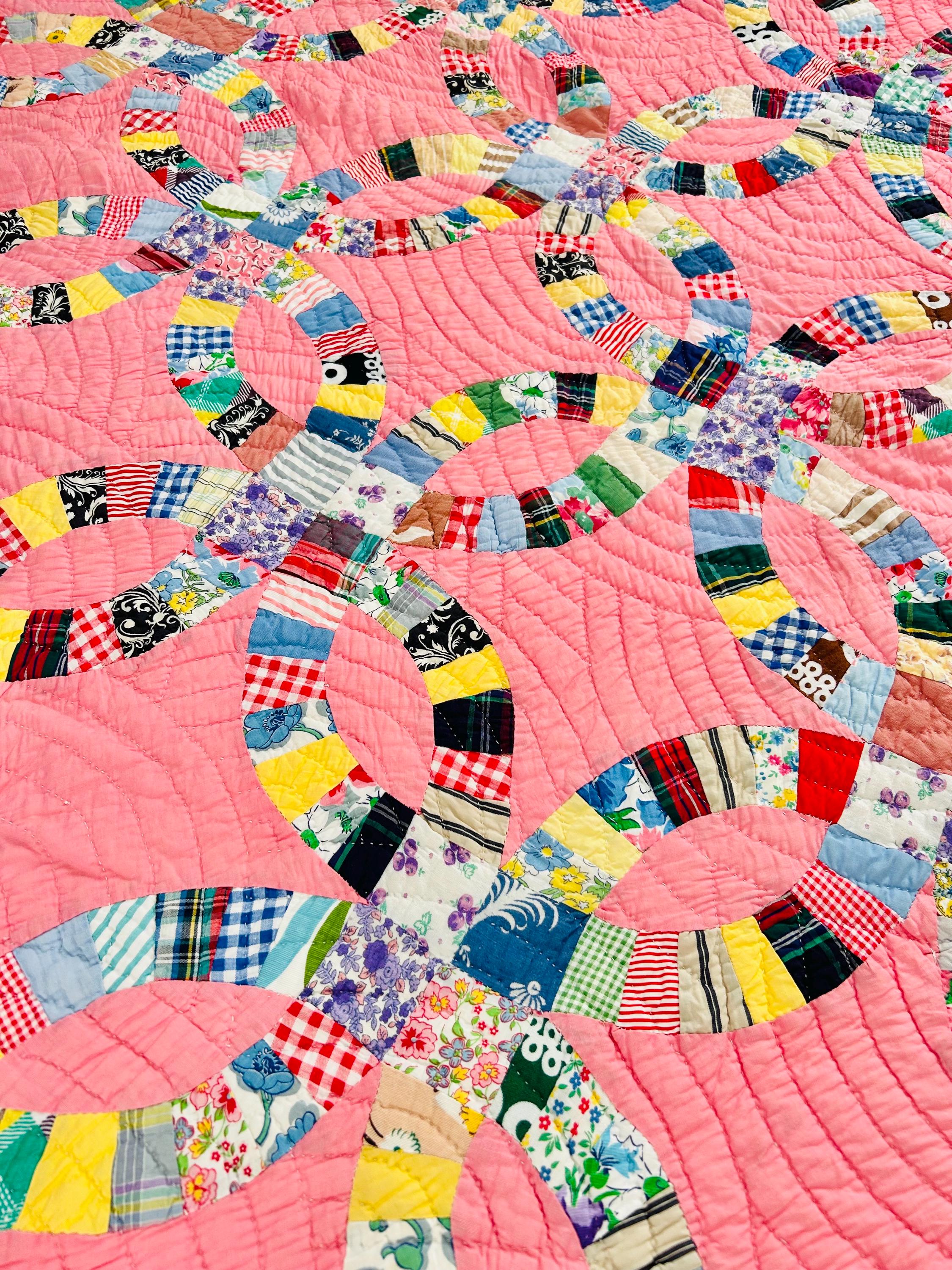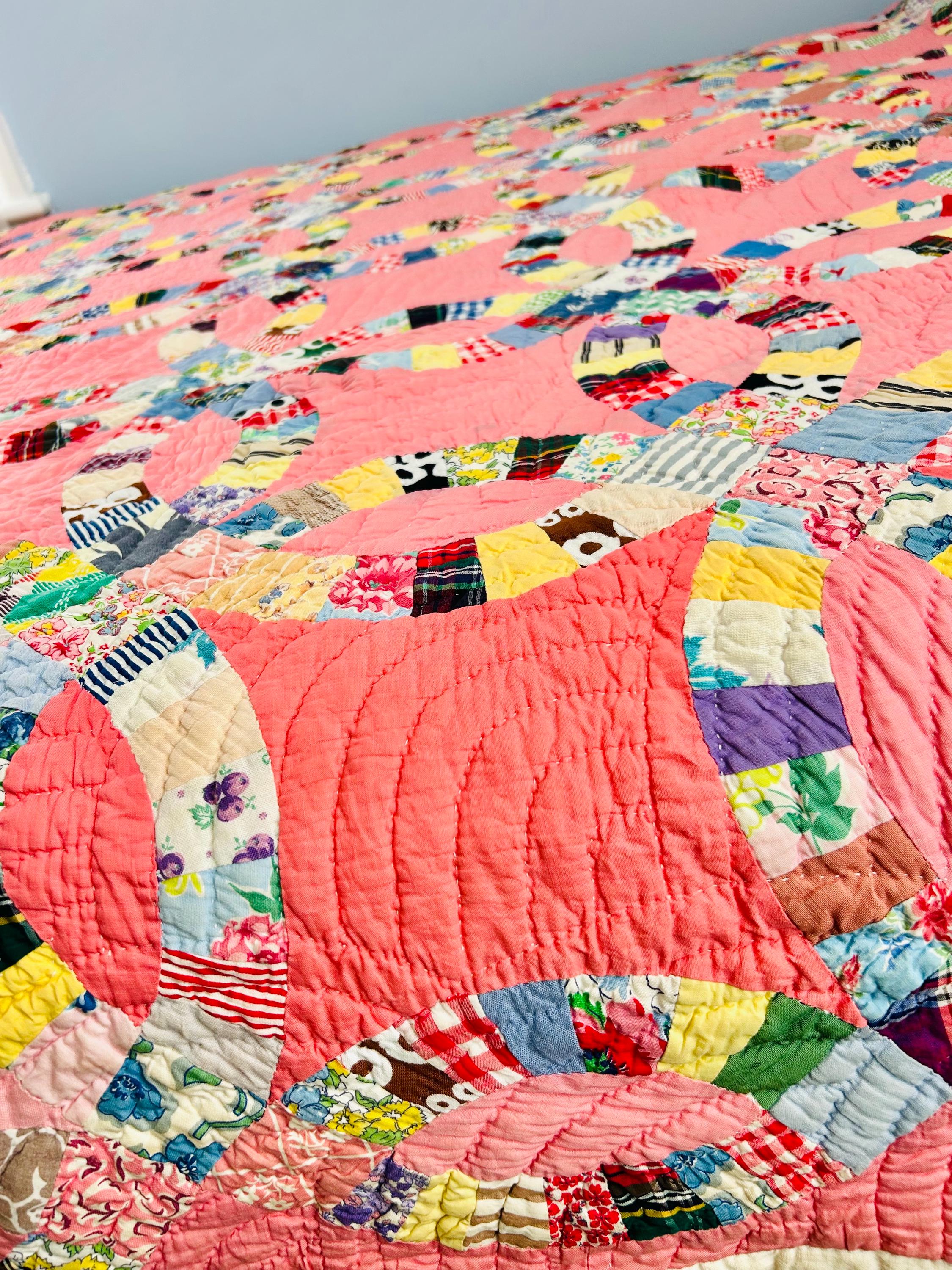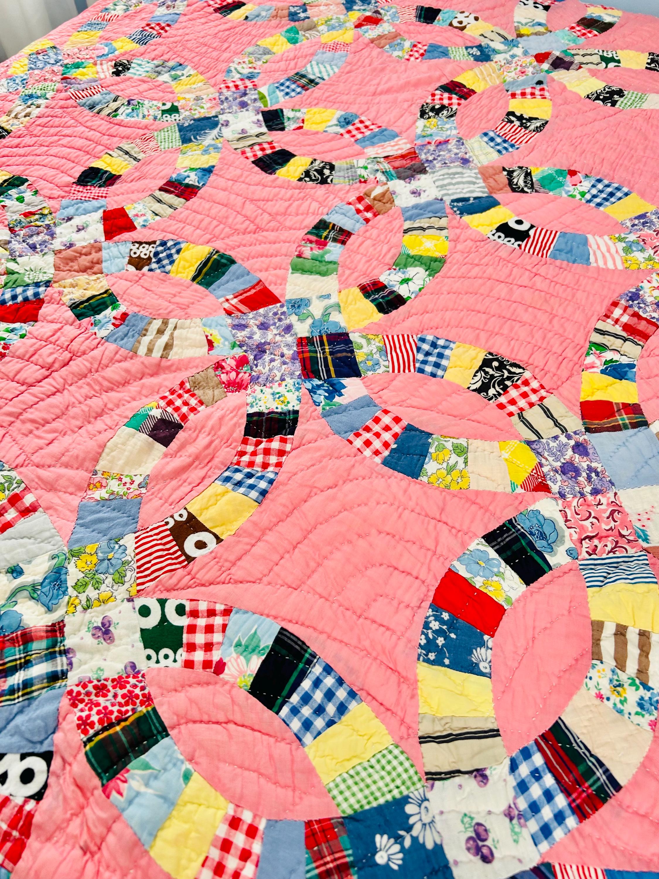 Details • Pattern: Double Wedding Ring • Date: c. 1930s–early 1940s • Size: 78” x 78” (full / double bed size) • Top Fabric: Vintage cotton prints • Batting: Light-to-medium weight cotton • Backing: White cotton • Construction: Hand pieced and hand quilted • Colors: Pink ground with multicolor scrappy rings