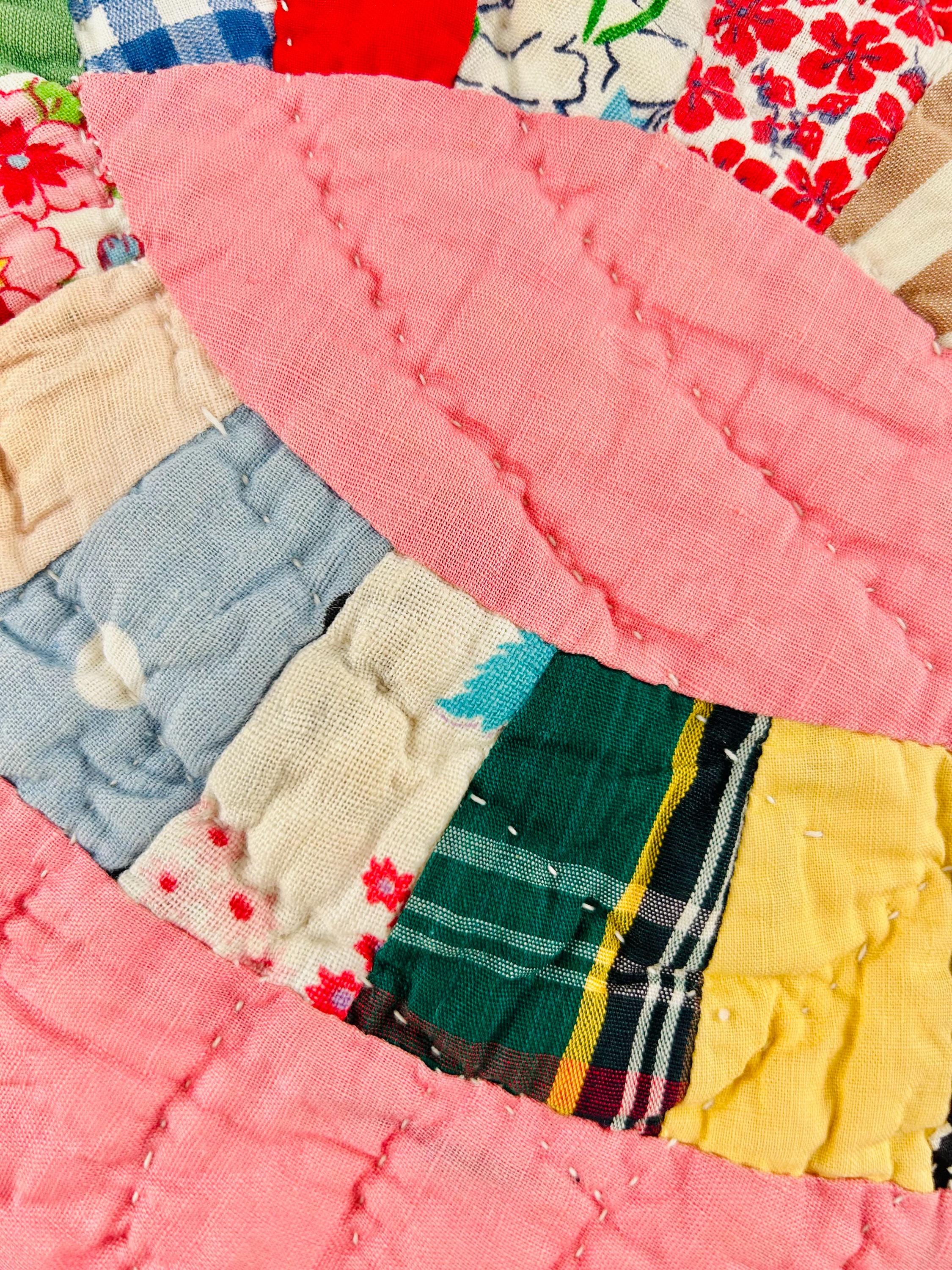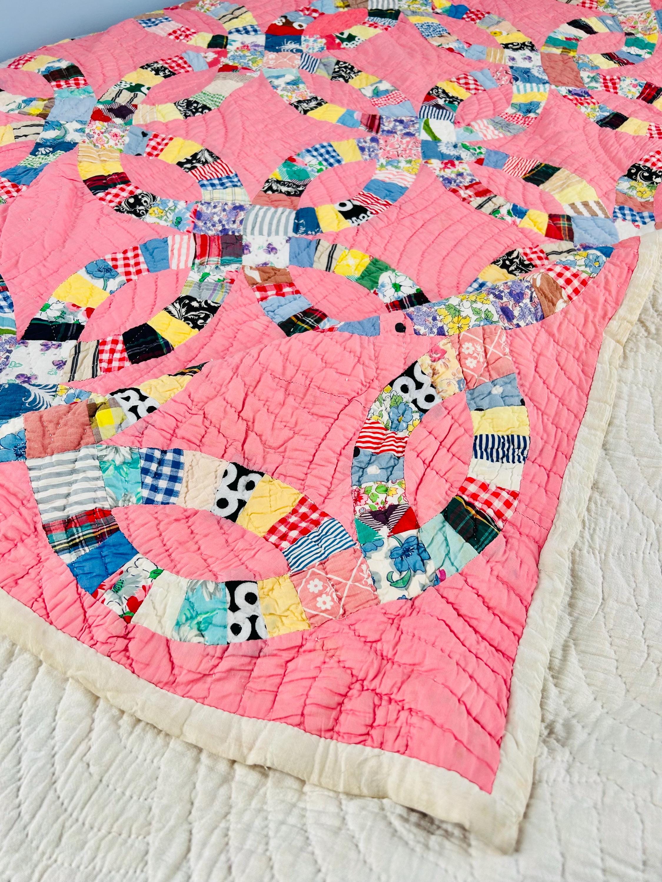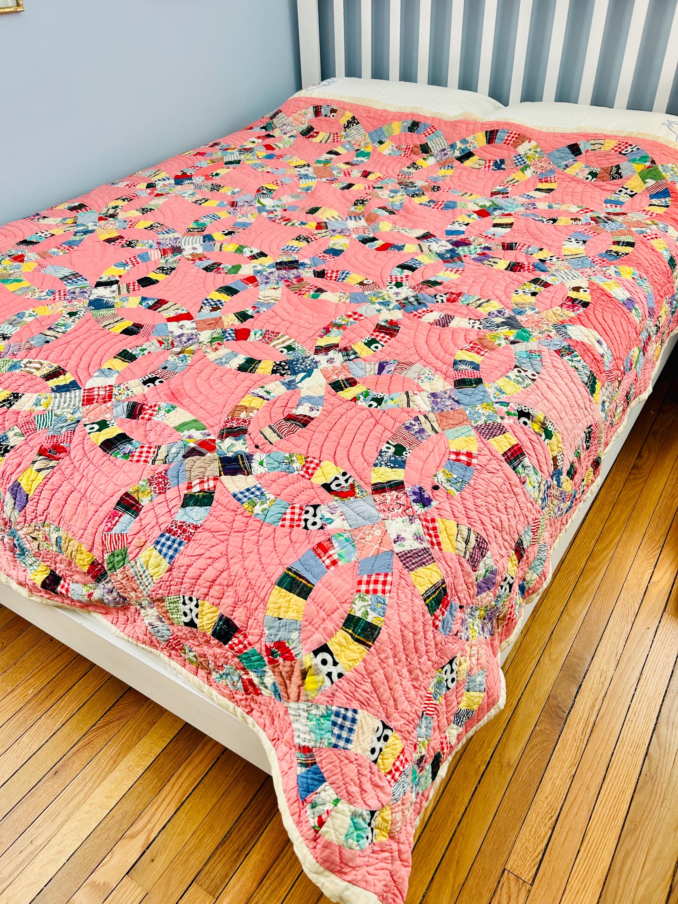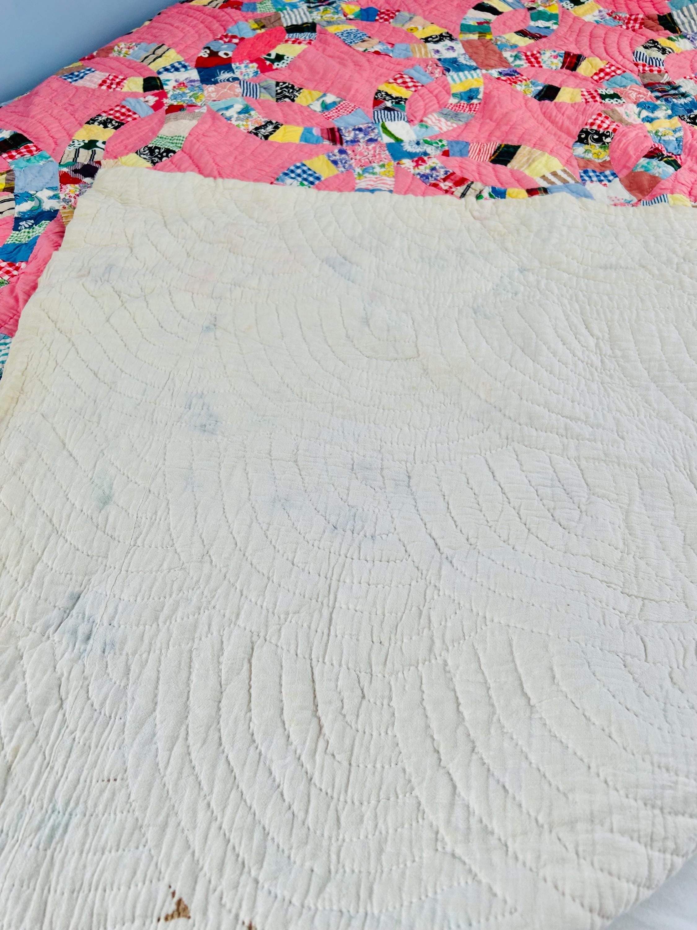 Details • Pattern: Double Wedding Ring • Date: c. 1930s–early 1940s • Size: 78” x 78” (full / double bed size) • Top Fabric: Vintage cotton prints • Batting: Light-to-medium weight cotton • Backing: White cotton • Construction: Hand pieced and hand quilted • Colors: Pink ground with multicolor scrappy rings