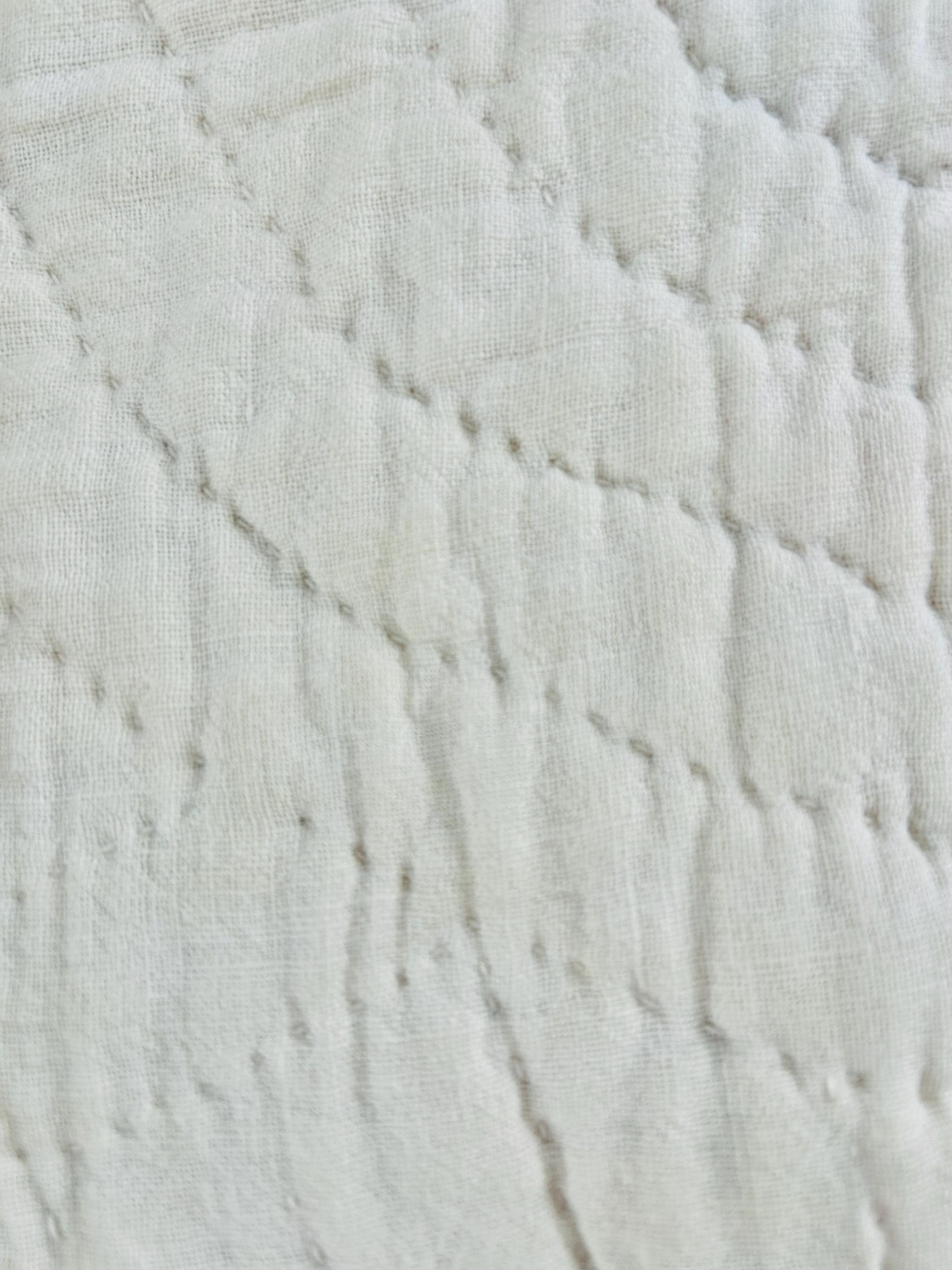 The back is white cotton that has been turned to the front and hand-stitched to form the binding. The cotton batting is light-to-medium weight.