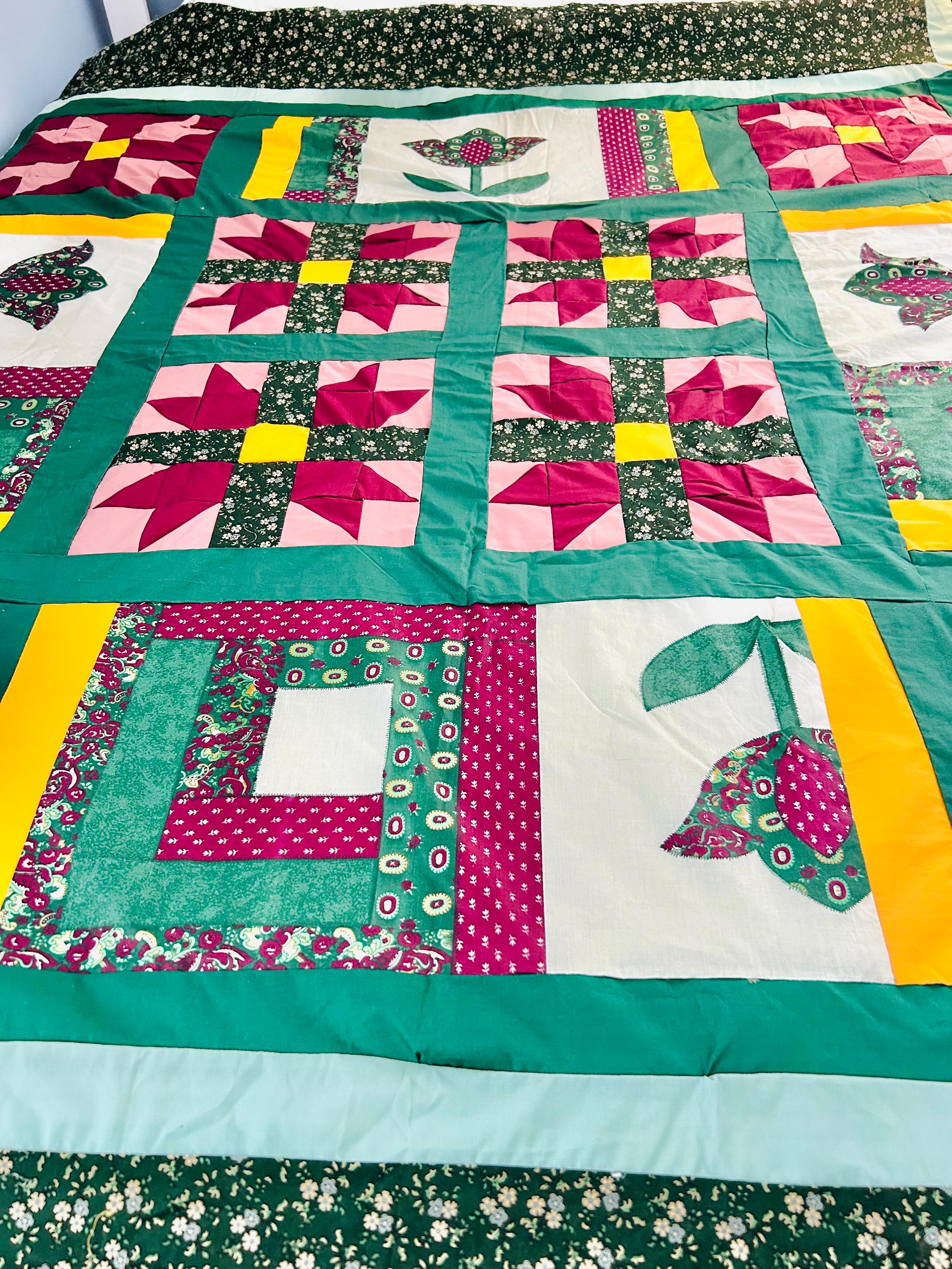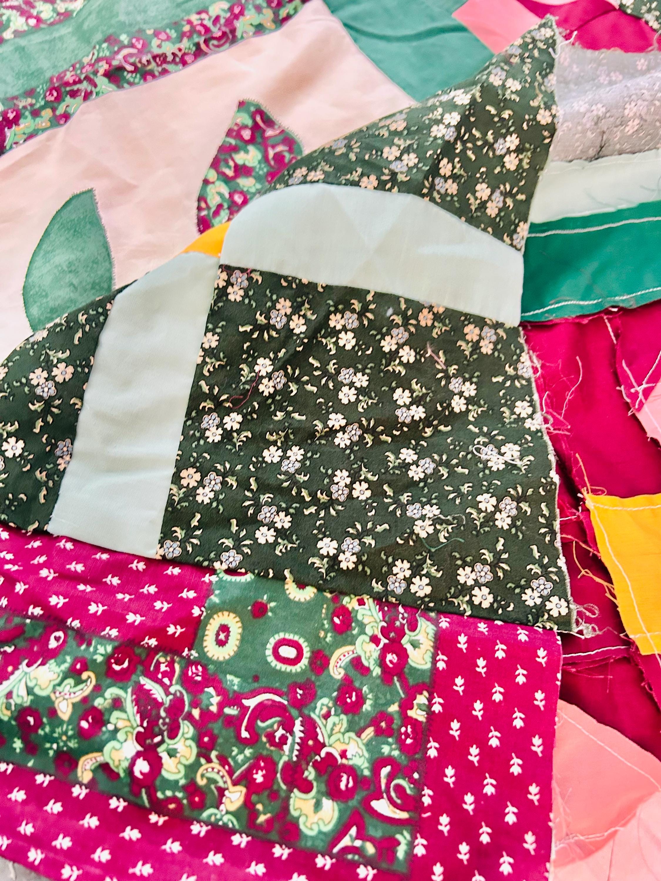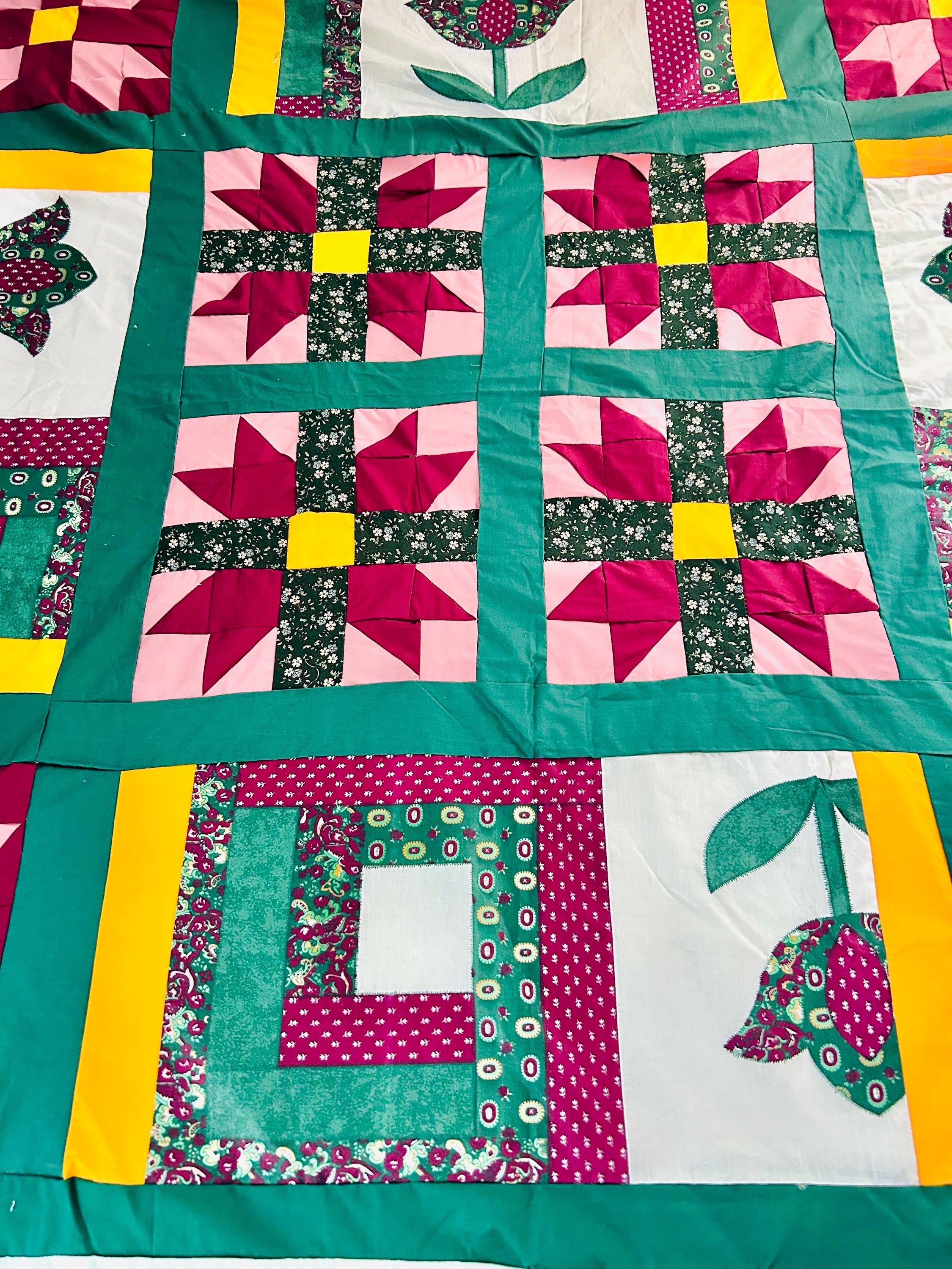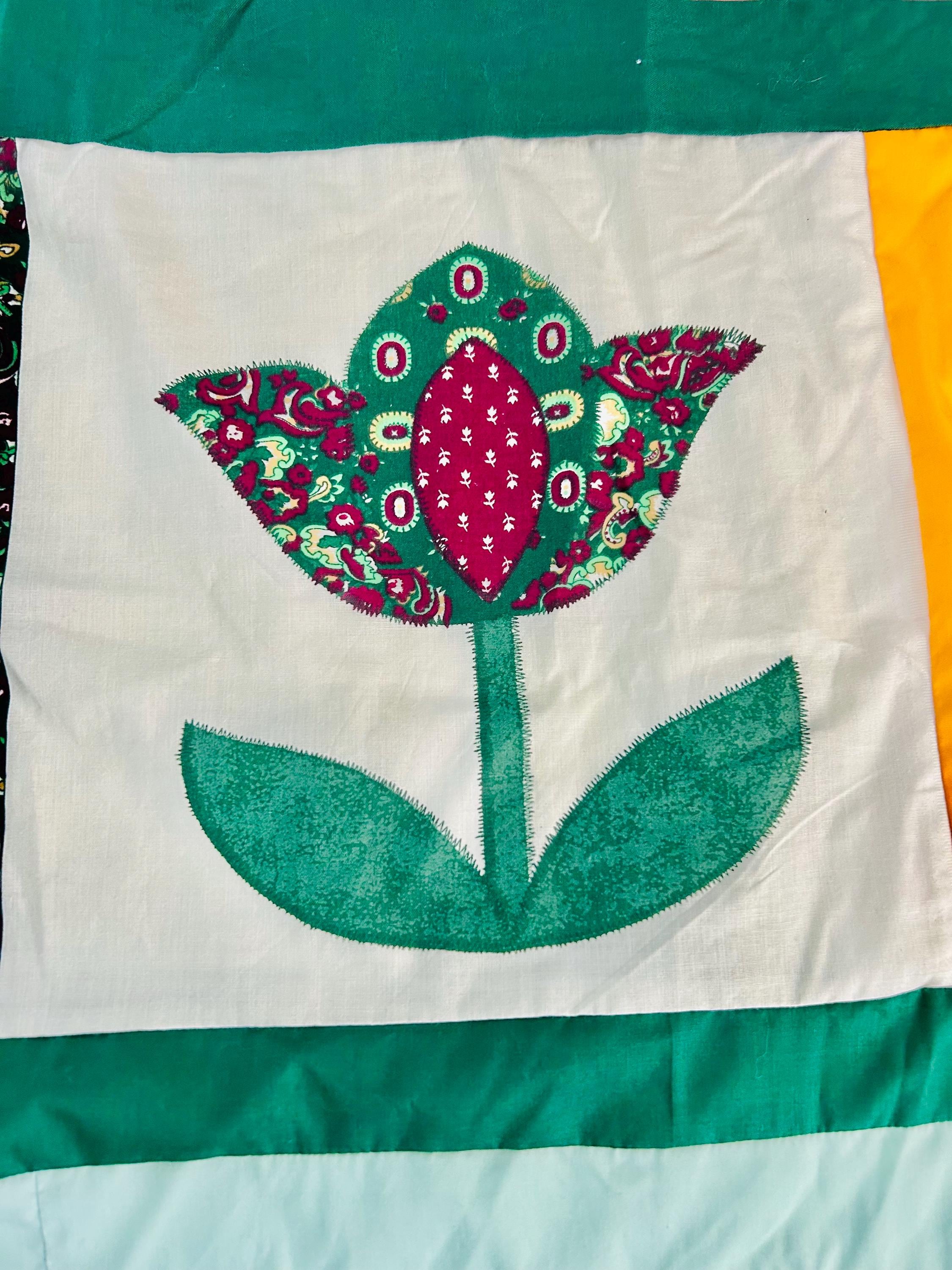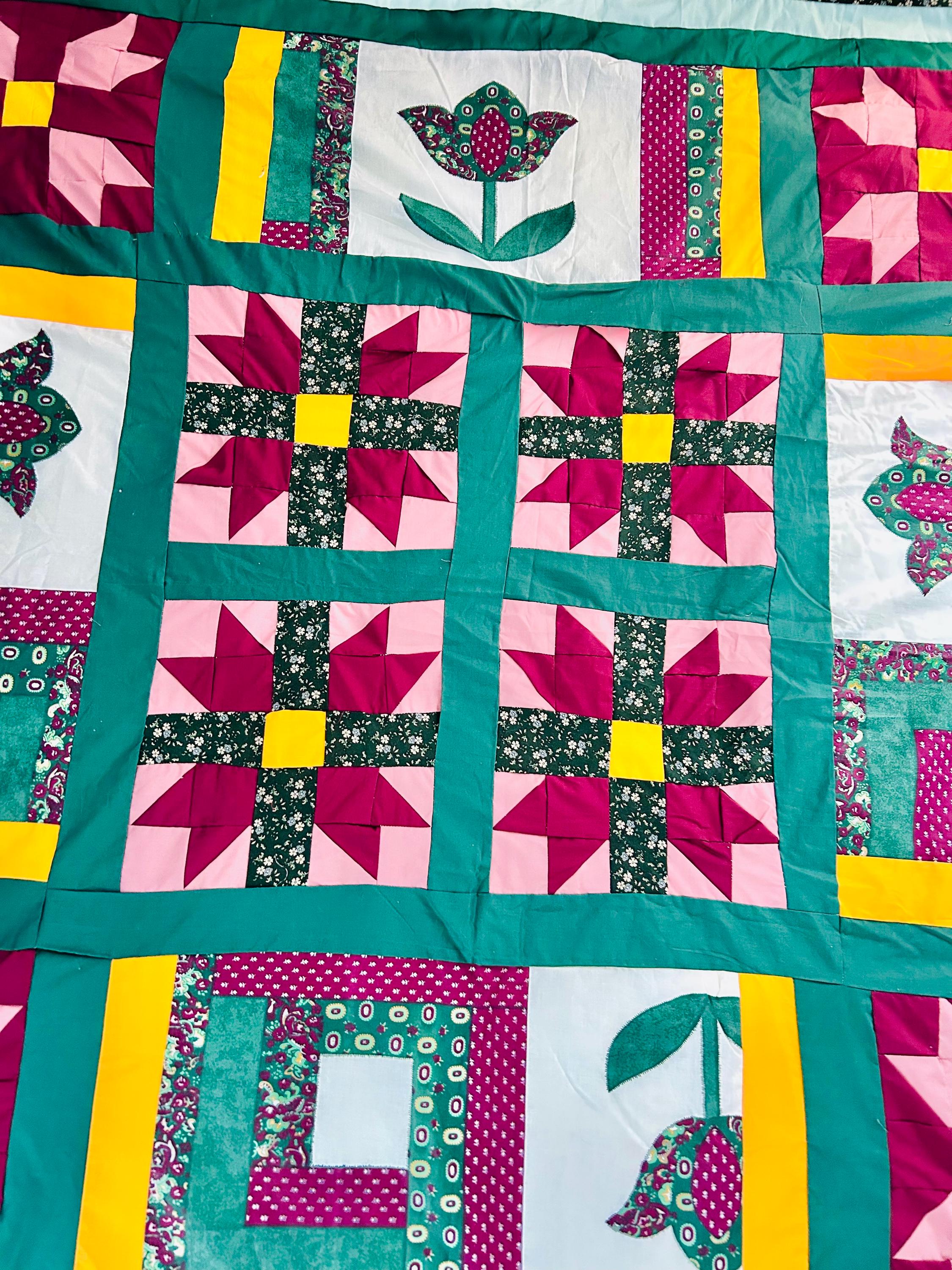 This vibrant vintage quilt TOP ONLY was pieced in the 1990s and features a cheerful combination of pieced star blocks and bold coordinating sashing in saturated jewel tones—greens, magentas, pinks, and sunny yellow accents. Importantly, the tulips are printed - not pieced or appliqued.
