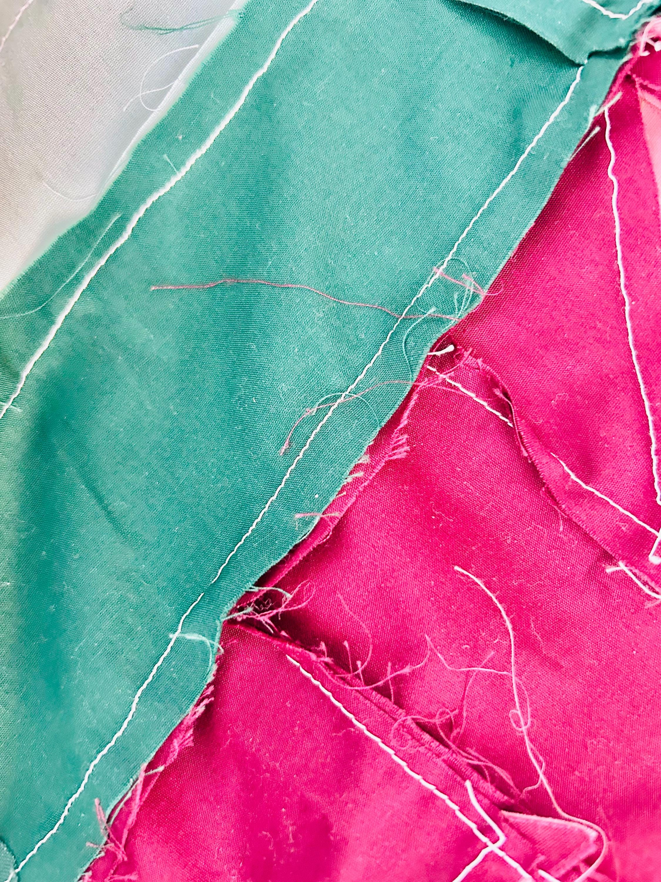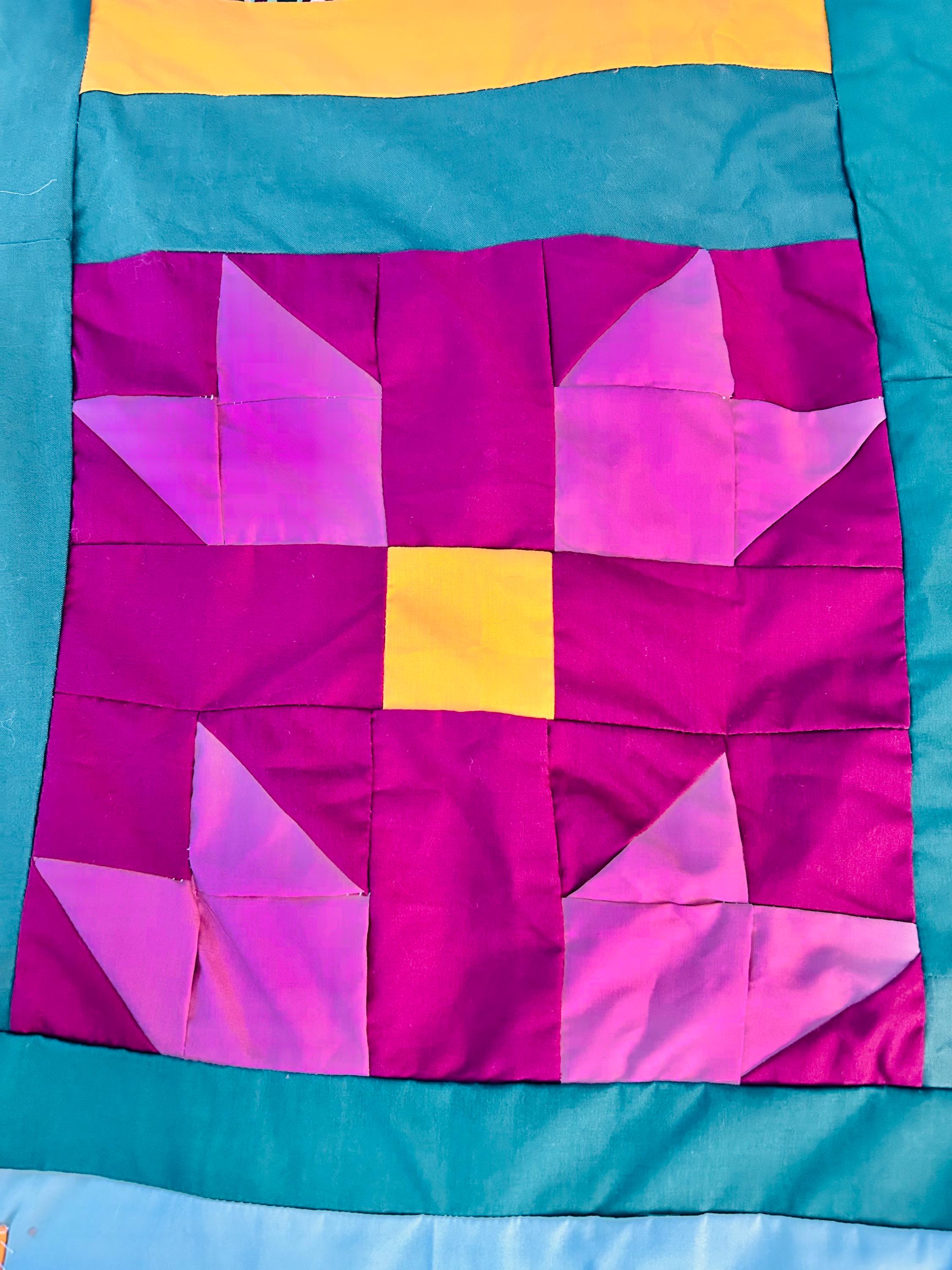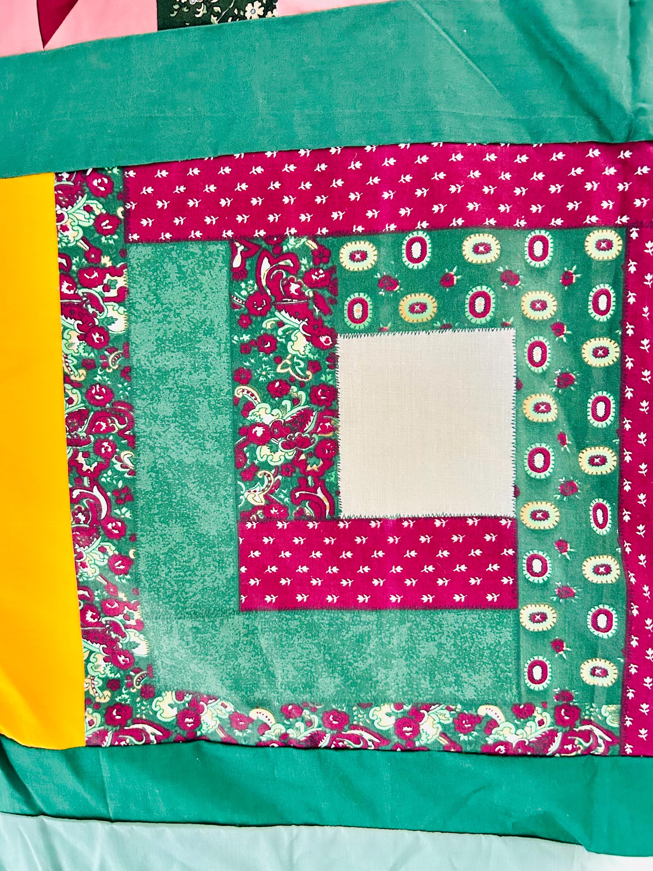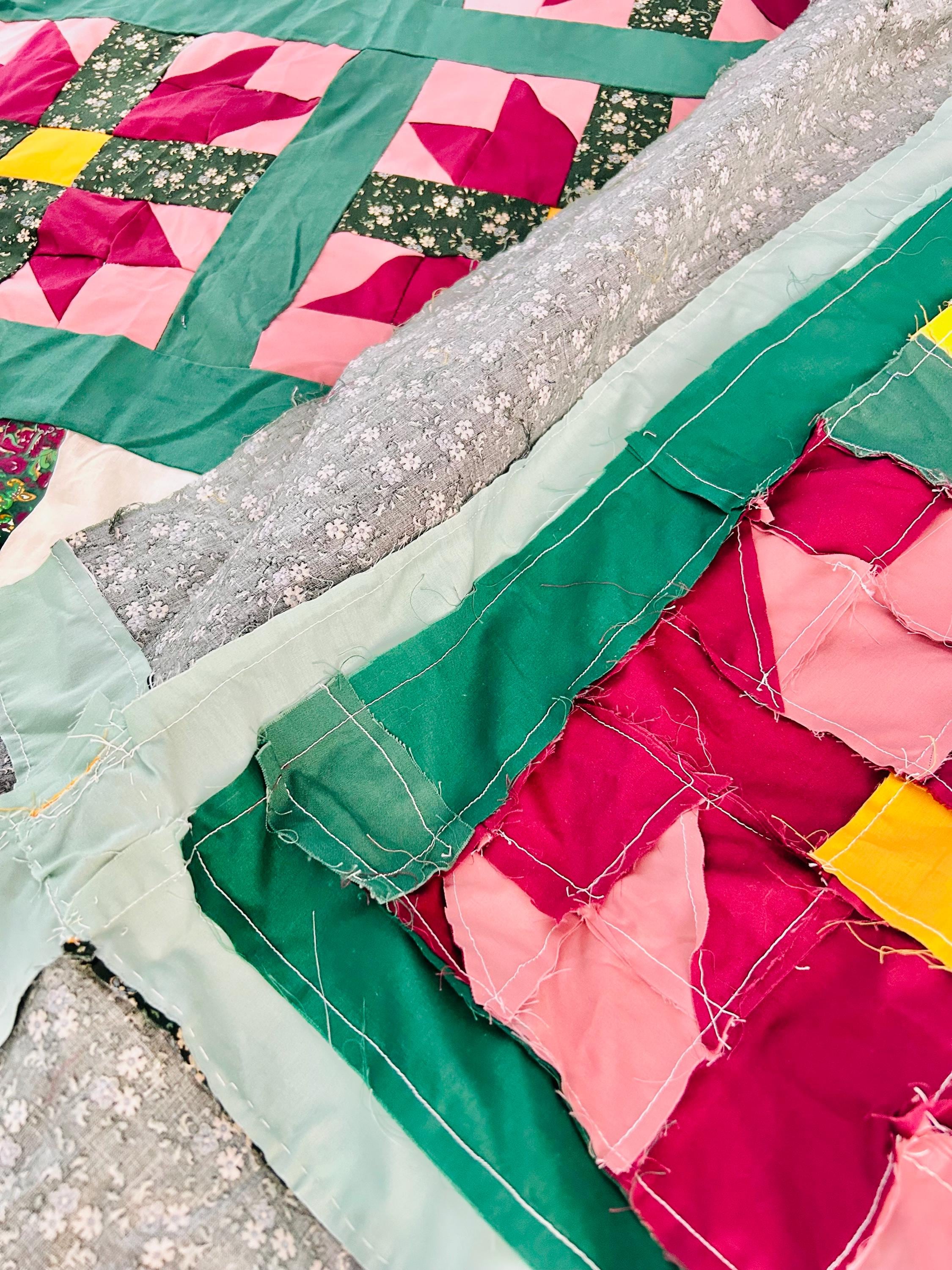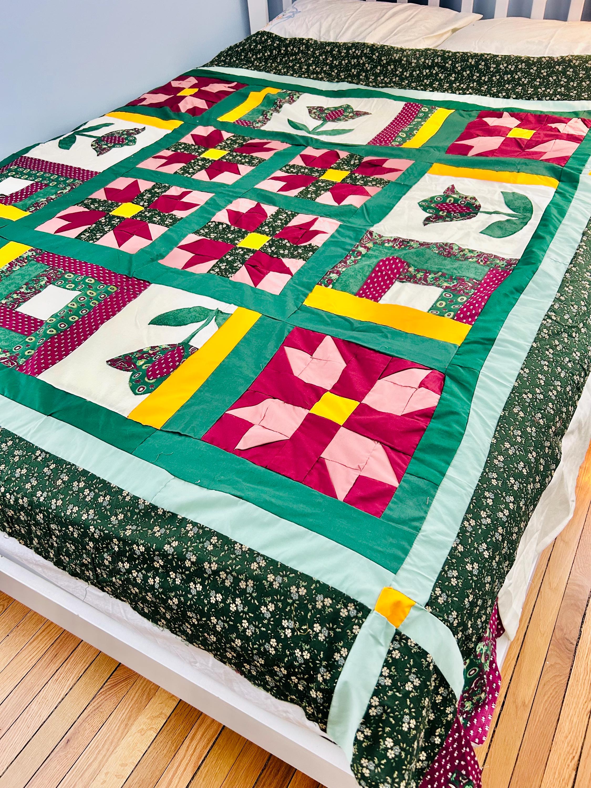 This vibrant vintage quilt TOP ONLY was pieced in the 1990s and features a cheerful combination of pieced star blocks and bold coordinating sashing in saturated jewel tones—greens, magentas, pinks, and sunny yellow accents. Importantly, the tulips are printed - not pieced or appliqued.