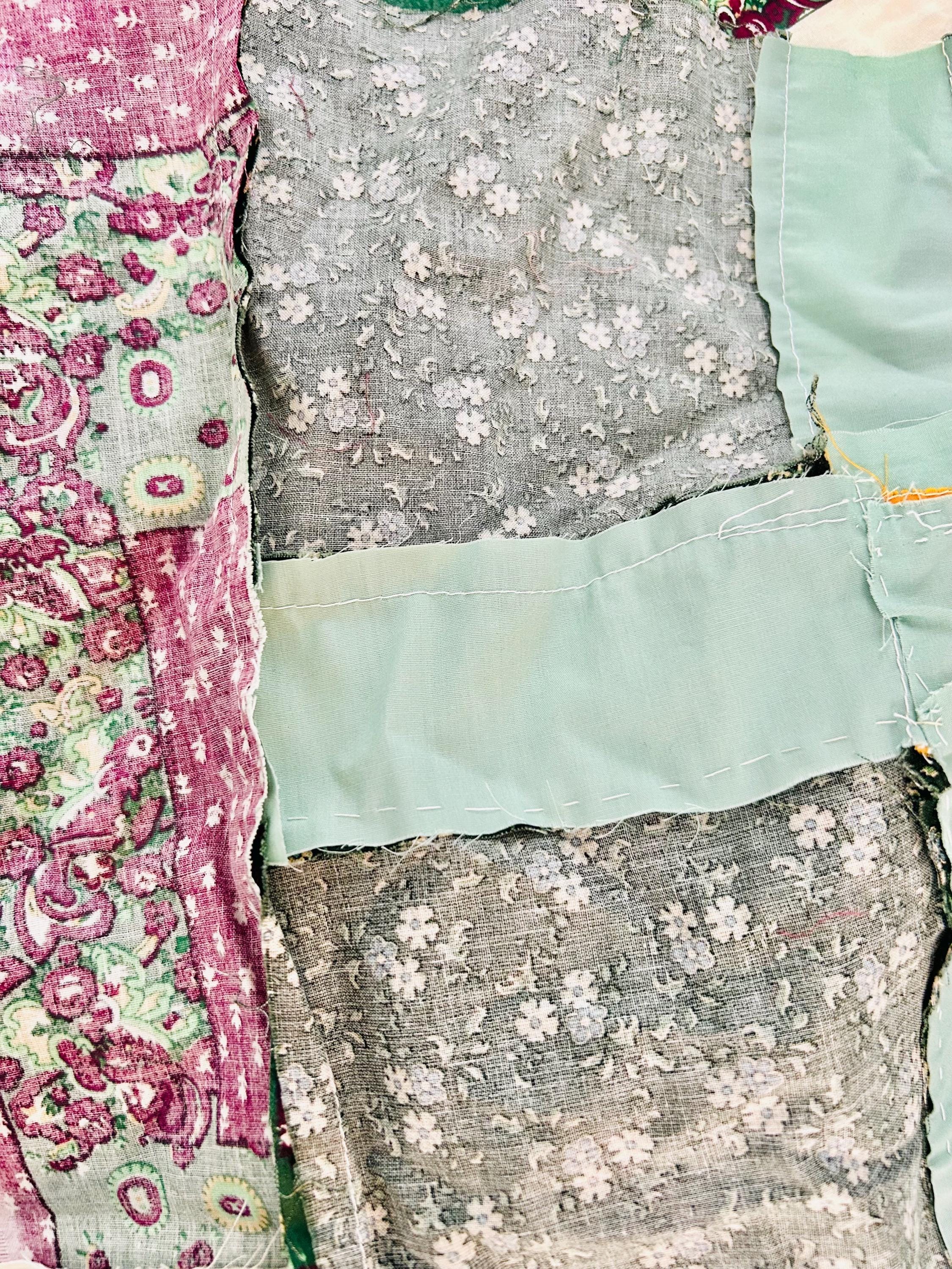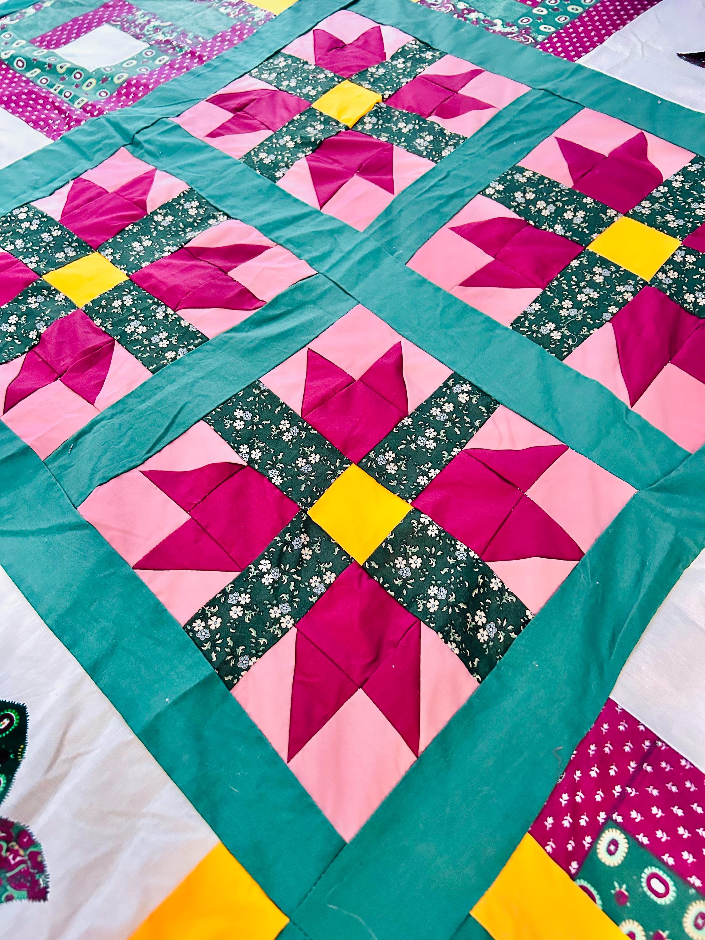 Details • Type: Quilt top only (unfinished) • Era: 1990s • Size: 69” x 76” • Construction: Machine pieced • Pattern: Mixed blocks including star motifs and floral appliqué panels • Materials: Cotton fabrics • Colors: Green, magenta, pink, yellow, white, and teal
