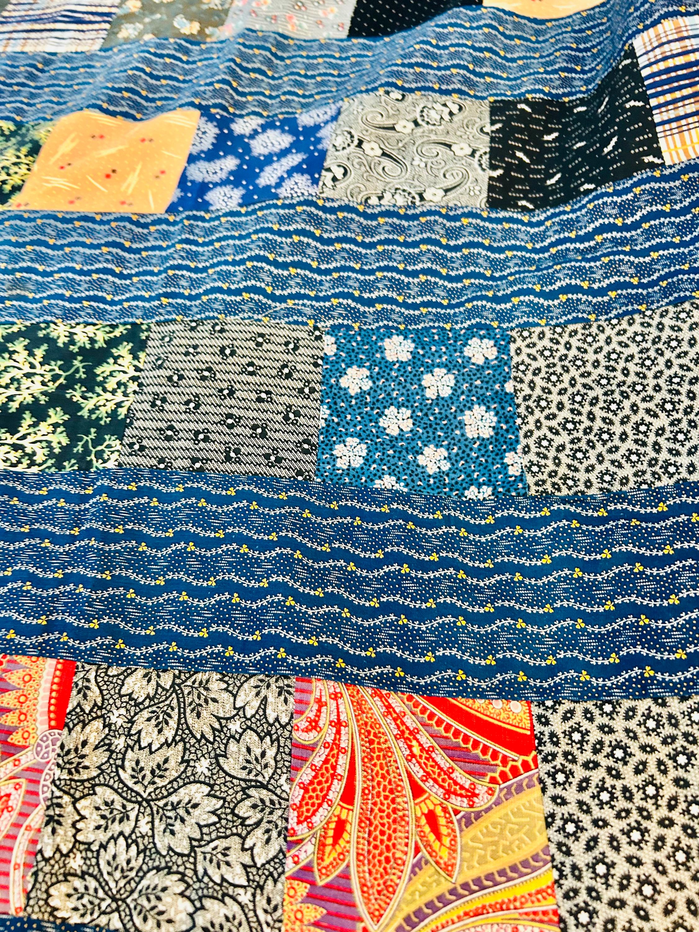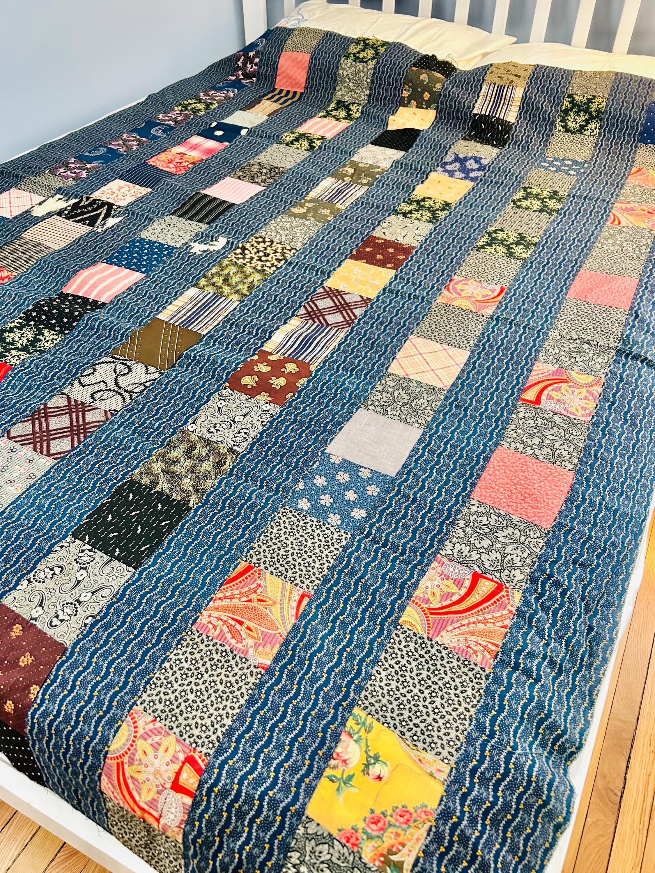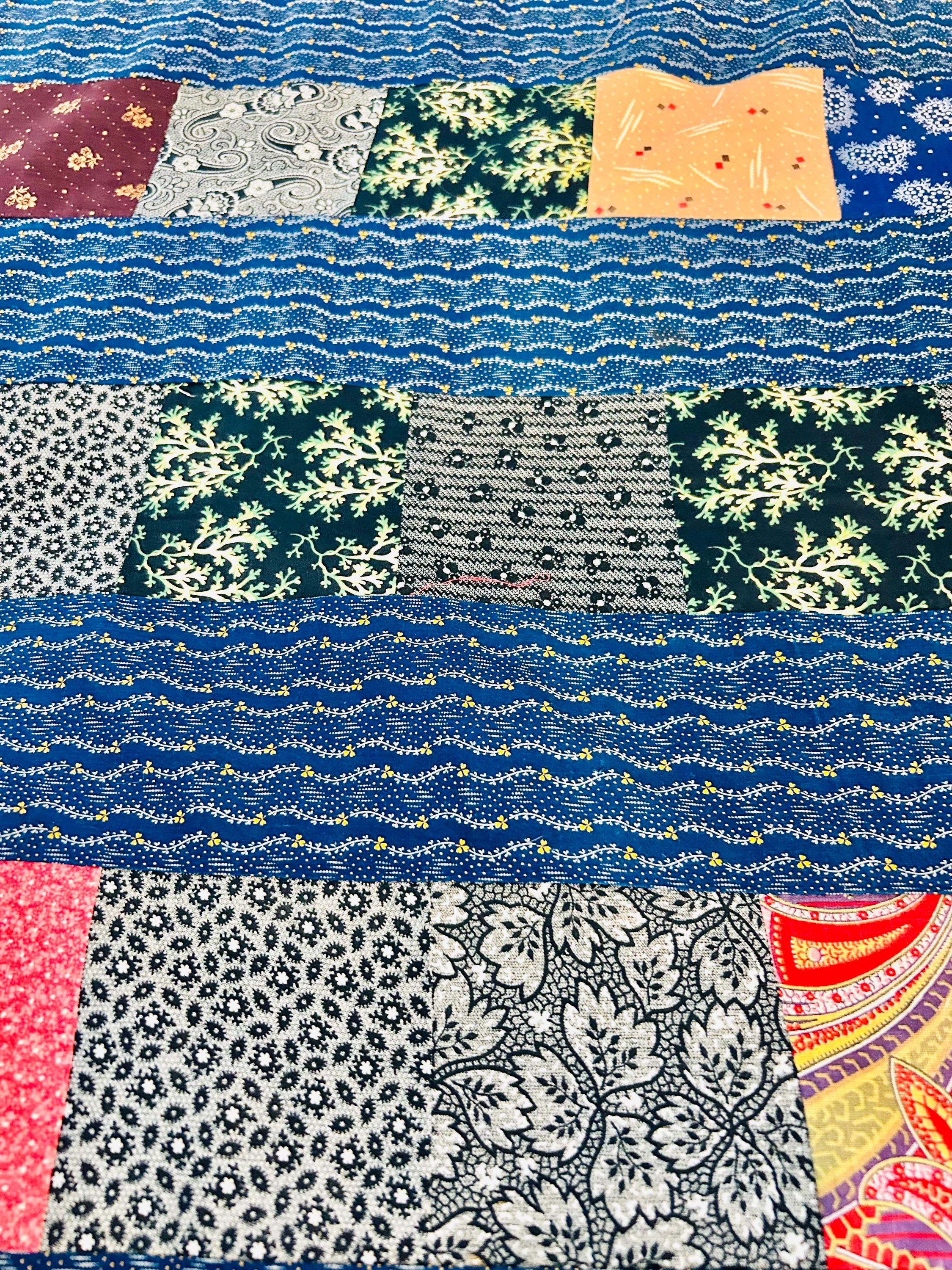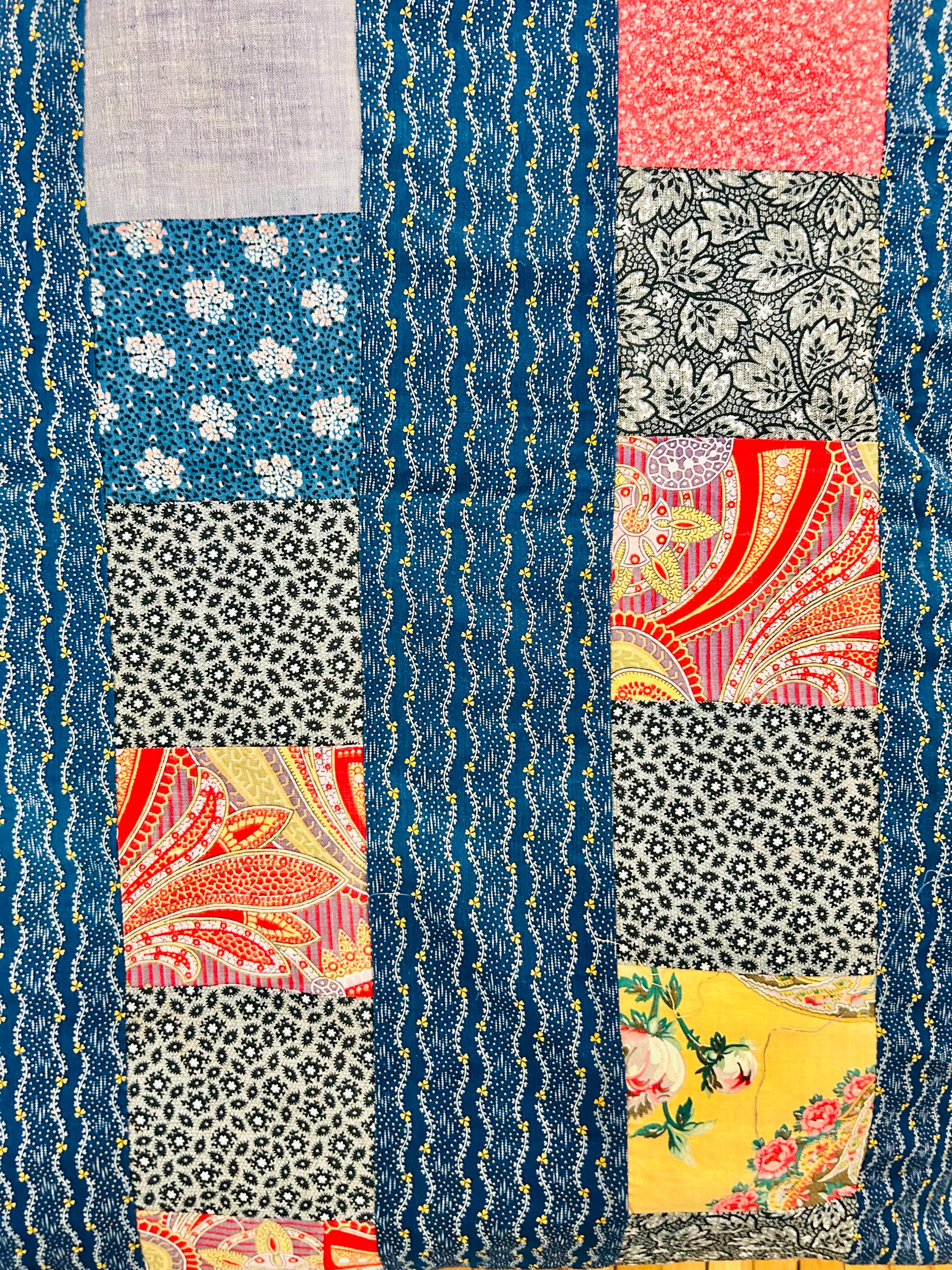 Details • Era: 1930s • Materials: Vintage cotton feed sack fabrics • Construction: Hand-pieced quilt top, no backing, no batting, no quilting • Size: 58” x 78” • Pattern: Vertical patchwork strip layout