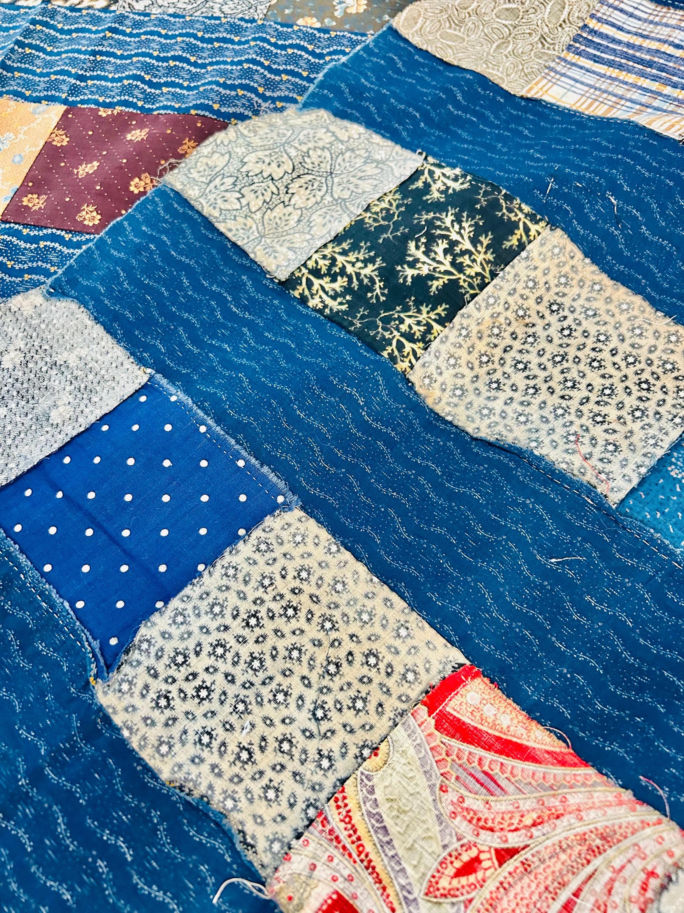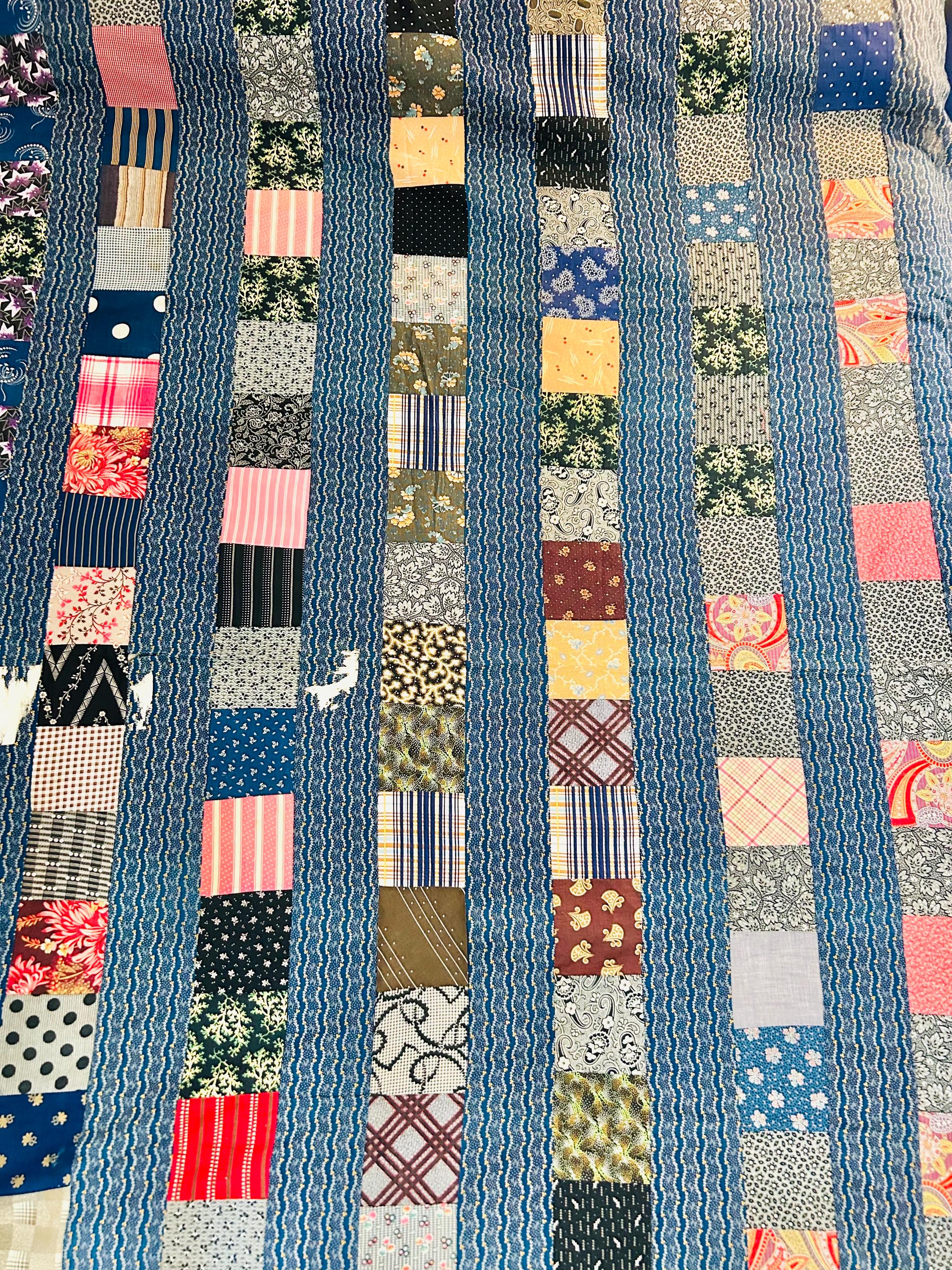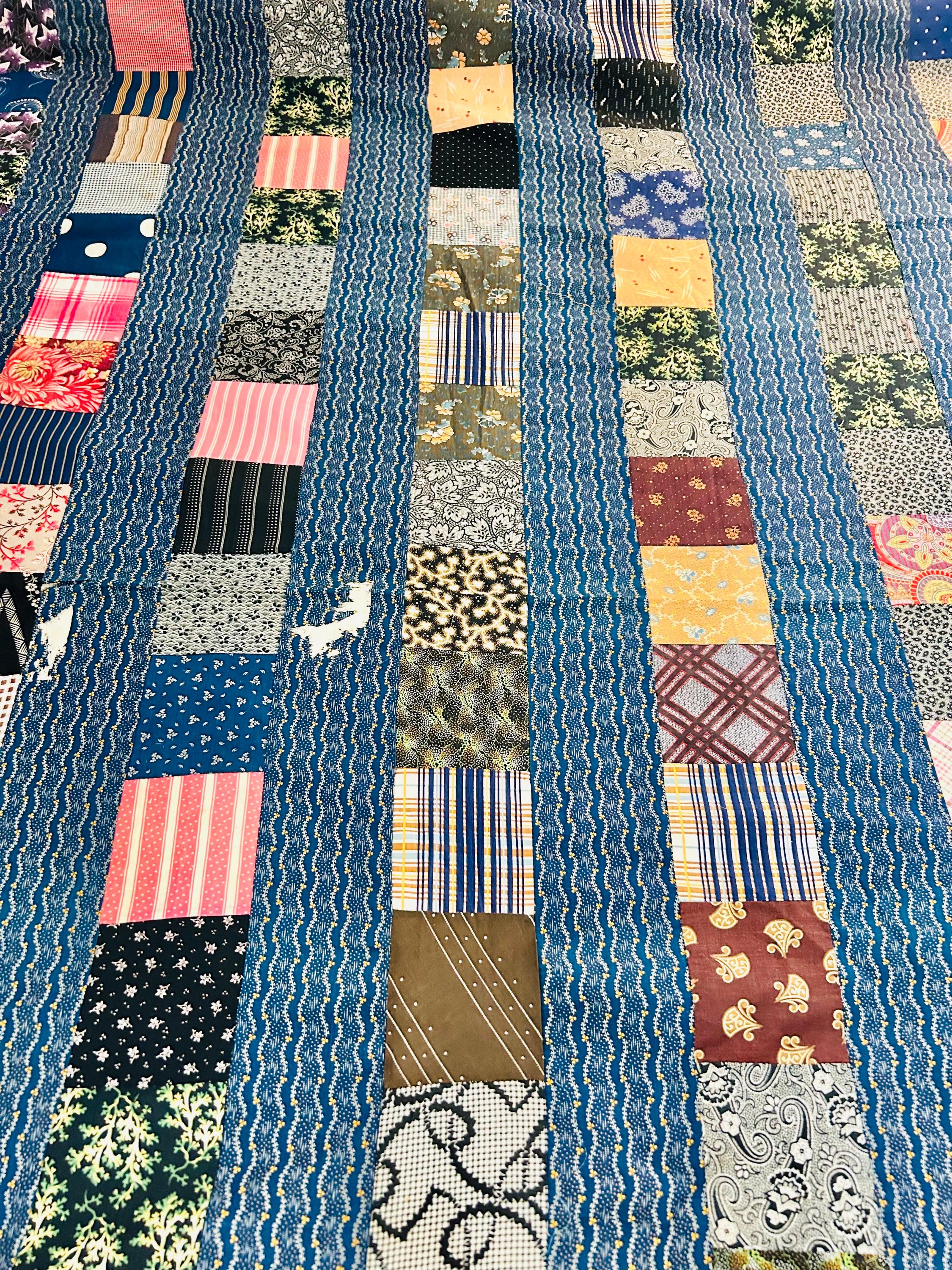 This authentic 1930s quilt top is a wonderful example of Depression-era thrift and creativity, made entirely from vintage cotton feed sack fabrics. The top features vertical patchwork columns of pieced feed sack prints, separated by narrow blue sashing strips.