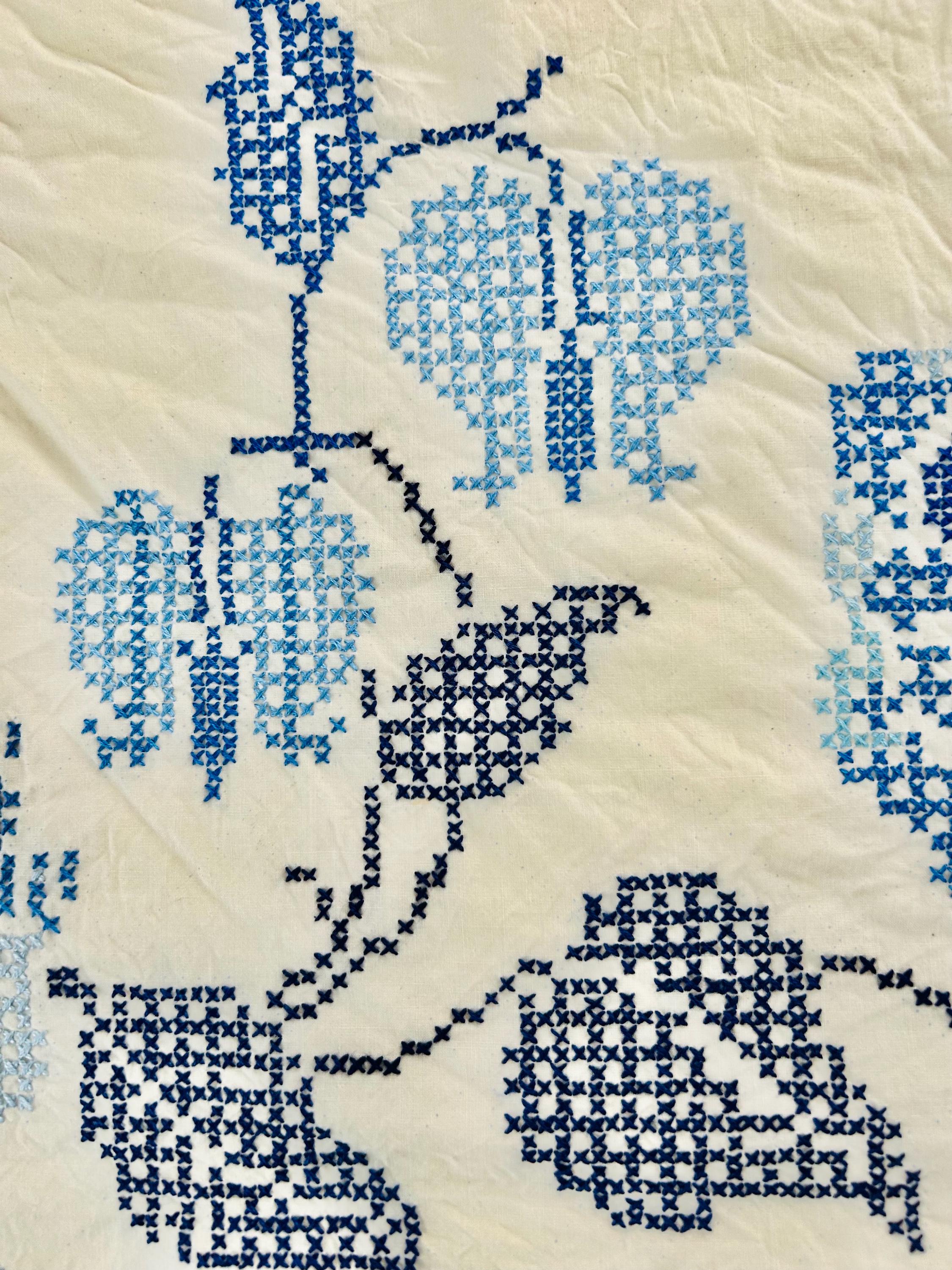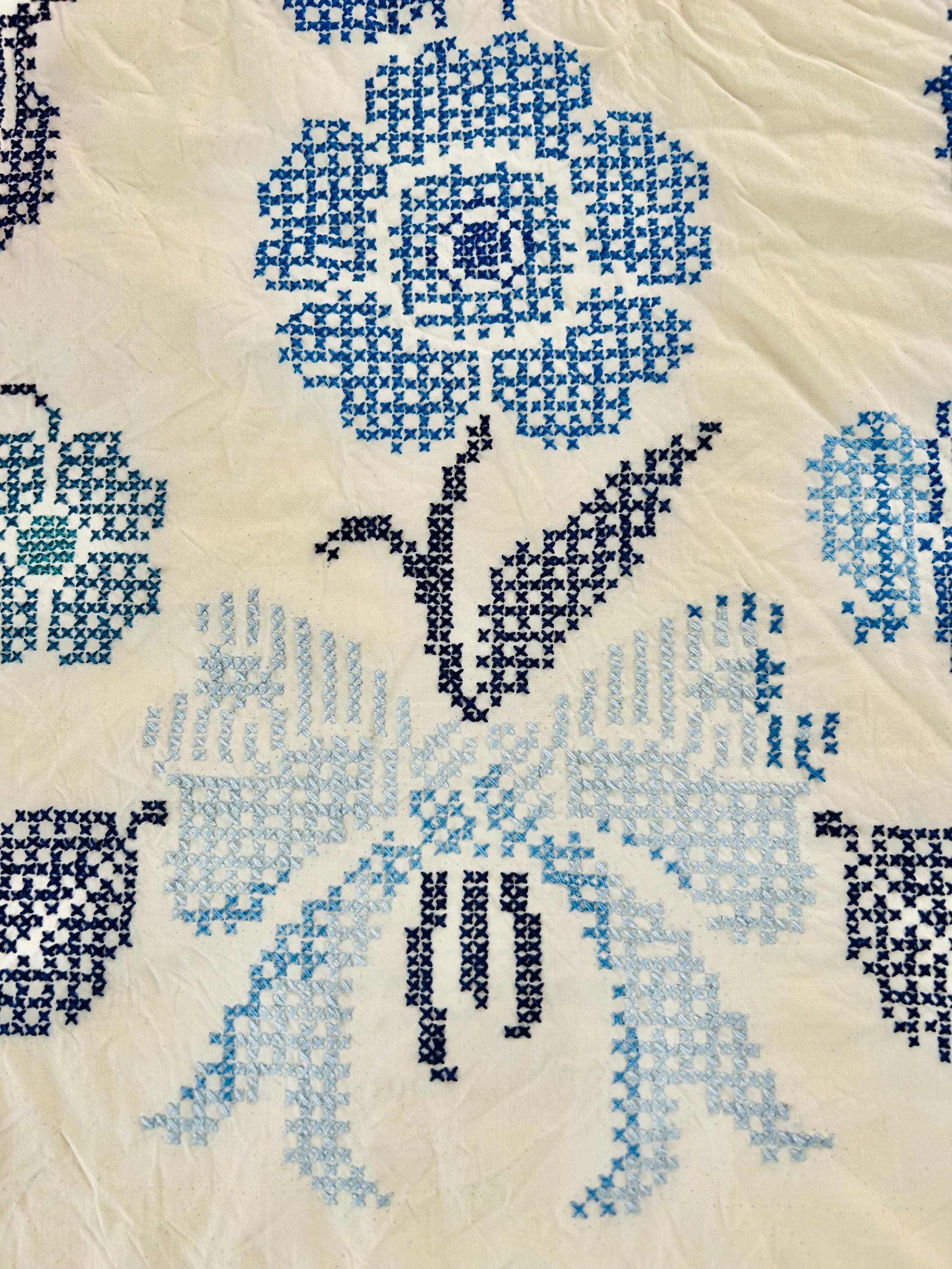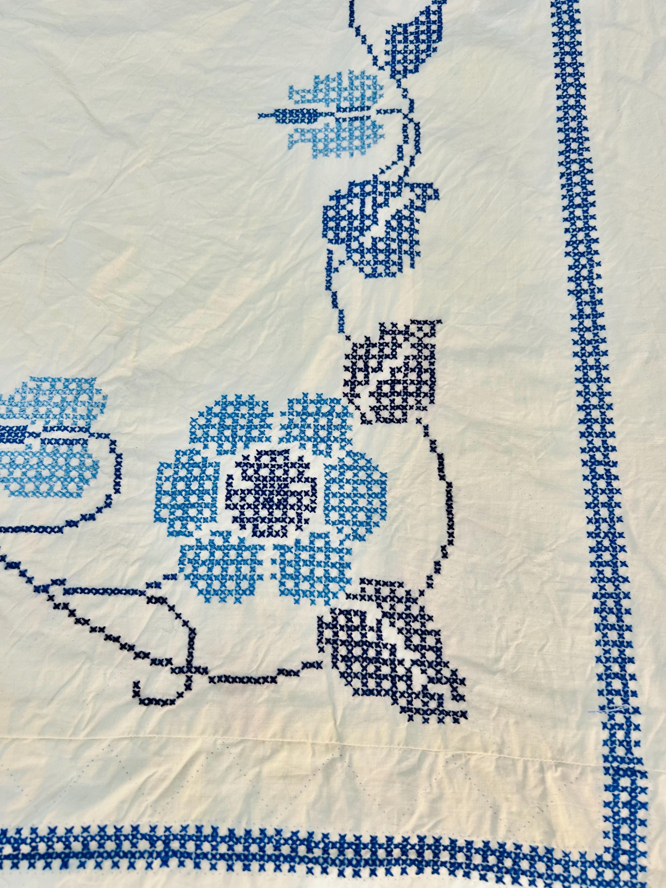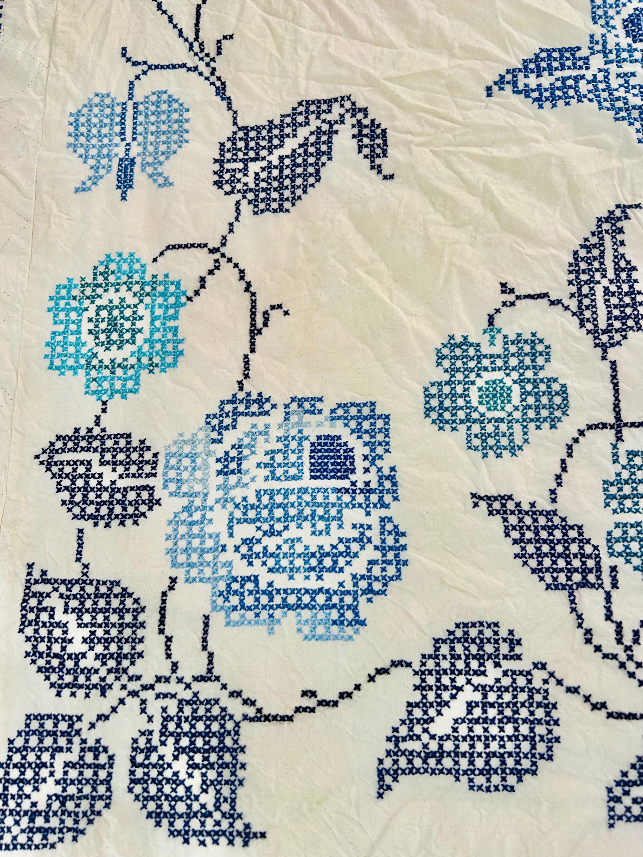 Details • Item: Quilt top only (unfinished) • Date: Circa 1940s • Technique: Entirely hand cross-stitched • Design: Floral vines with central and border motifs • Colors: Multiple shades of blue on white • Materials: Cotton fabric and cotton embroidery floss • Size: 76” x 94” (generous bed size once finished) • Backing: None • Batting: None • Quilting: None