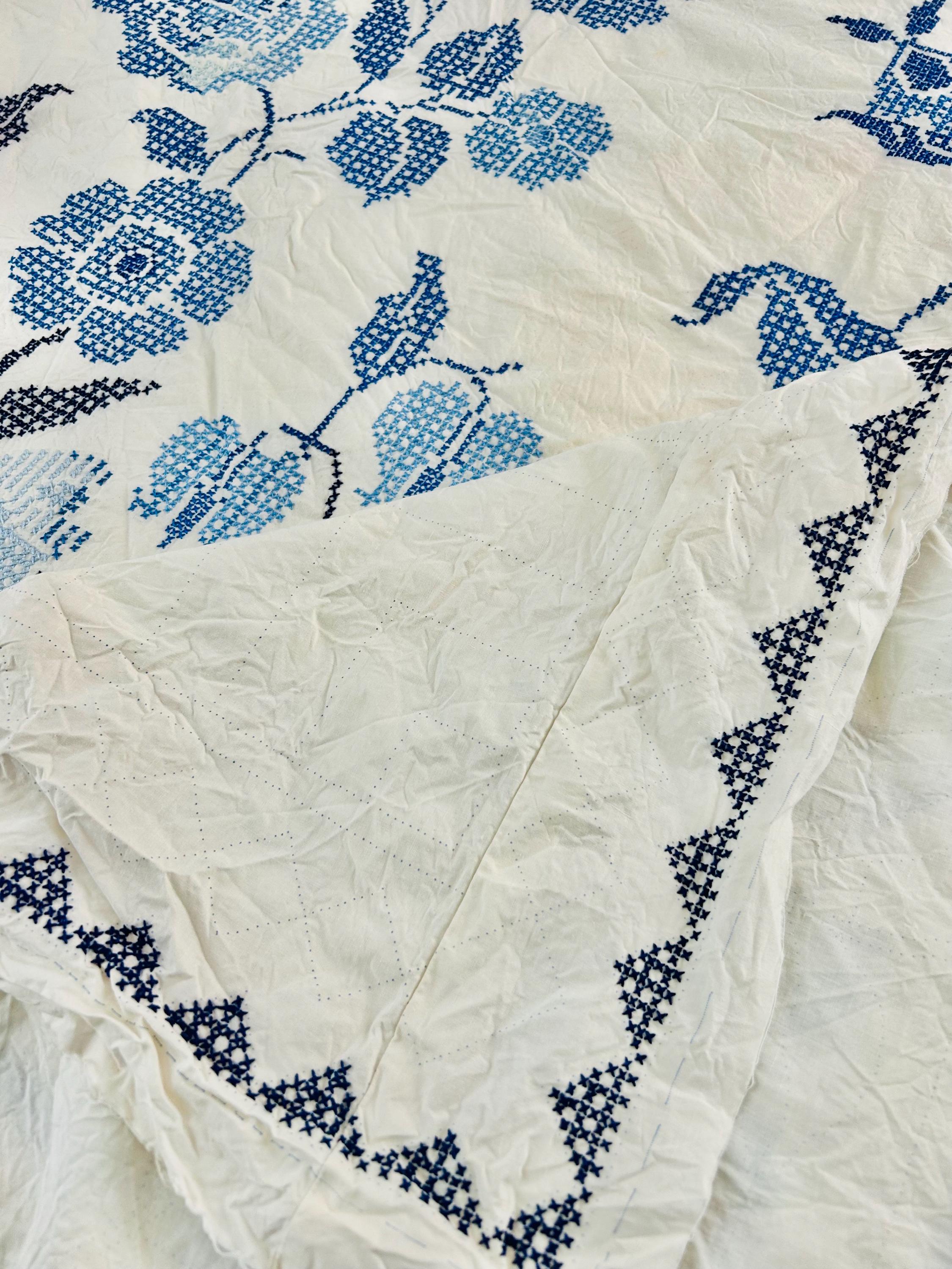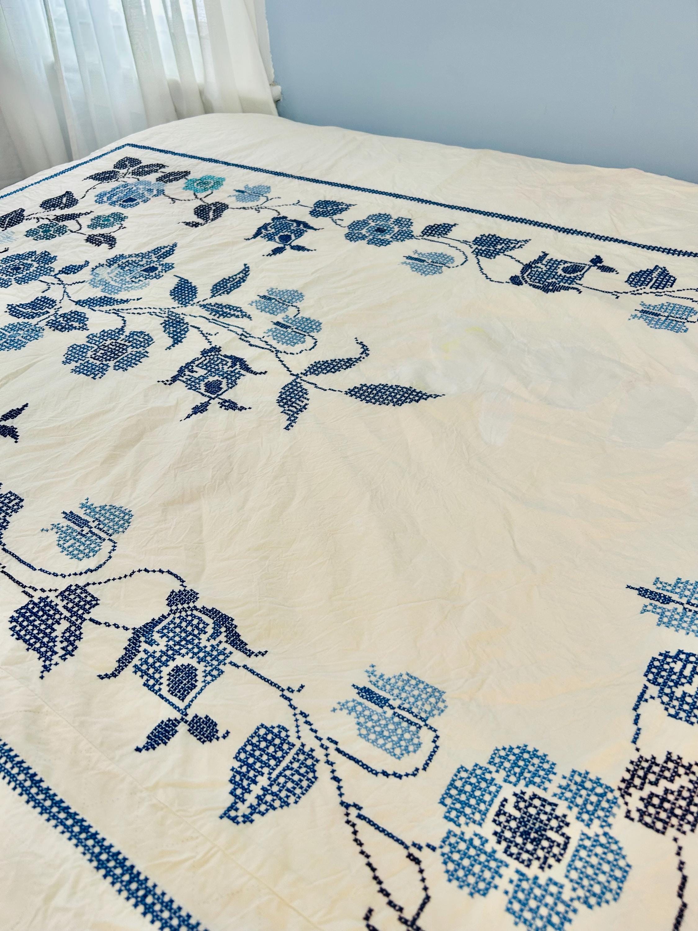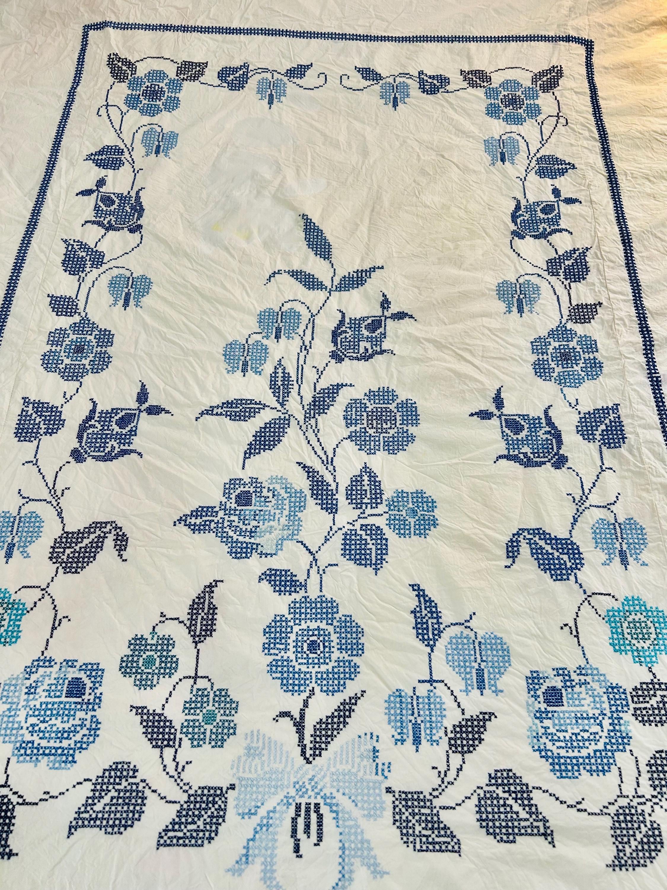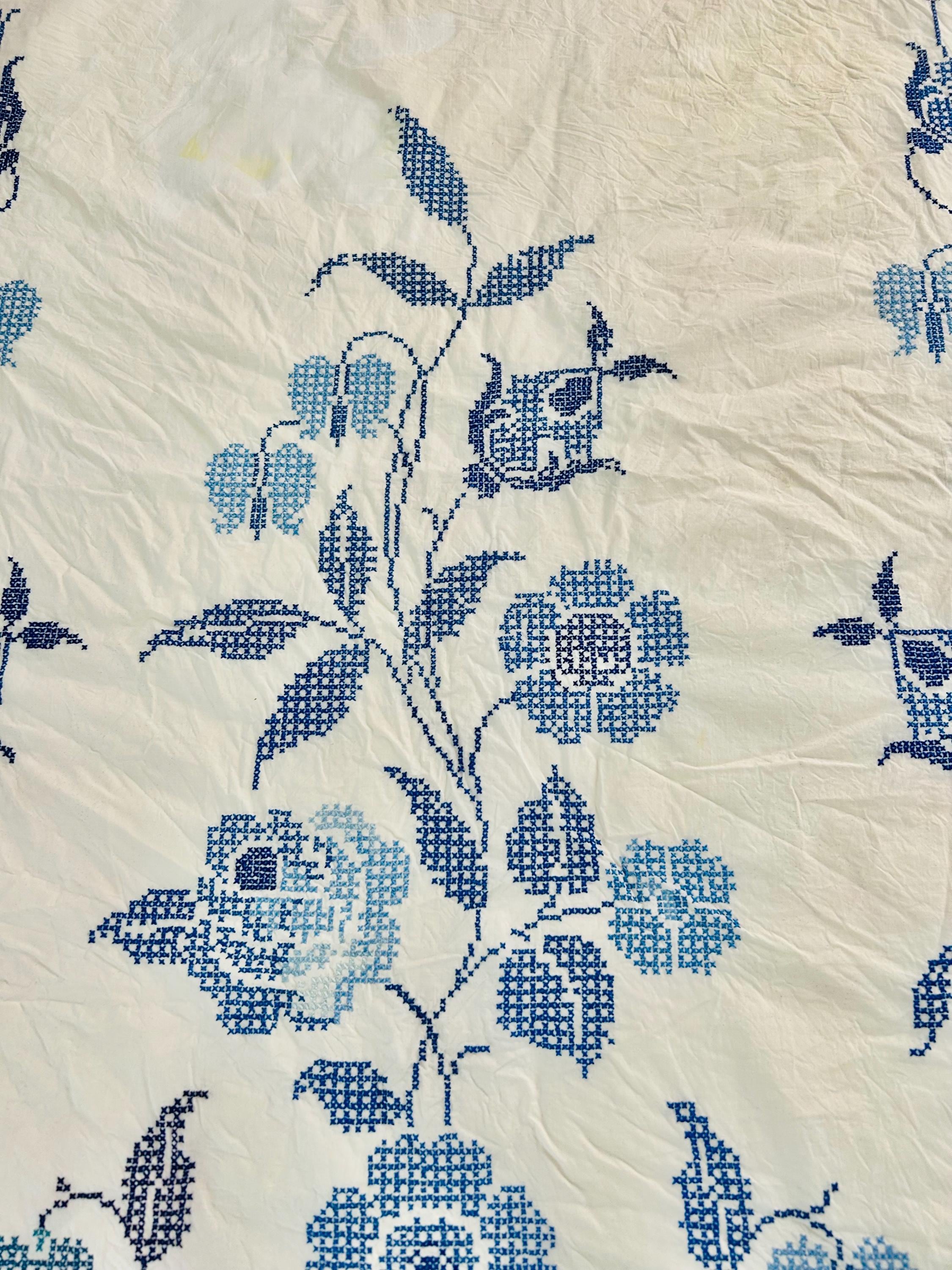 Details • Item: Quilt top only (unfinished) • Date: Circa 1940s • Technique: Entirely hand cross-stitched • Design: Floral vines with central and border motifs • Colors: Multiple shades of blue on white • Materials: Cotton fabric and cotton embroidery floss • Size: 76” x 94” (generous bed size once finished) • Backing: None • Batting: None • Quilting: None