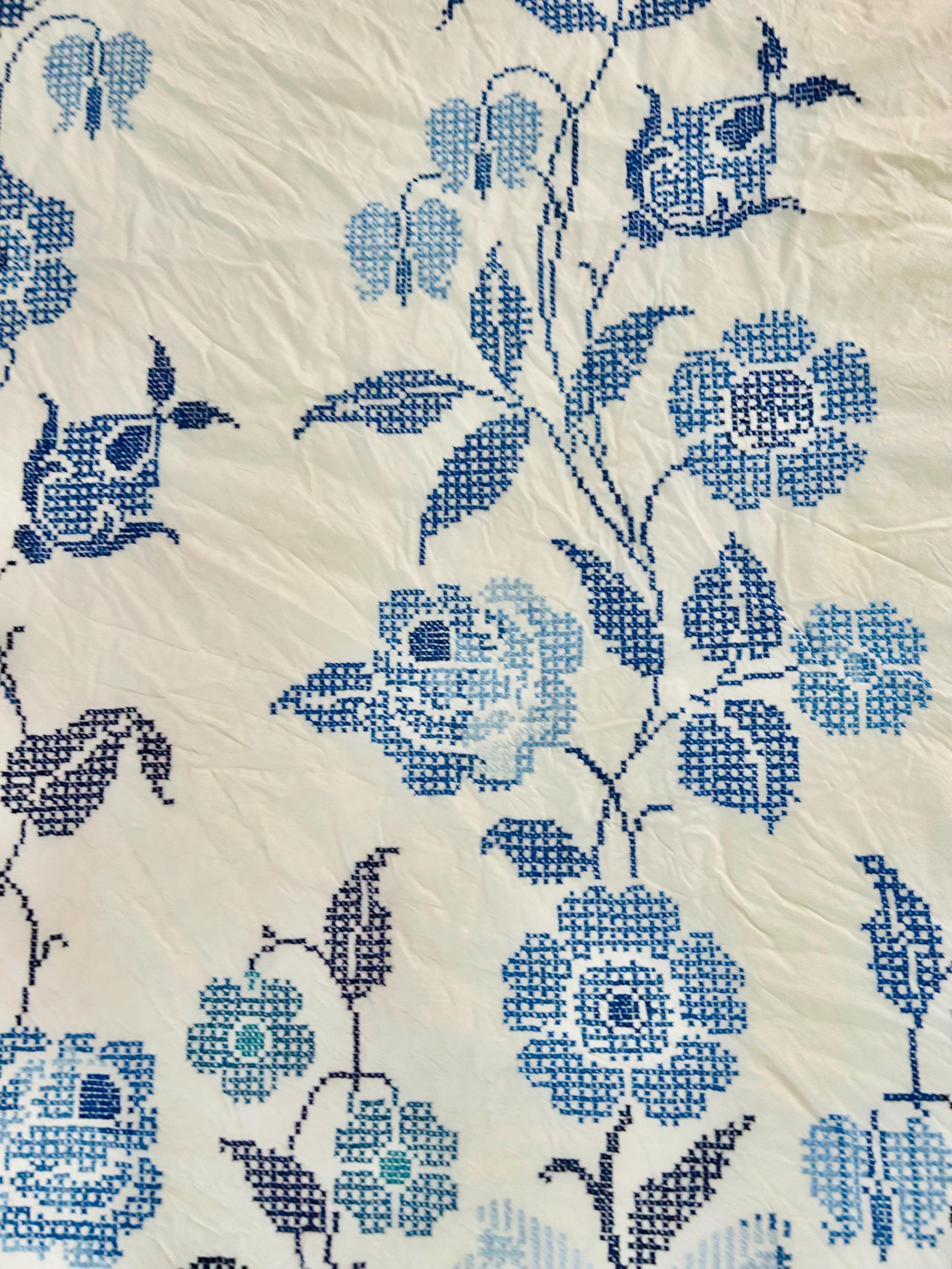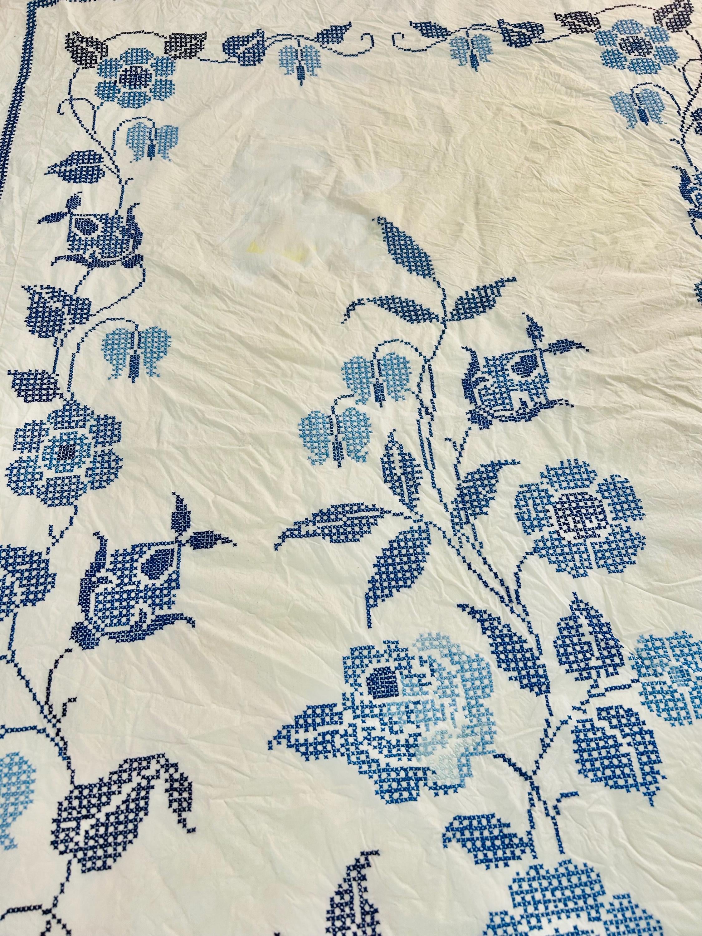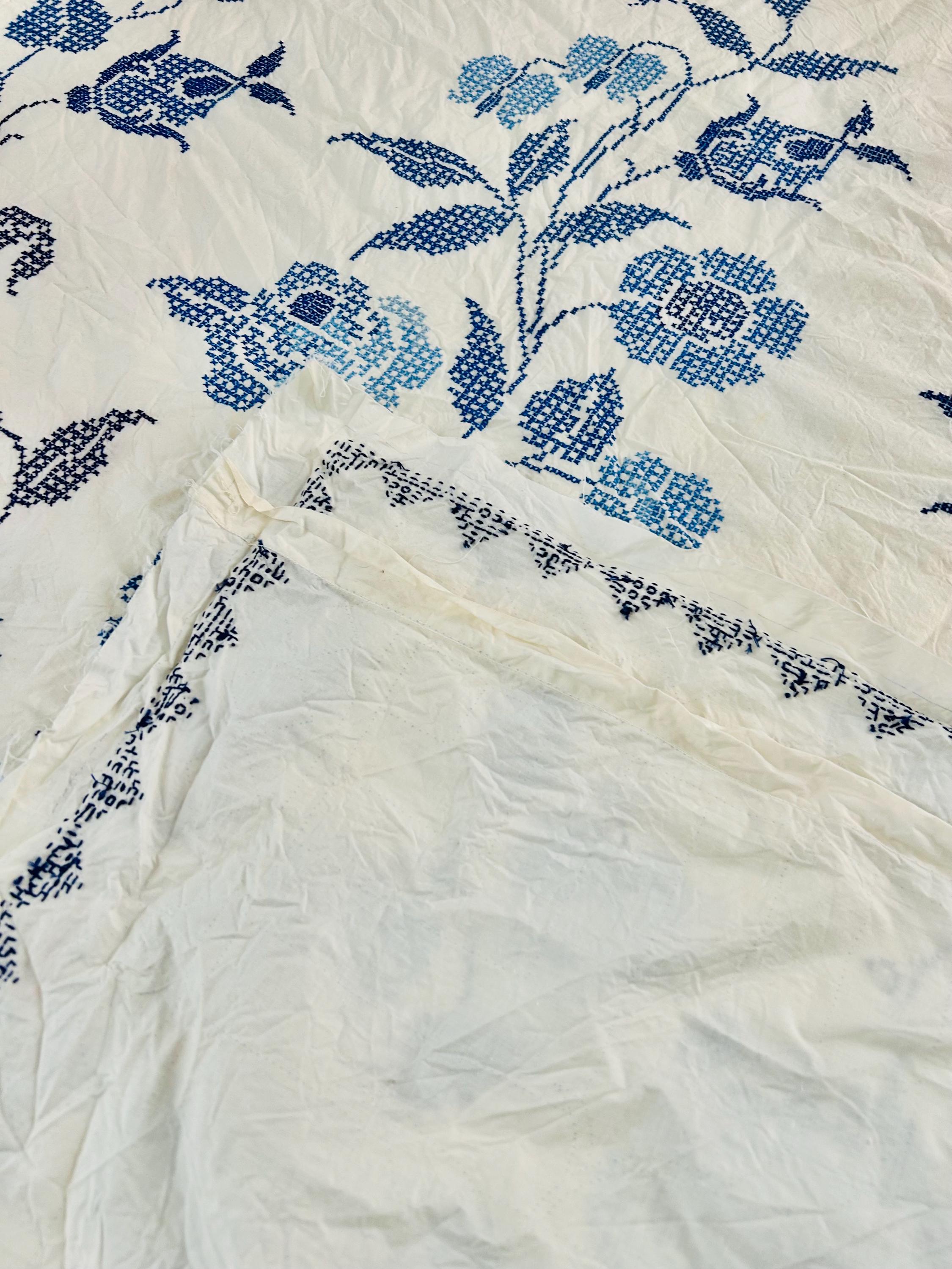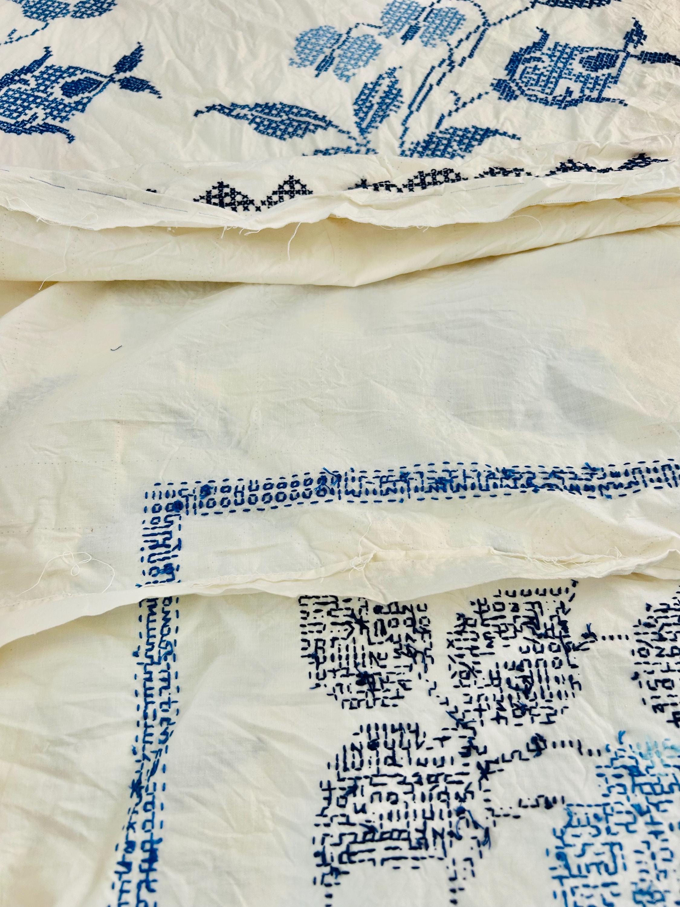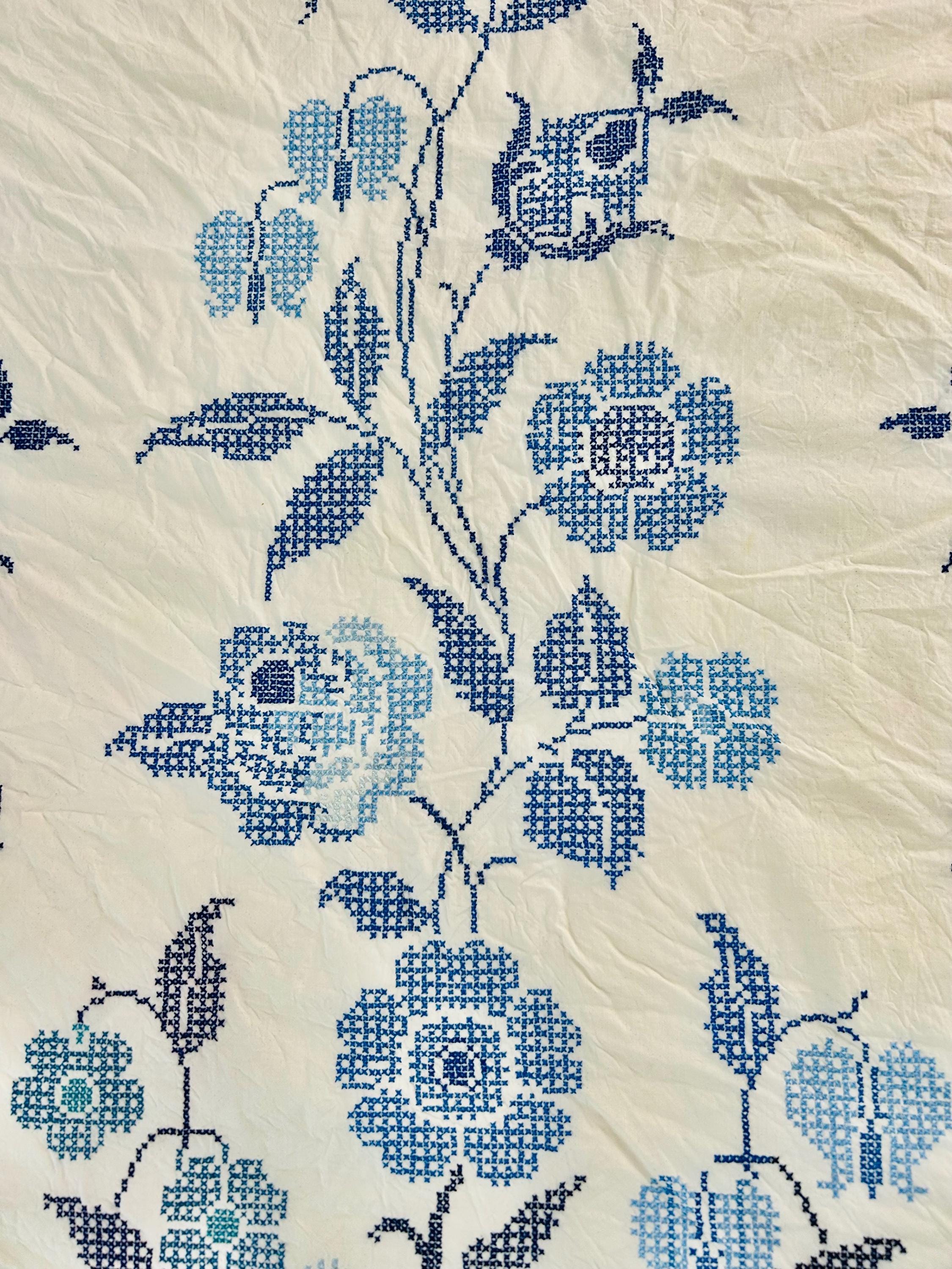 Details • Item: Quilt top only (unfinished) • Date: Circa 1940s • Technique: Entirely hand cross-stitched • Design: Floral vines with central and border motifs • Colors: Multiple shades of blue on white • Materials: Cotton fabric and cotton embroidery floss • Size: 76” x 94” (generous bed size once finished) • Backing: None • Batting: None • Quilting: None