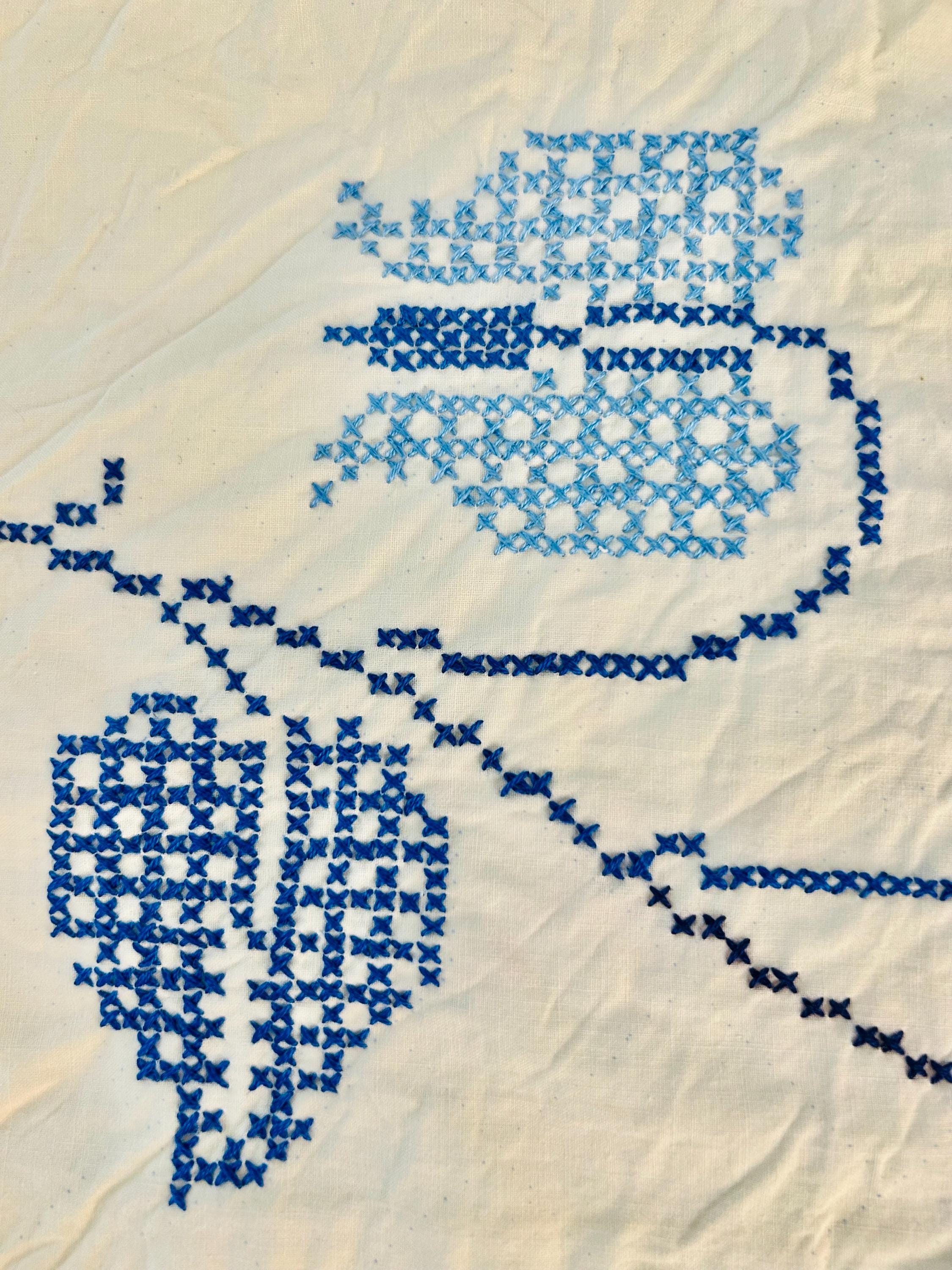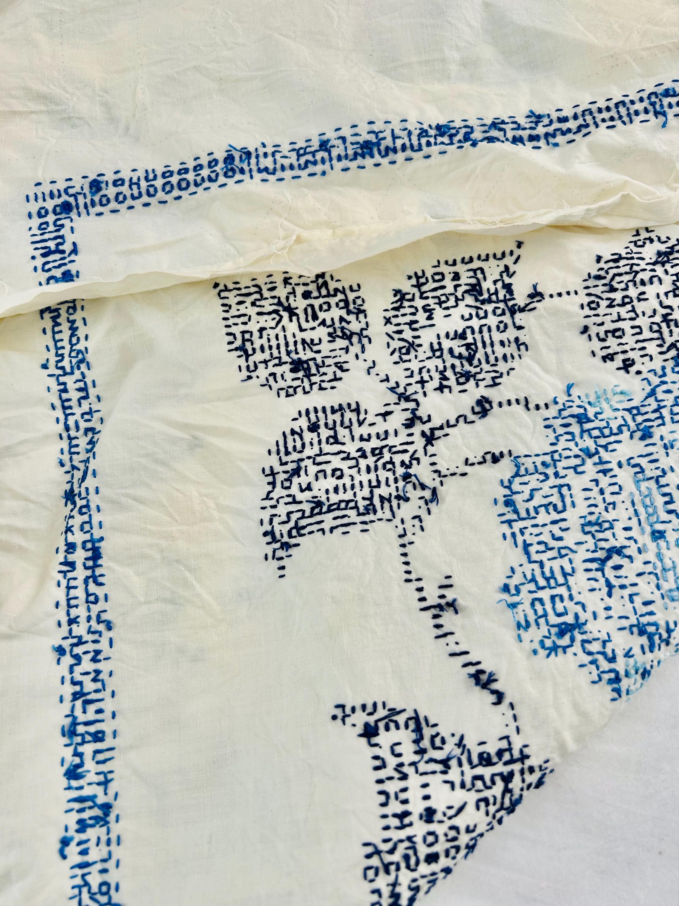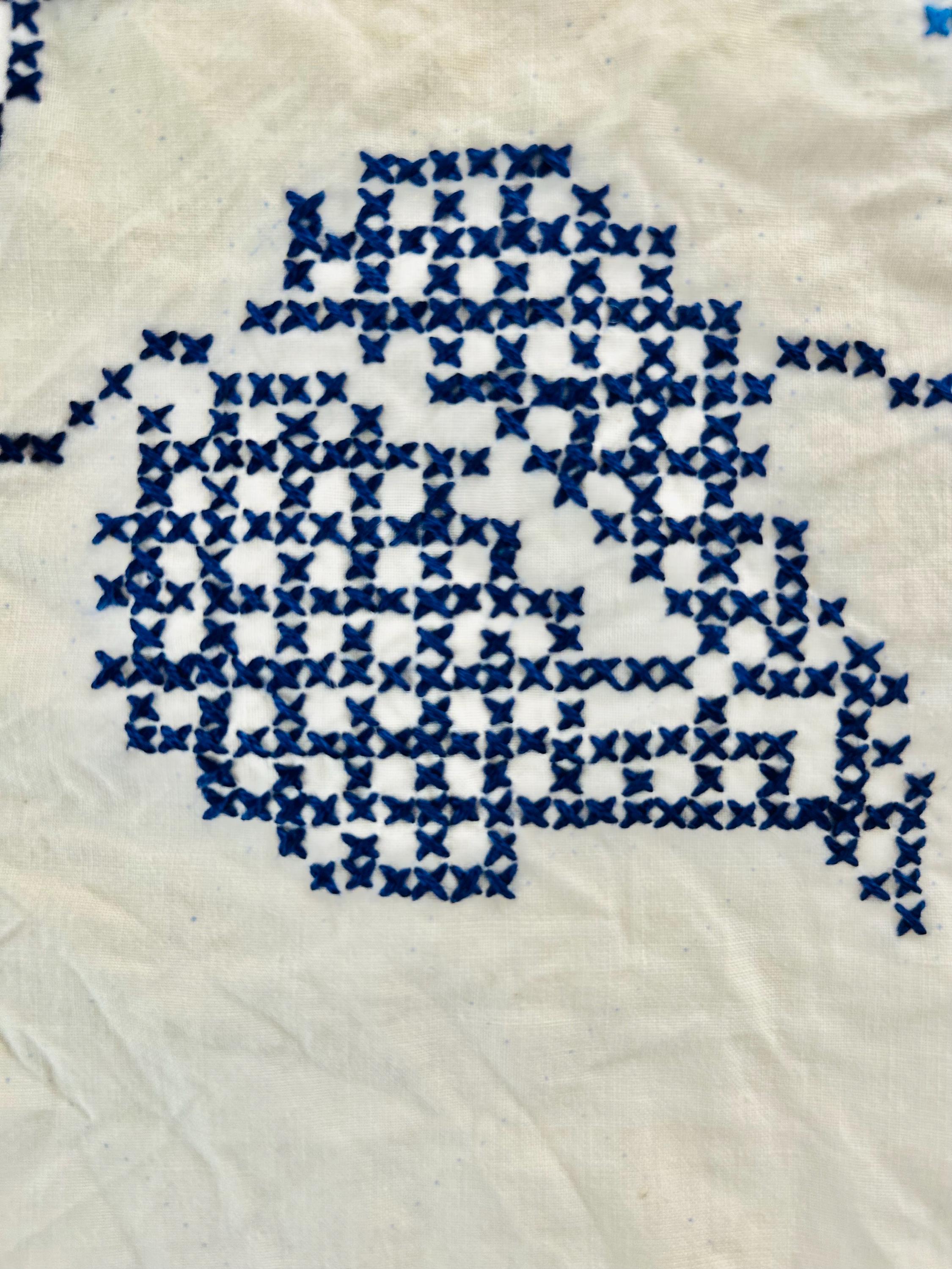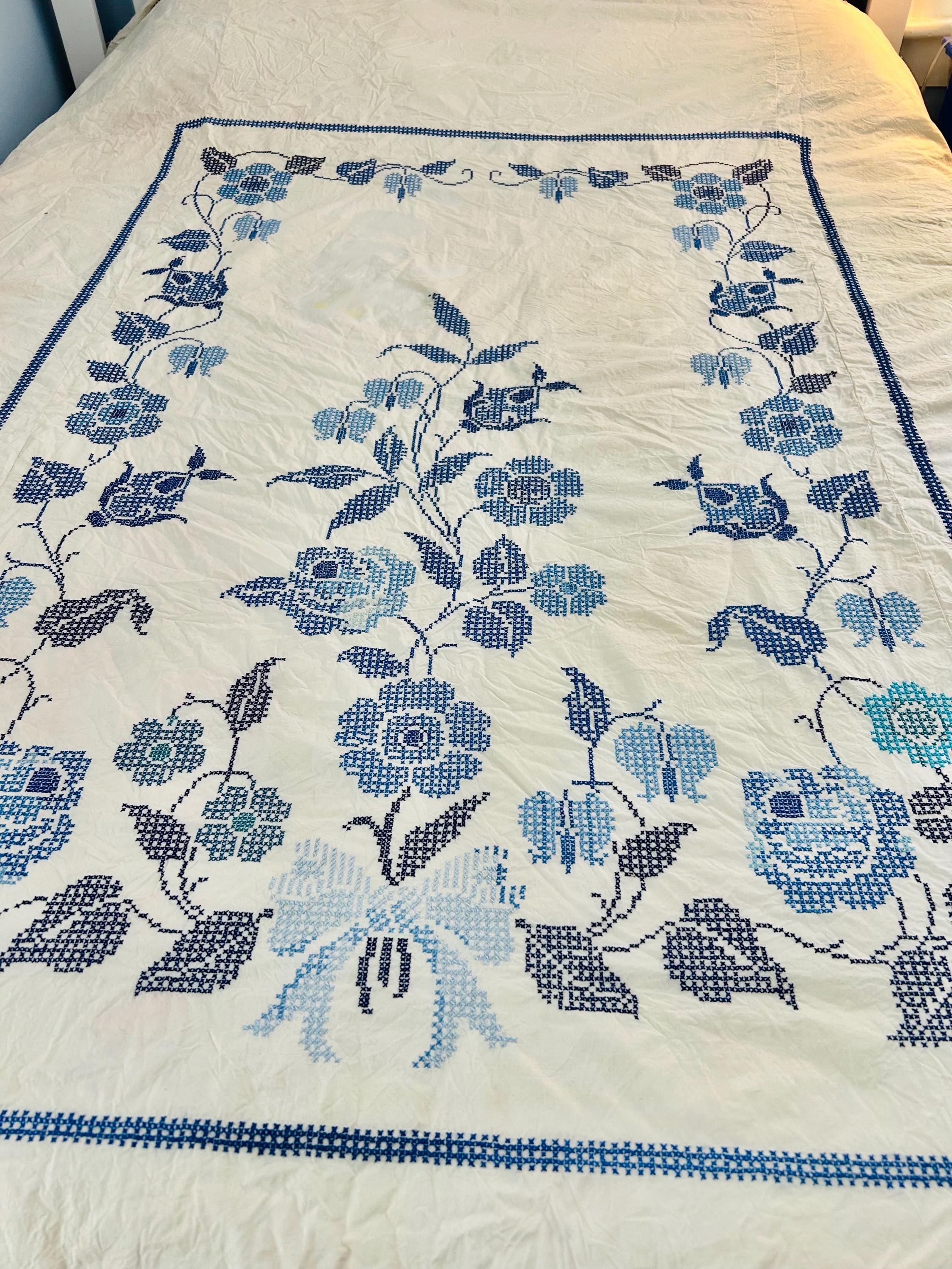 Details • Item: Quilt top only (unfinished) • Date: Circa 1940s • Technique: Entirely hand cross-stitched • Design: Floral vines with central and border motifs • Colors: Multiple shades of blue on white • Materials: Cotton fabric and cotton embroidery floss • Size: 76” x 94” (generous bed size once finished) • Backing: None • Batting: None • Quilting: None