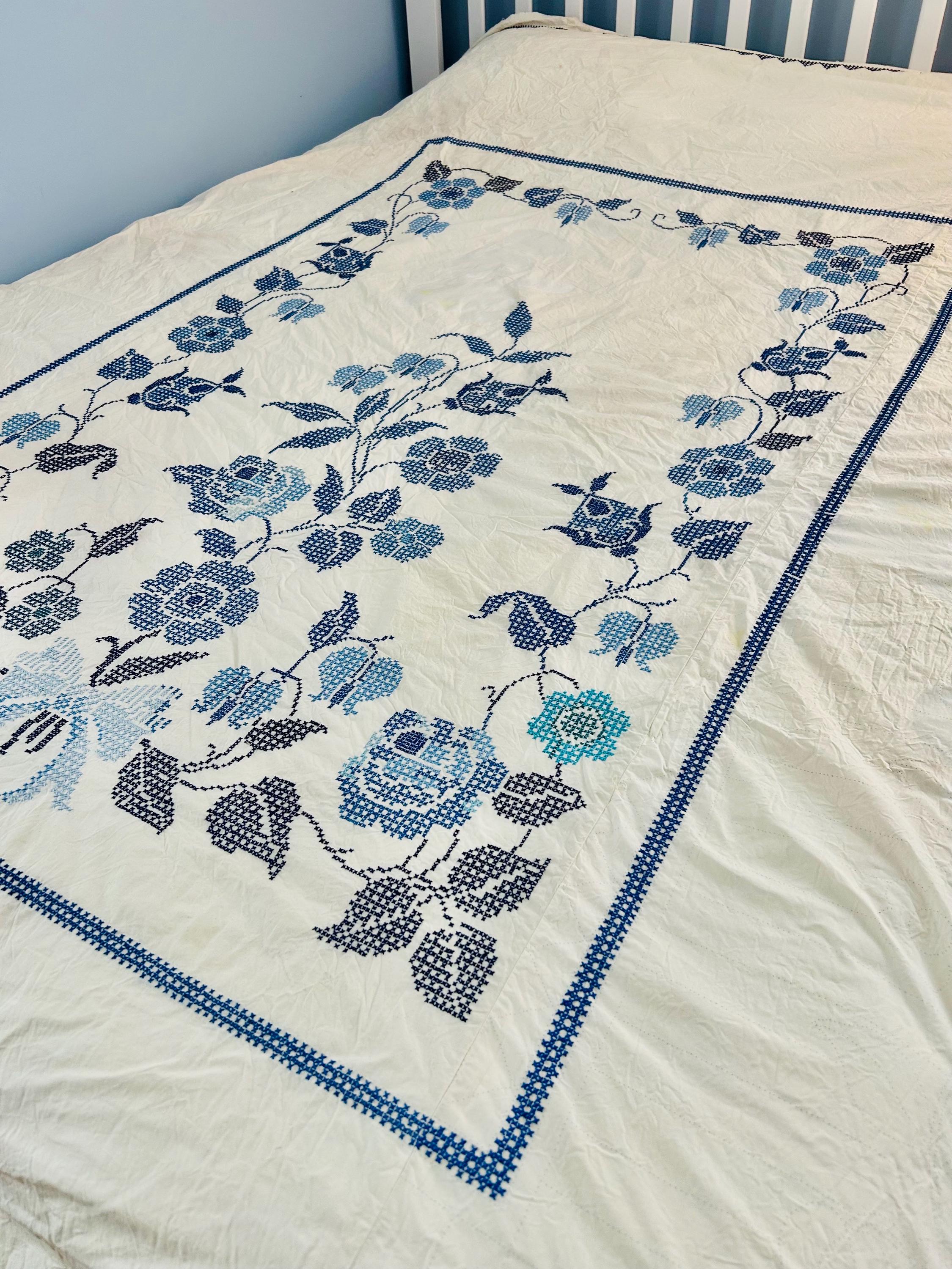 This is a vintage quilt top only, beautifully hand cross-stitched in the 1940s, and has never been quilted or finished. It features an elegant all-over floral vine design worked entirely in shades of blue on a creamy white cotton ground, with a framed border that has also been cross-stitched.