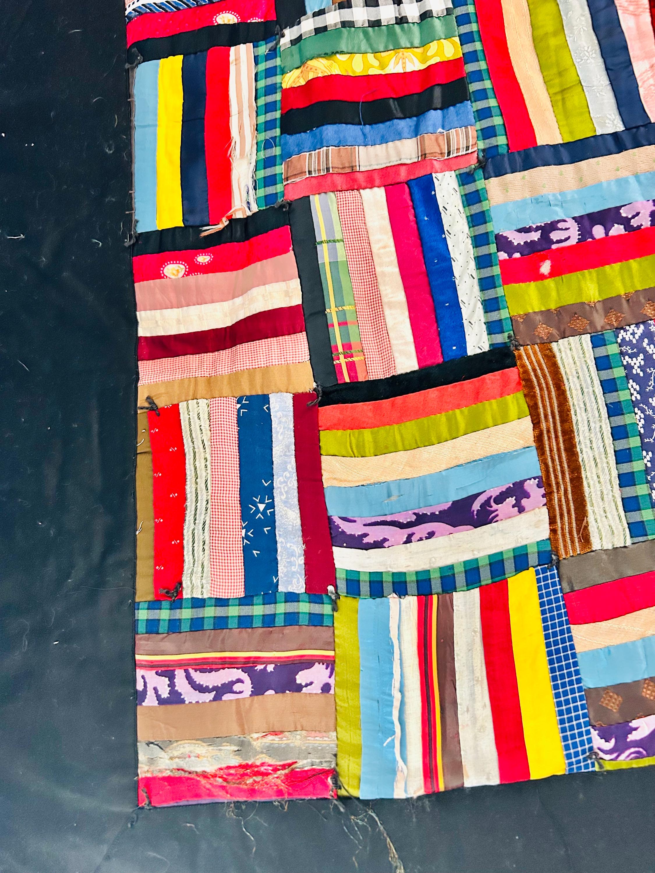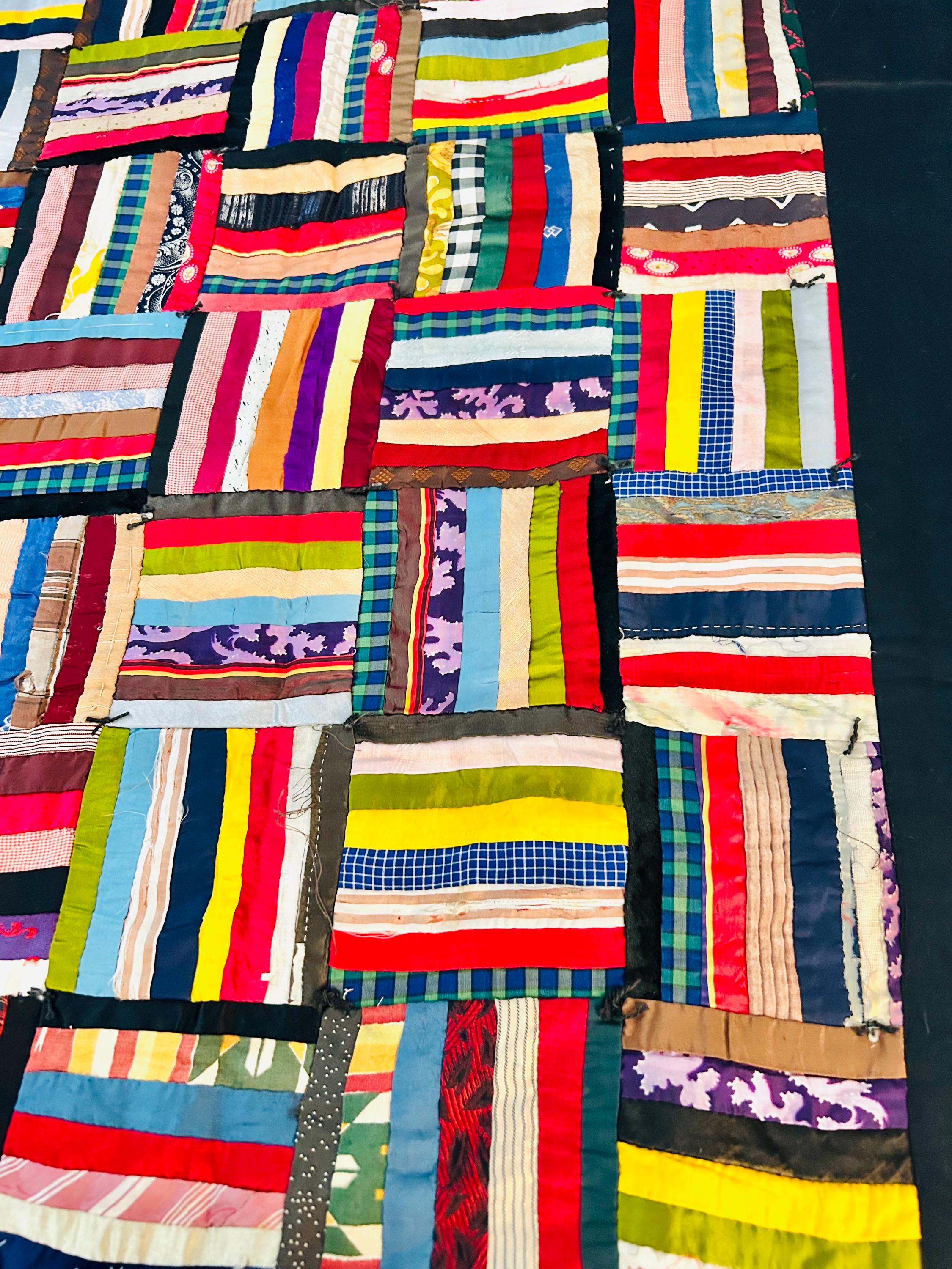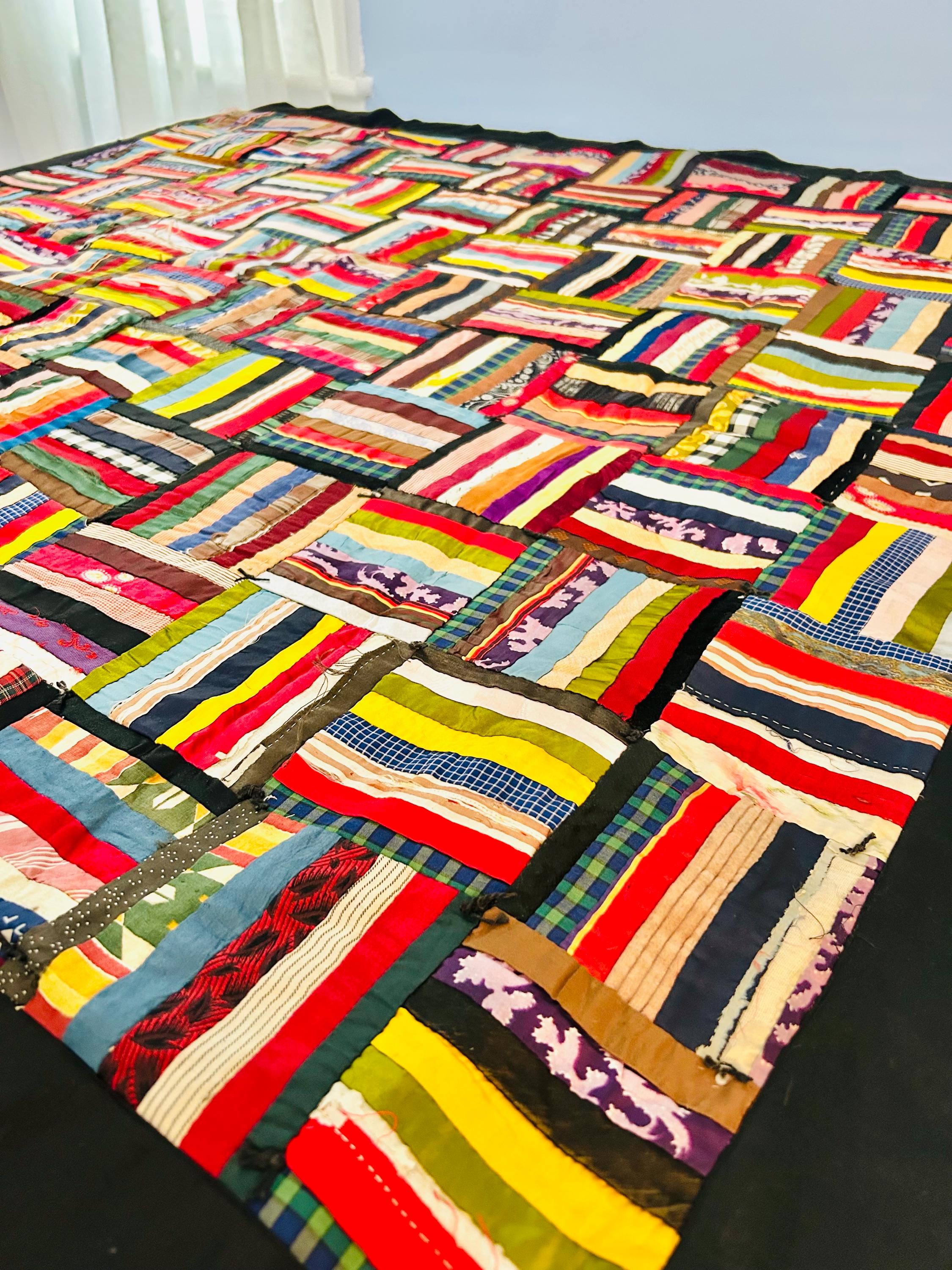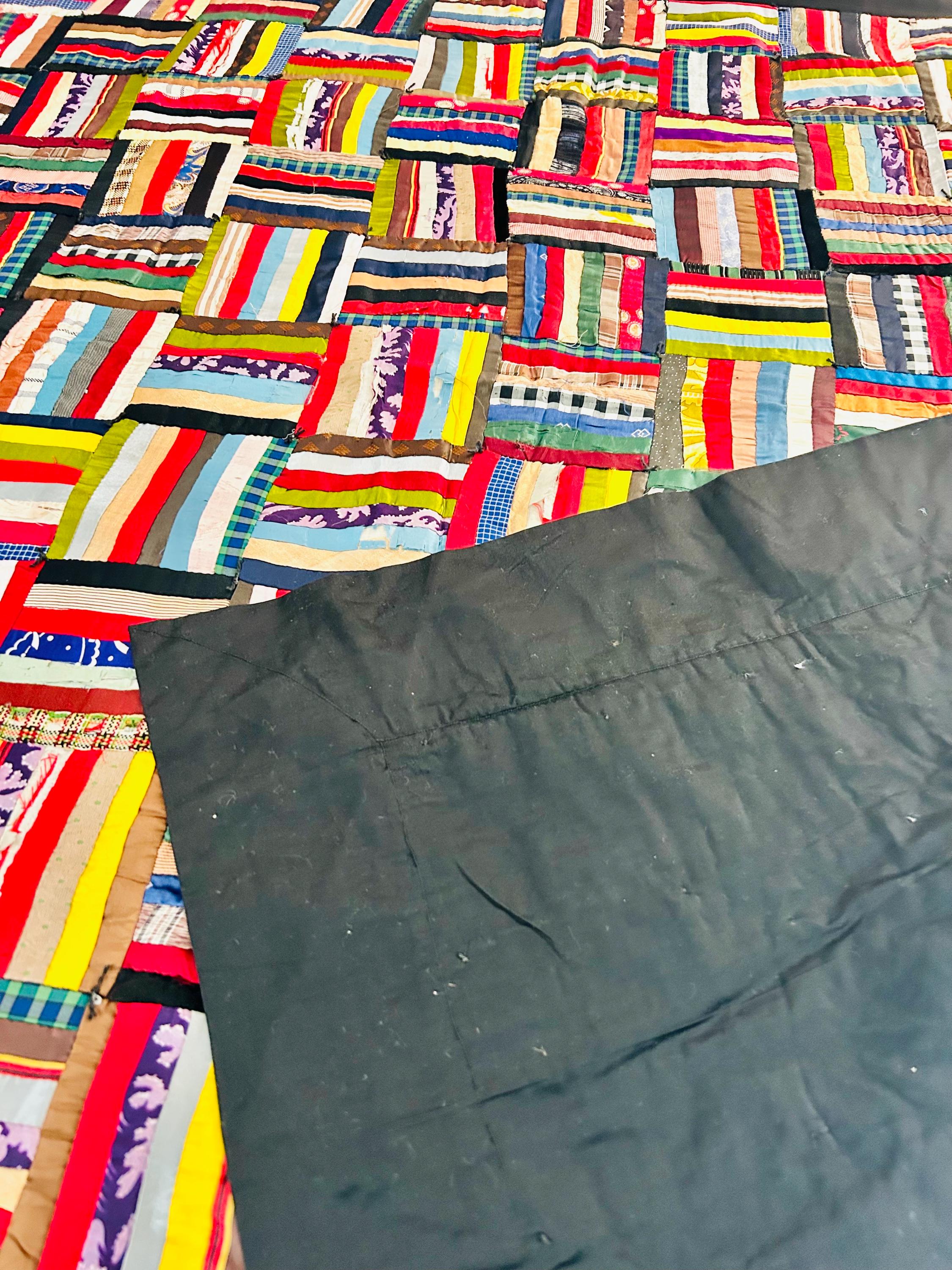 The design consists of strip-pieced blocks in cottons and silks arranged in a staggered layout, creating a lively, almost modernist rhythm. The strong black backing and border beautifully frame the vibrant fabrics. The fabrics include: • Brilliant aniline reds • Chrome yellows • Early synthetic greens • Plaids, ginghams, shirtings, and dress prints • Deep purples and indigos • Textural woven dress goods