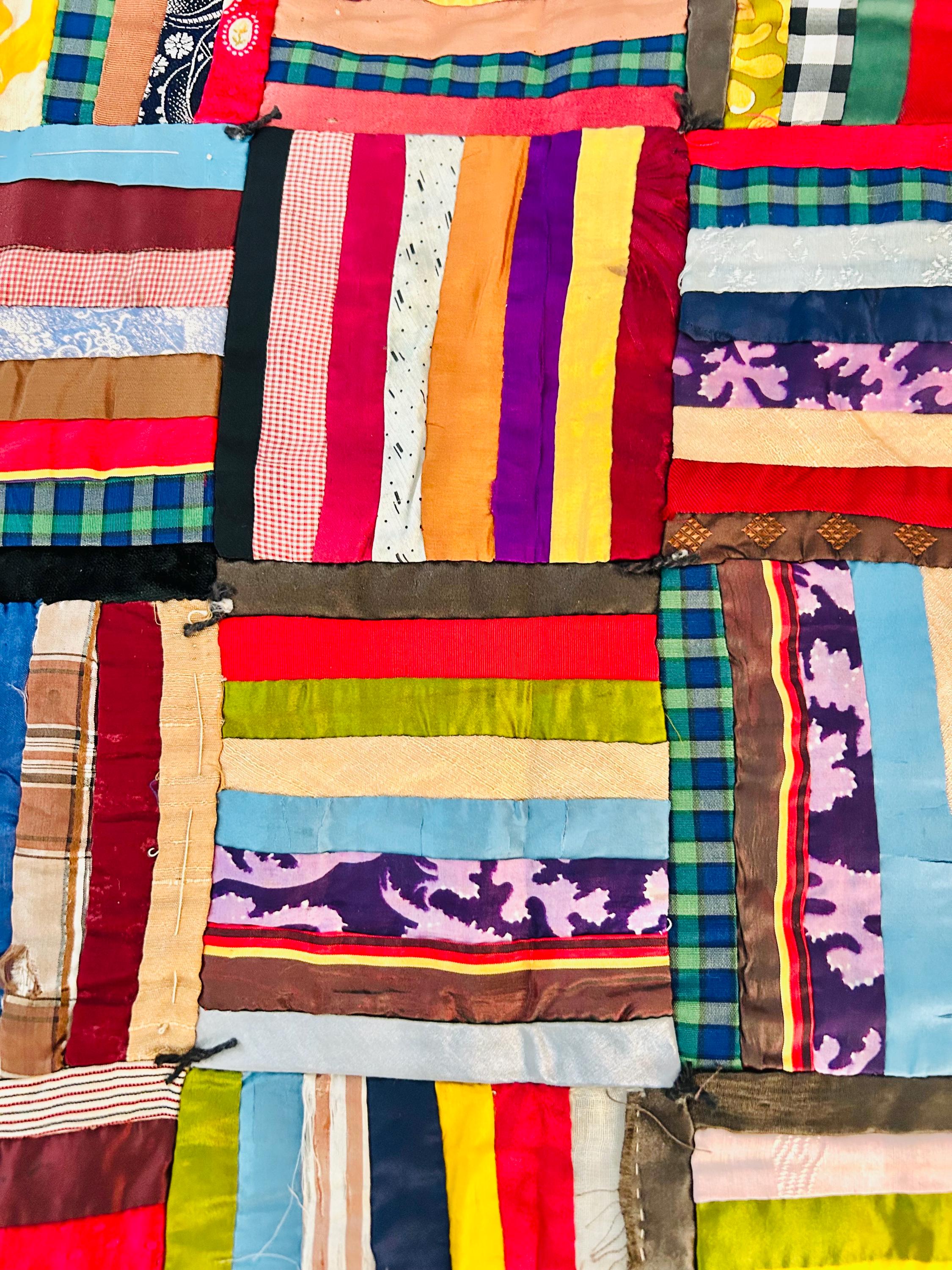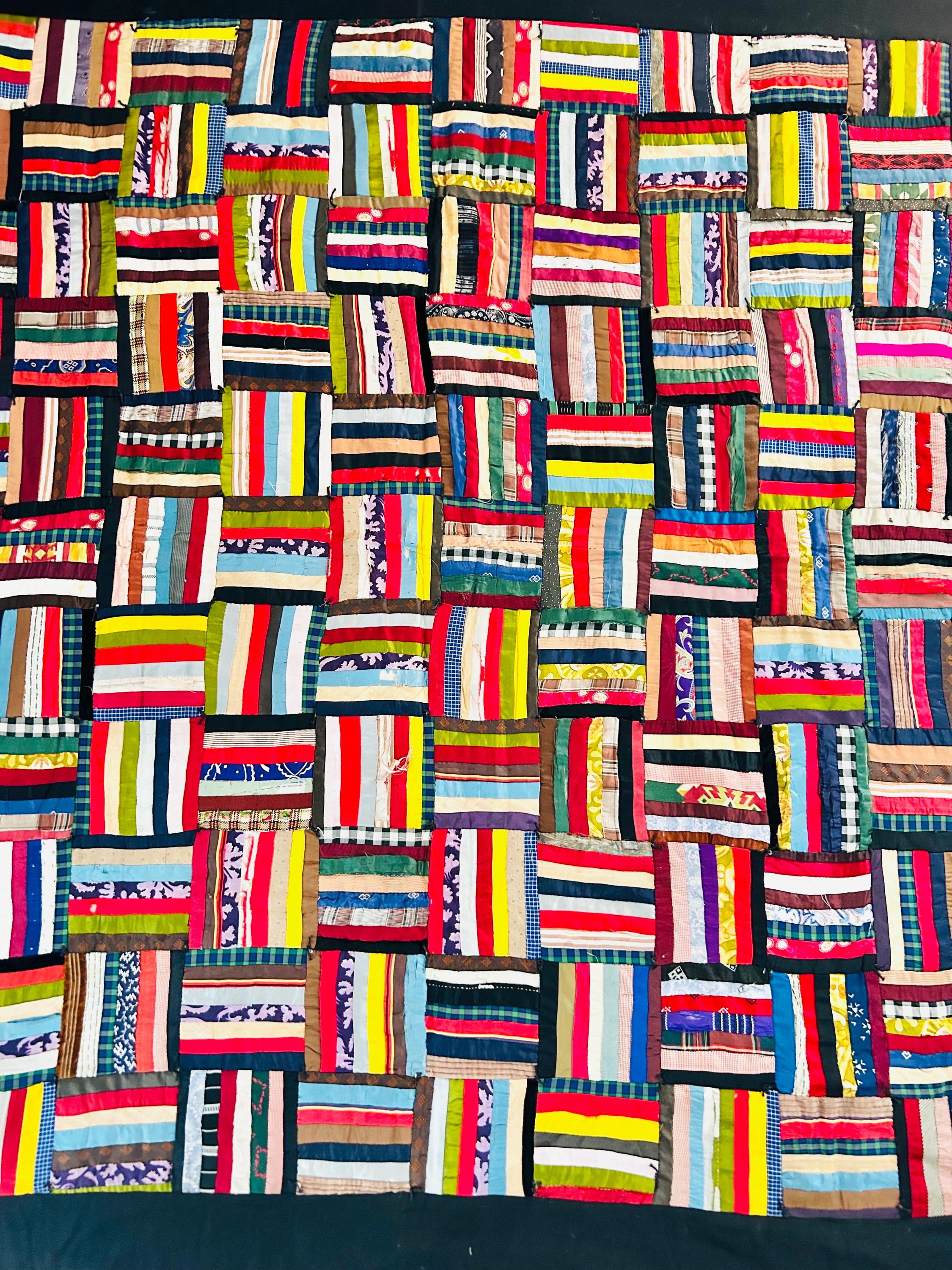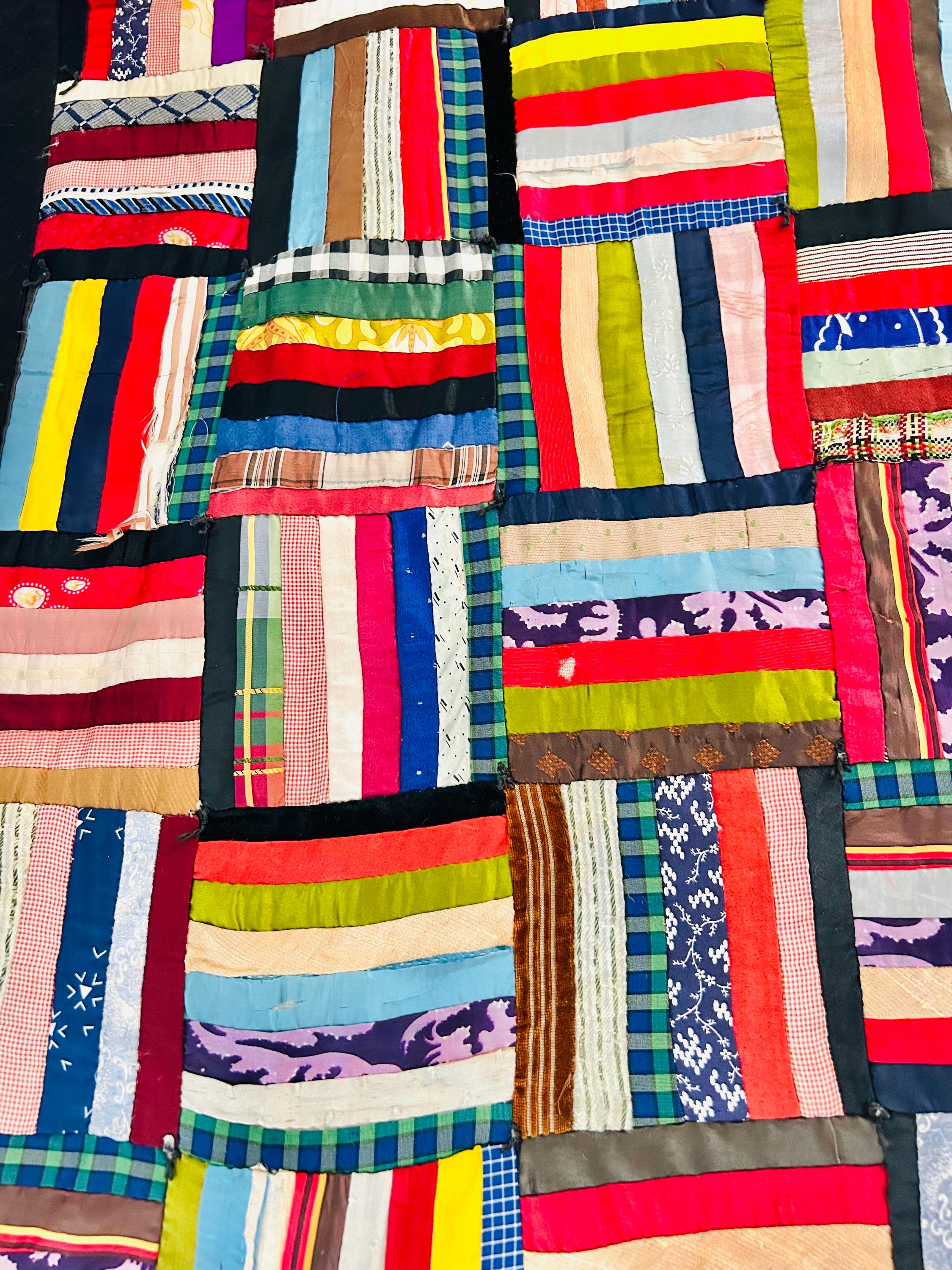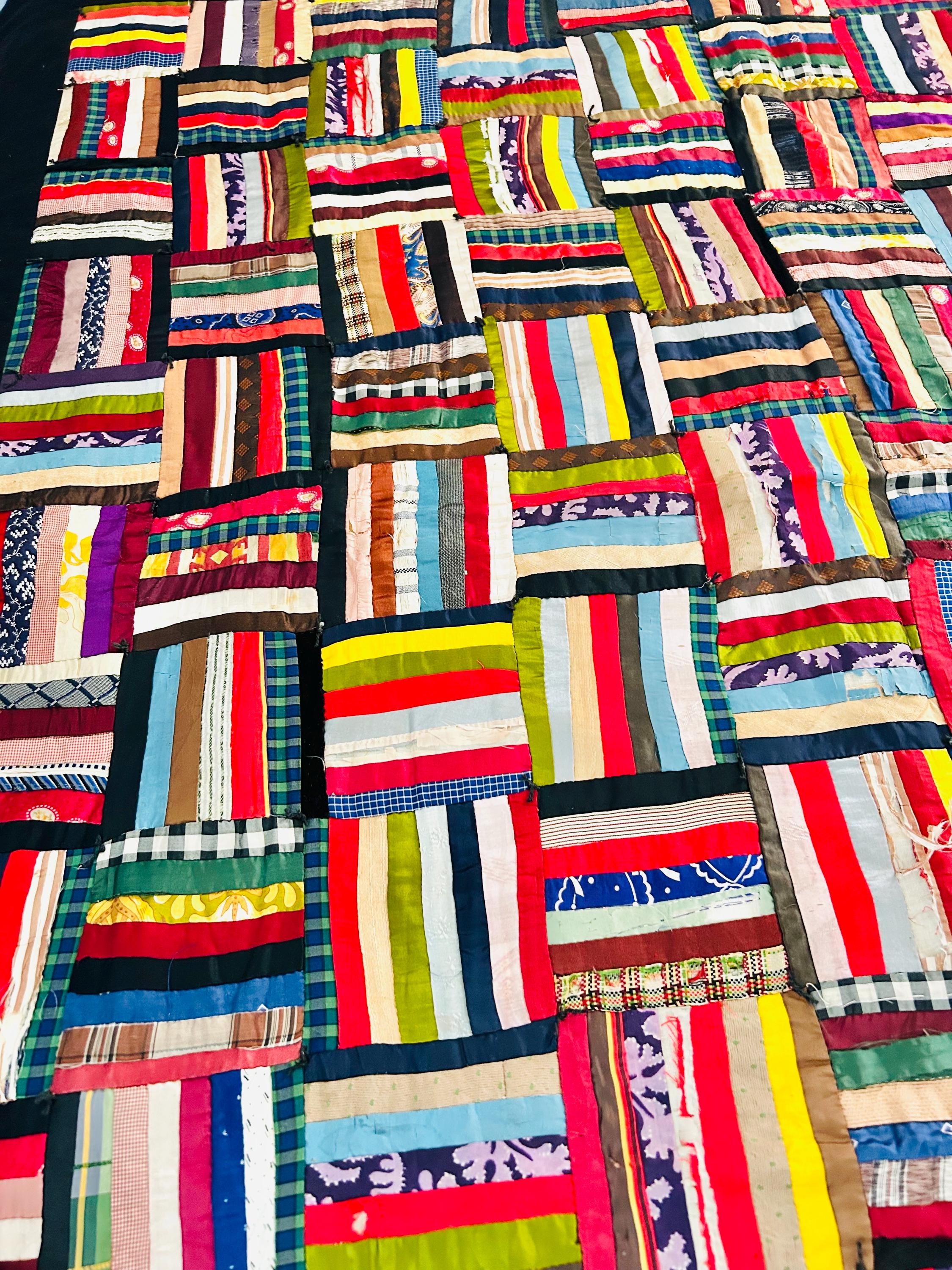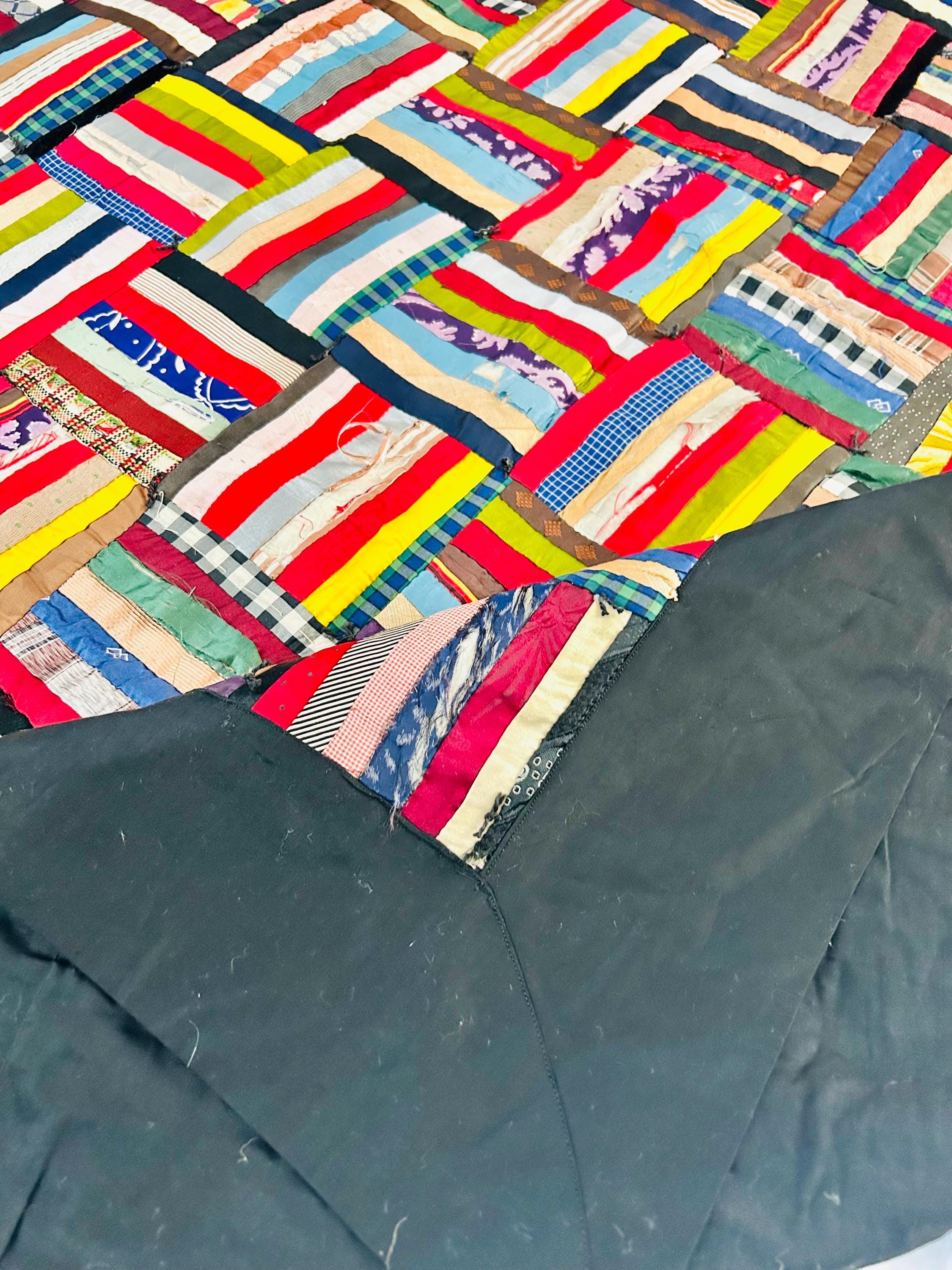 The design consists of strip-pieced blocks in cottons and silks arranged in a staggered layout, creating a lively, almost modernist rhythm. The strong black backing and border beautifully frame the vibrant fabrics. The fabrics include: • Brilliant aniline reds • Chrome yellows • Early synthetic greens • Plaids, ginghams, shirtings, and dress prints • Deep purples and indigos • Textural woven dress goods