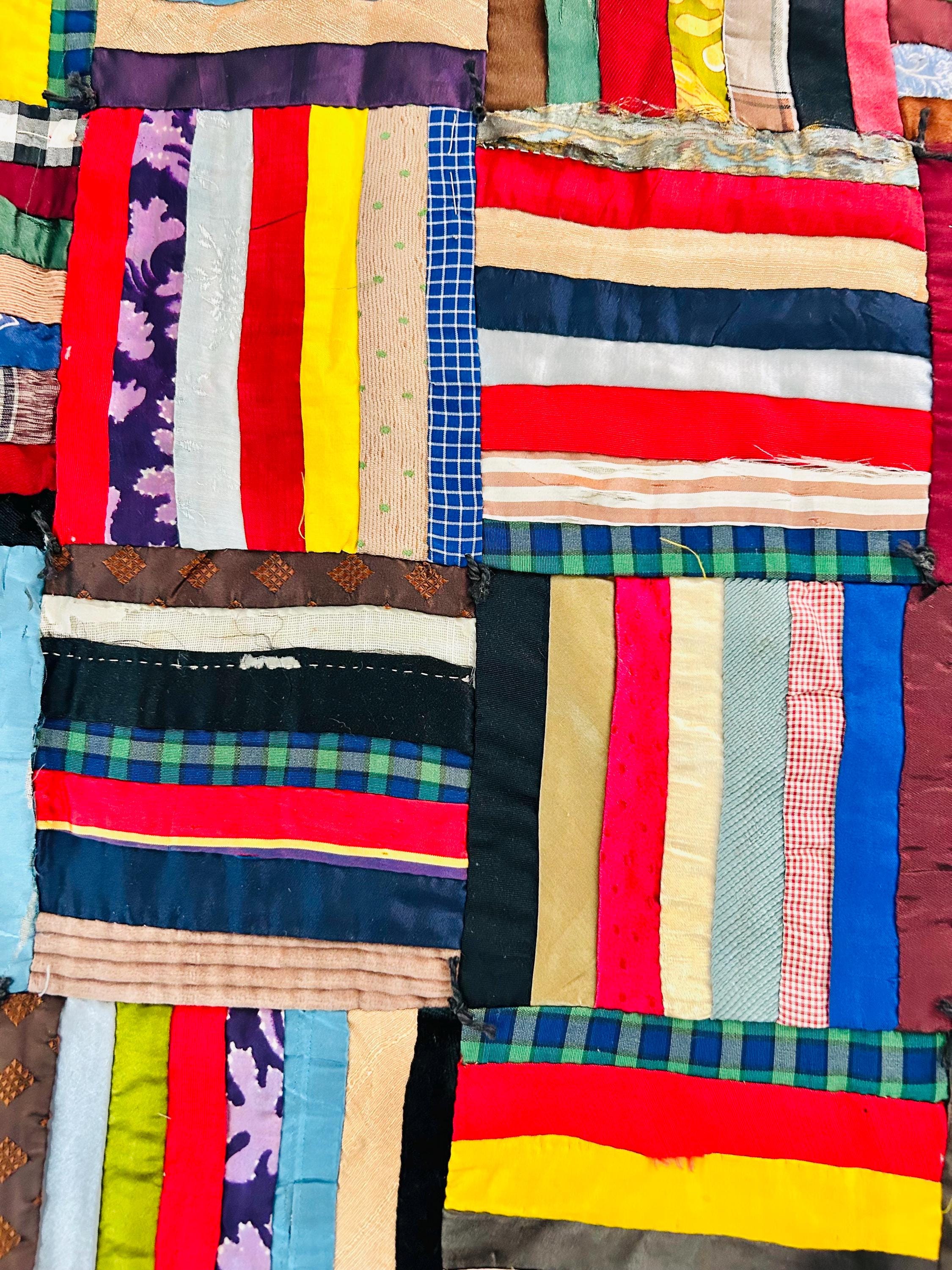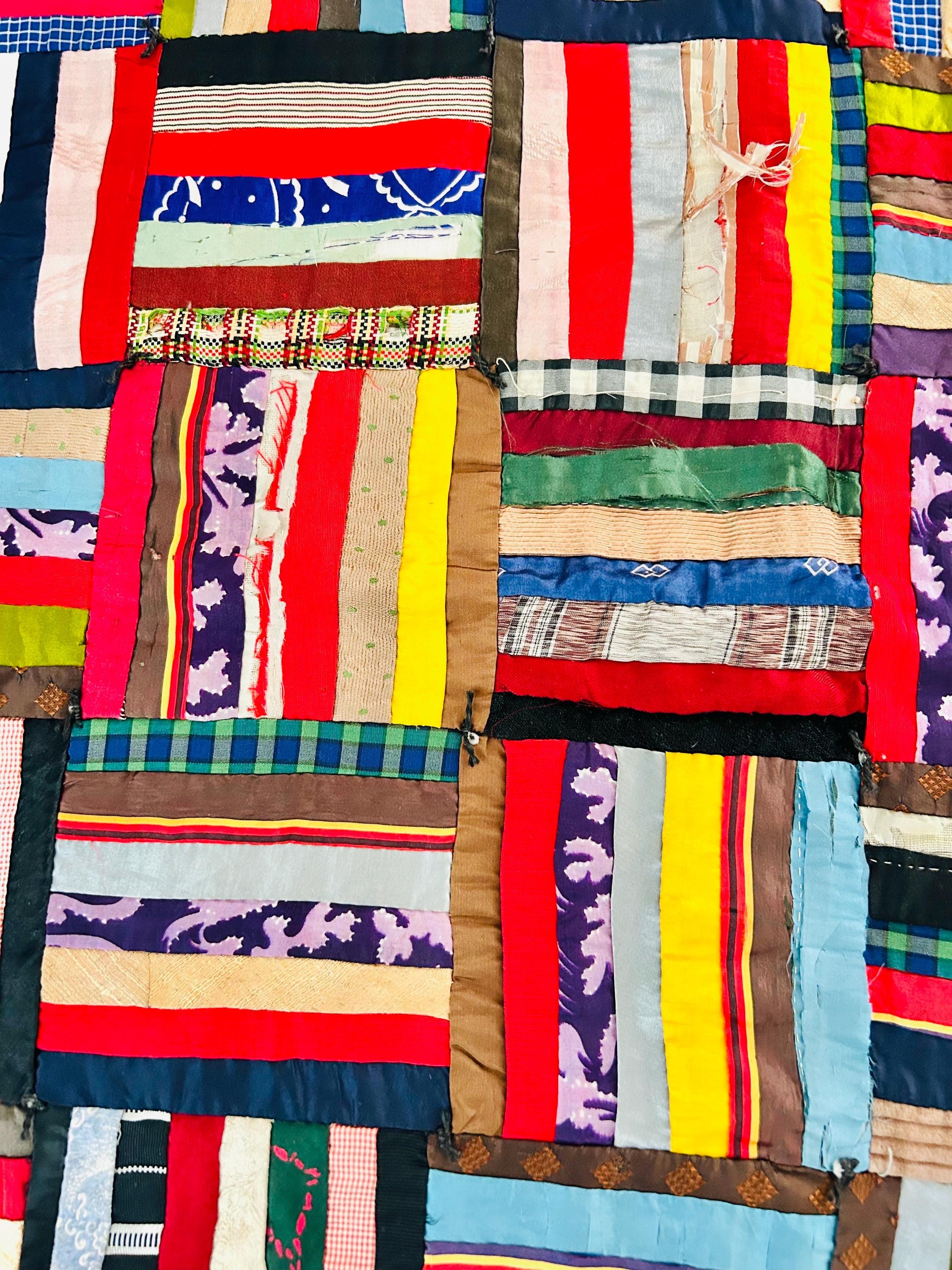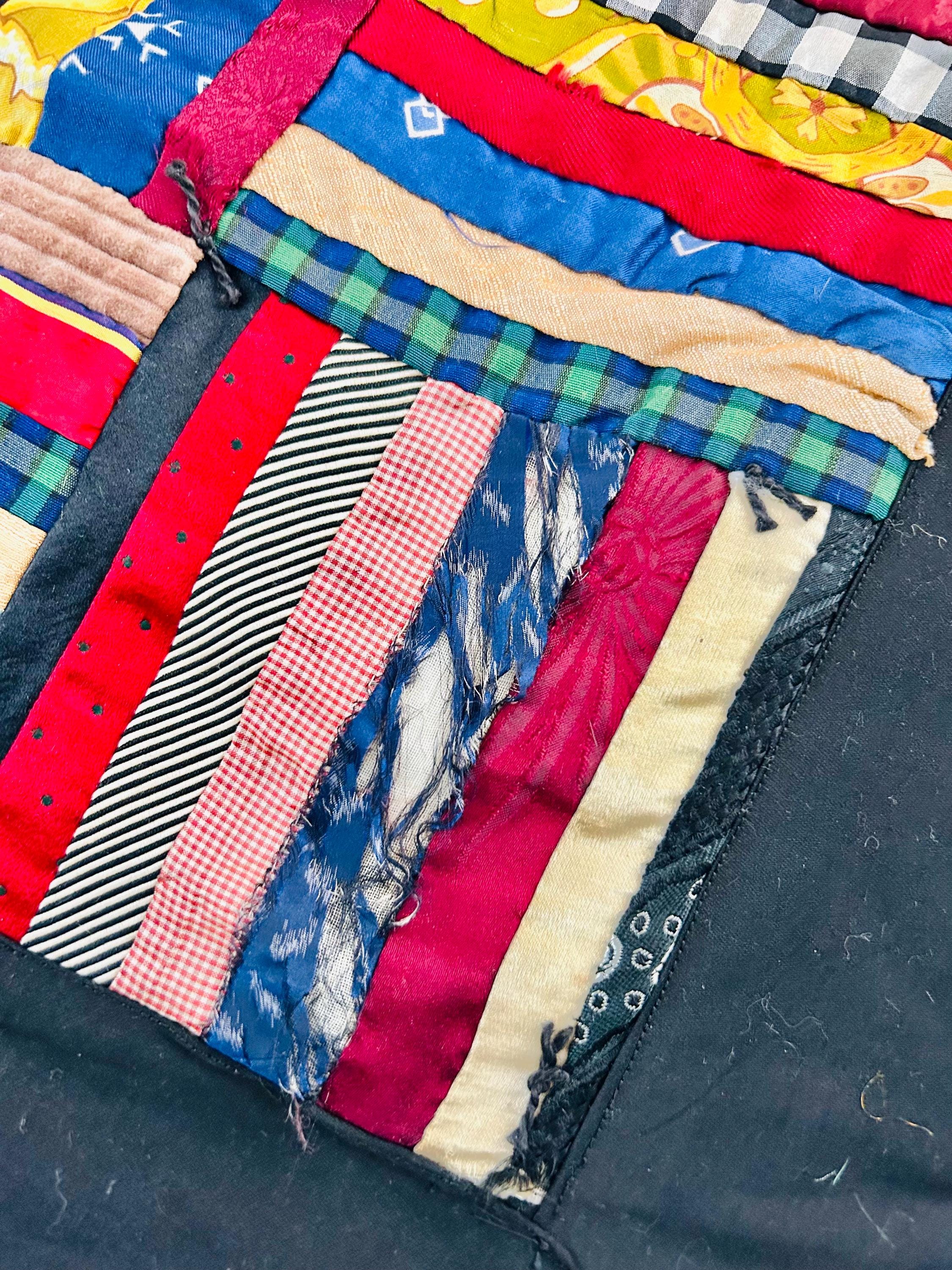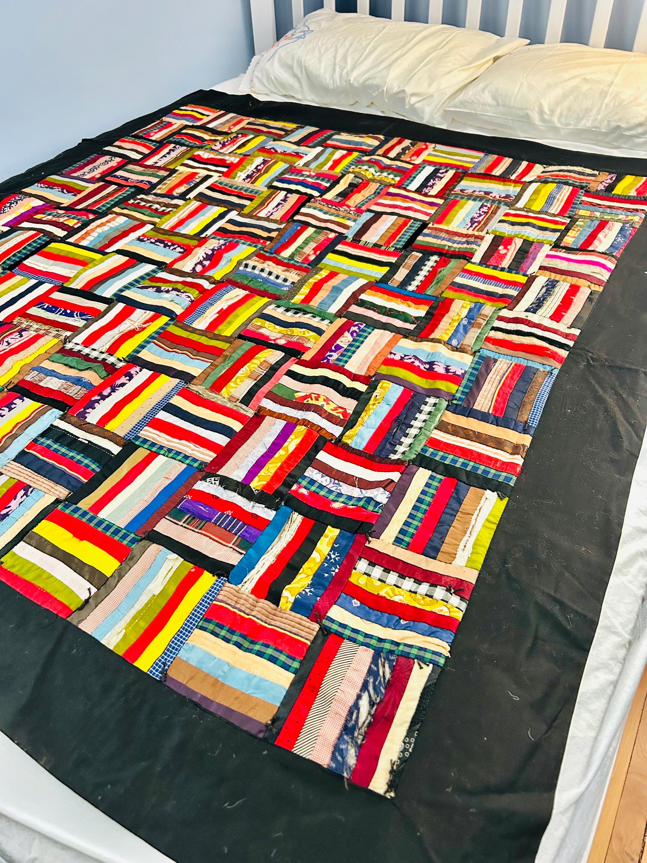 The design consists of strip-pieced blocks in cottons and silks arranged in a staggered layout, creating a lively, almost modernist rhythm. The strong black backing and border beautifully frame the vibrant fabrics. The fabrics include: • Brilliant aniline reds • Chrome yellows • Early synthetic greens • Plaids, ginghams, shirtings, and dress prints • Deep purples and indigos • Textural woven dress goods