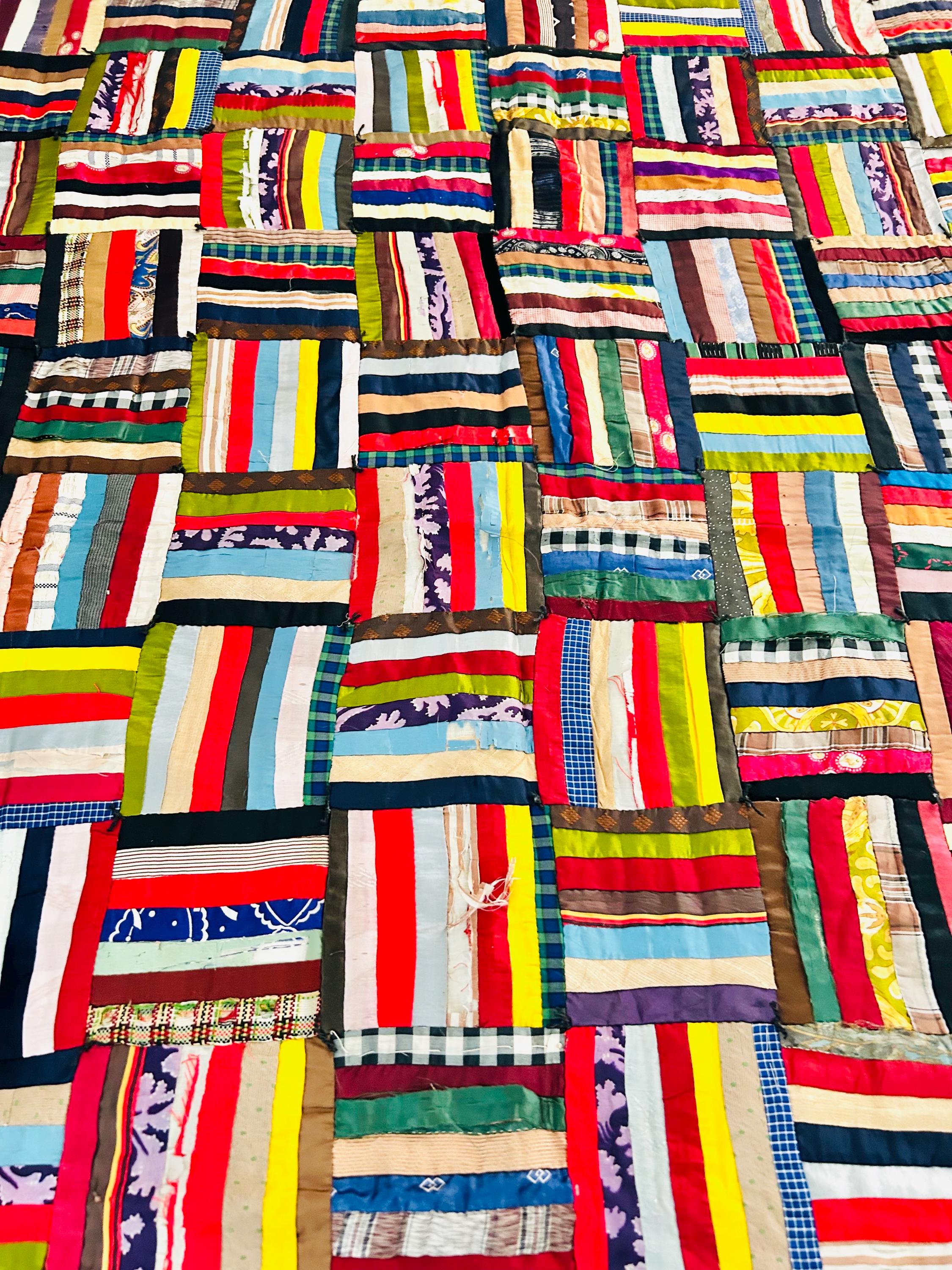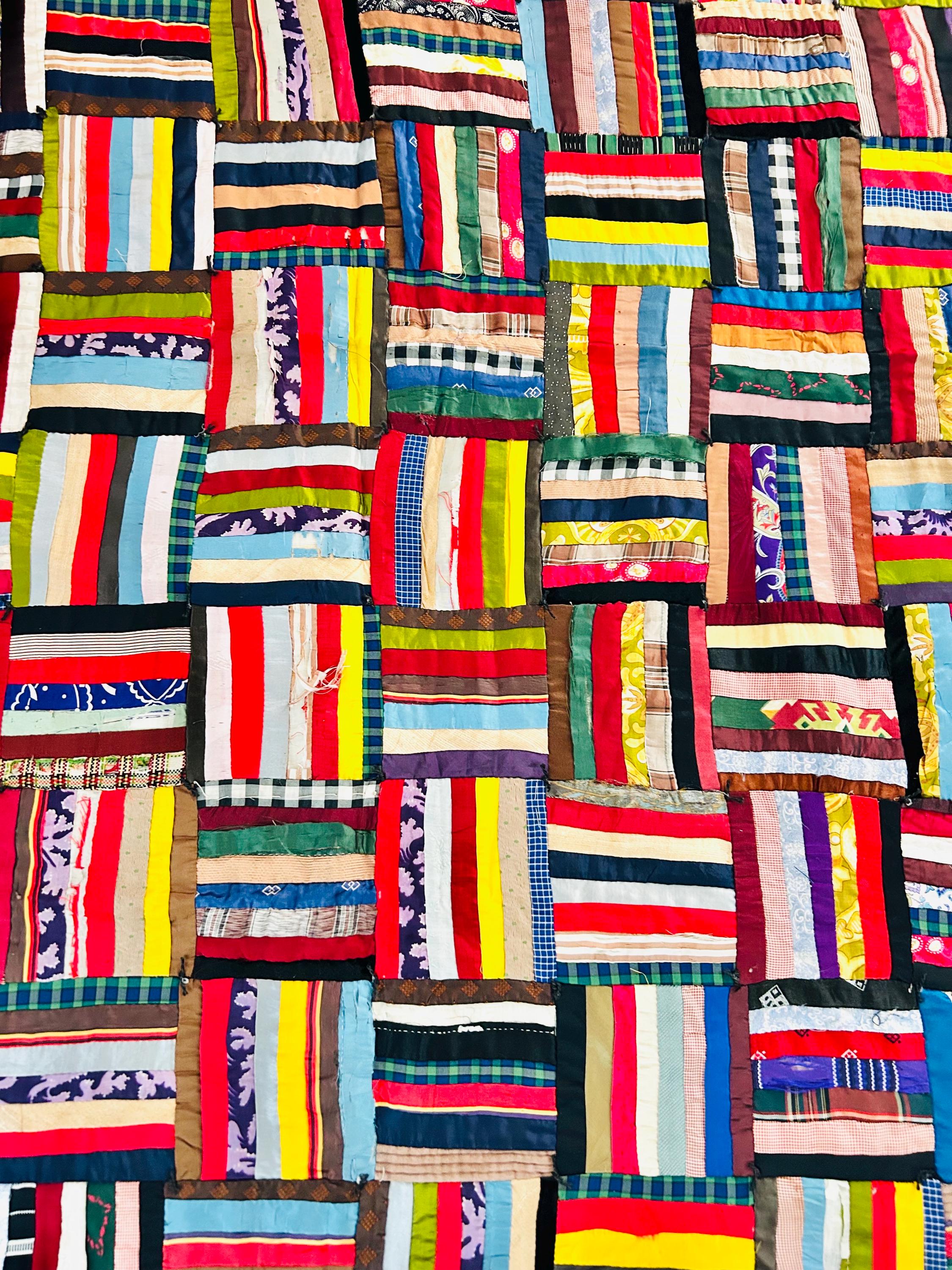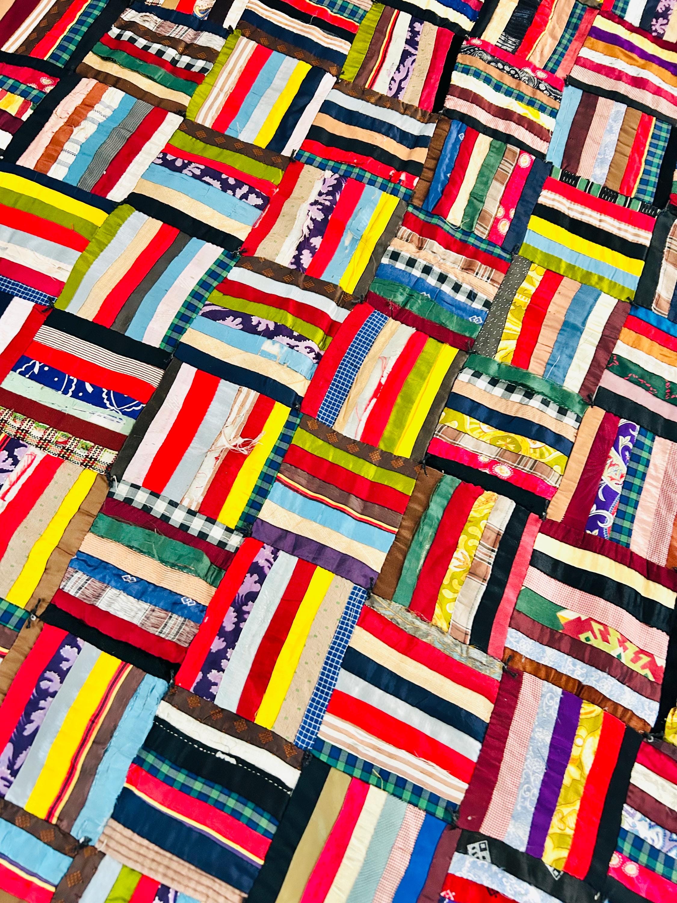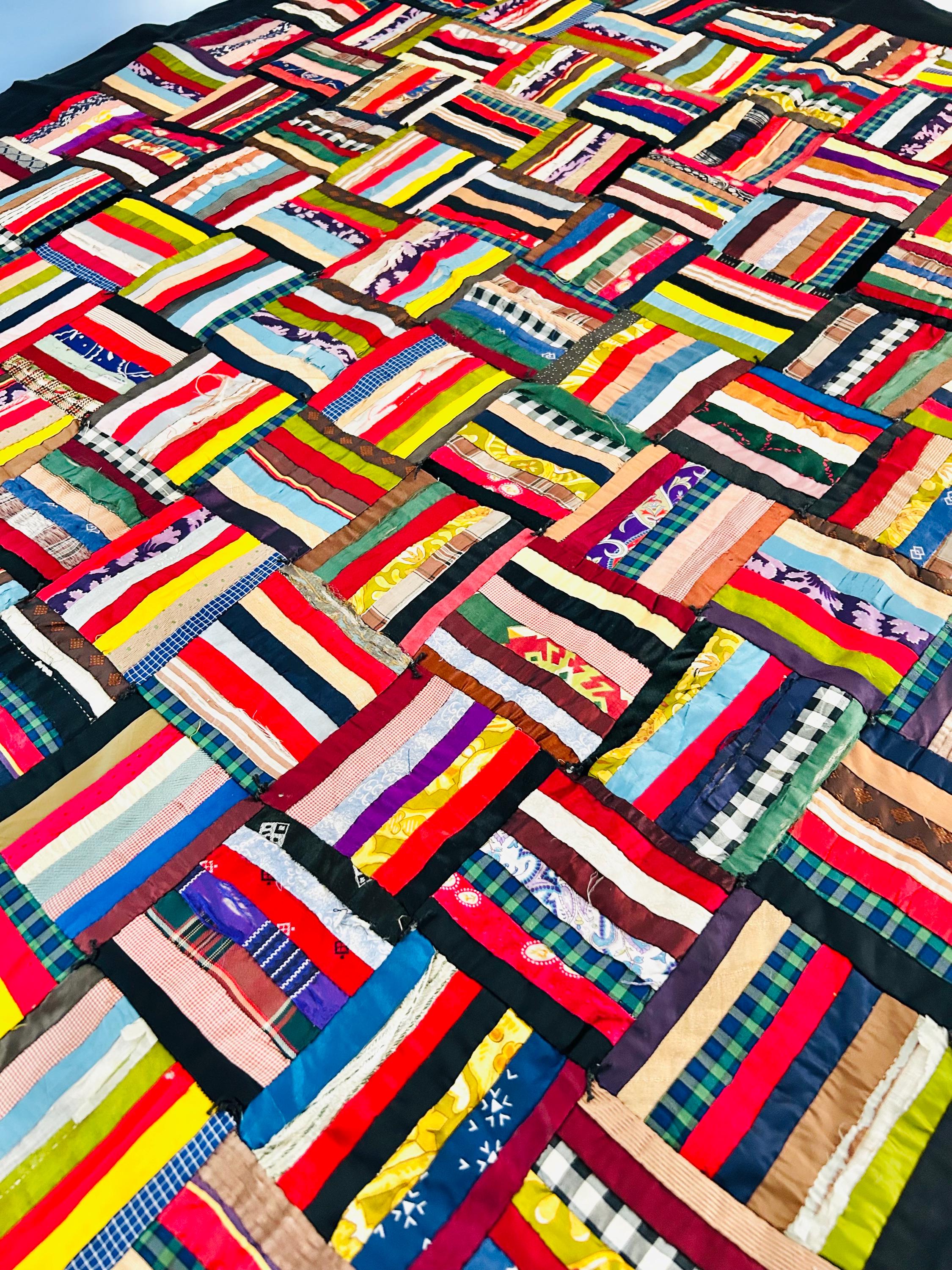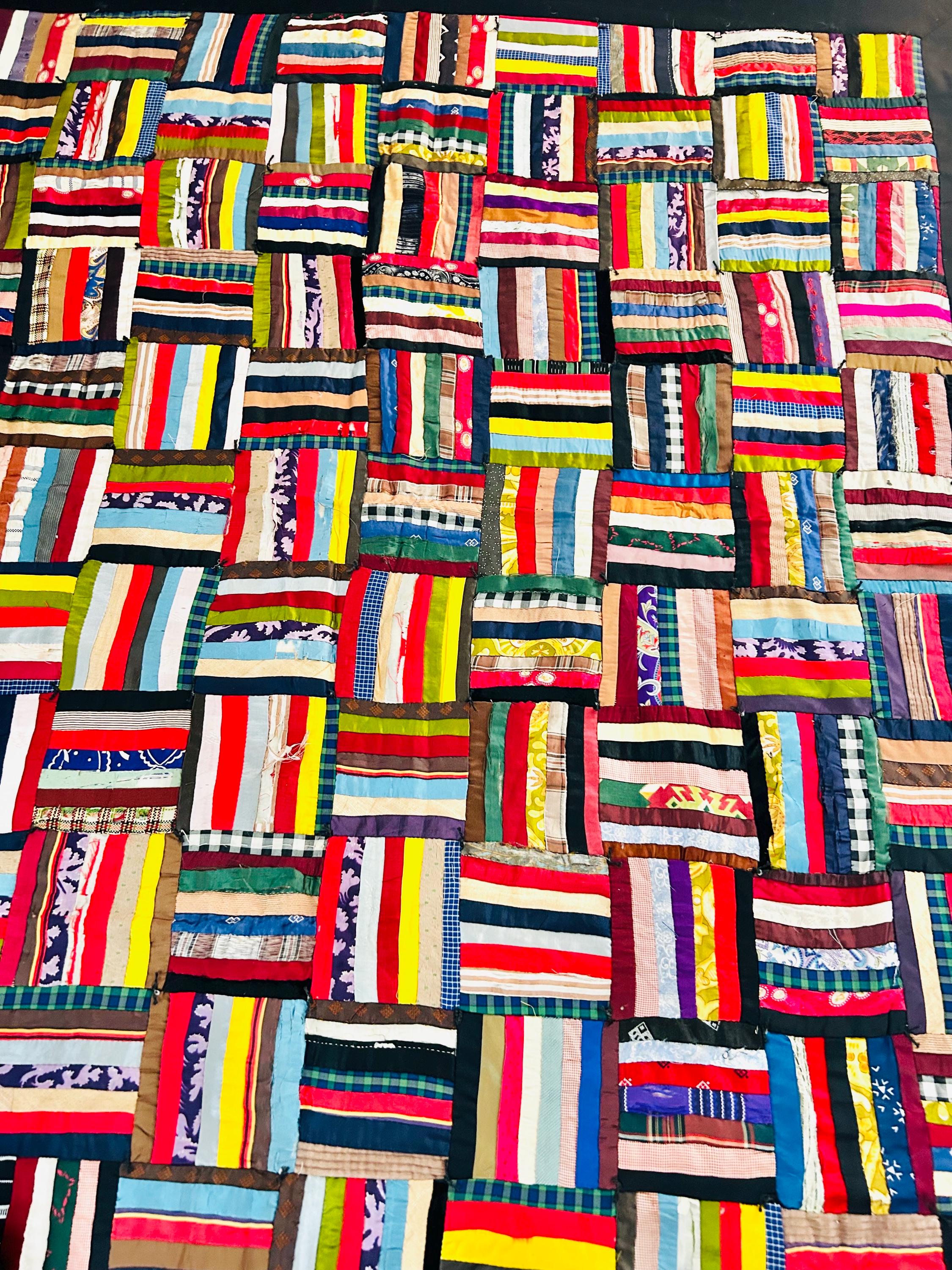 The design consists of strip-pieced blocks in cottons and silks arranged in a staggered layout, creating a lively, almost modernist rhythm. The strong black backing and border beautifully frame the vibrant fabrics. The fabrics include: • Brilliant aniline reds • Chrome yellows • Early synthetic greens • Plaids, ginghams, shirtings, and dress prints • Deep purples and indigos • Textural woven dress goods