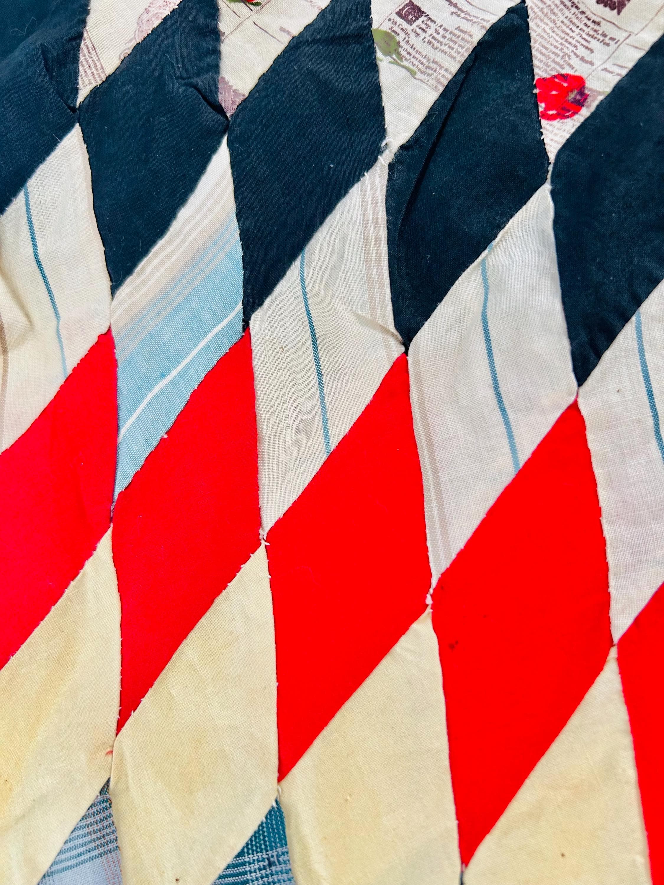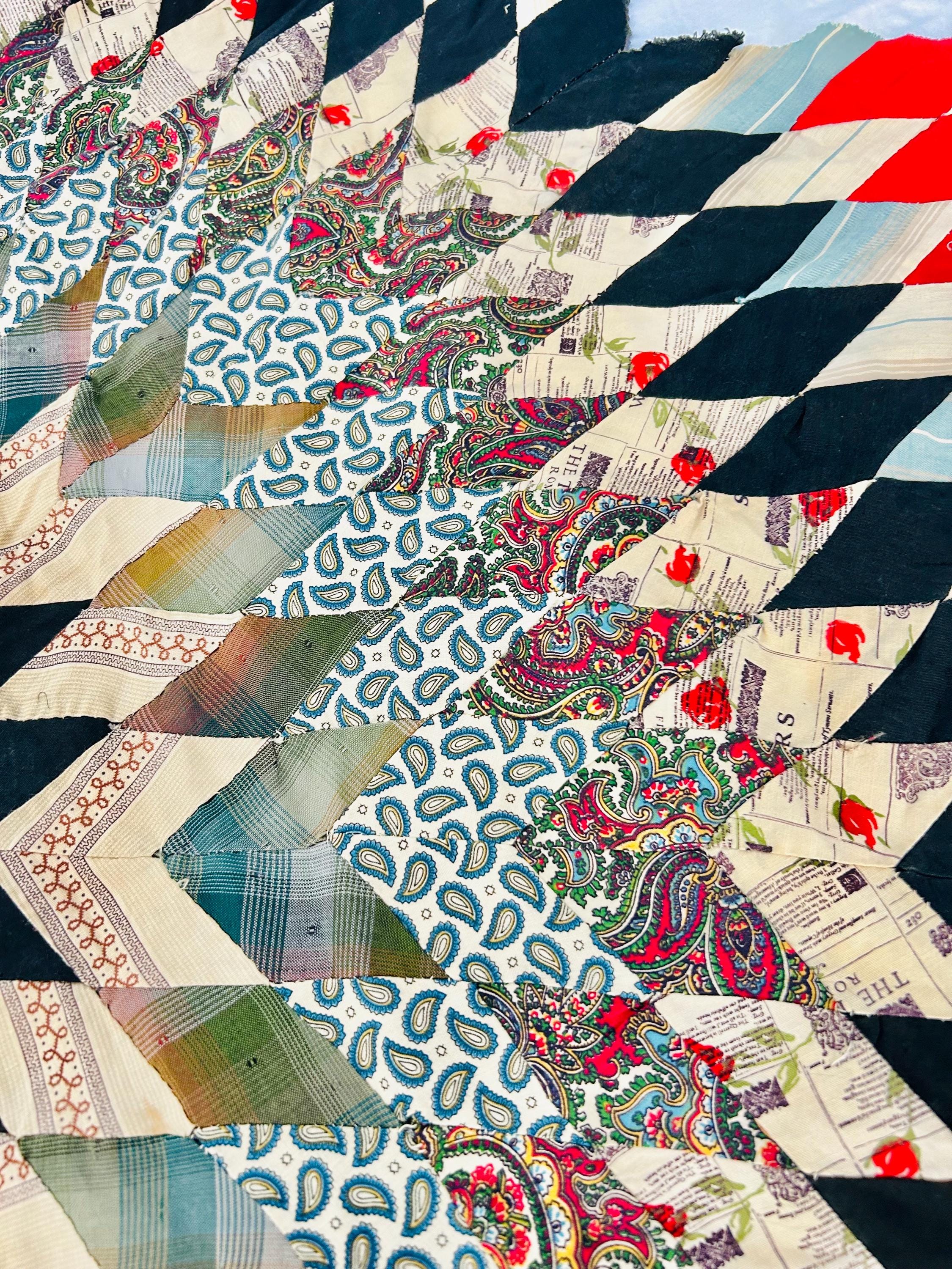 Fabrics Featured: • Bright 1930s chrome red solids • Turquoise and blue Depression florals • Paisley prints in vivid teal, green, and red • Novelty newspaper print fabric • Plaids and shirtings in soft greens, blues, and tans • Cream prints with small red floral sprigs • Deep navy cottons forming the inner star