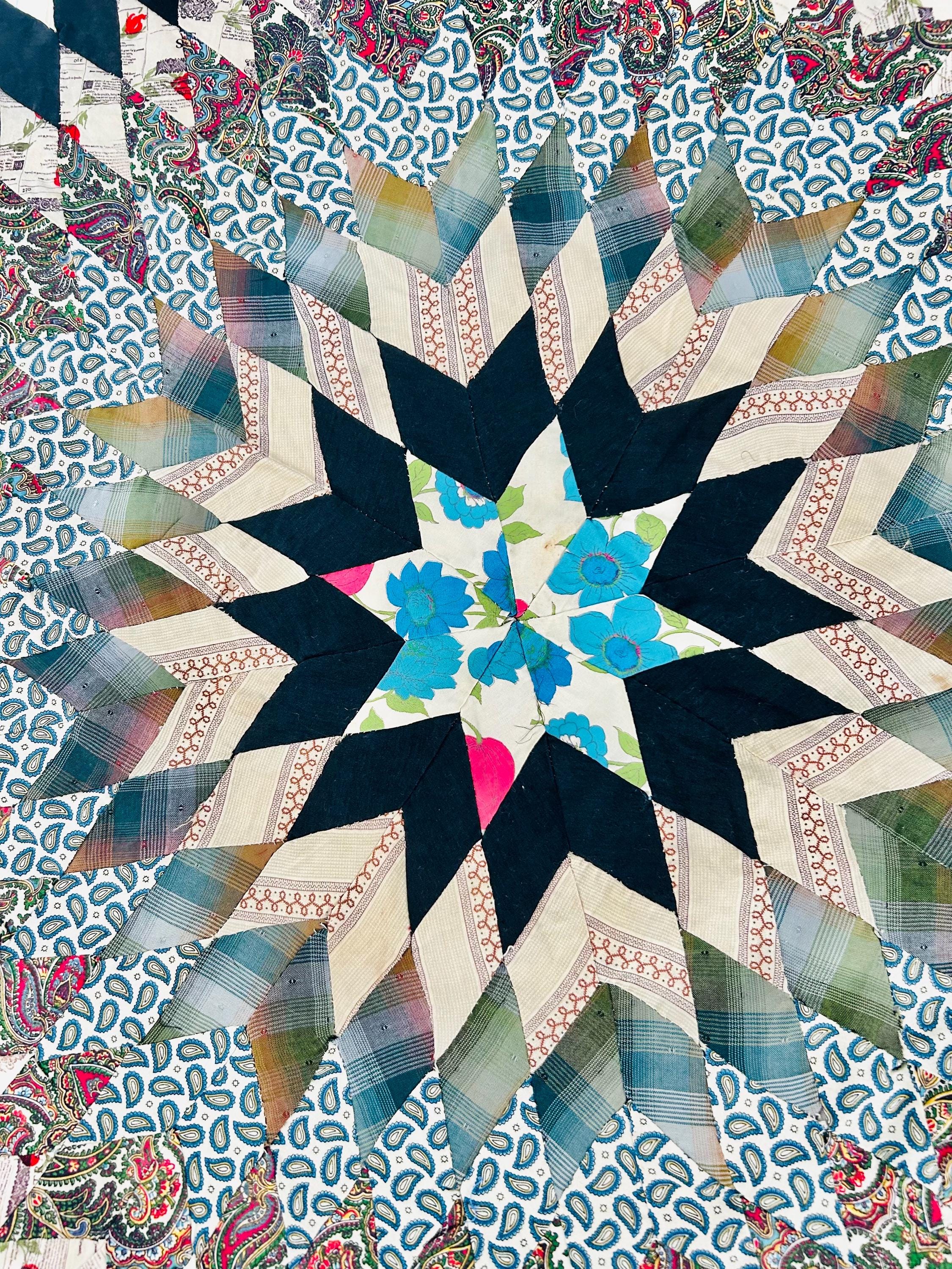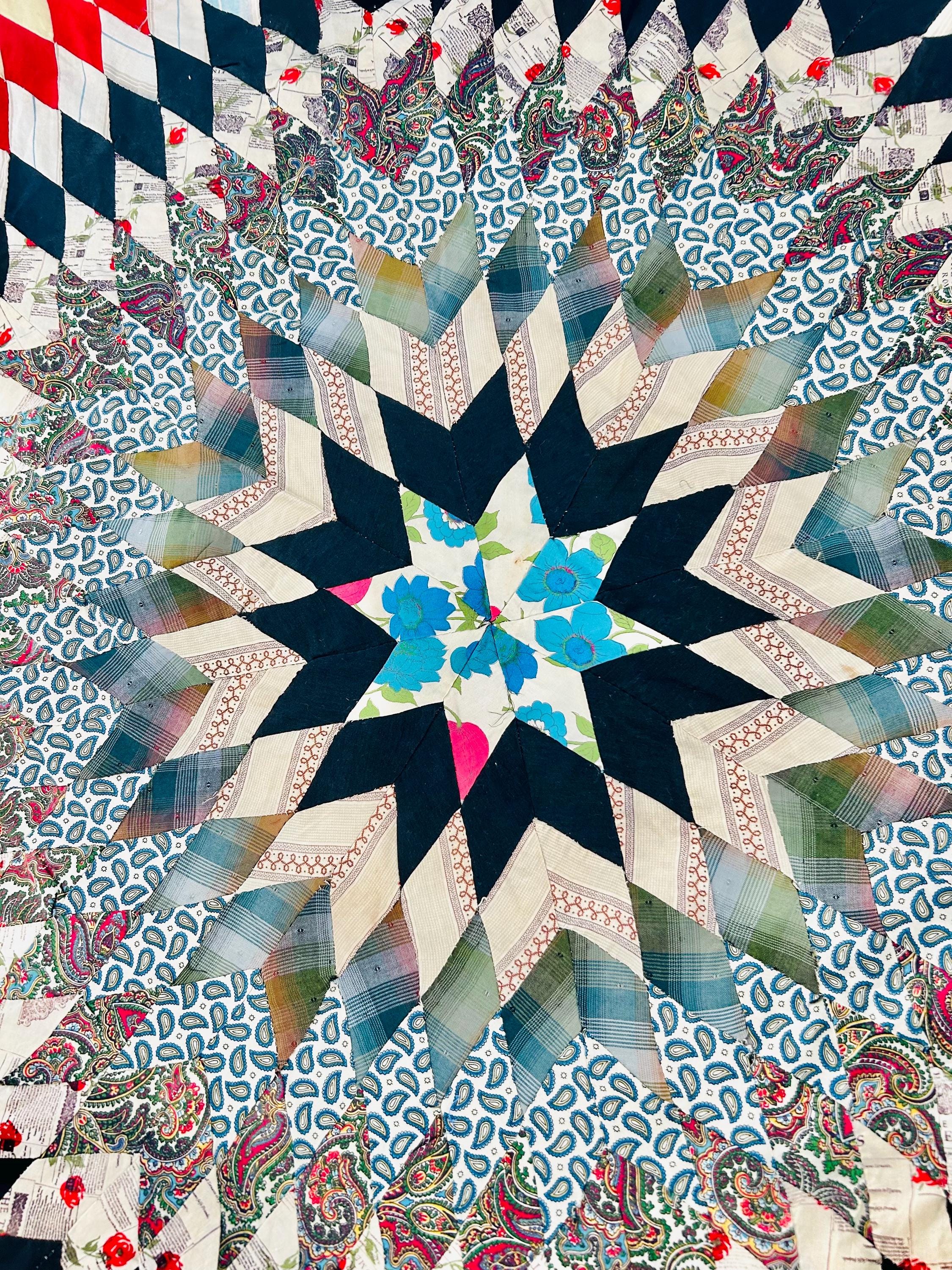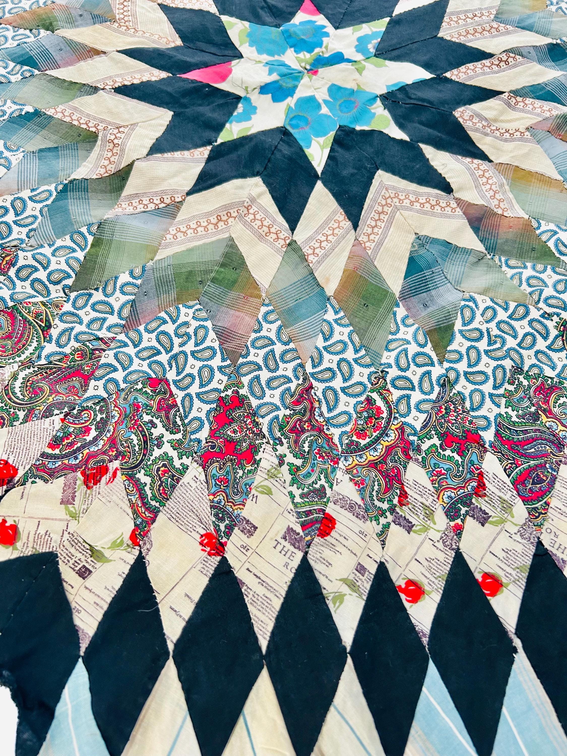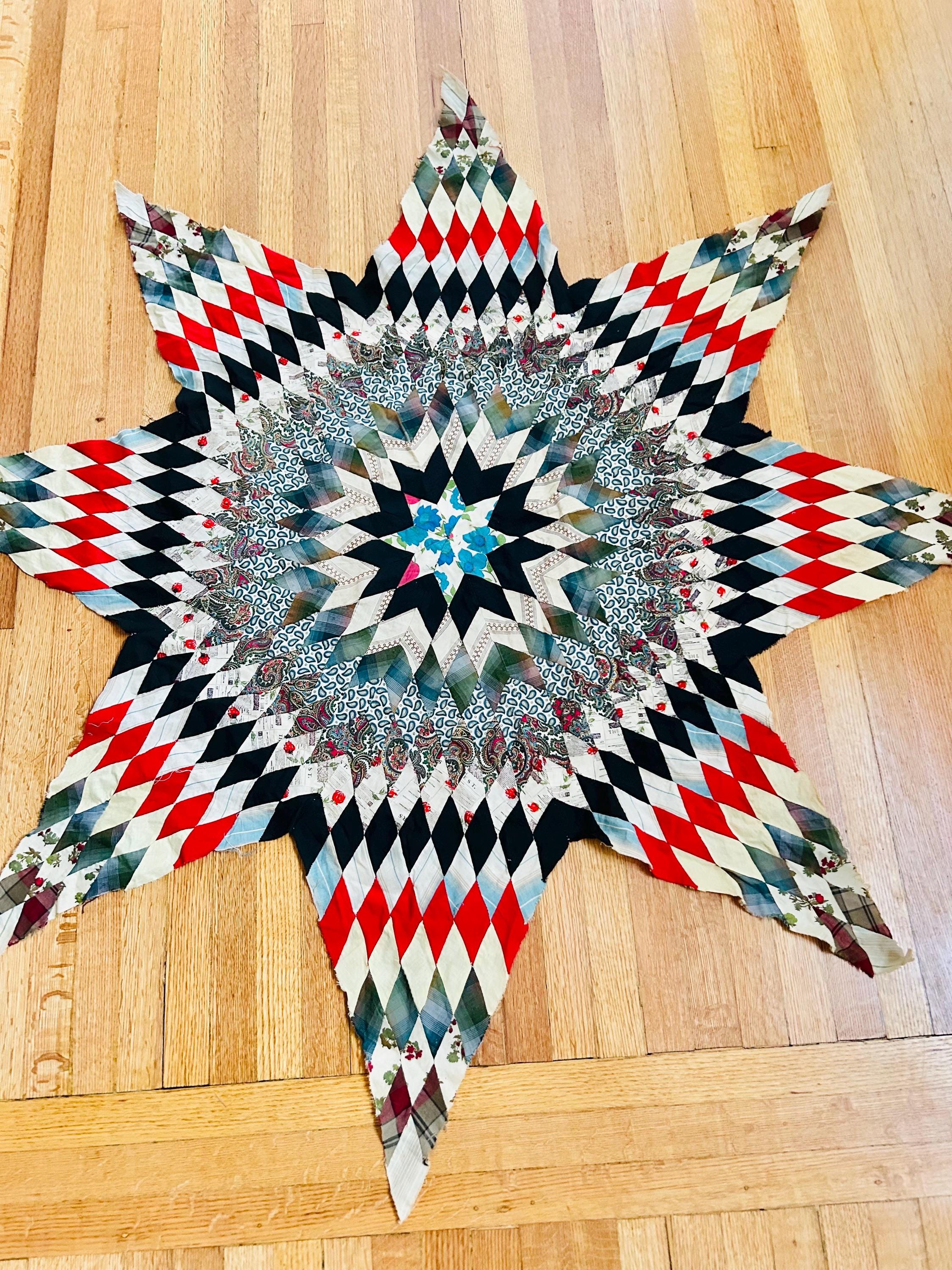 This striking hand-pieced Lone Star quilt top dates to approximately 1925–1935 and showcases a dramatic eight-point star in a rich array of Depression-era fabrics. The piece is a partial quilt top only and was never completed. It retains its irregular star-point edges and needs to be squared with borders or incorporated into a larger quilt.