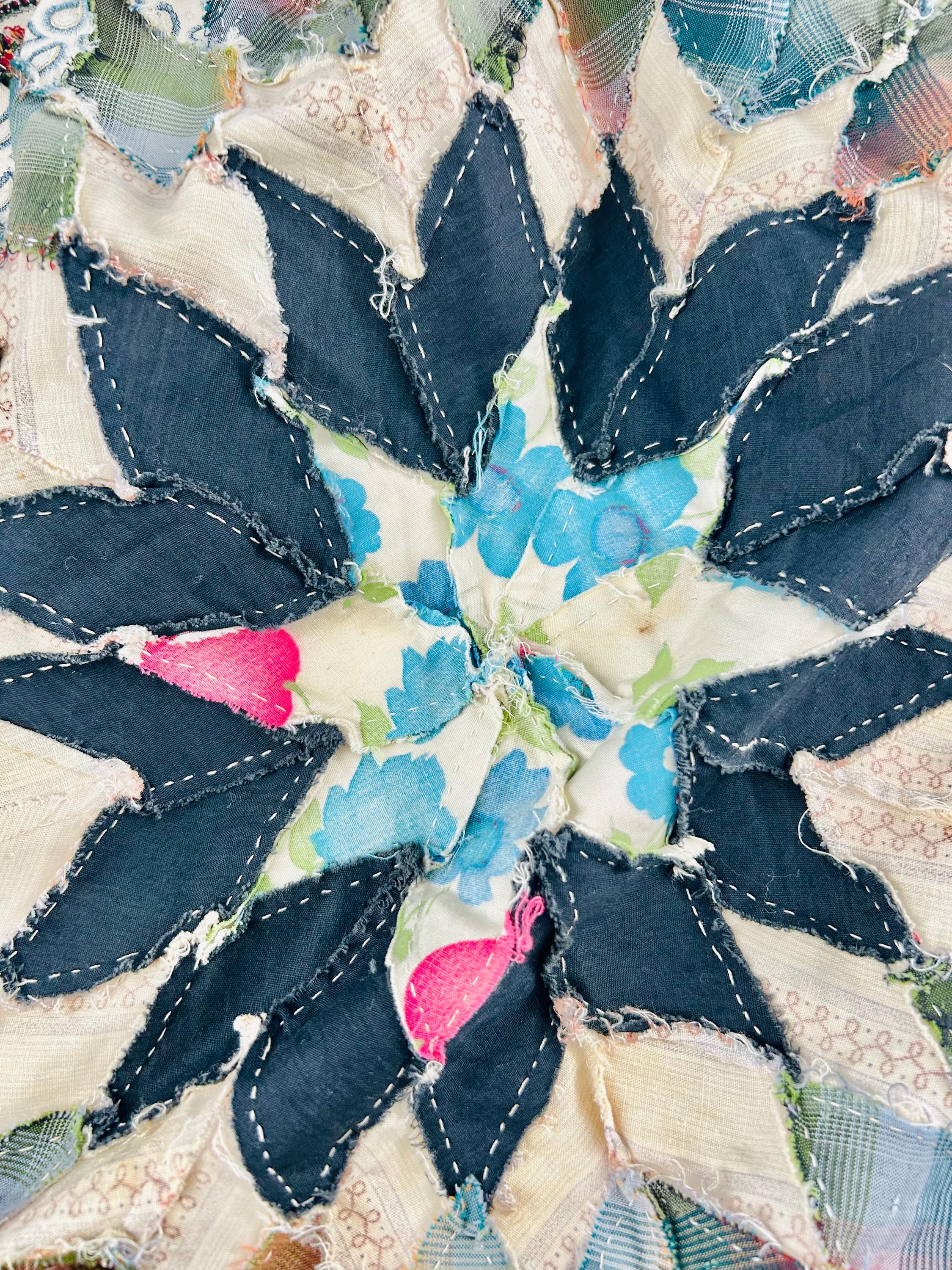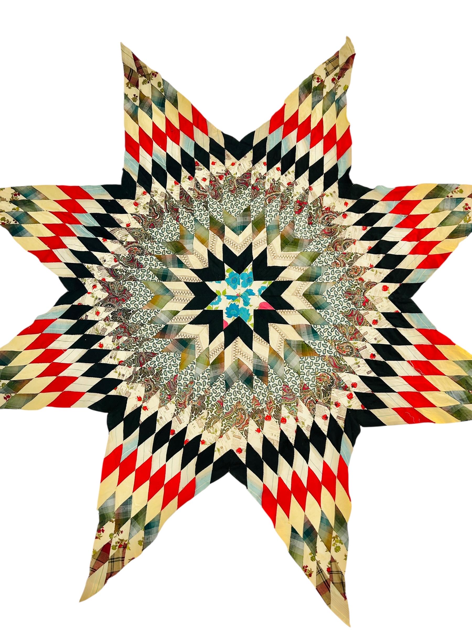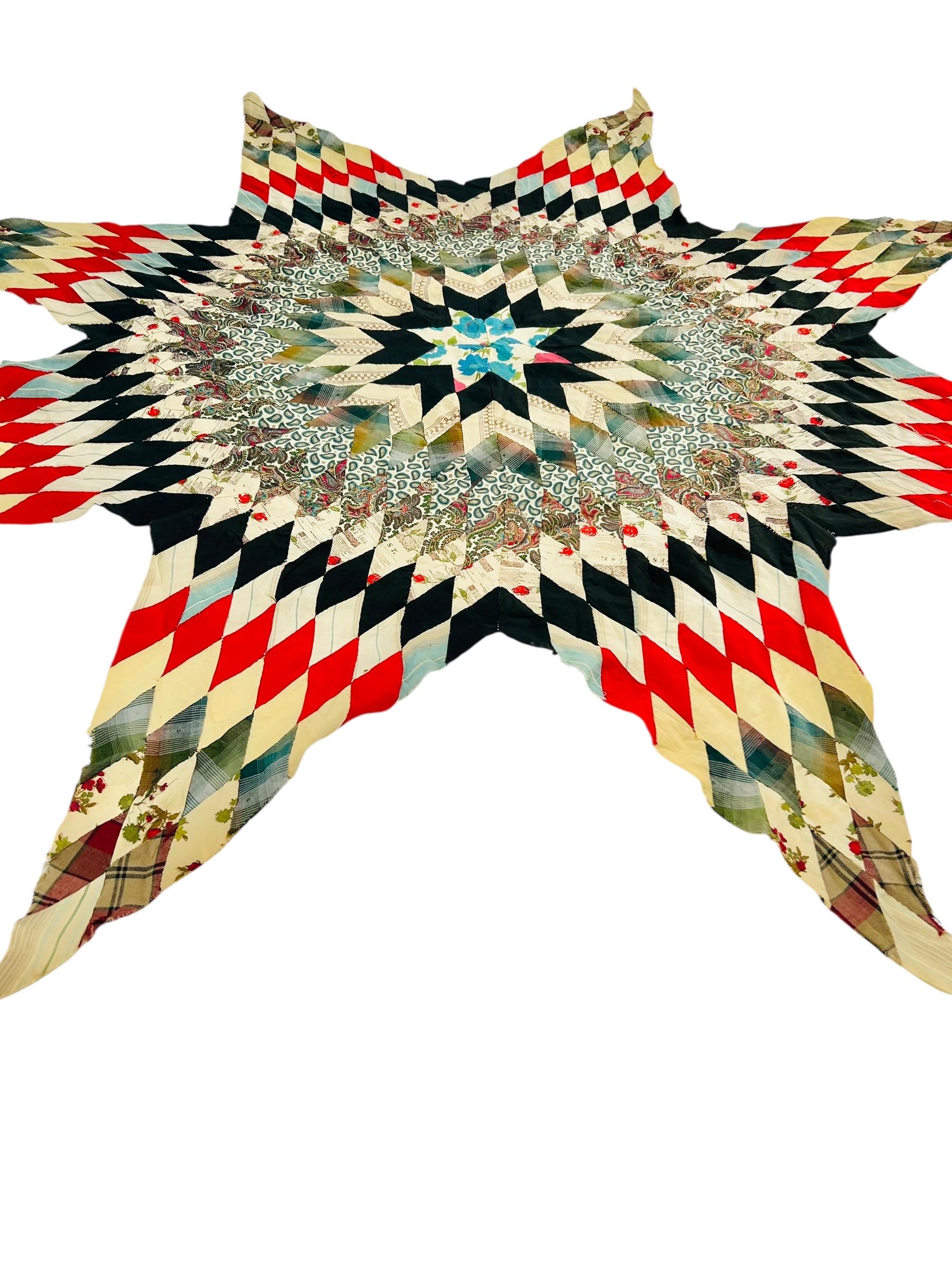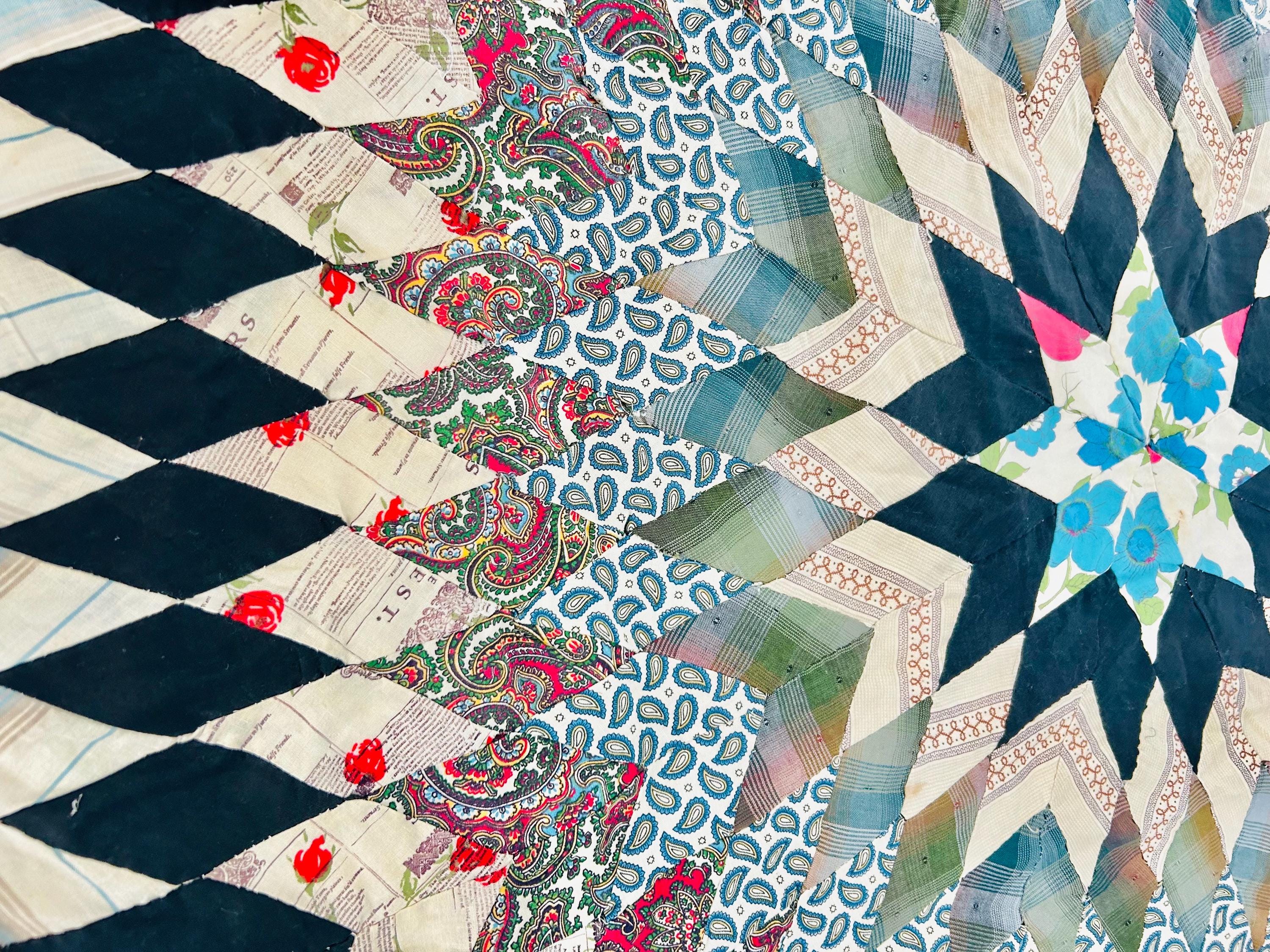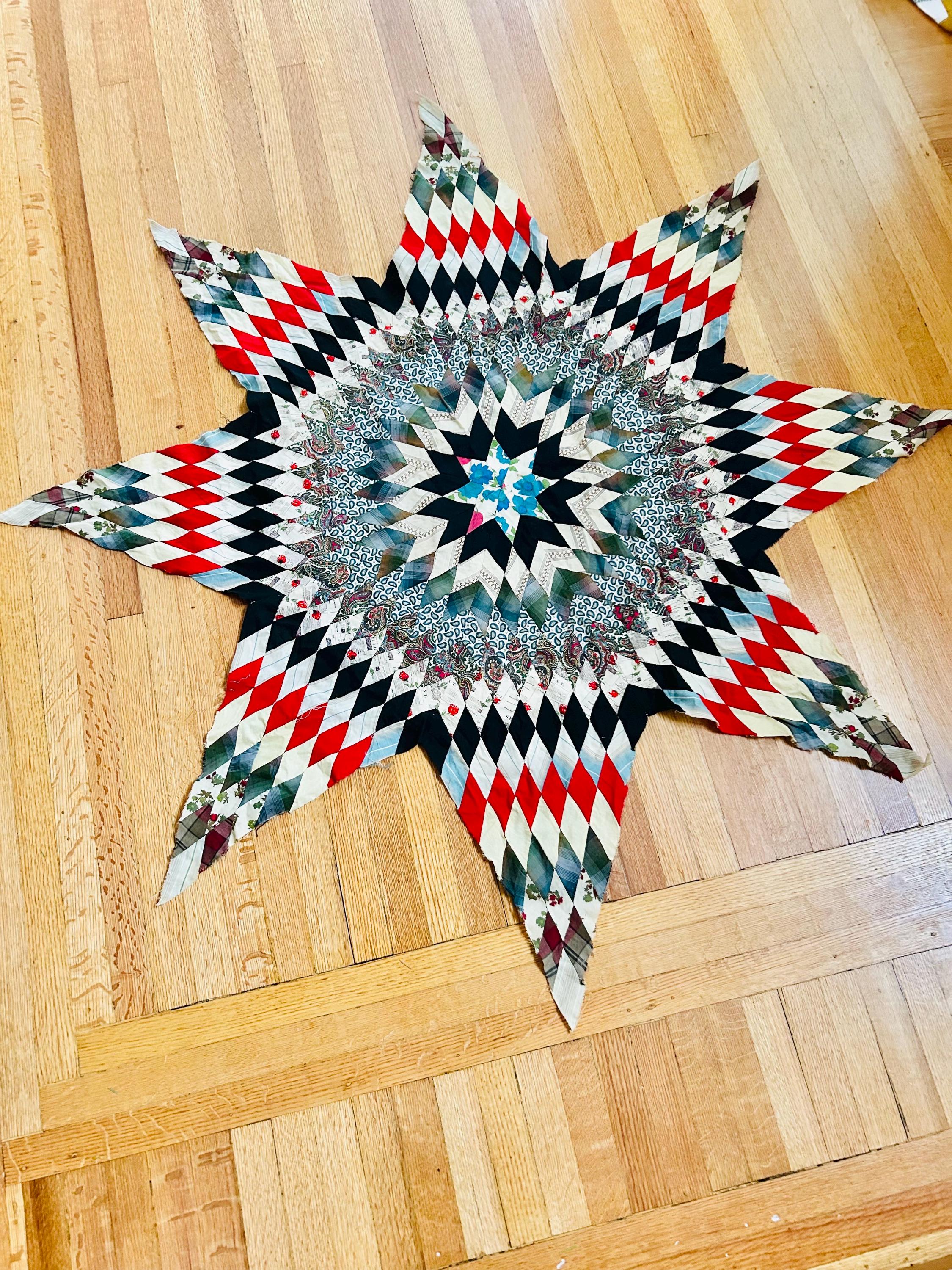 This striking hand-pieced Lone Star quilt top dates to approximately 1925–1935 and showcases a dramatic eight-point star in a rich array of Depression-era fabrics. The piece is a partial quilt top only and was never completed. It retains its irregular star-point edges and needs to be squared with borders or incorporated into a larger quilt.