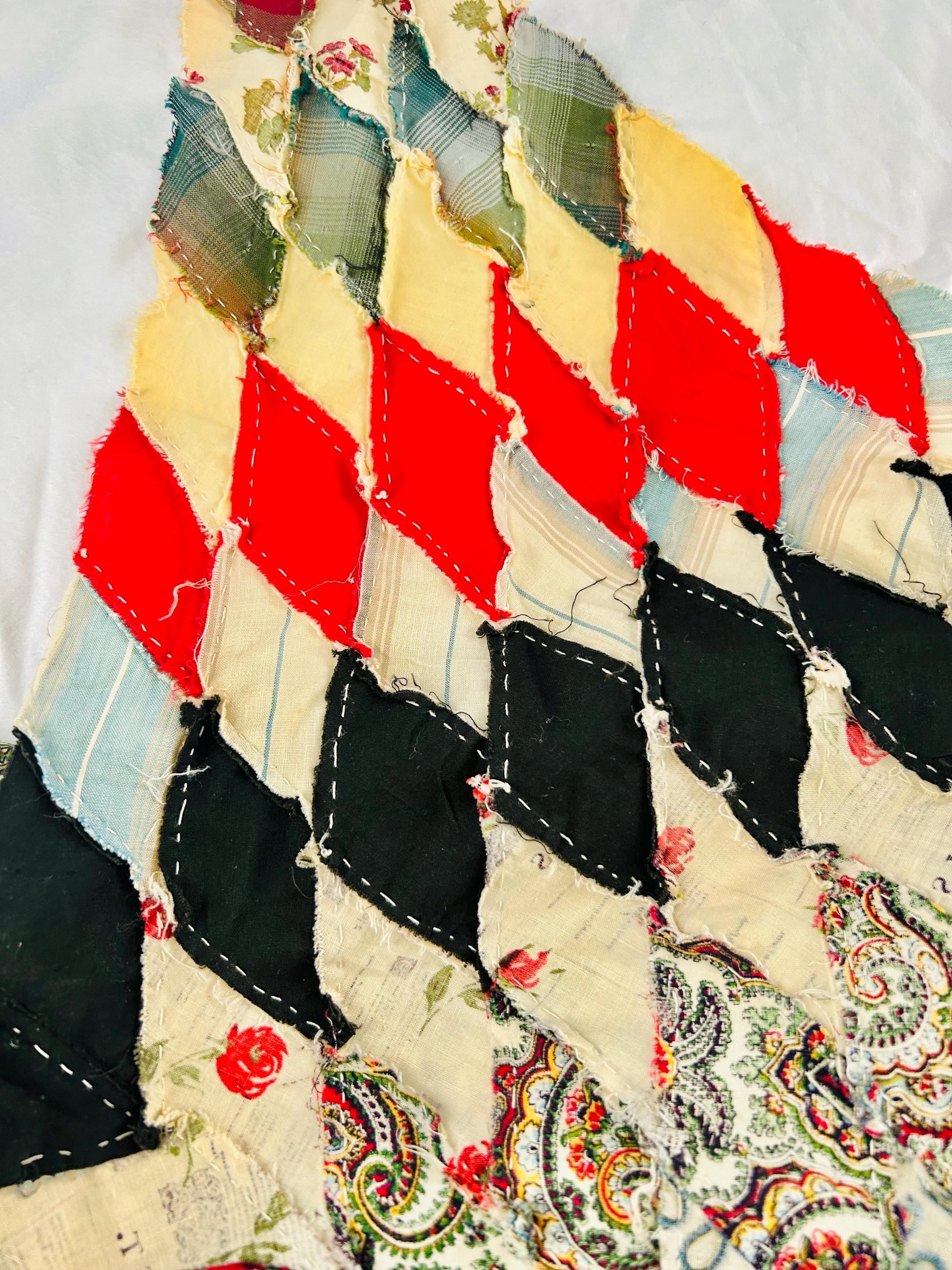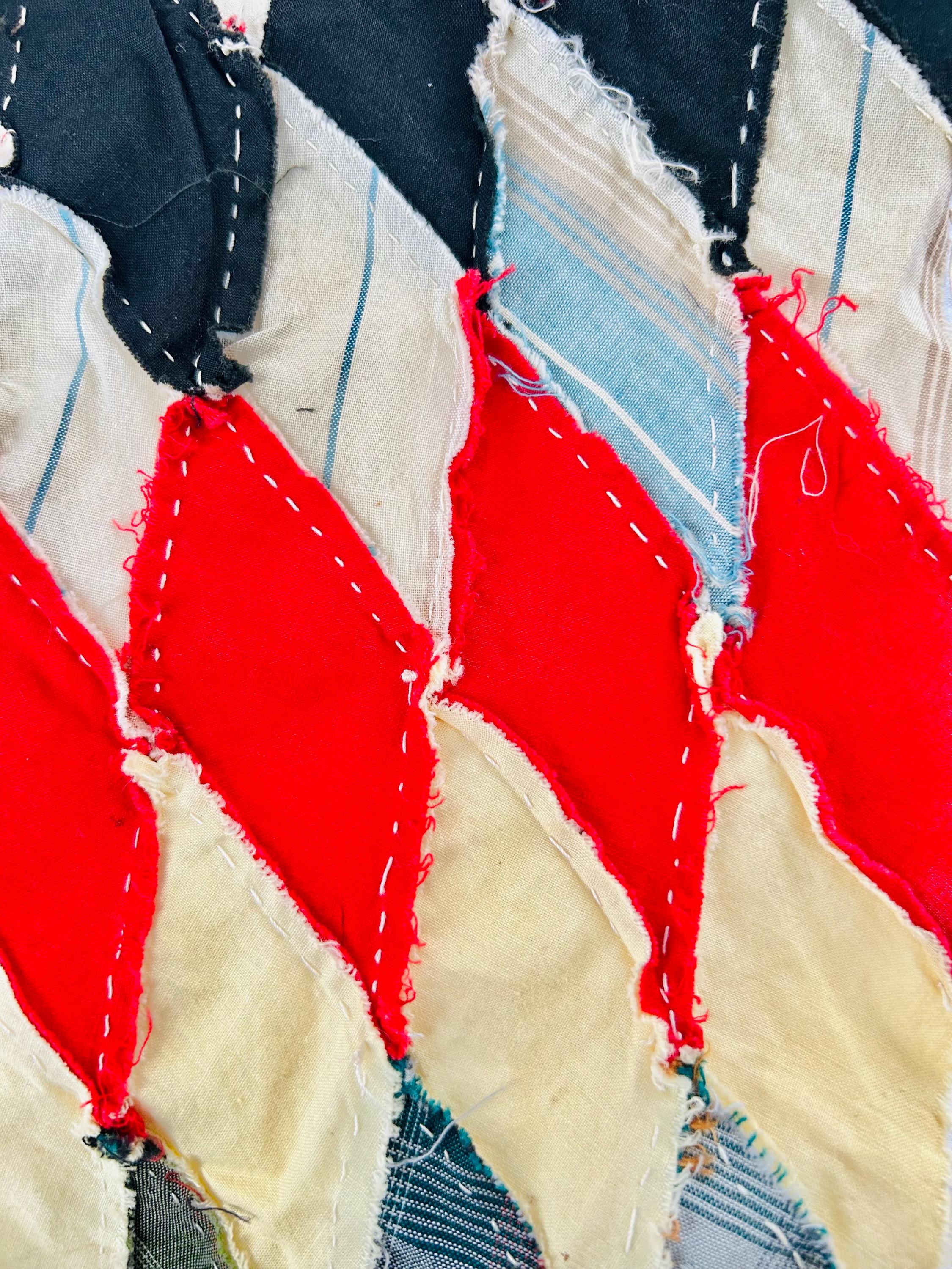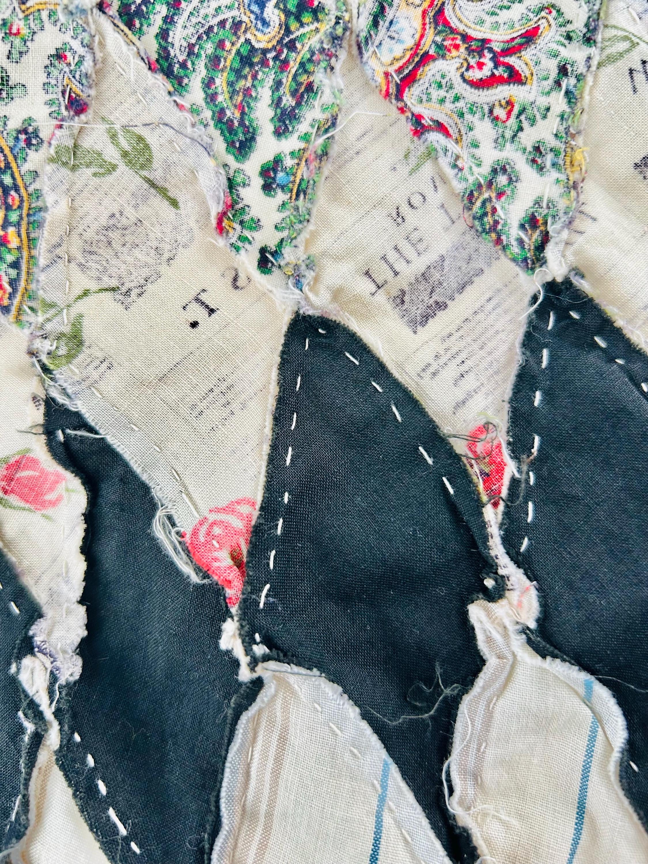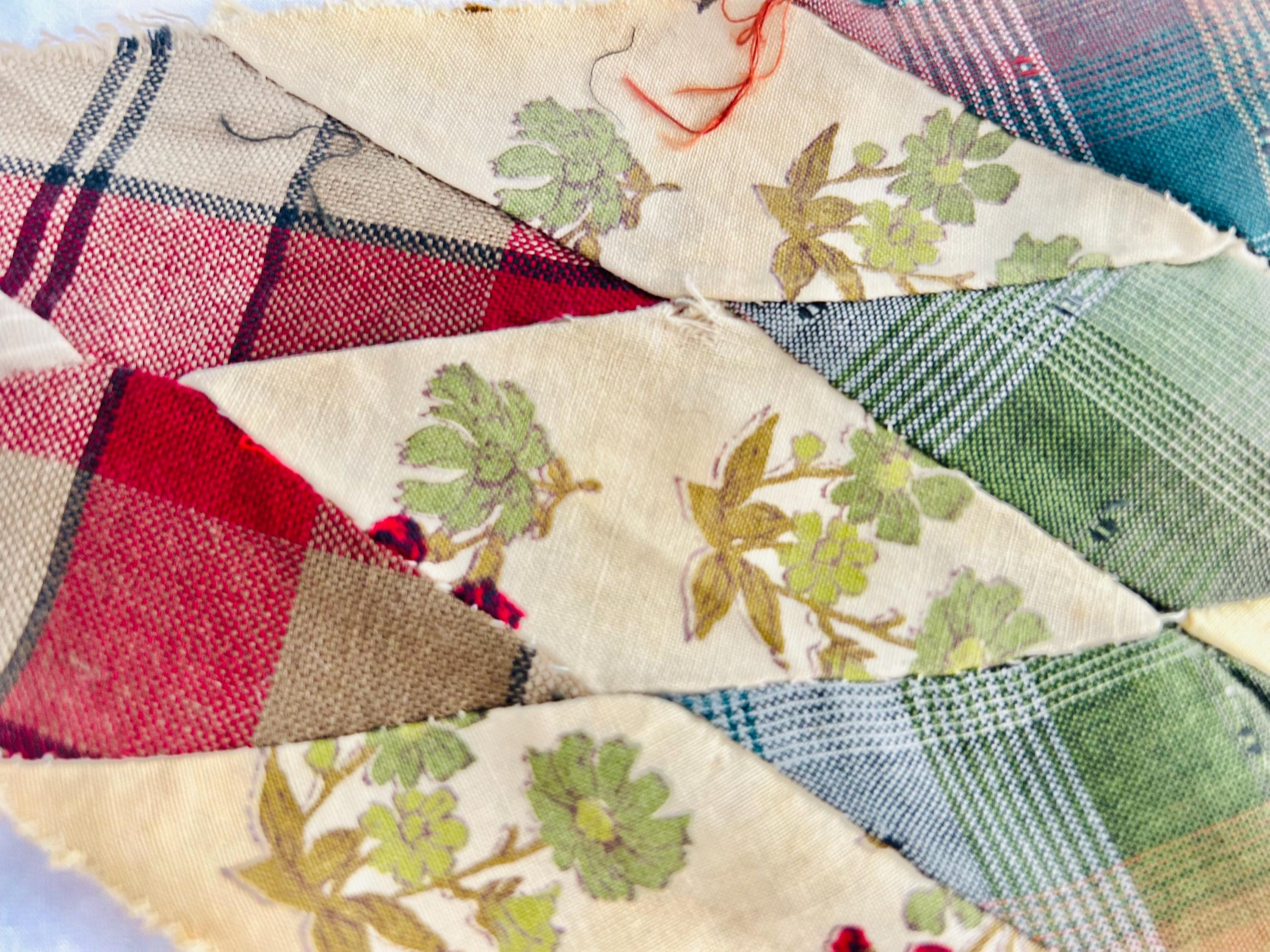 This striking hand-pieced Lone Star quilt top dates to approximately 1925–1935 and showcases a dramatic eight-point star in a rich array of Depression-era fabrics. The piece is a partial quilt top only and was never completed. It retains its irregular star-point edges and needs to be squared with borders or incorporated into a larger quilt.