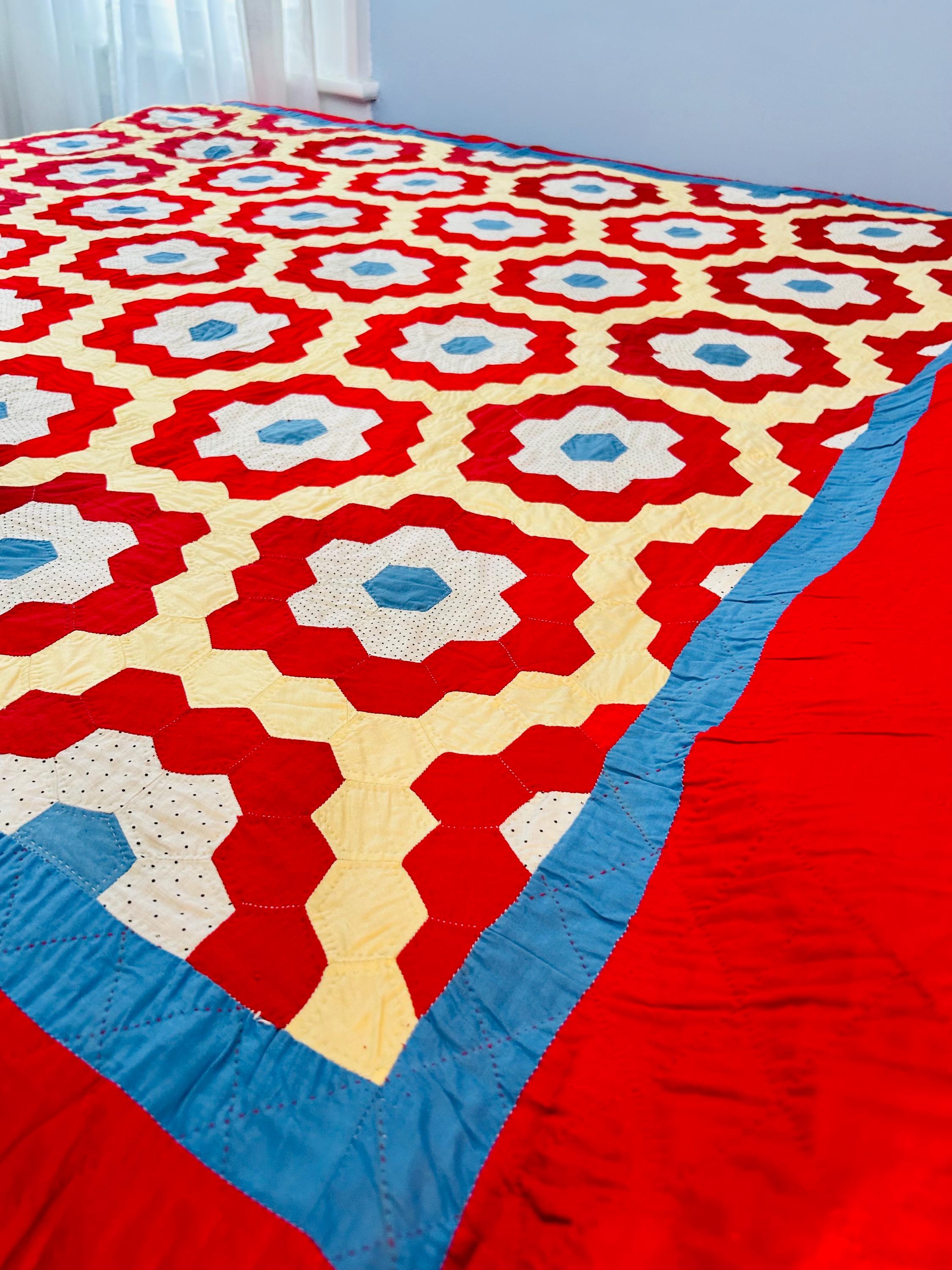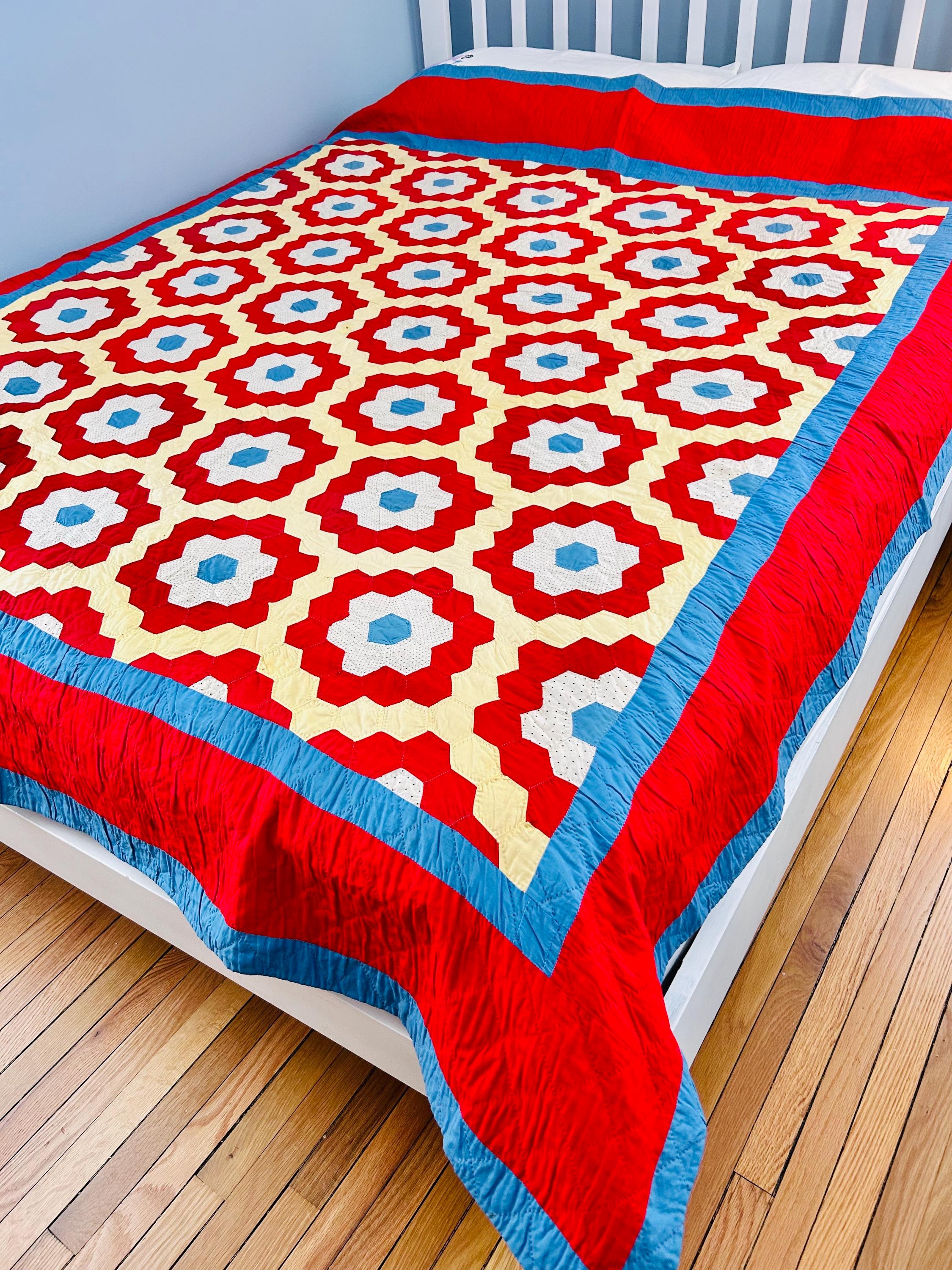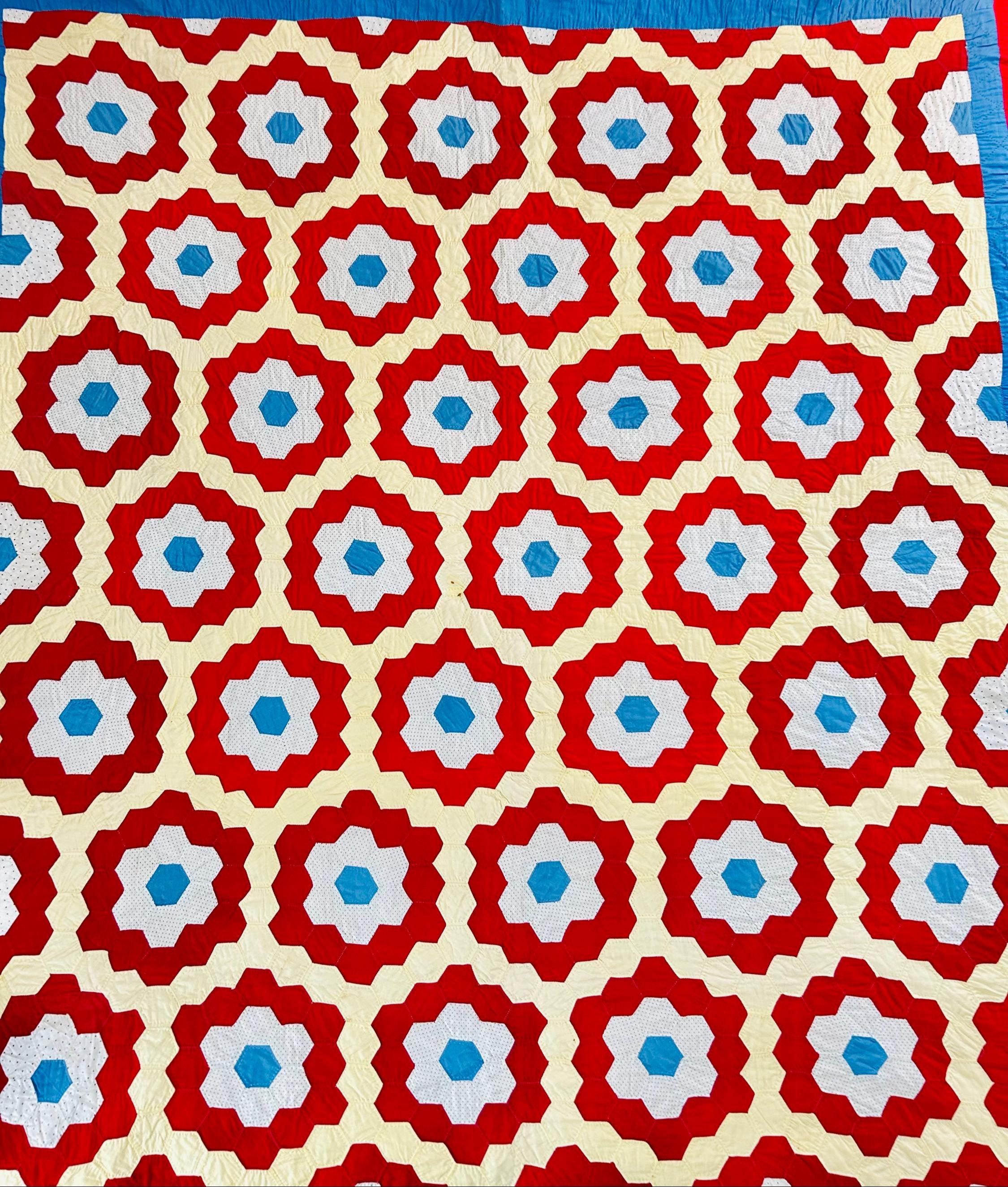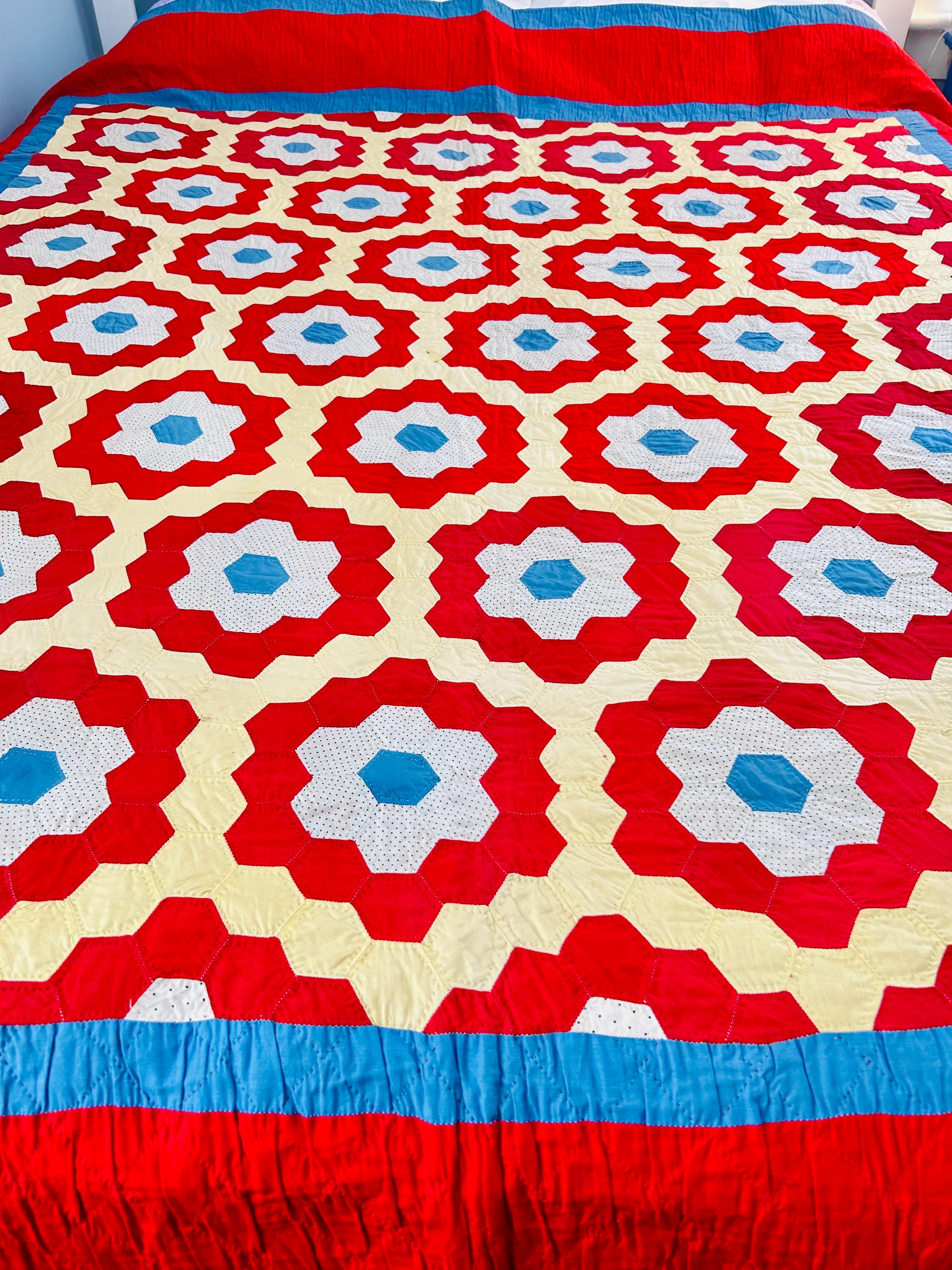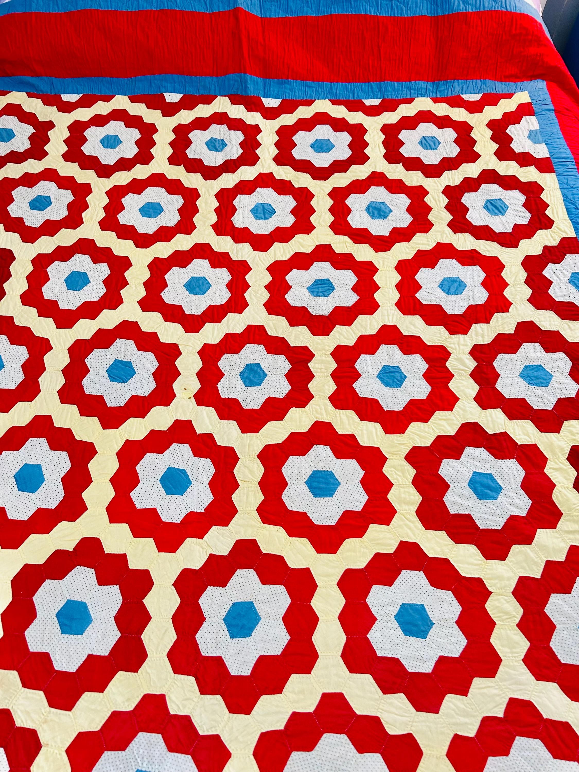 There is something so cheerful and nostalgic about this classic Grandmother’s Flower Garden quilt, circa 1960s-1970s. It is made from bold red hexagon rings with soft butter-yellow paths and bright aqua centers. Each individual hexagon has been hand-quilted in the outline of the hexagon in tiny stitches. There is a four-sided red and blue border that has been quilted in diagonals.