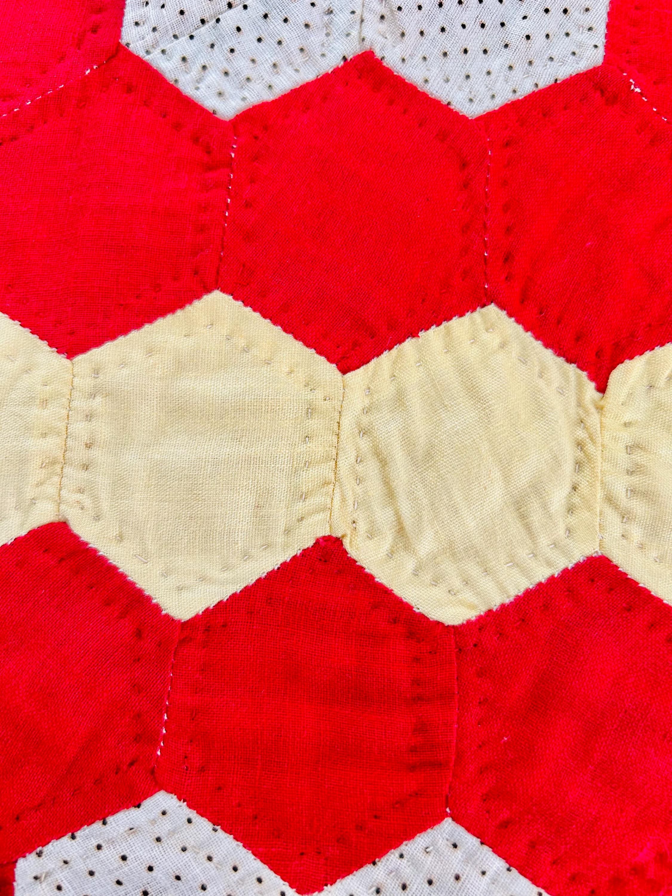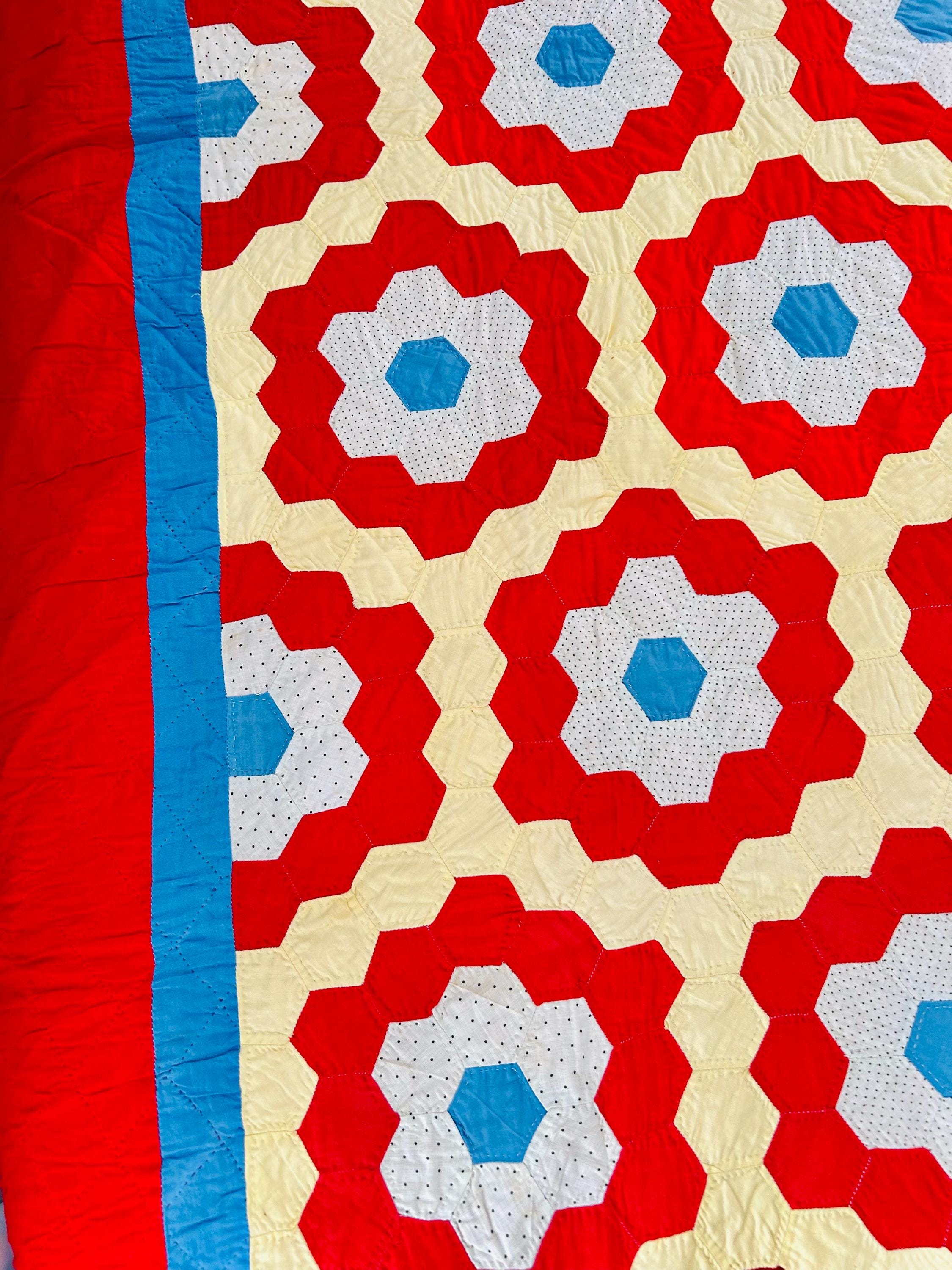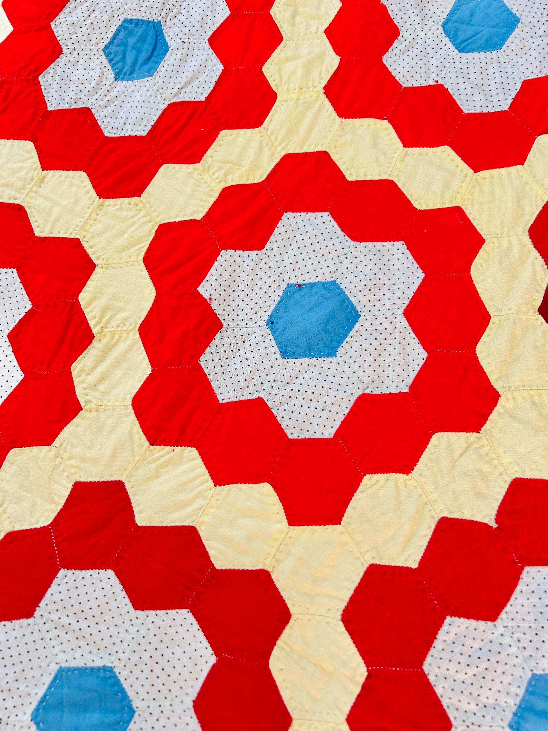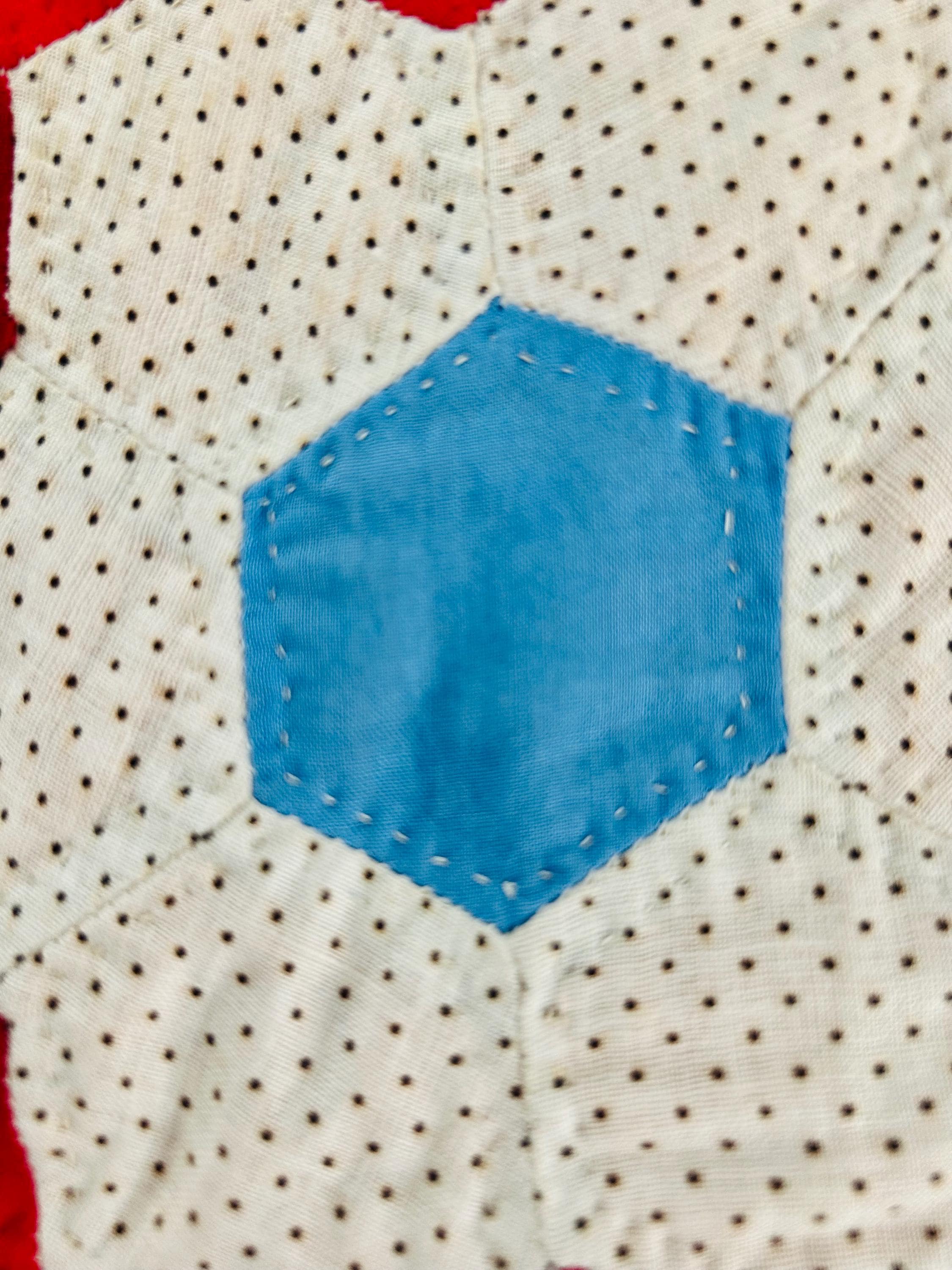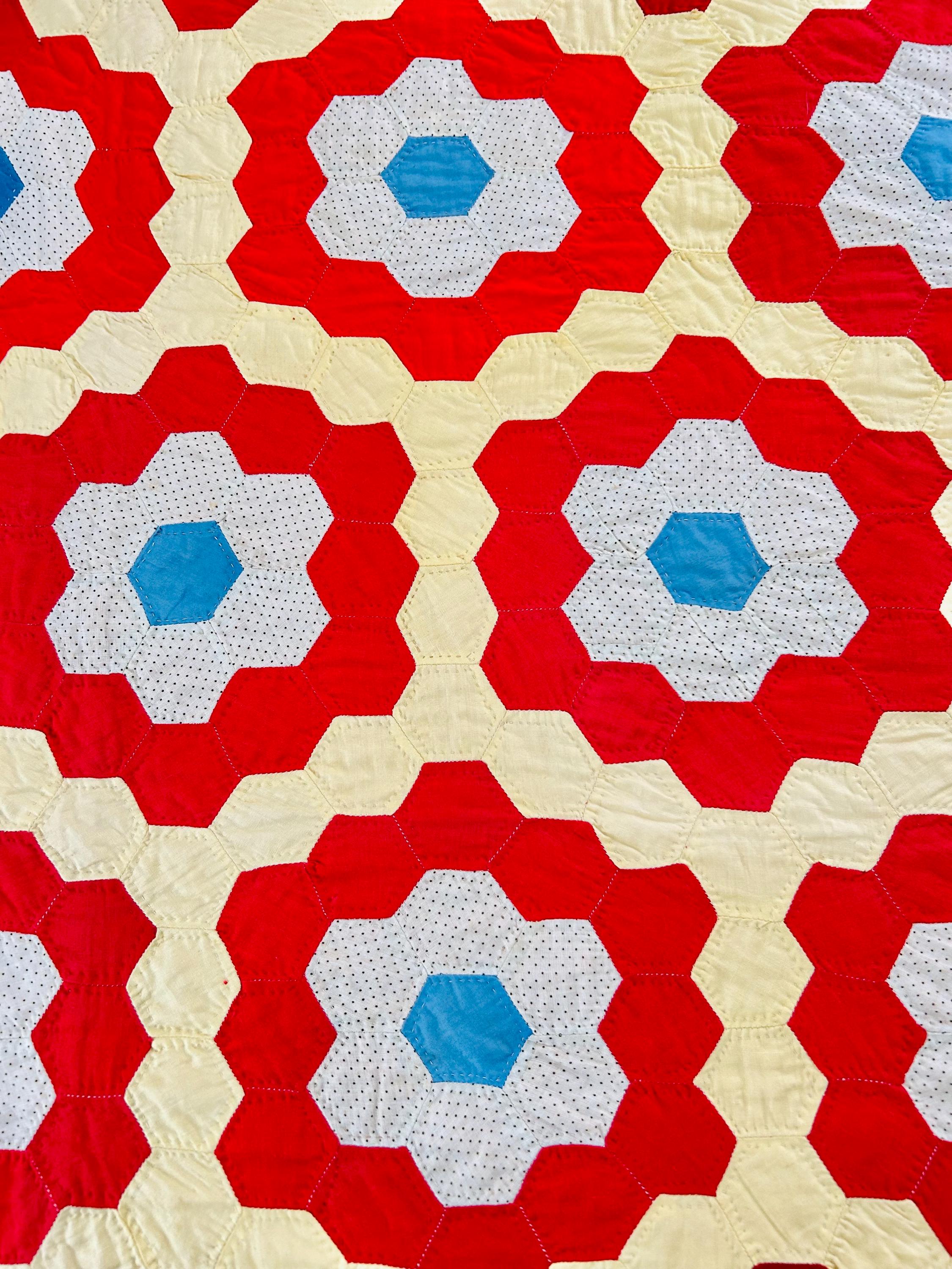 Details: • Pattern: Grandmother’s Flower Garden • Date: Circa 1960s–1970s • Size: 69” x 80” • Construction: Hand pieced hexagons • Quilting: Hand quilted • Fabrics: Cotton solids and small-scale printed cotton • Colors: Red, butter yellow, white with tiny black dots, turquoise blue • Batting: lightweight • Condition: Excellent vintage condition