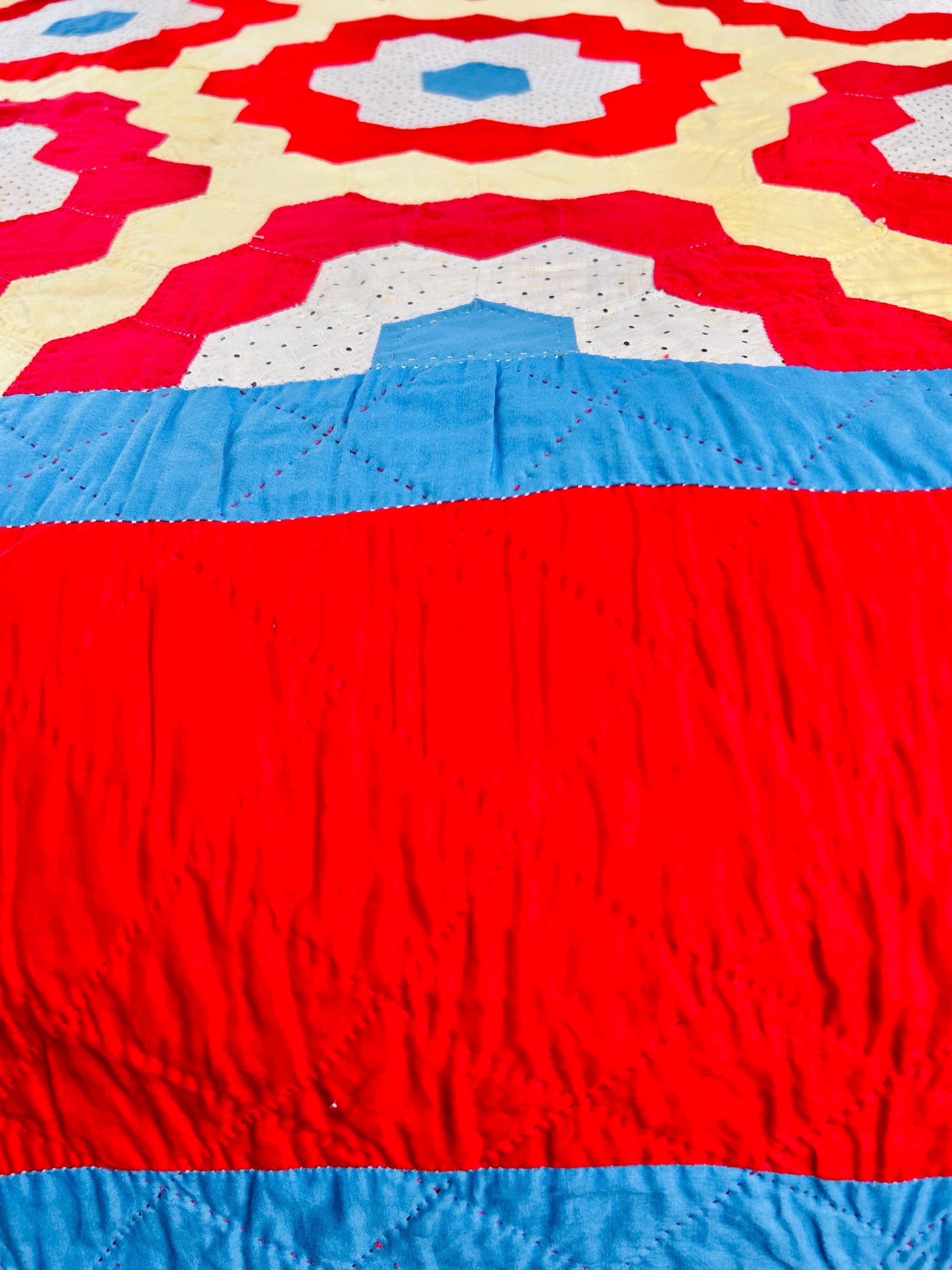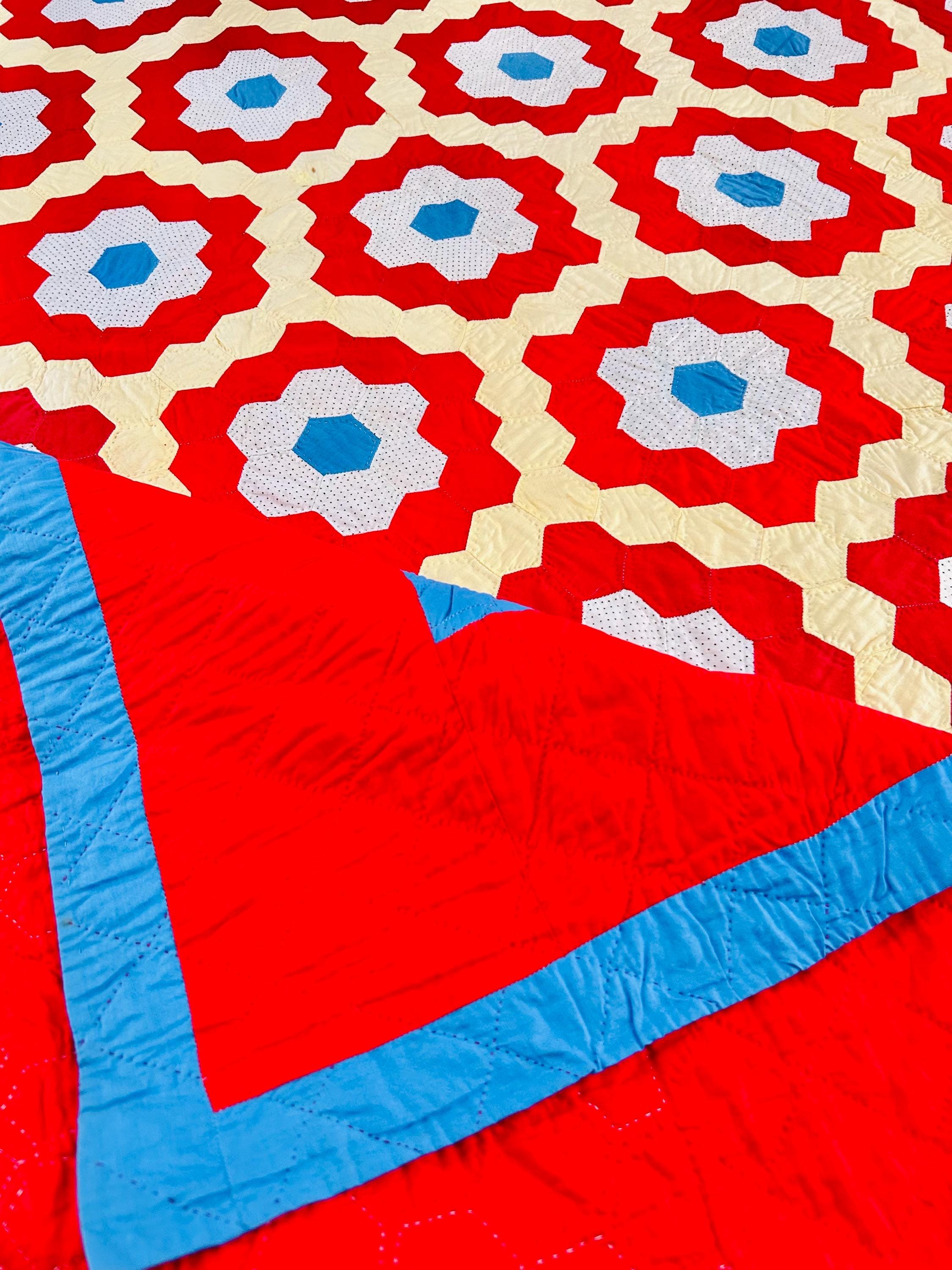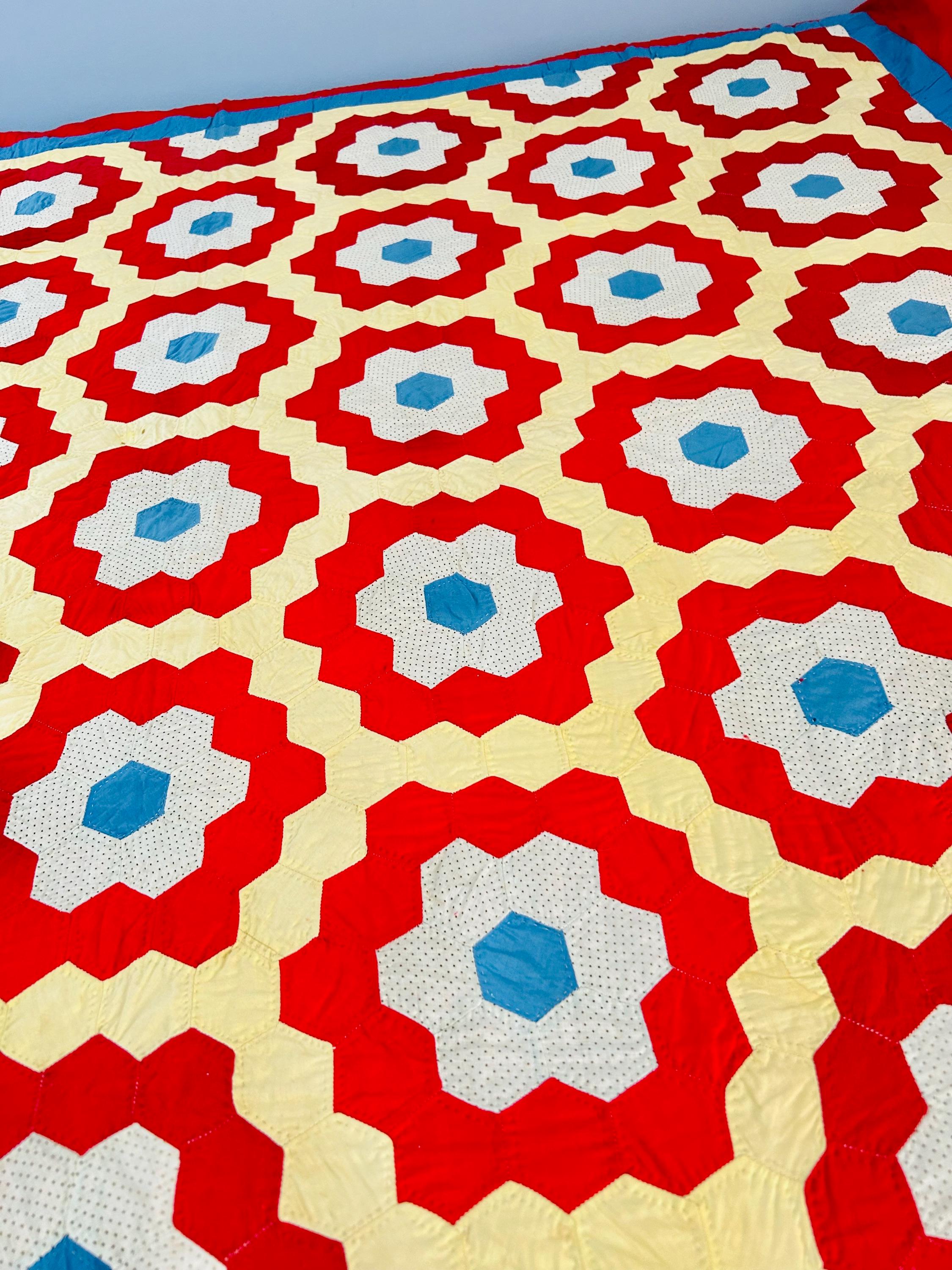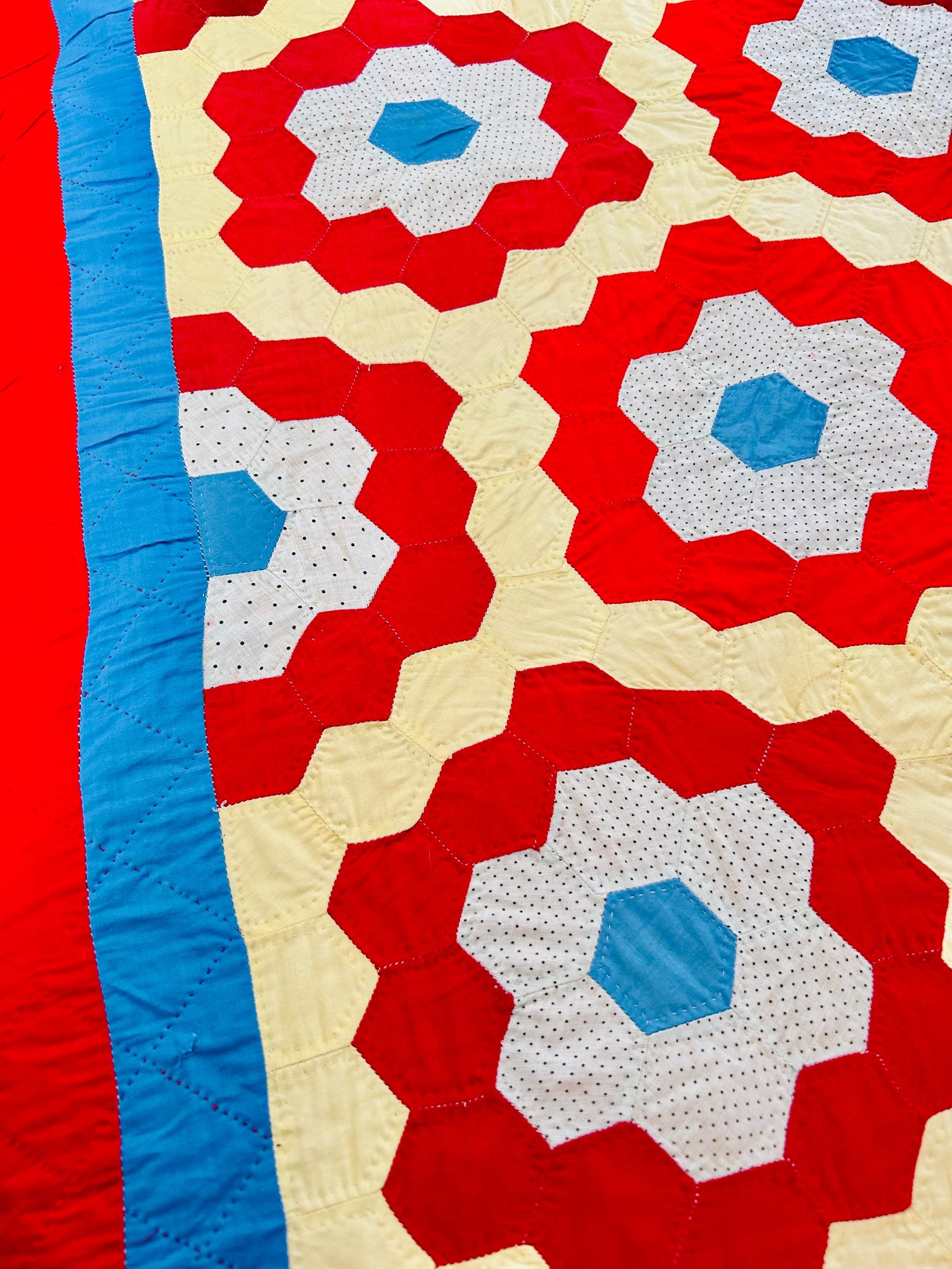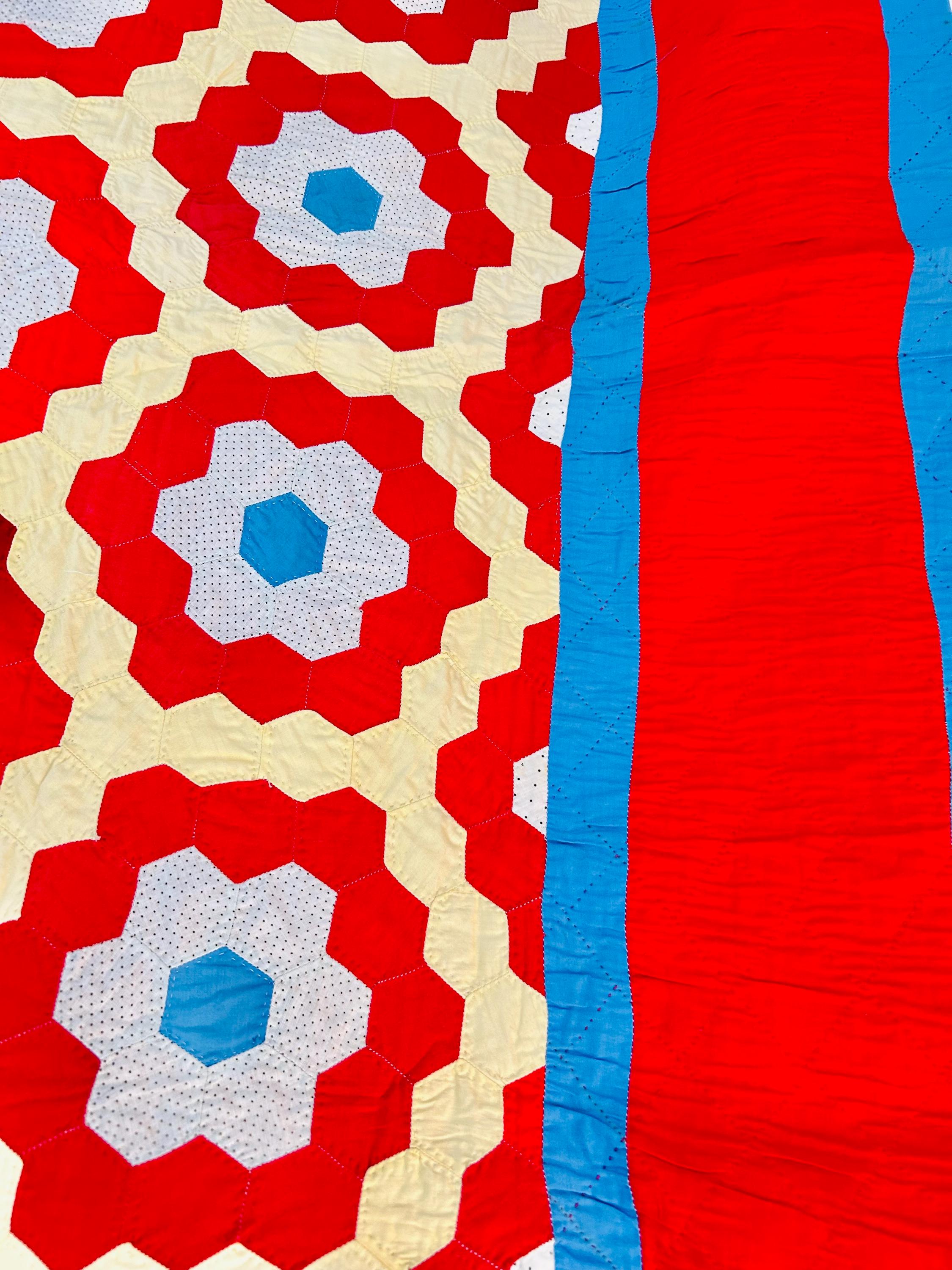 Details: • Pattern: Grandmother’s Flower Garden • Date: Circa 1960s–1970s • Size: 69” x 80” • Construction: Hand pieced hexagons • Quilting: Hand quilted • Fabrics: Cotton solids and small-scale printed cotton • Colors: Red, butter yellow, white with tiny black dots, turquoise blue • Batting: lightweight • Condition: Excellent vintage condition
