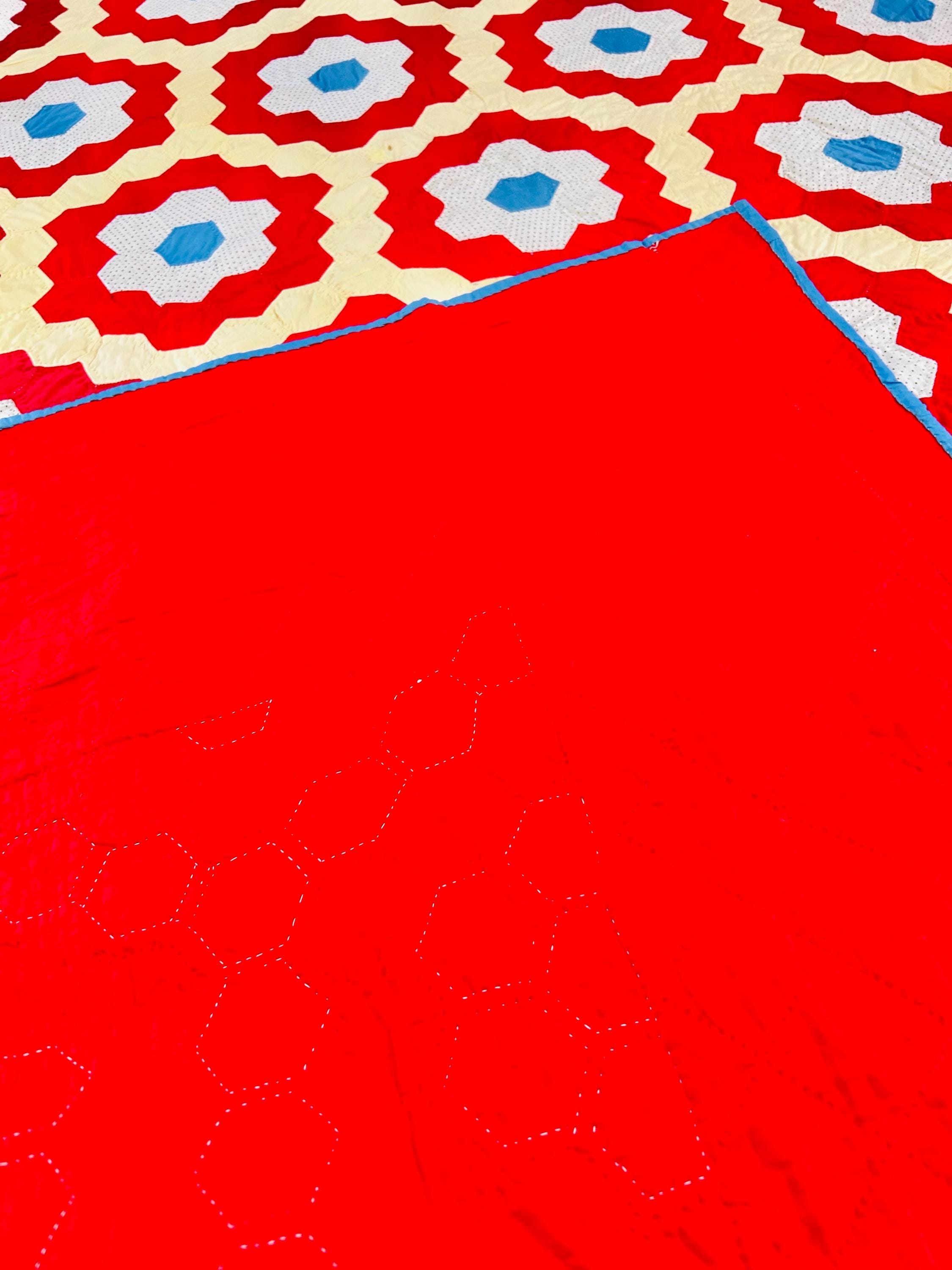 The back is bright red cotton while the binding is blue cotton that has been machine-stitched to both sides.