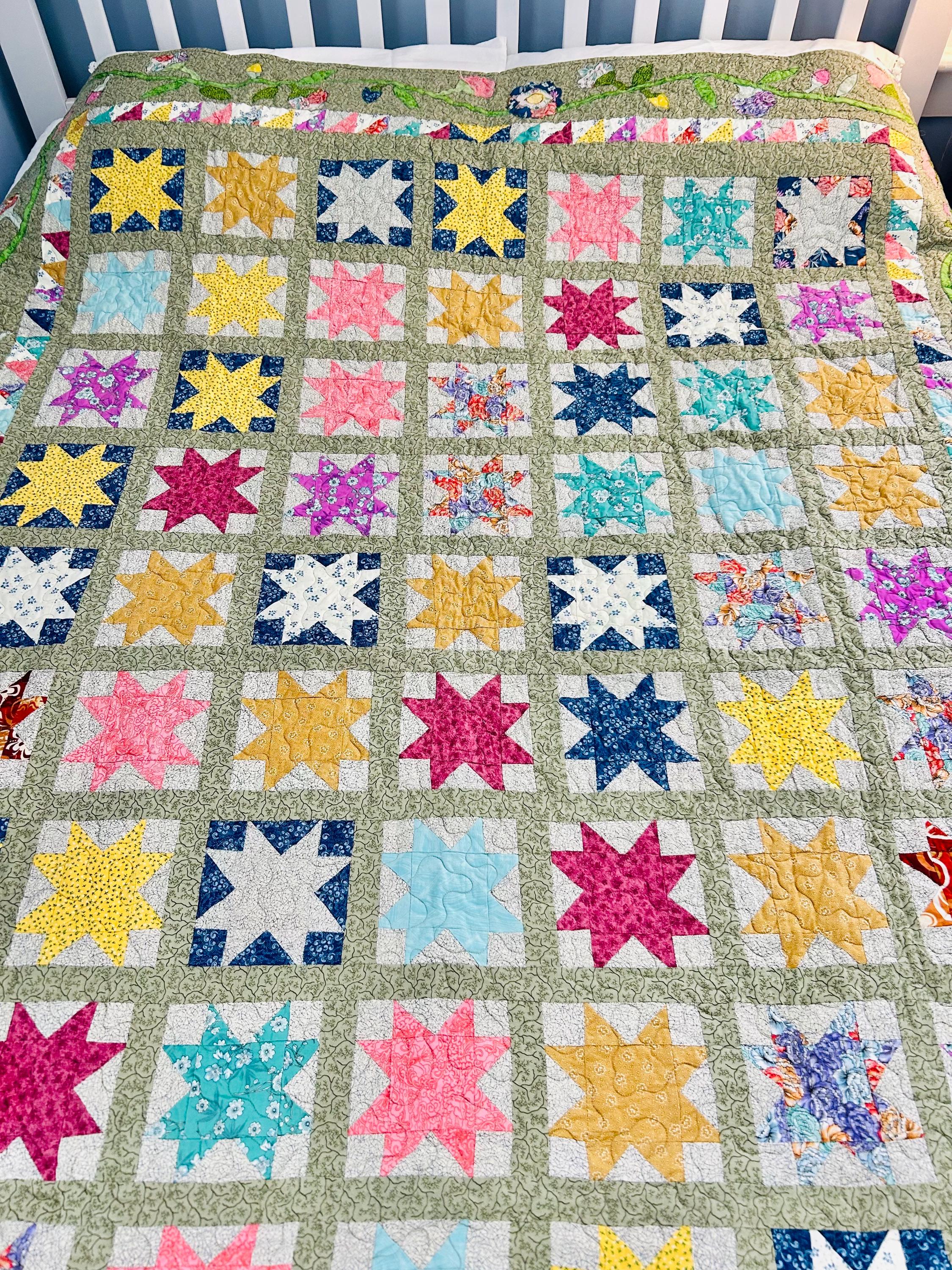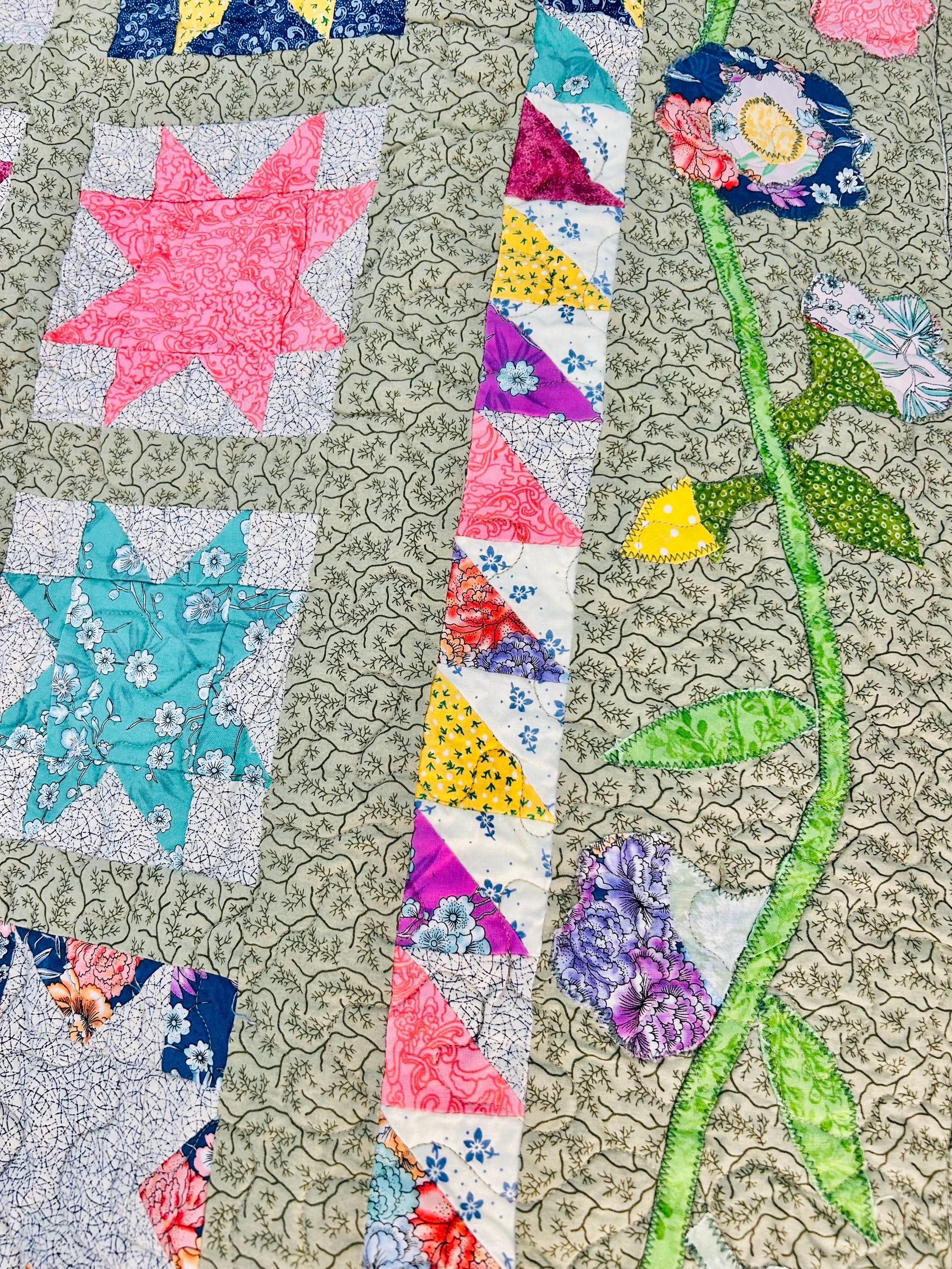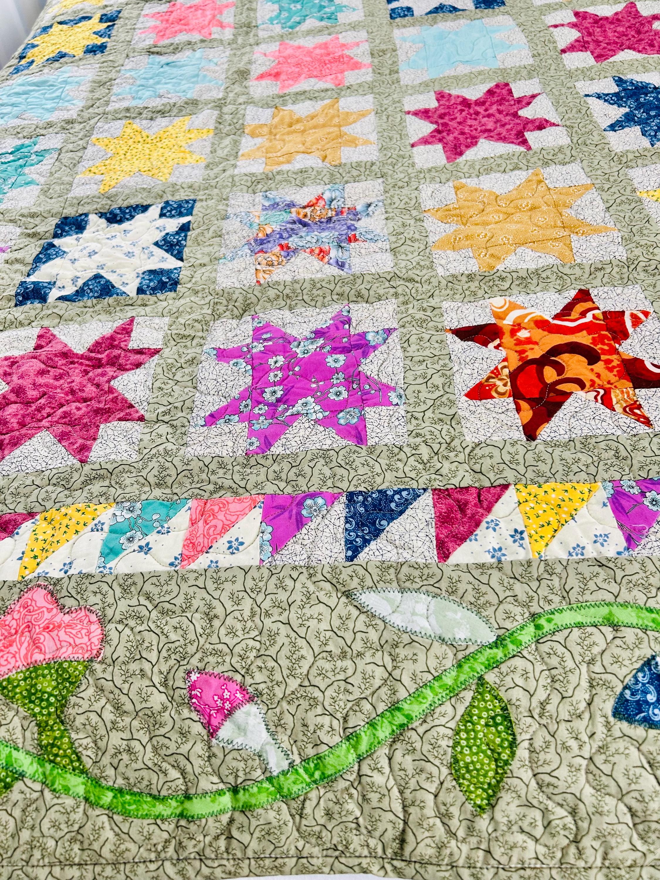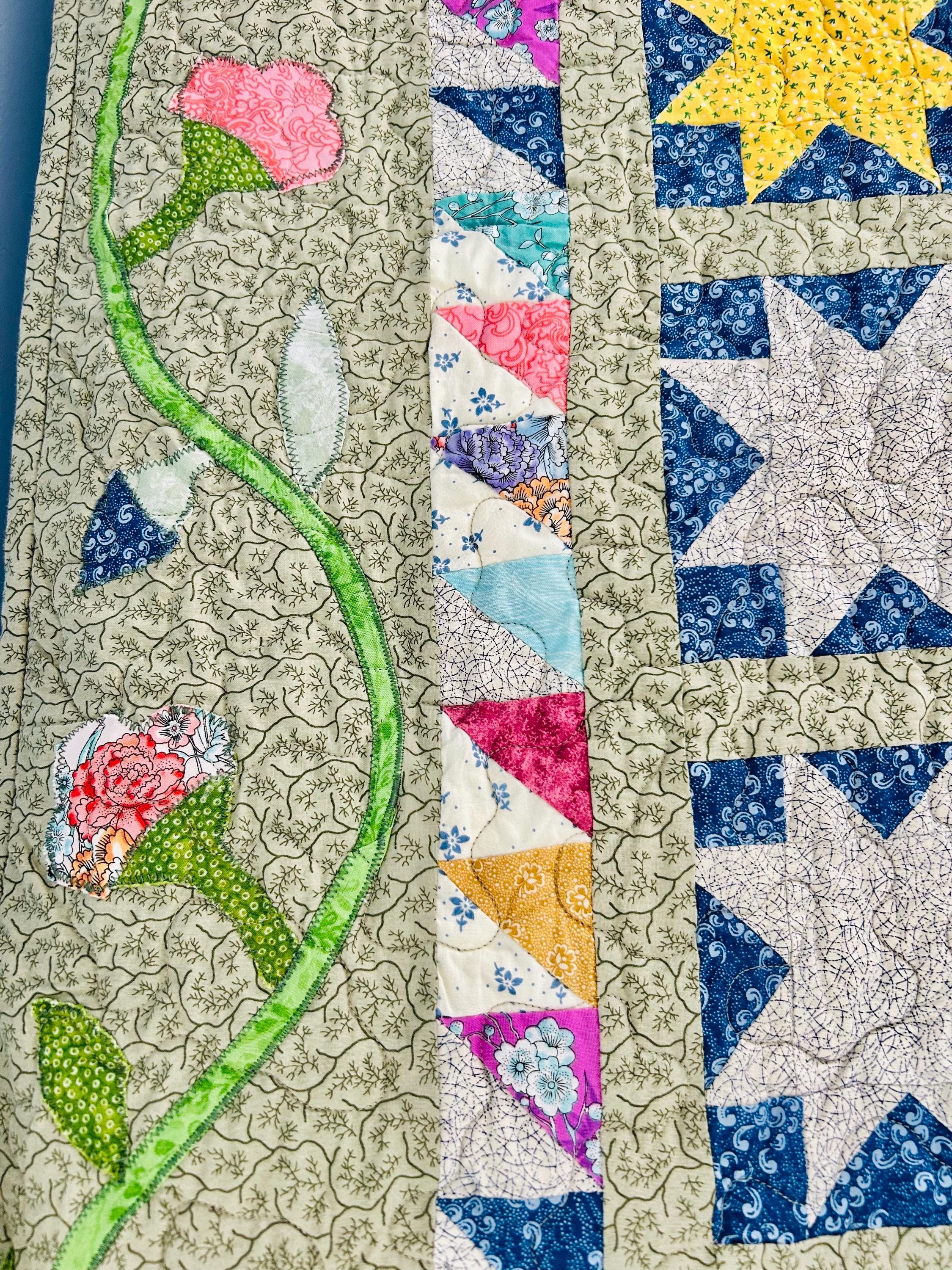 Details • Pattern: Ohio Star • Era: 1990s • Size: 62” x 84” • Construction: Machine pieced • Quilting: Expertly long-arm quilted • Border: Pieced sawtooth border with serpentine appliqué floral outer border • Batting: lightweight • Condition: Excellent vintage condition with bright colors and no issues noted