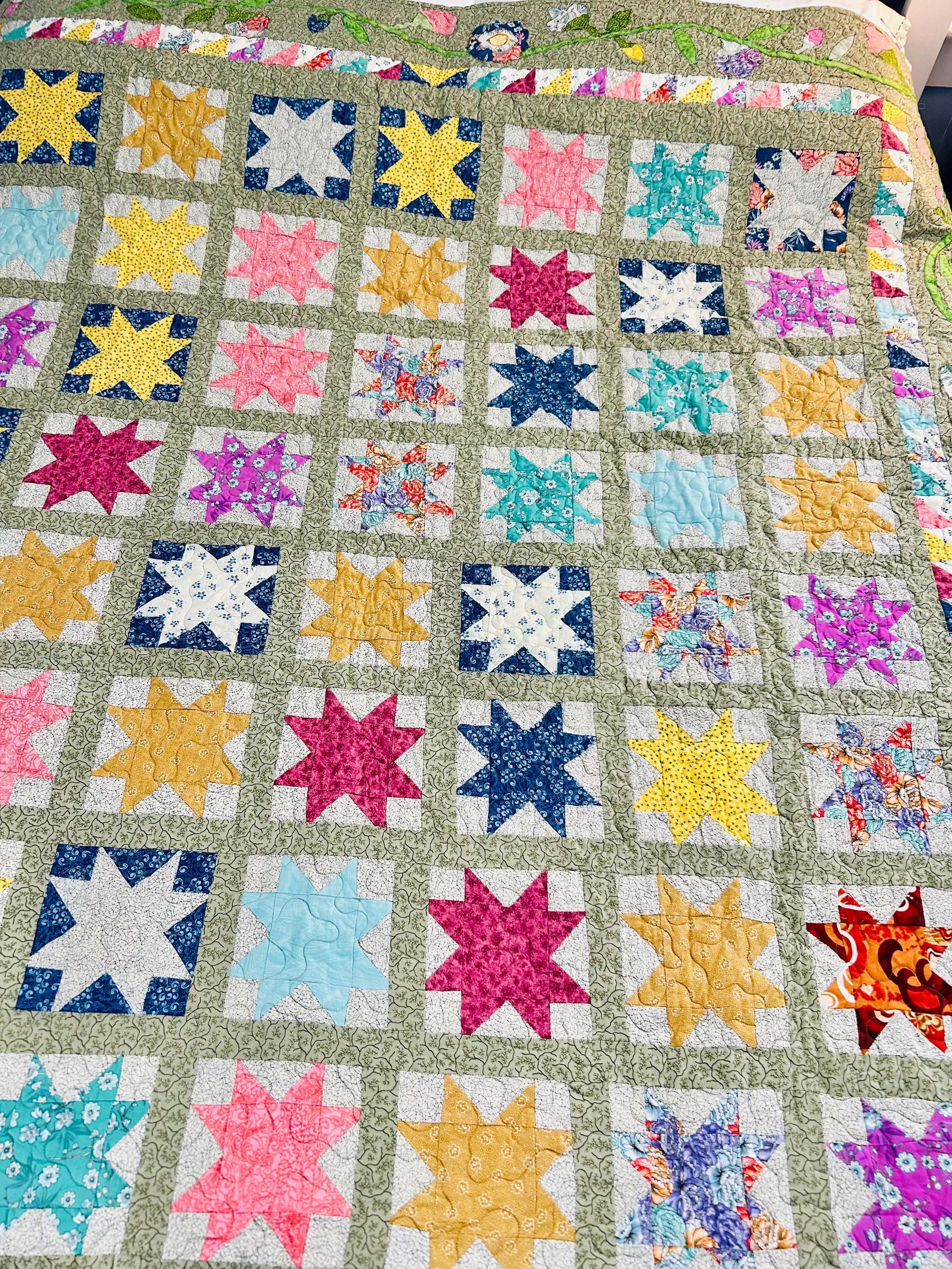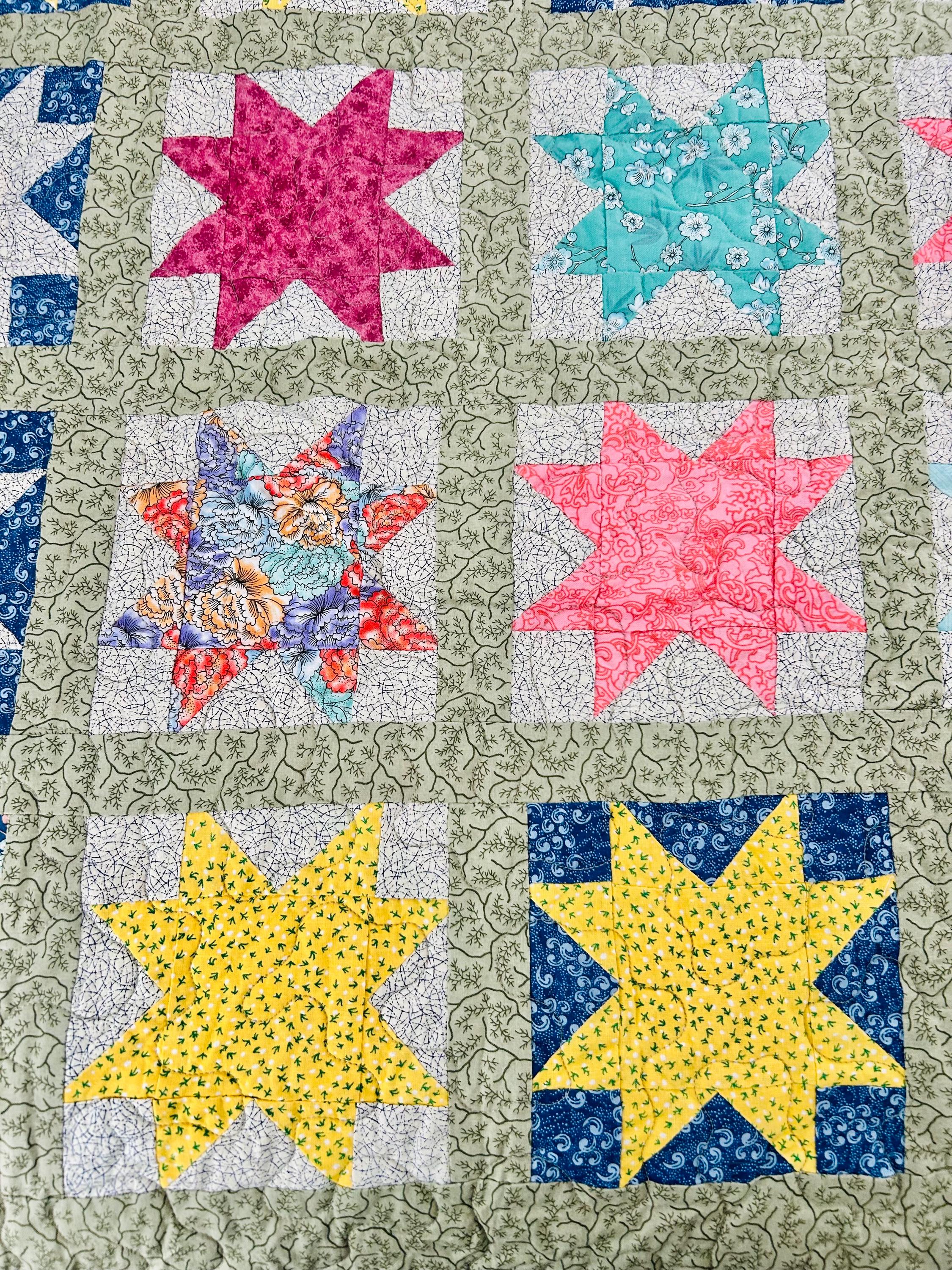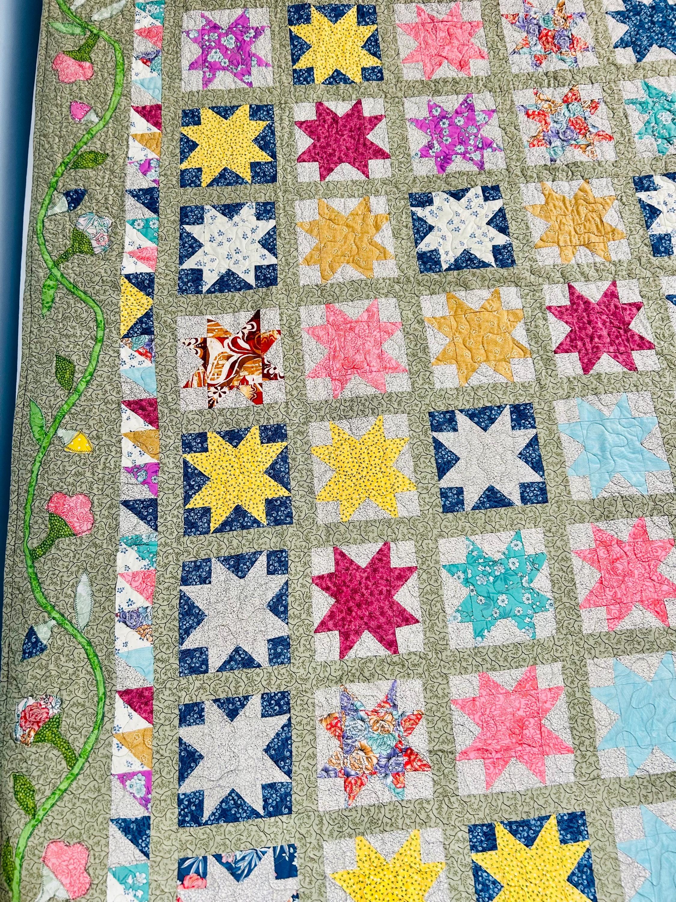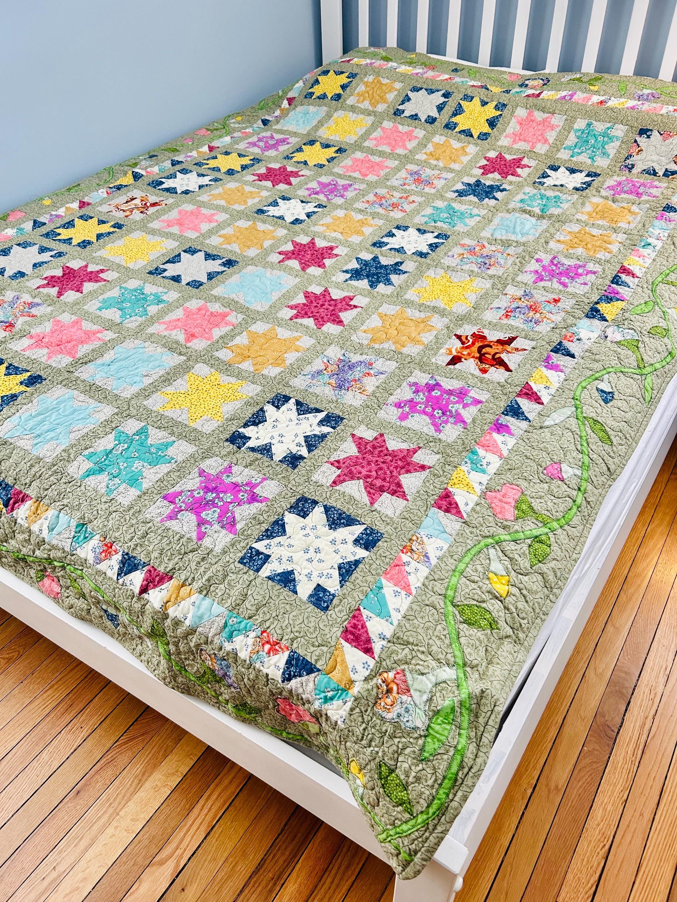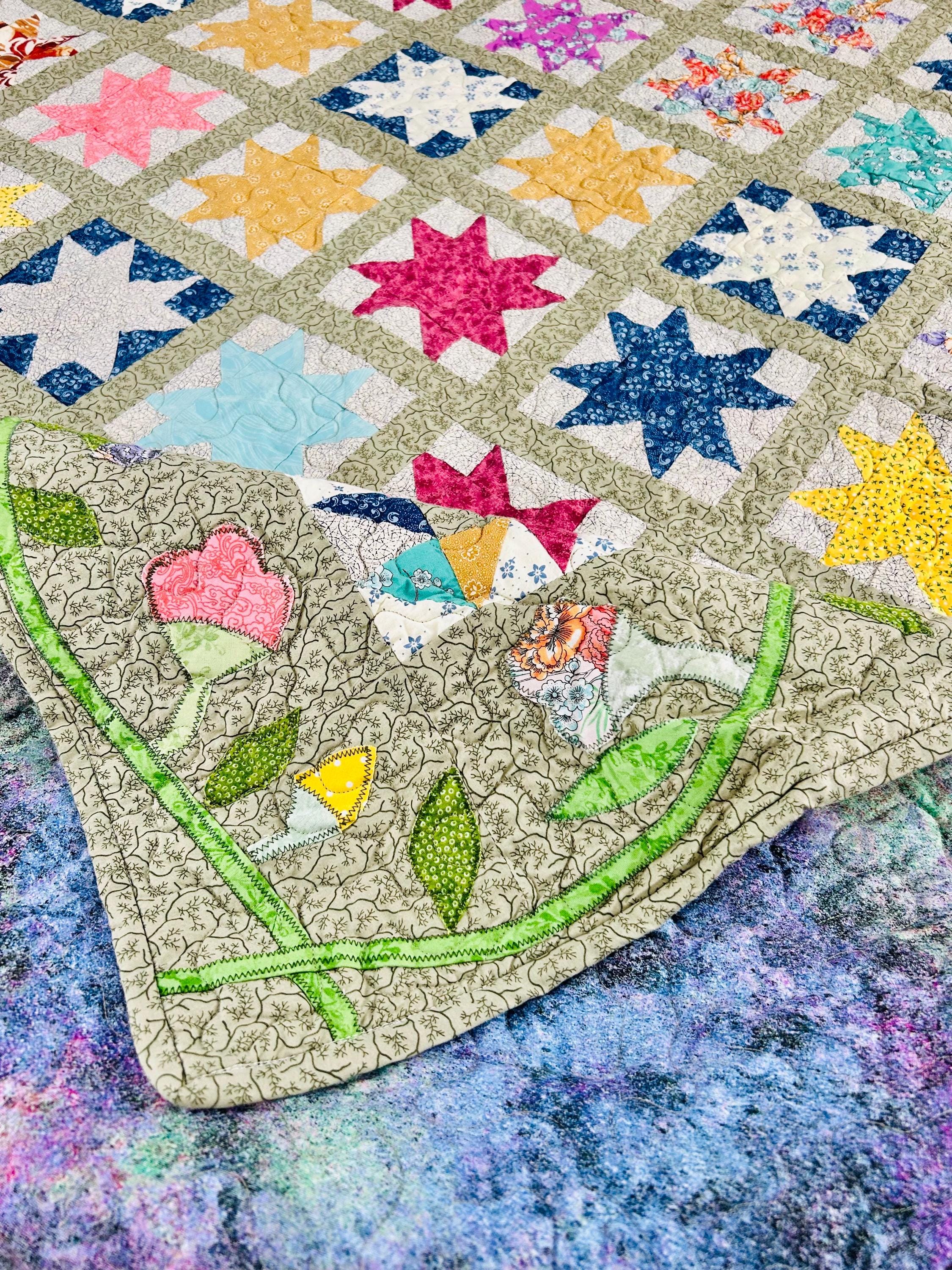 Details • Pattern: Ohio Star • Era: 1990s • Size: 62” x 84” • Construction: Machine pieced • Quilting: Expertly long-arm quilted • Border: Pieced sawtooth border with serpentine appliqué floral outer border • Batting: lightweight • Condition: Excellent vintage condition with bright colors and no issues noted